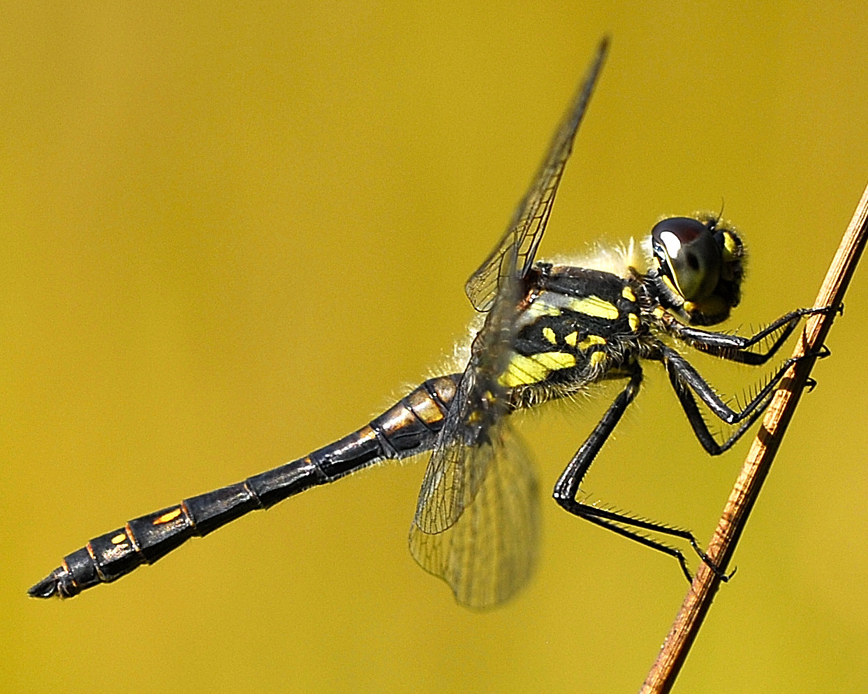 Hinterleib: Gelbe Grundfarbe, seitlich mit schwarzen Zeichnungselementen und oberseits schwarzen Flecken auf den Segmenten 8 und 9; bei ausgefärbten Männchen einheitlich schwarz. Legescheide der Weibchen steht rechtwinklig ab.