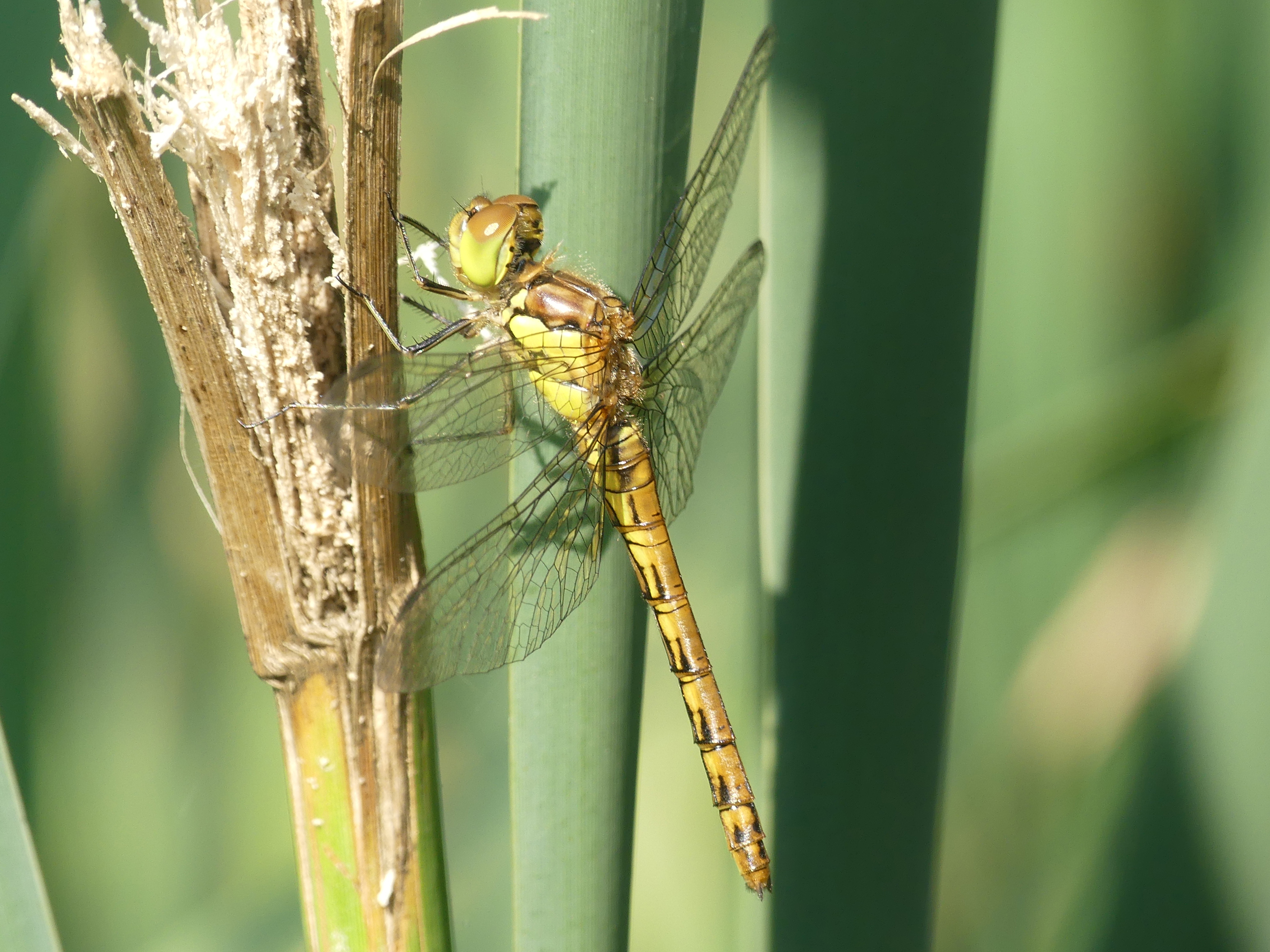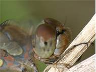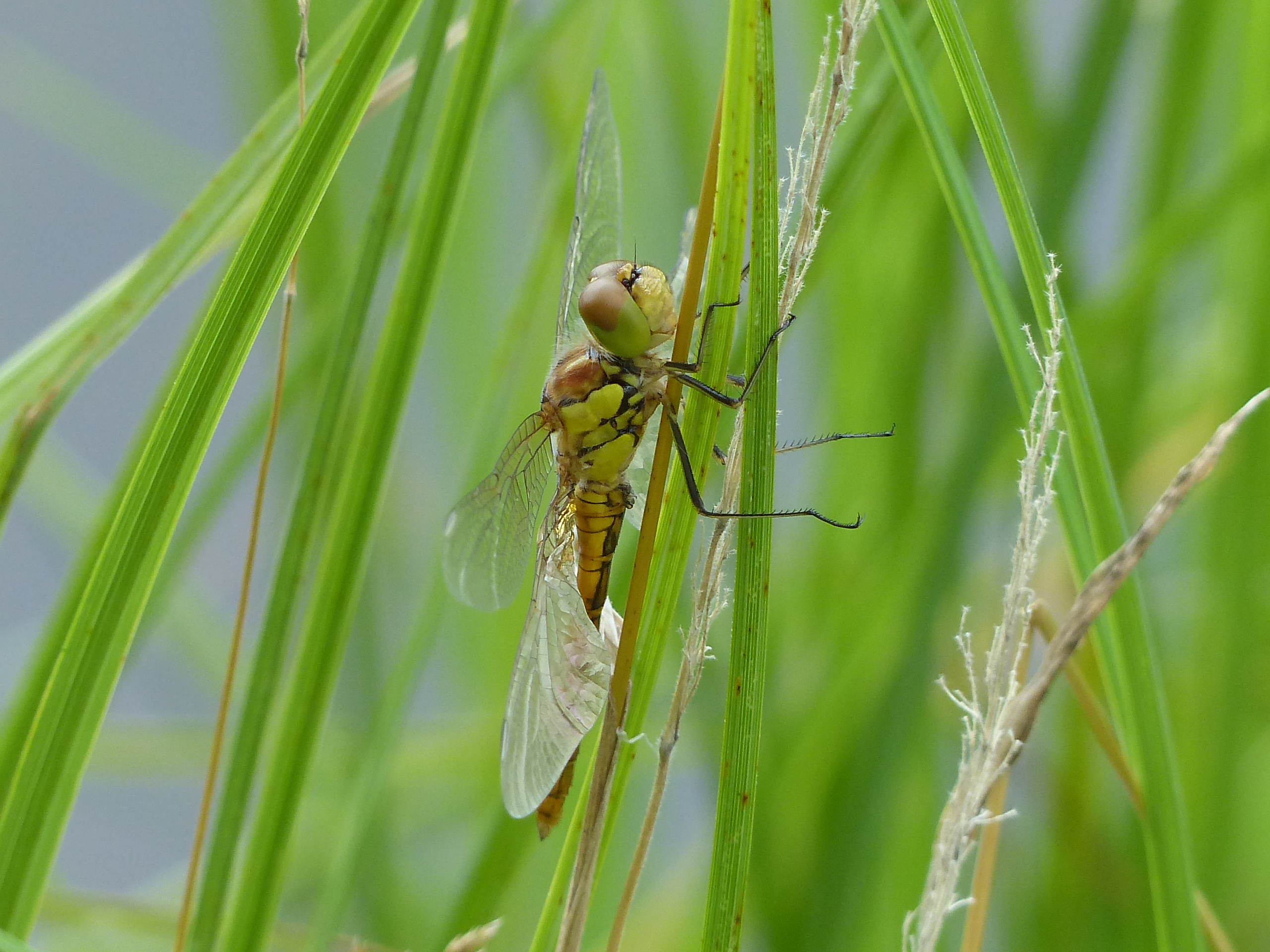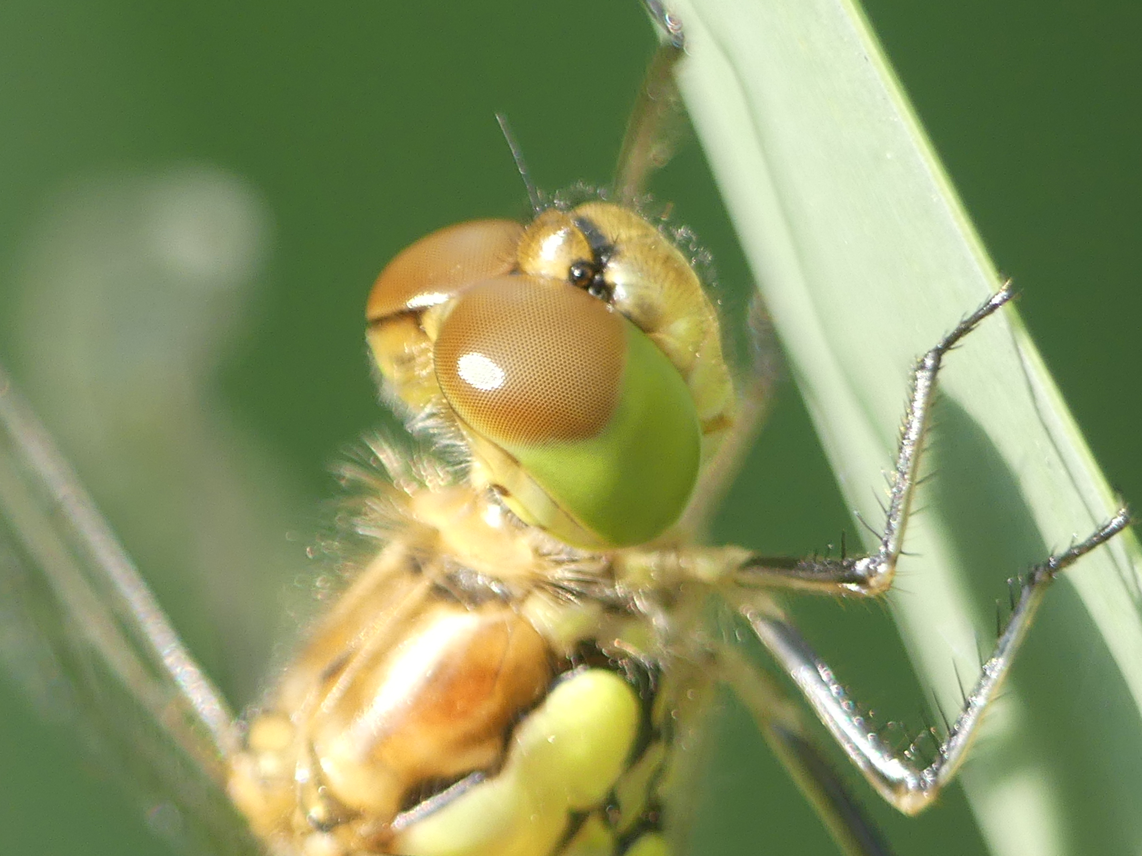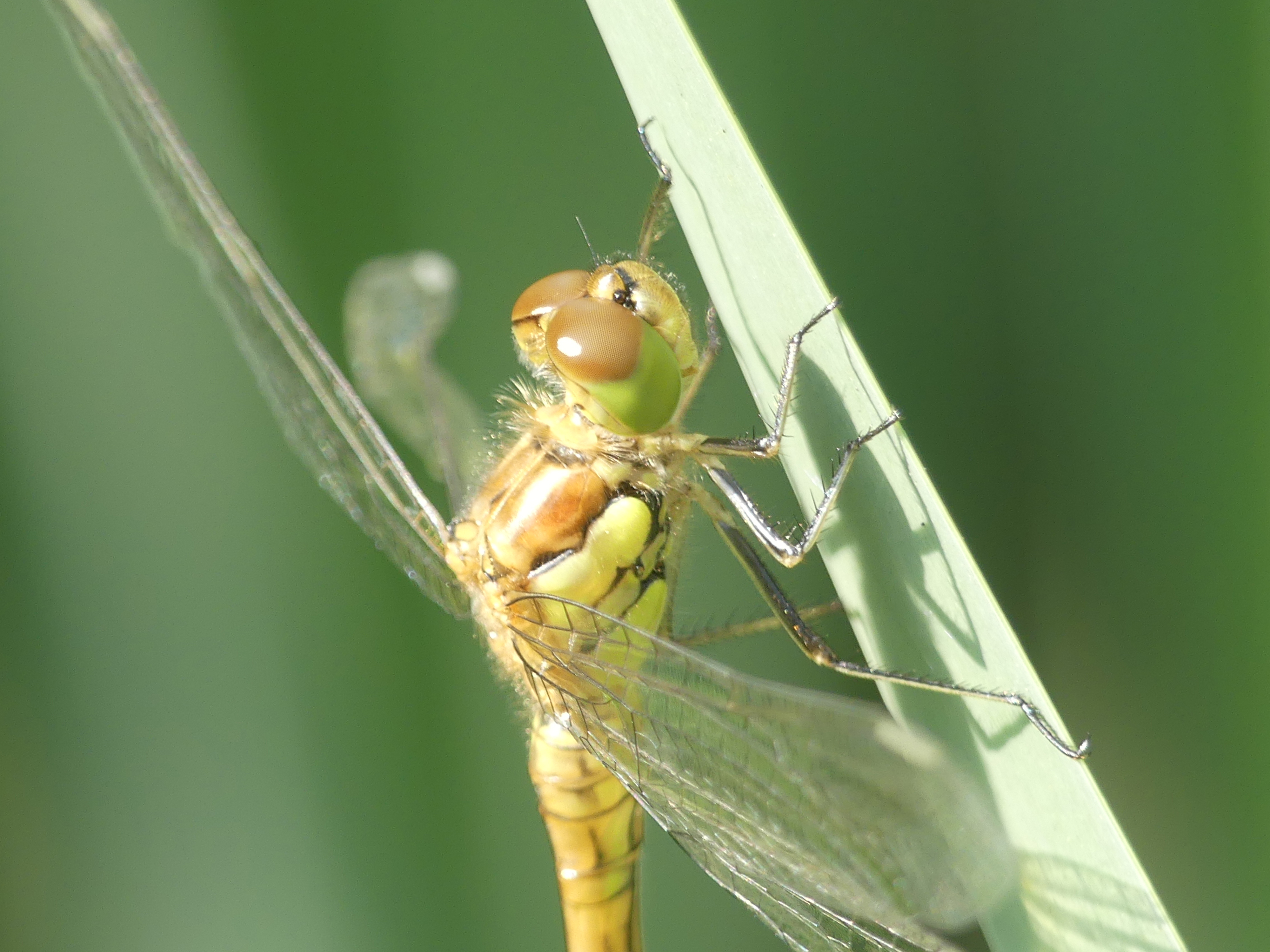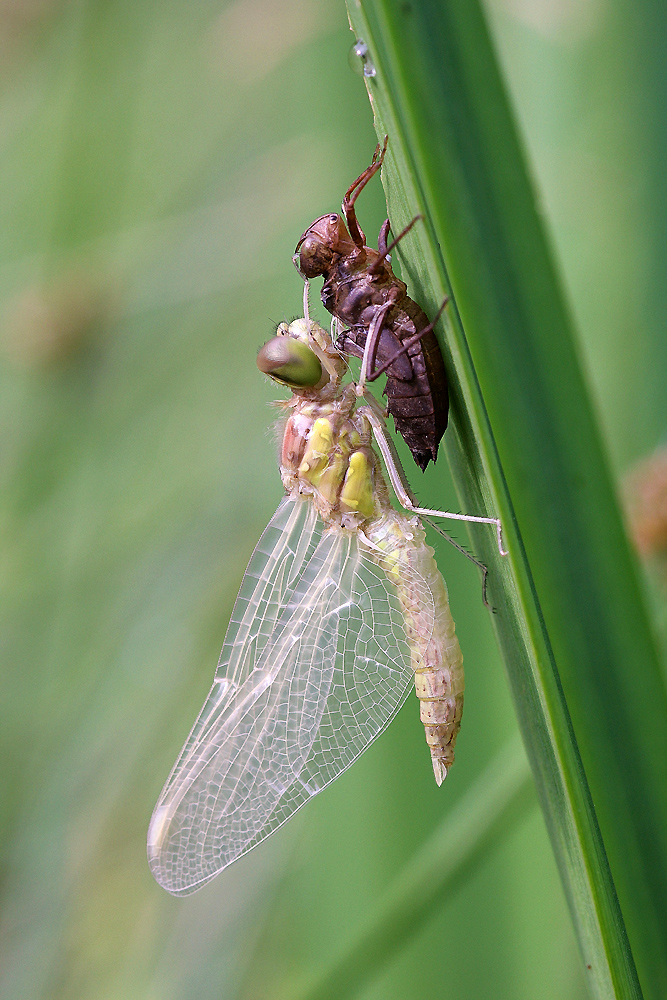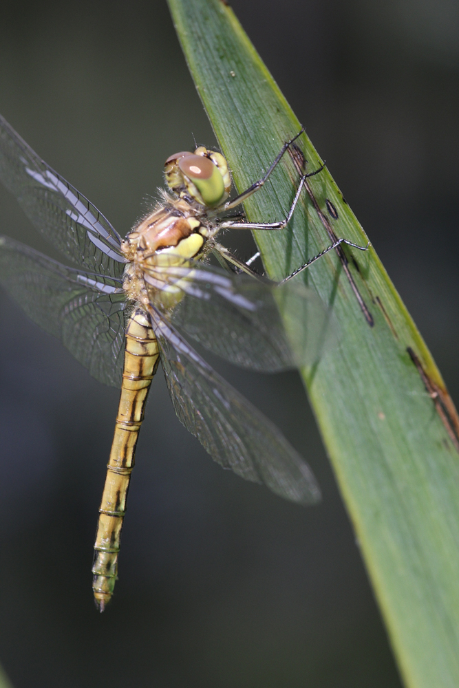 Große Heidelibelle beim Schlpf fotografiert bei Zwickau, Juli 2013 Erkennungsmerkmale bereits nach dem Schlupf sichtbar; gelbe Längsstreifen an Beinen und keine dunkle Zeichnung, die an den Augen herabläuft.