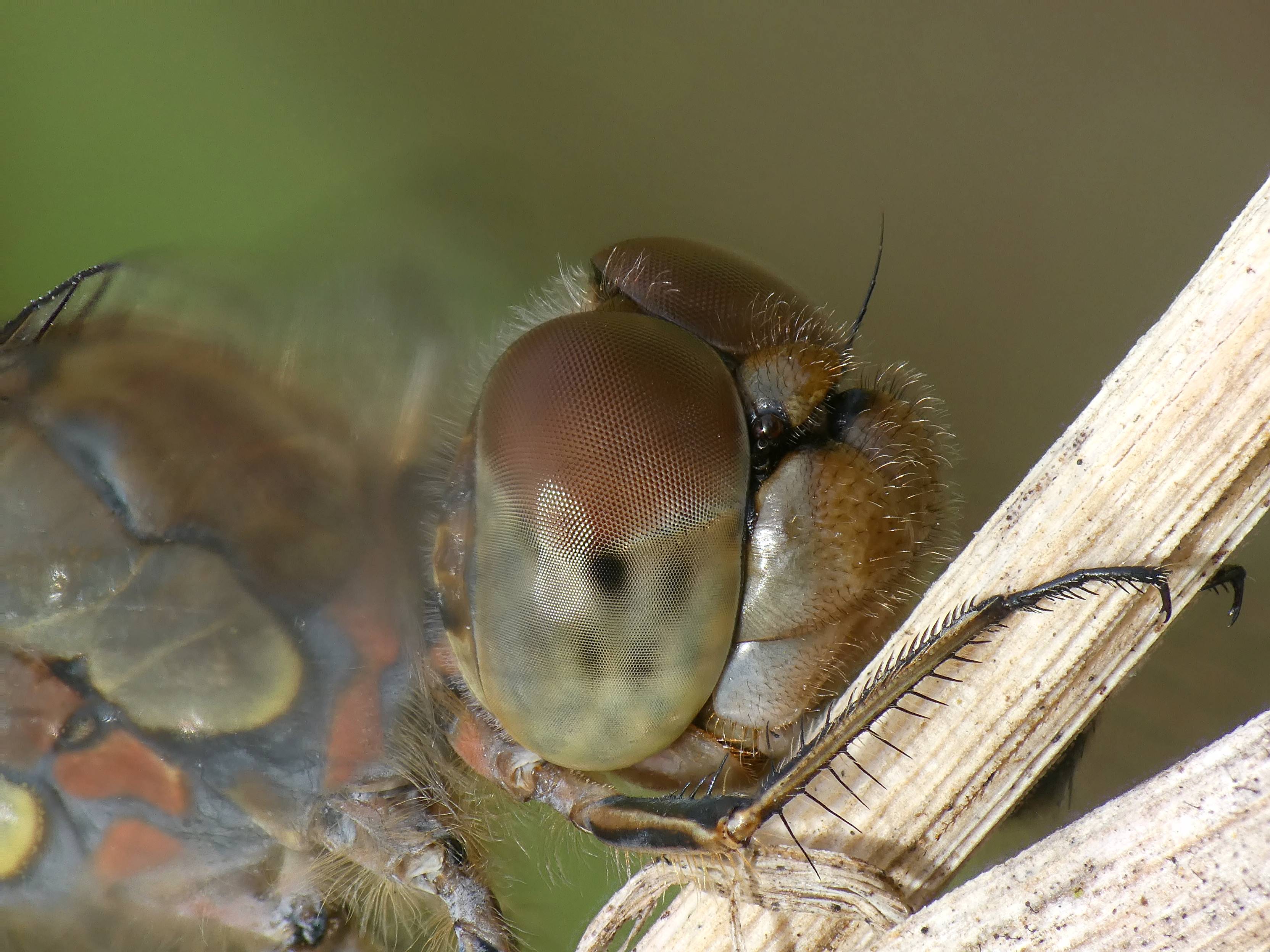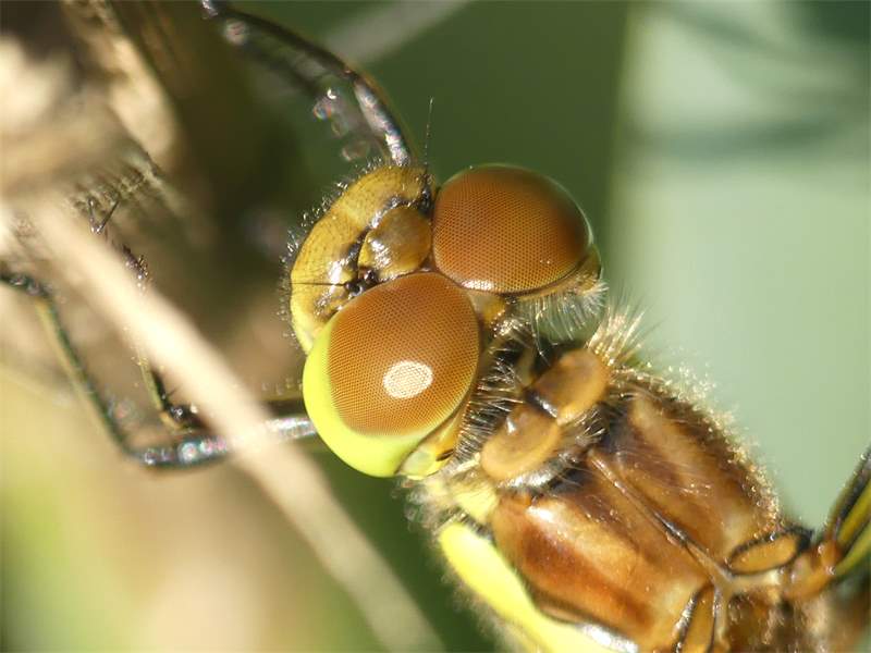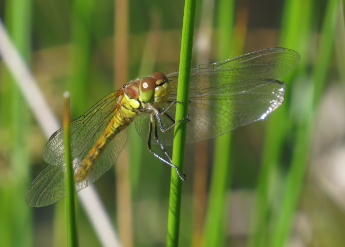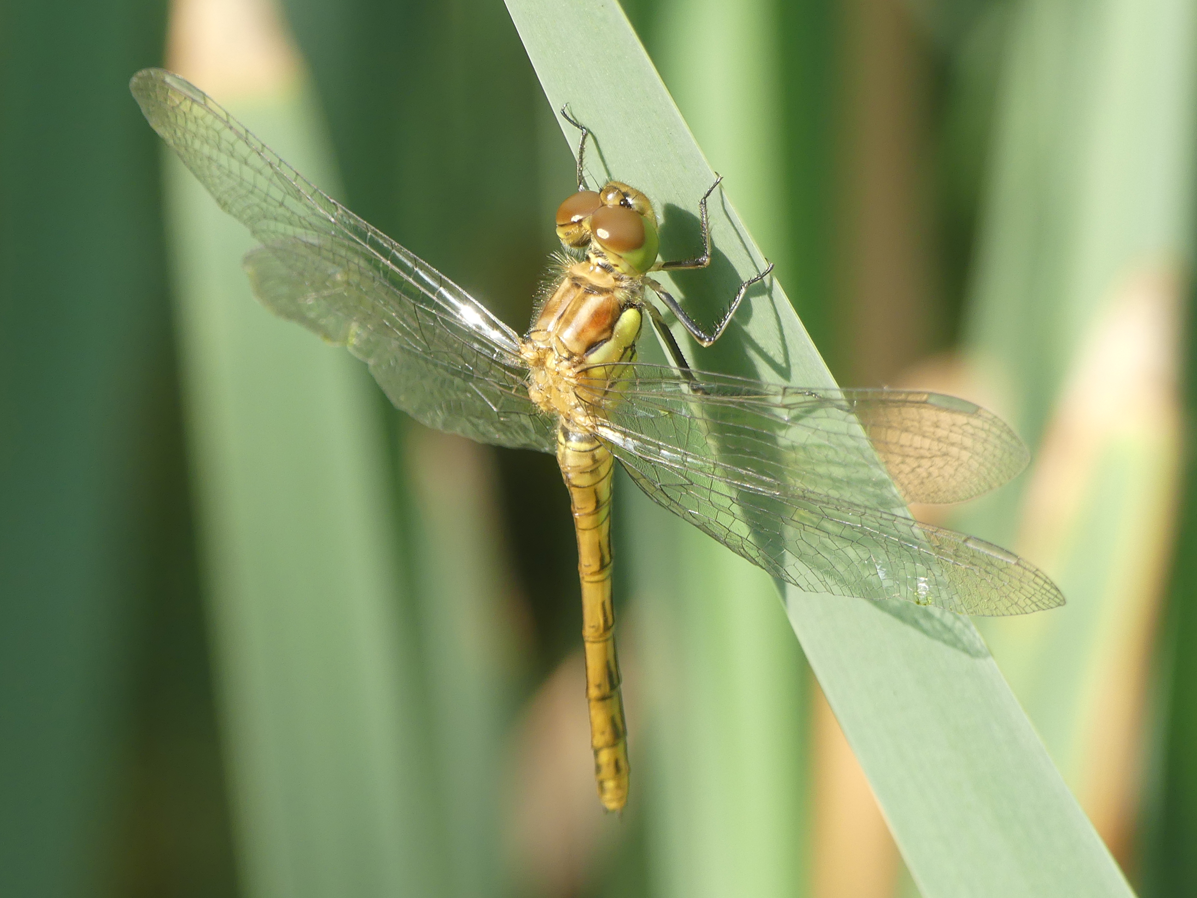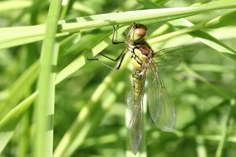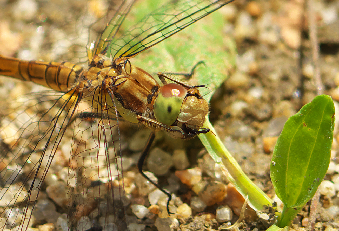 Große Heidelibelle beim Schlpf fotografiert bei Zwickau, Juli 2013 Erkennungsmerkmale bereits nach dem Schlupf sichtbar; gelbe Längsstreifen an Beinen und keine dunkle Zeichnung, die an den Augen herabläuft.