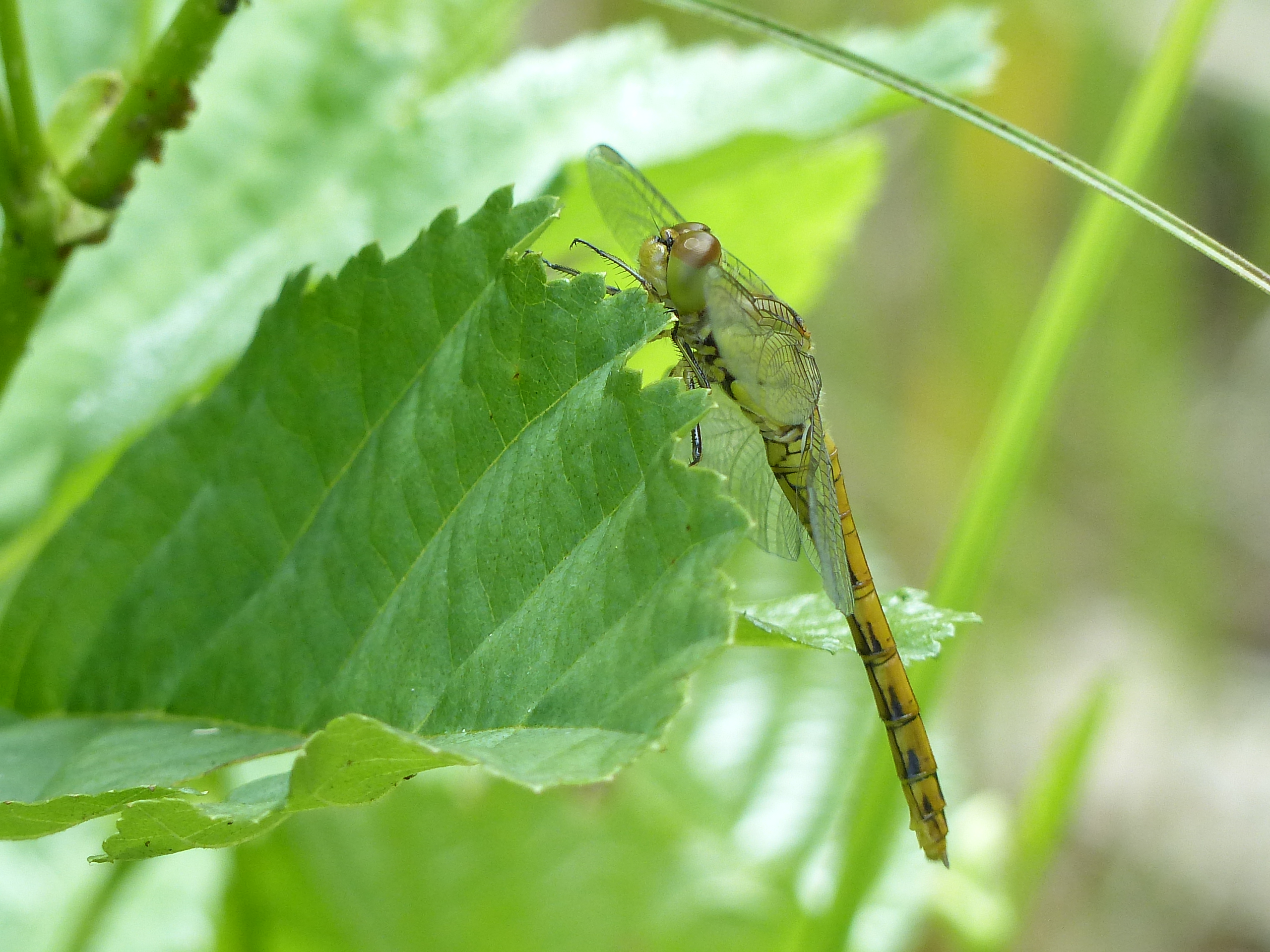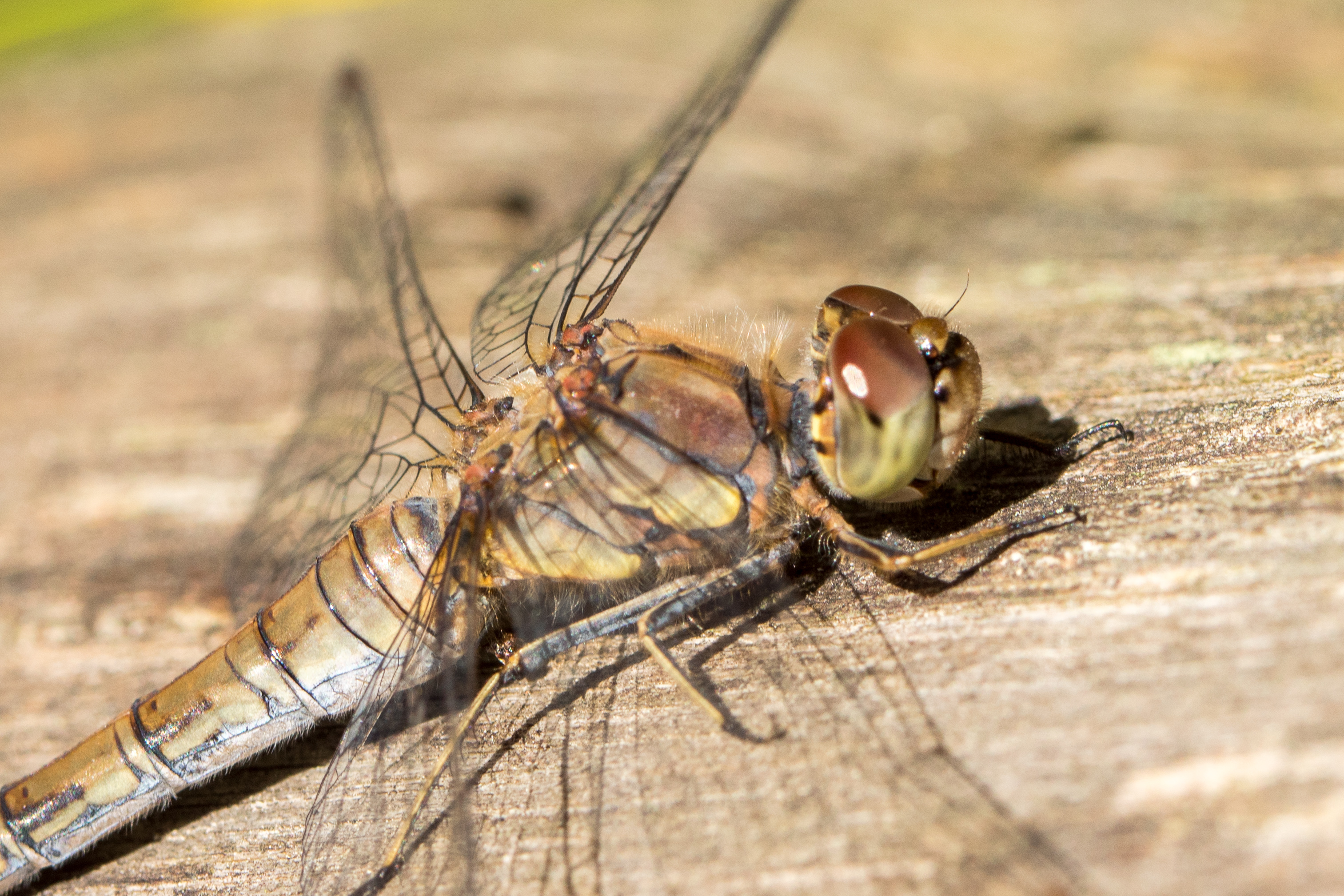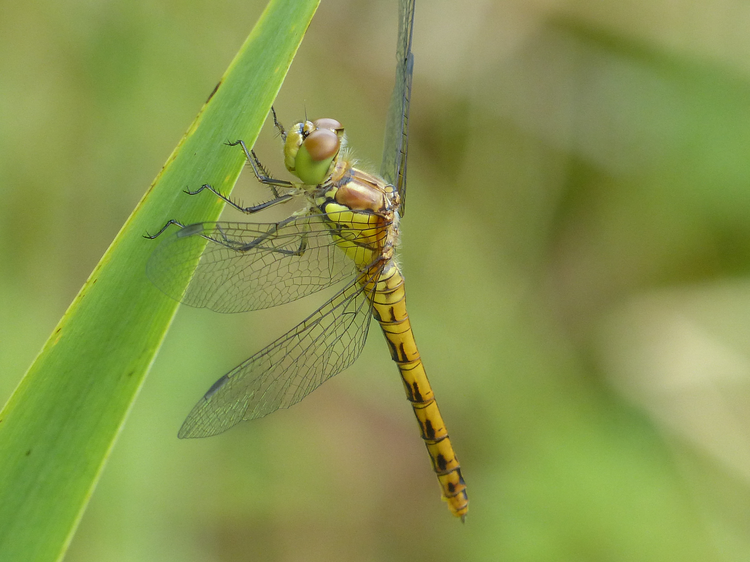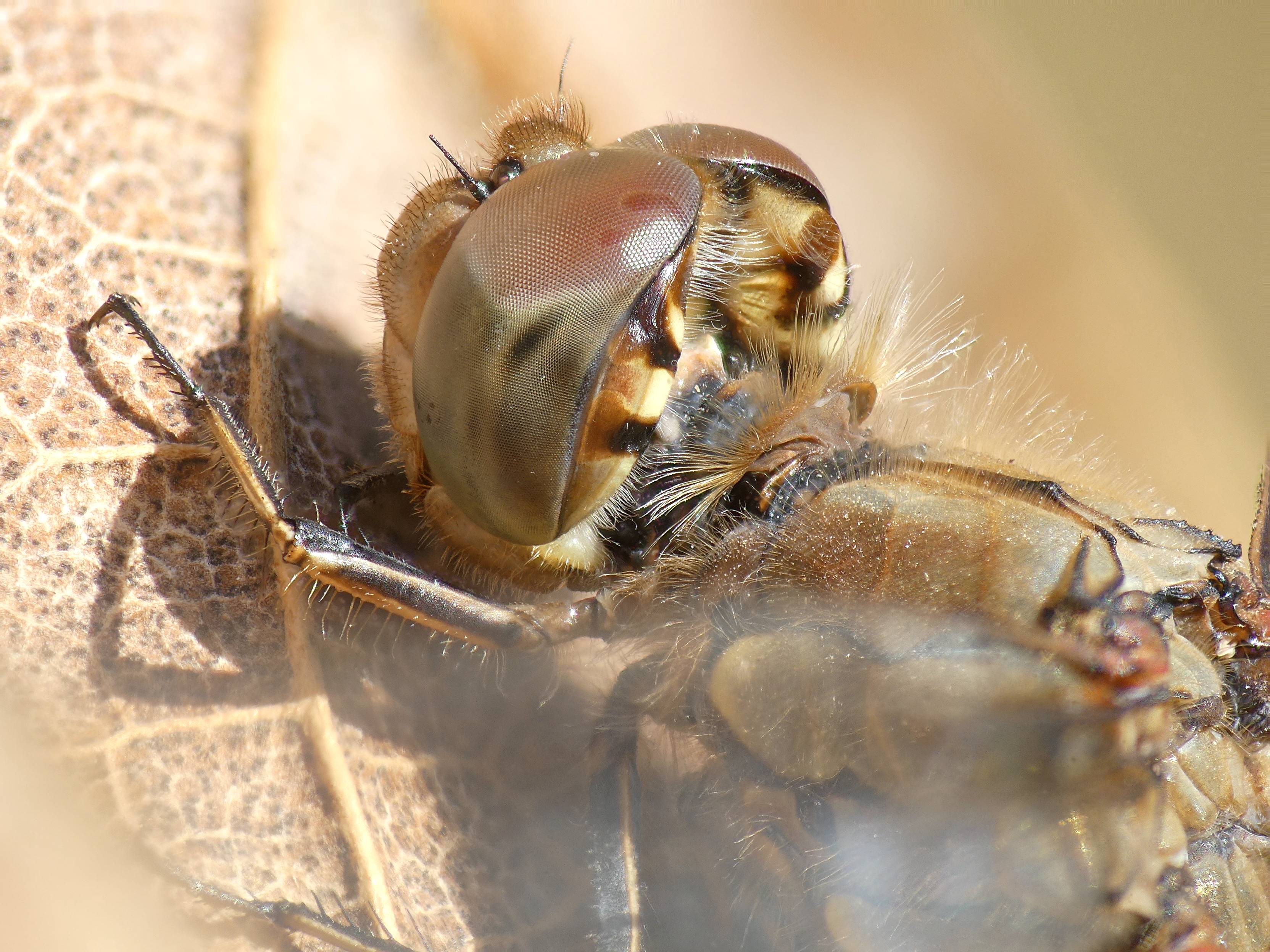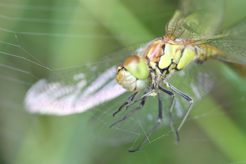 Große Heidelibelle beim Schlpf fotografiert bei Zwickau, Juli 2013 Erkennungsmerkmale bereits nach dem Schlupf sichtbar; gelbe Längsstreifen an Beinen und keine dunkle Zeichnung, die an den Augen herabläuft.