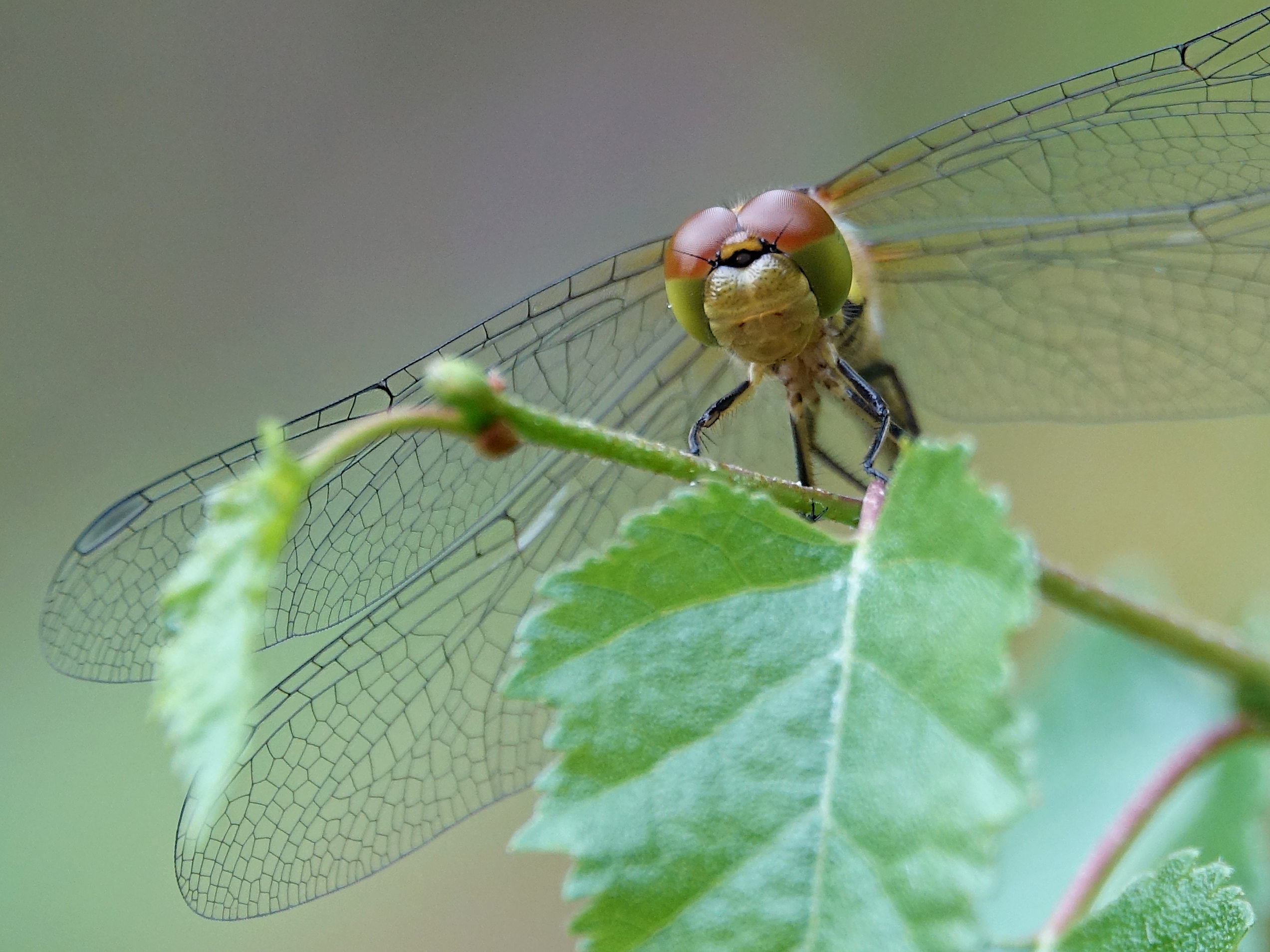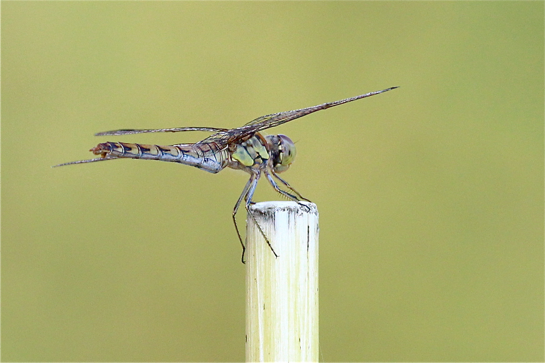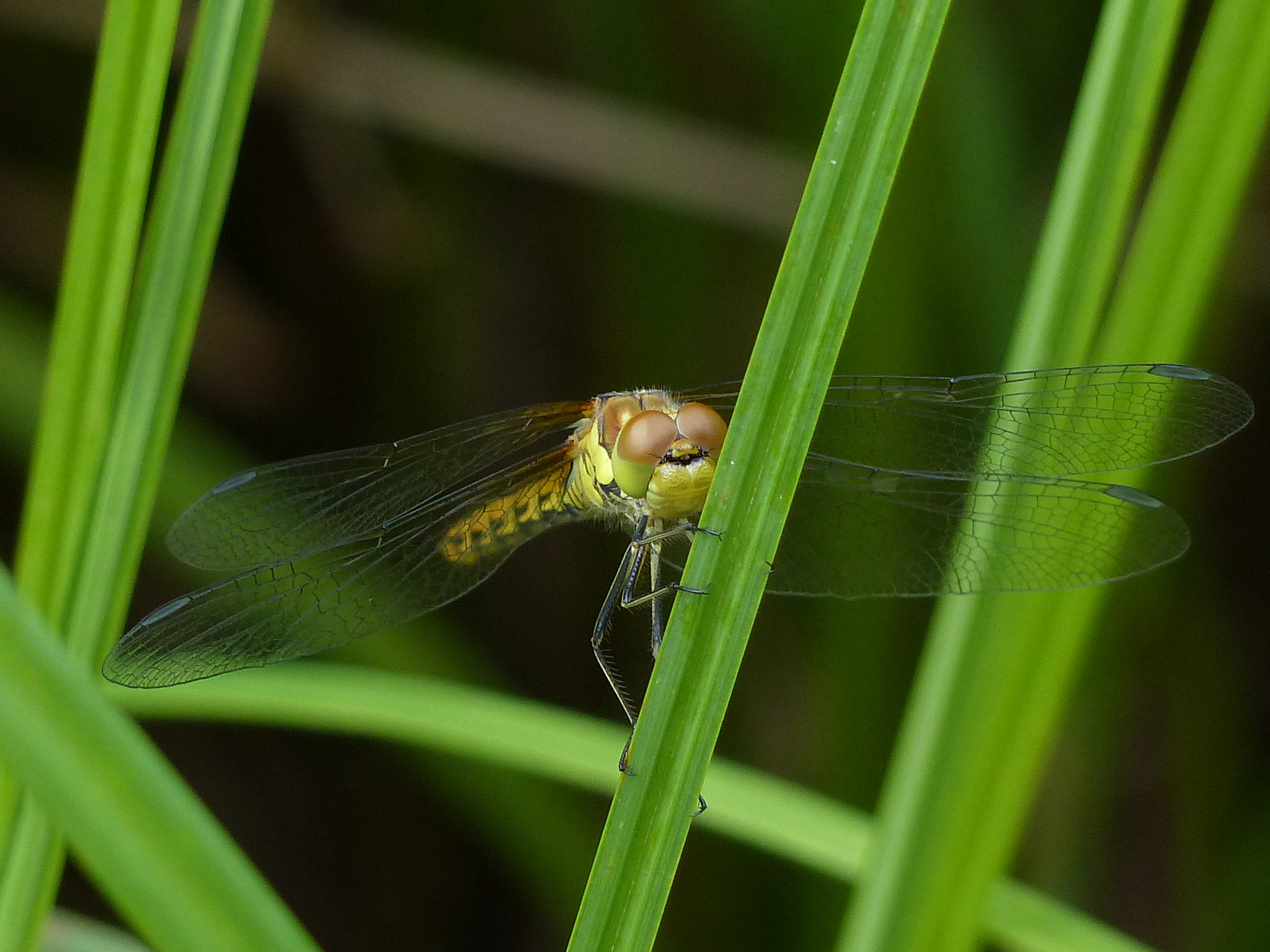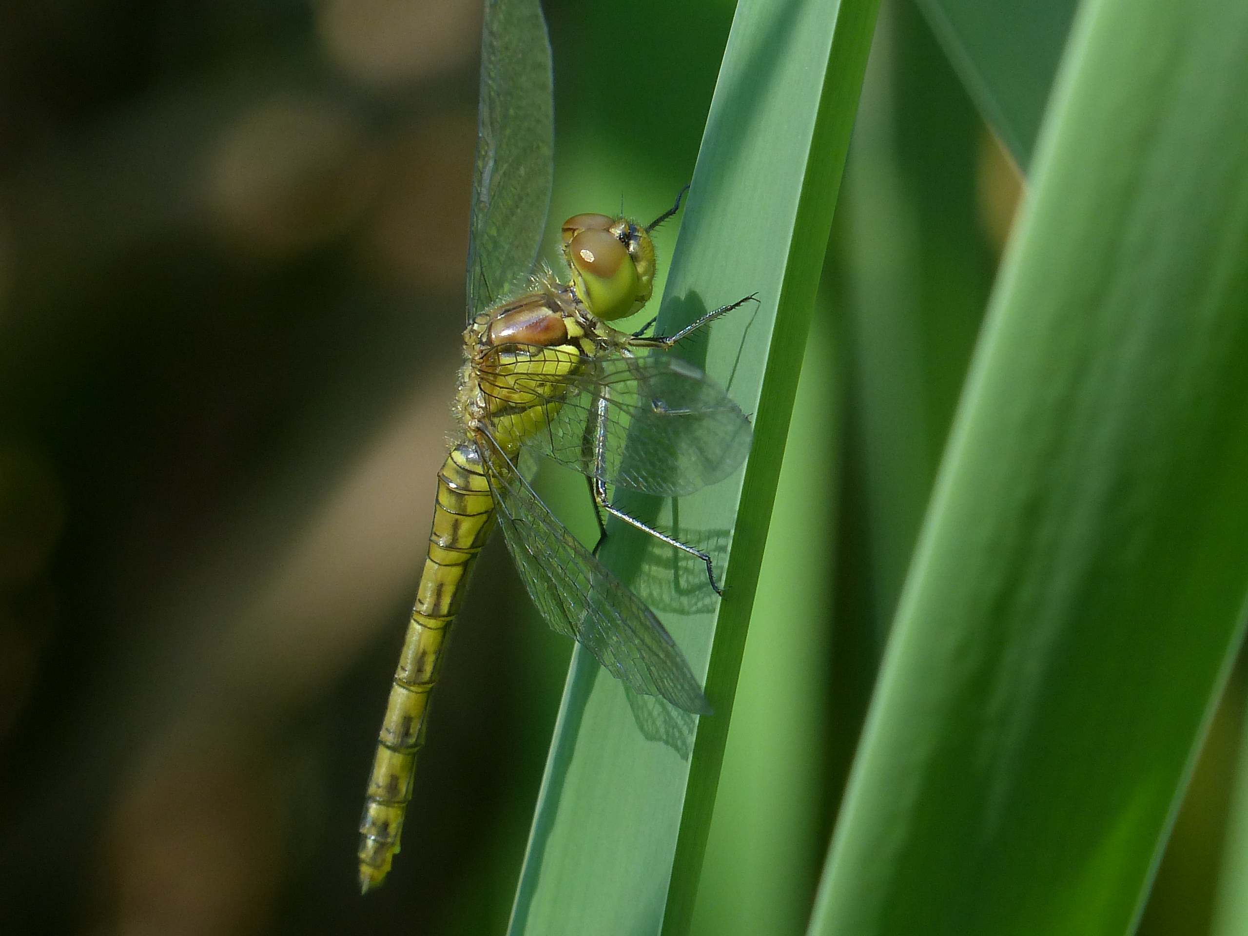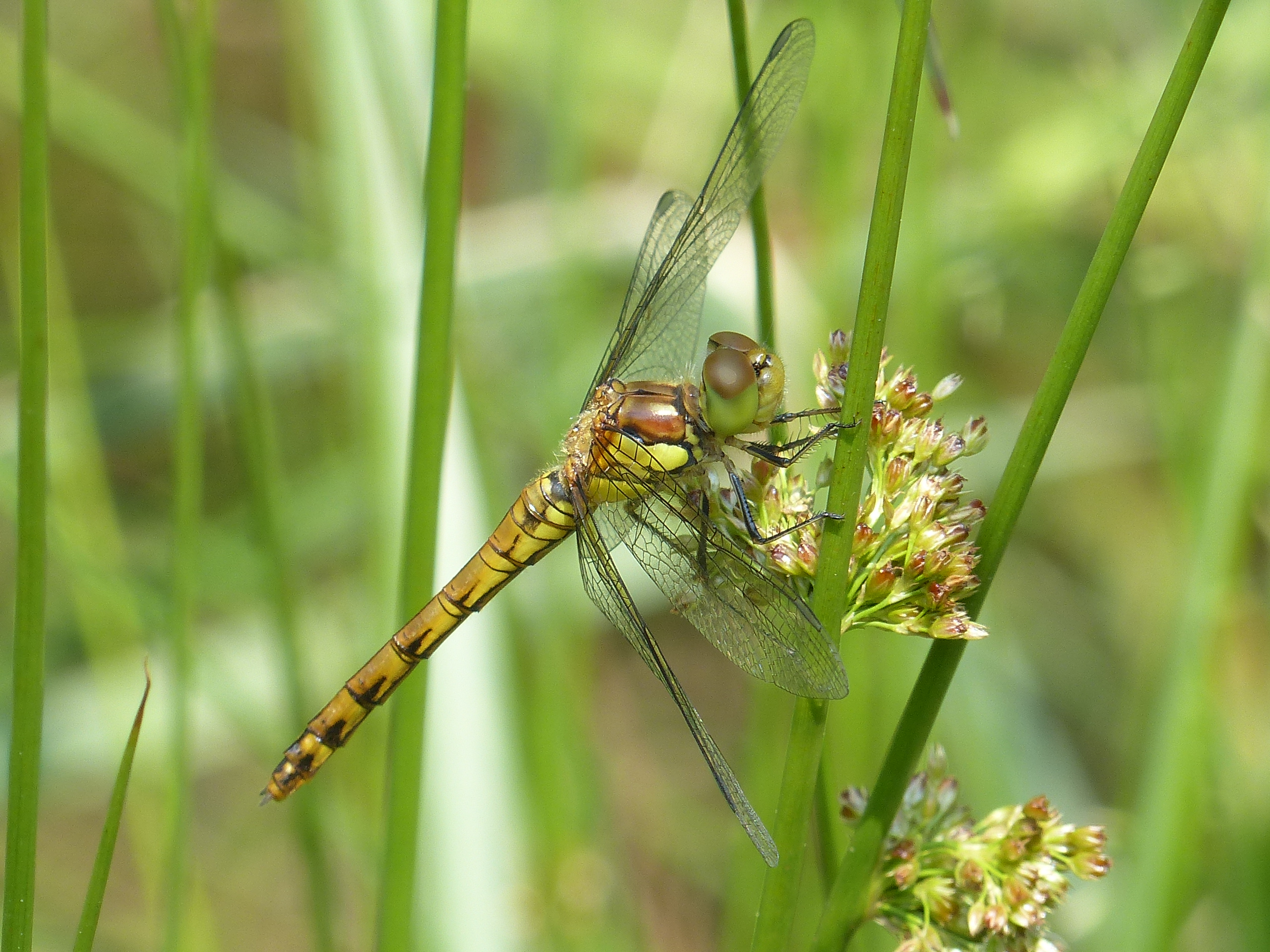 Große Heidelibelle beim Schlpf fotografiert bei Zwickau, Juli 2013 Erkennungsmerkmale bereits nach dem Schlupf sichtbar; gelbe Längsstreifen an Beinen und keine dunkle Zeichnung, die an den Augen herabläuft.