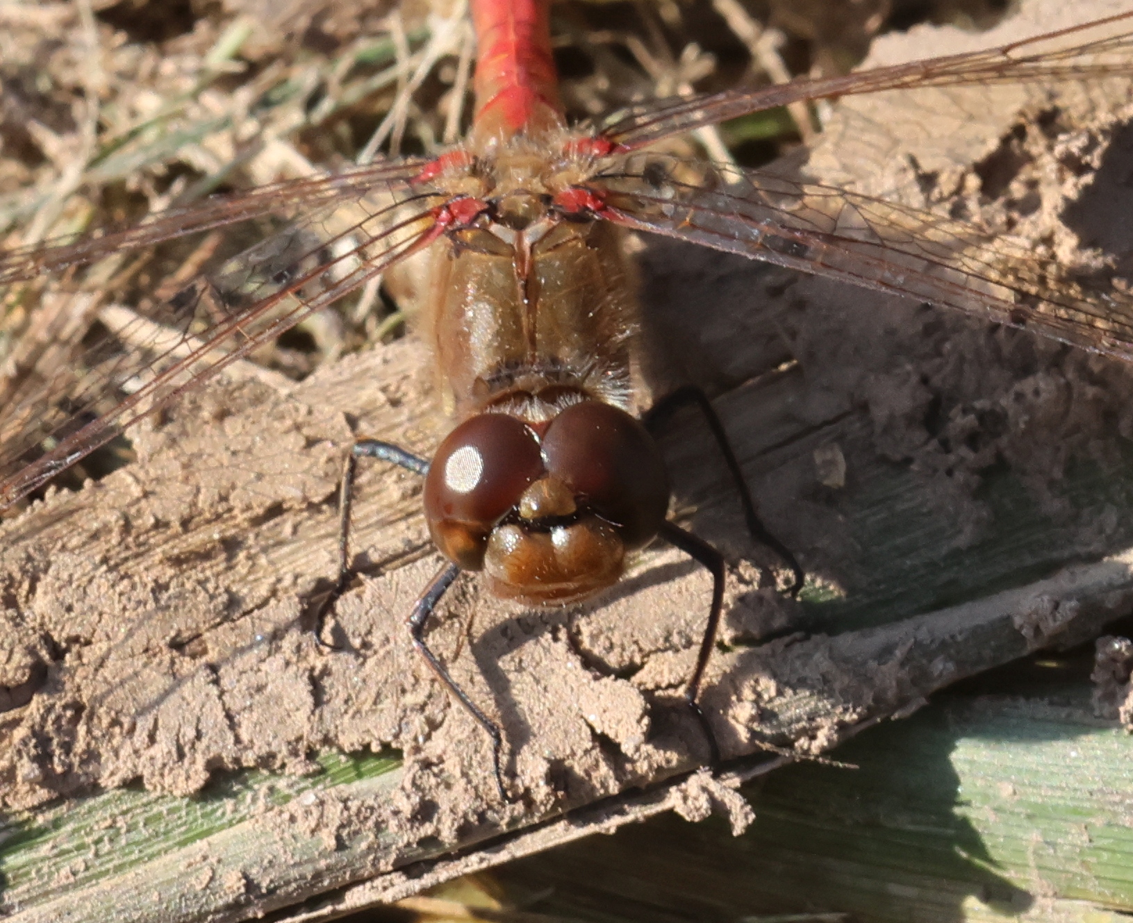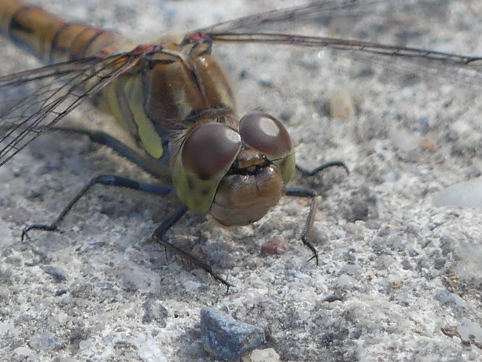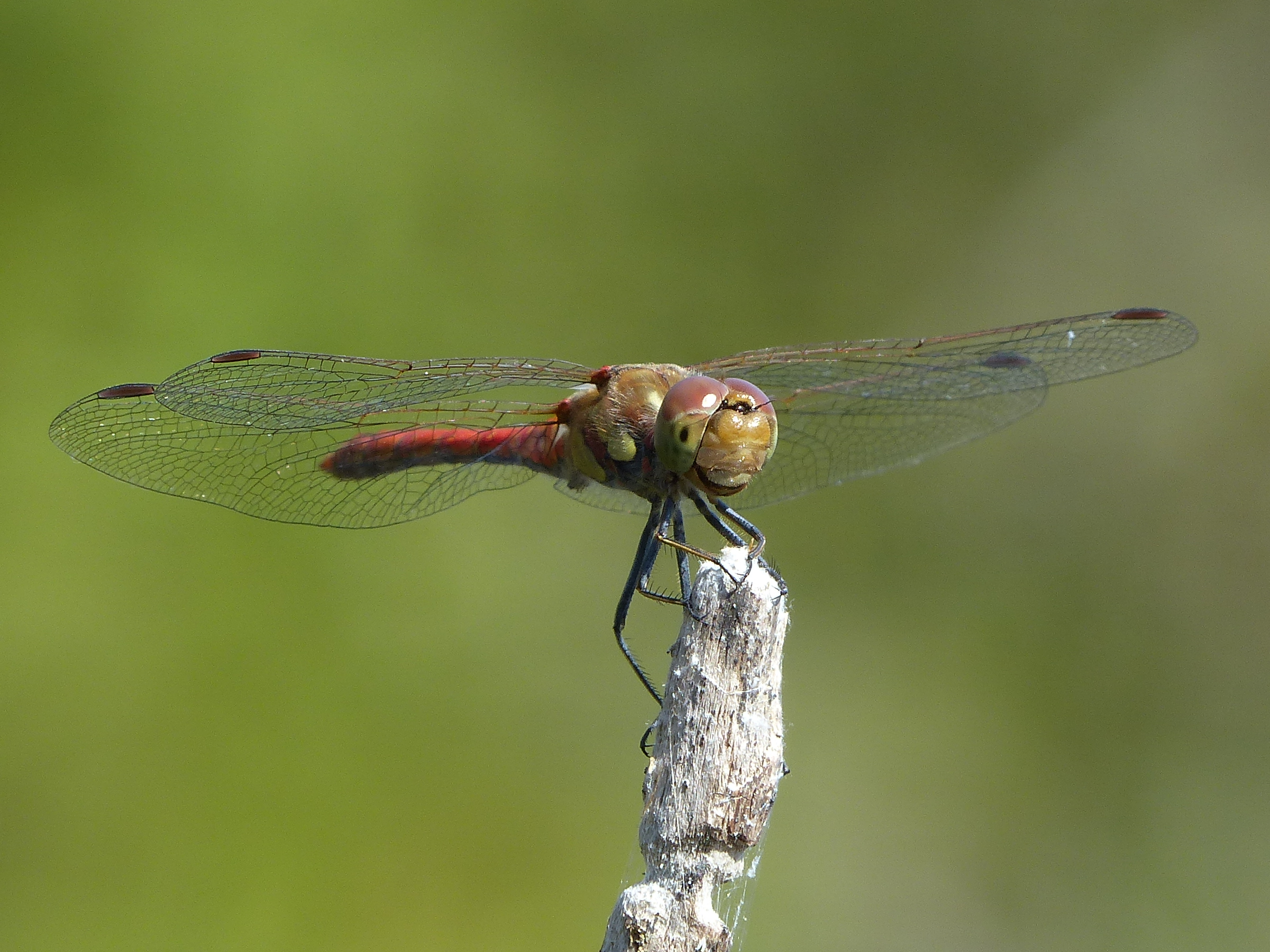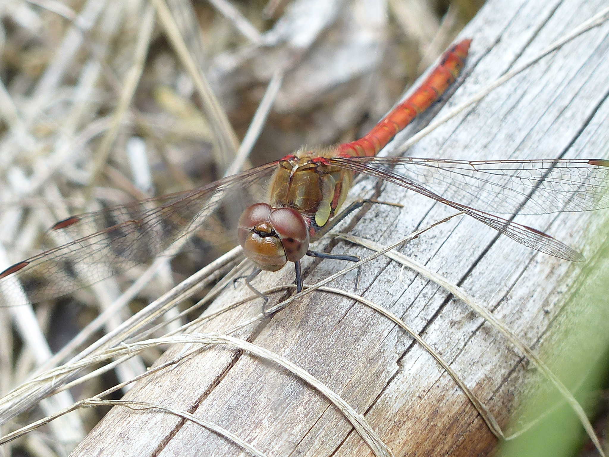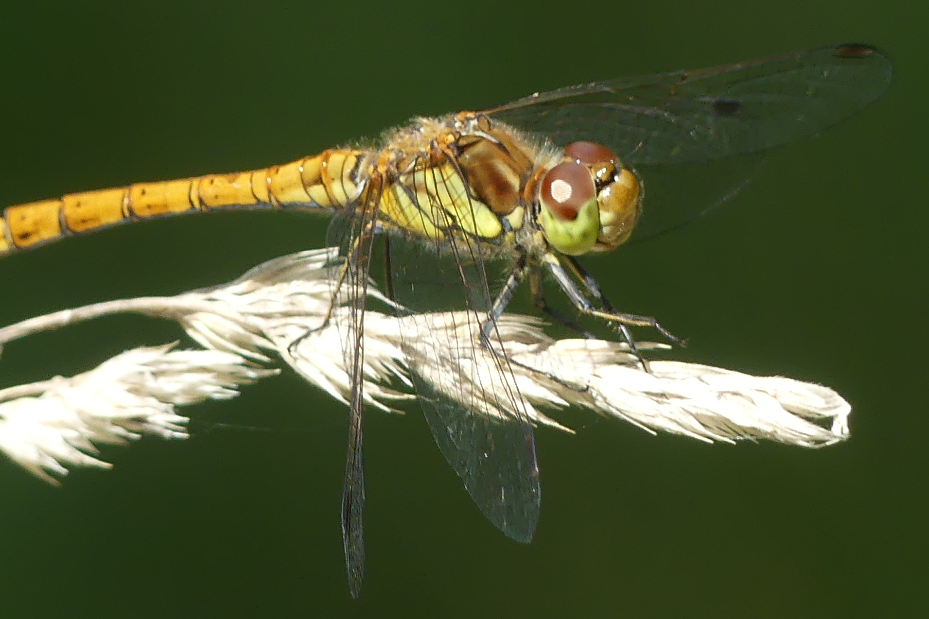Große Heidelibelle, kenntlich an der waagerechten schwarzen Querlinie auf der Stirn vor den Augen, die nicht an den Augen herabläuft, bei Zwickau, Juli 2013