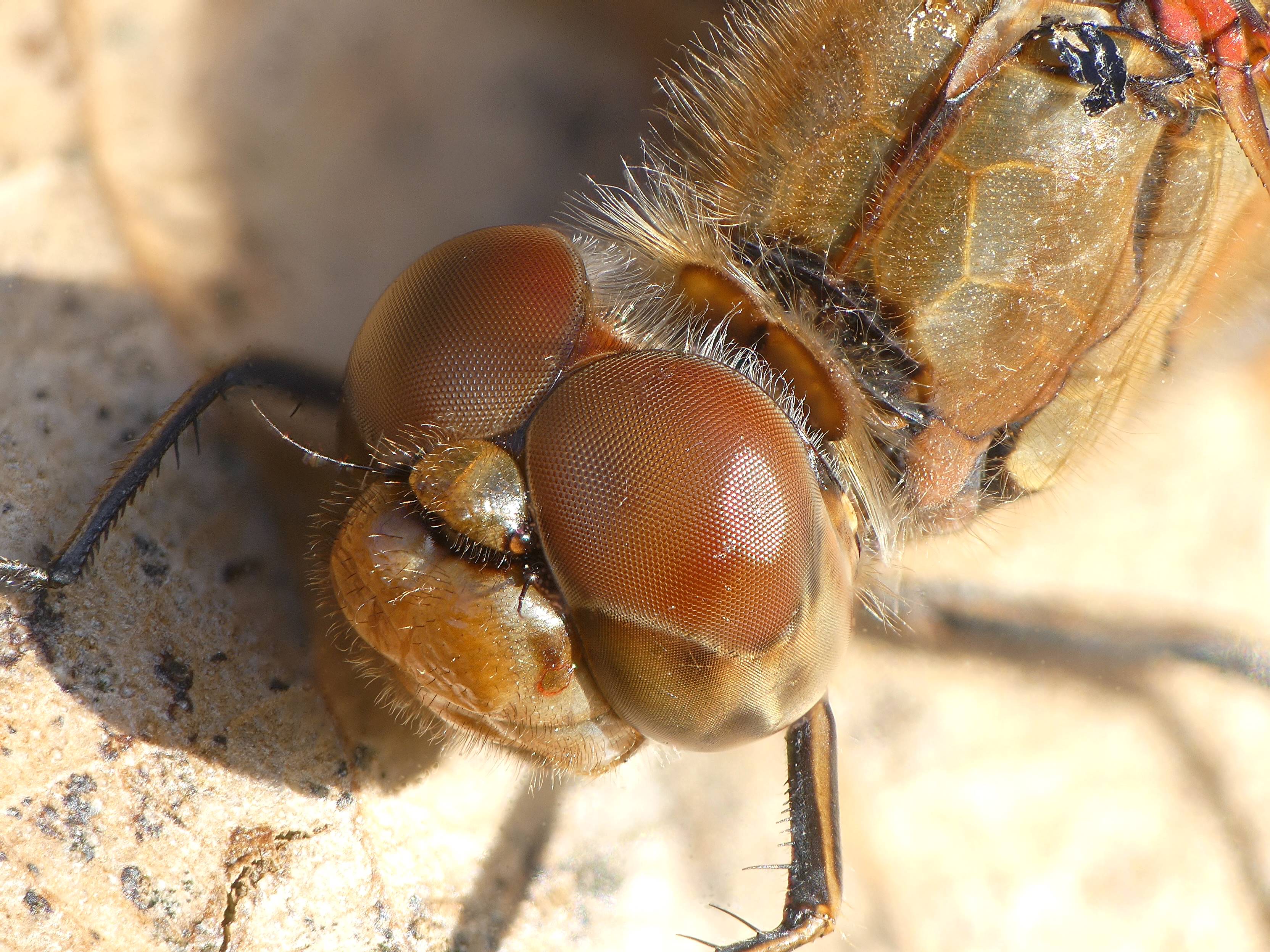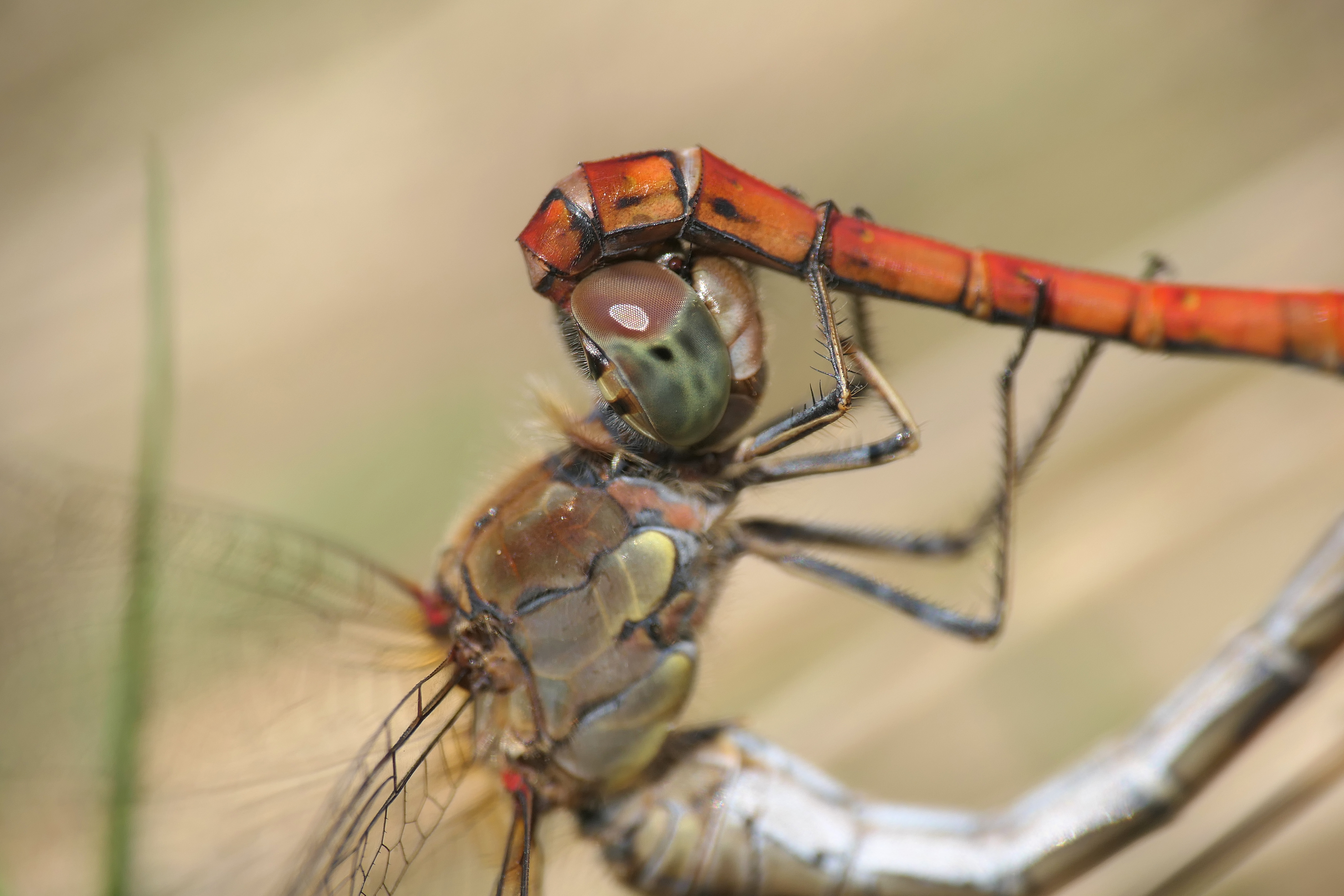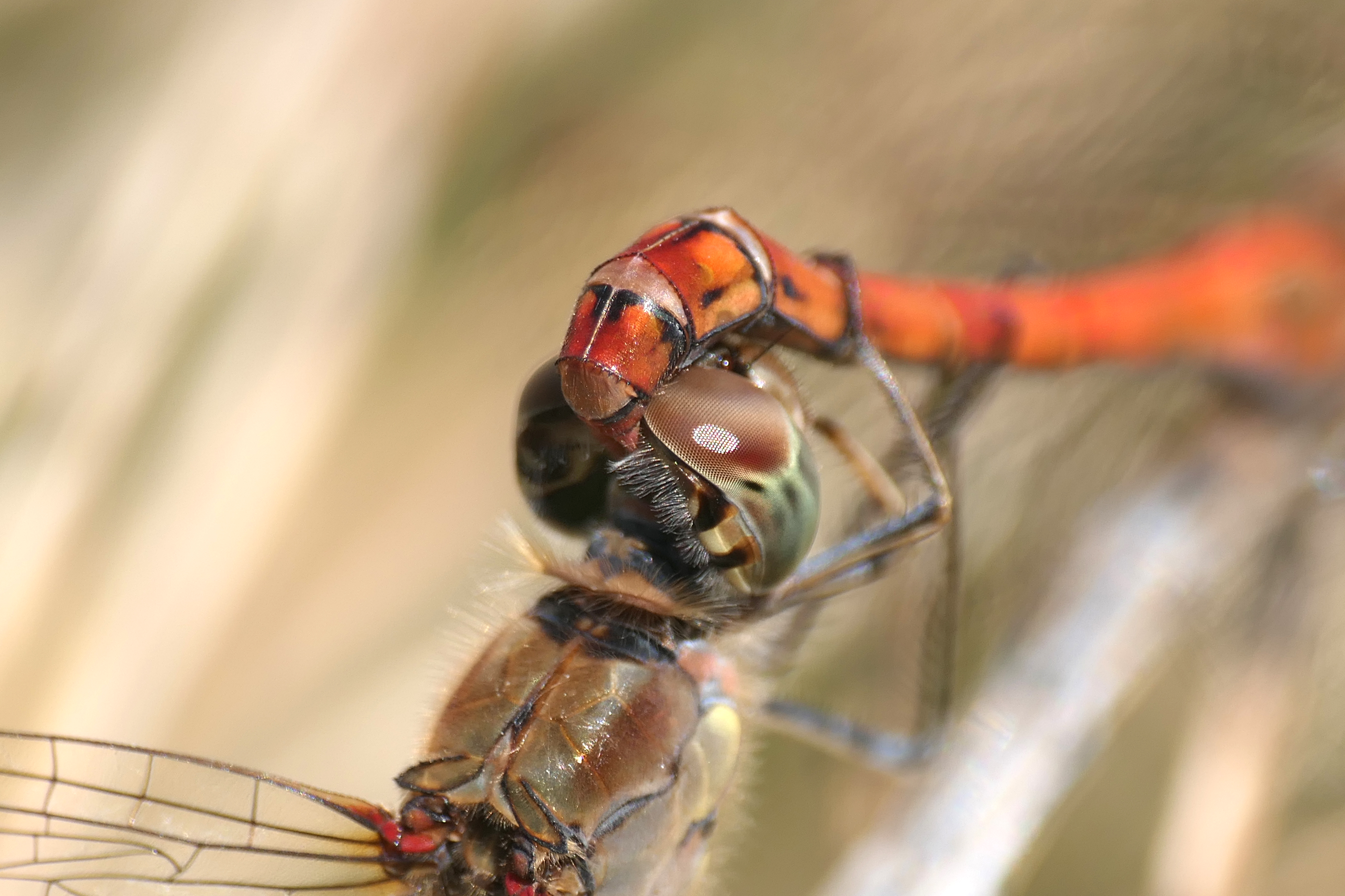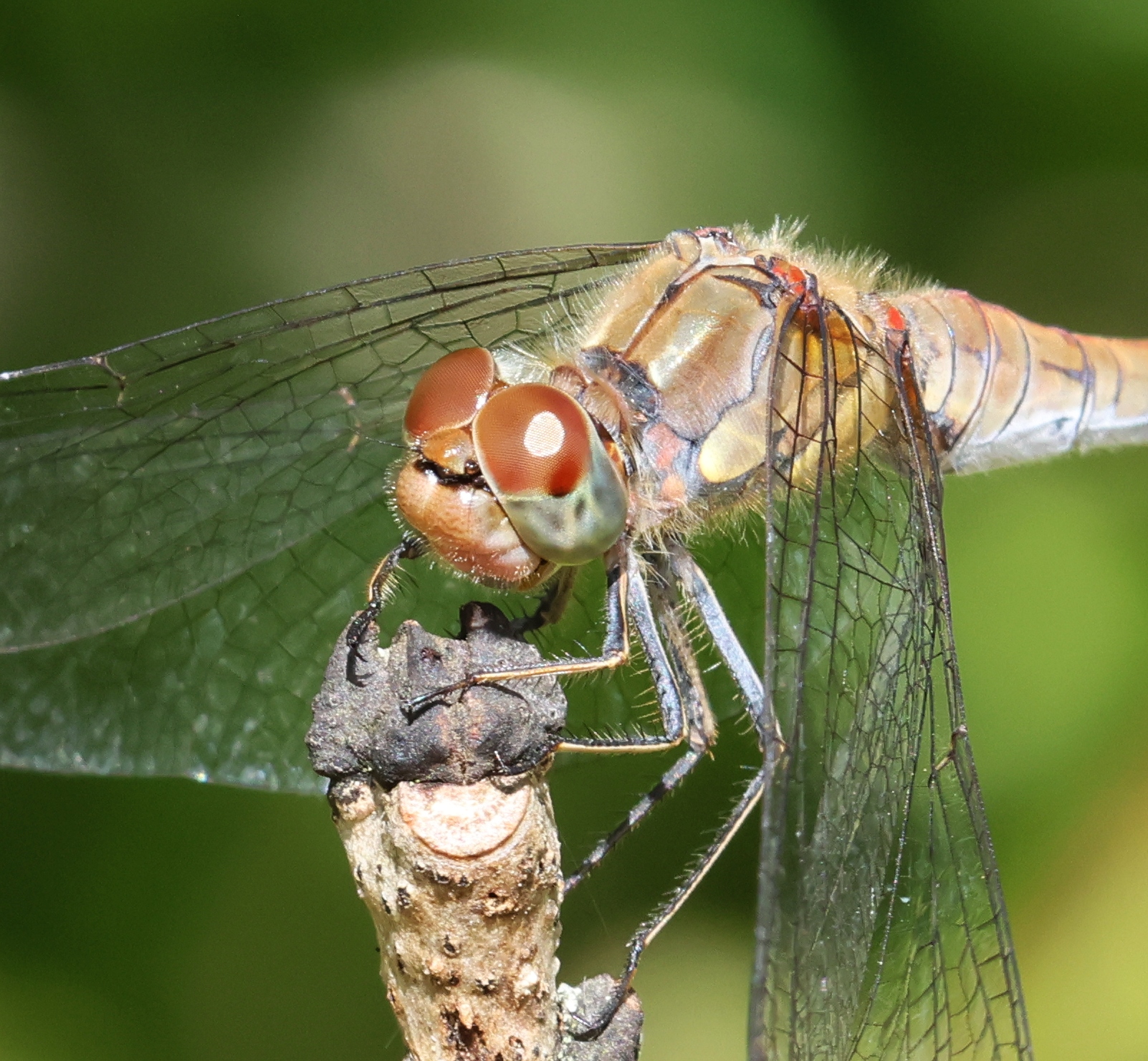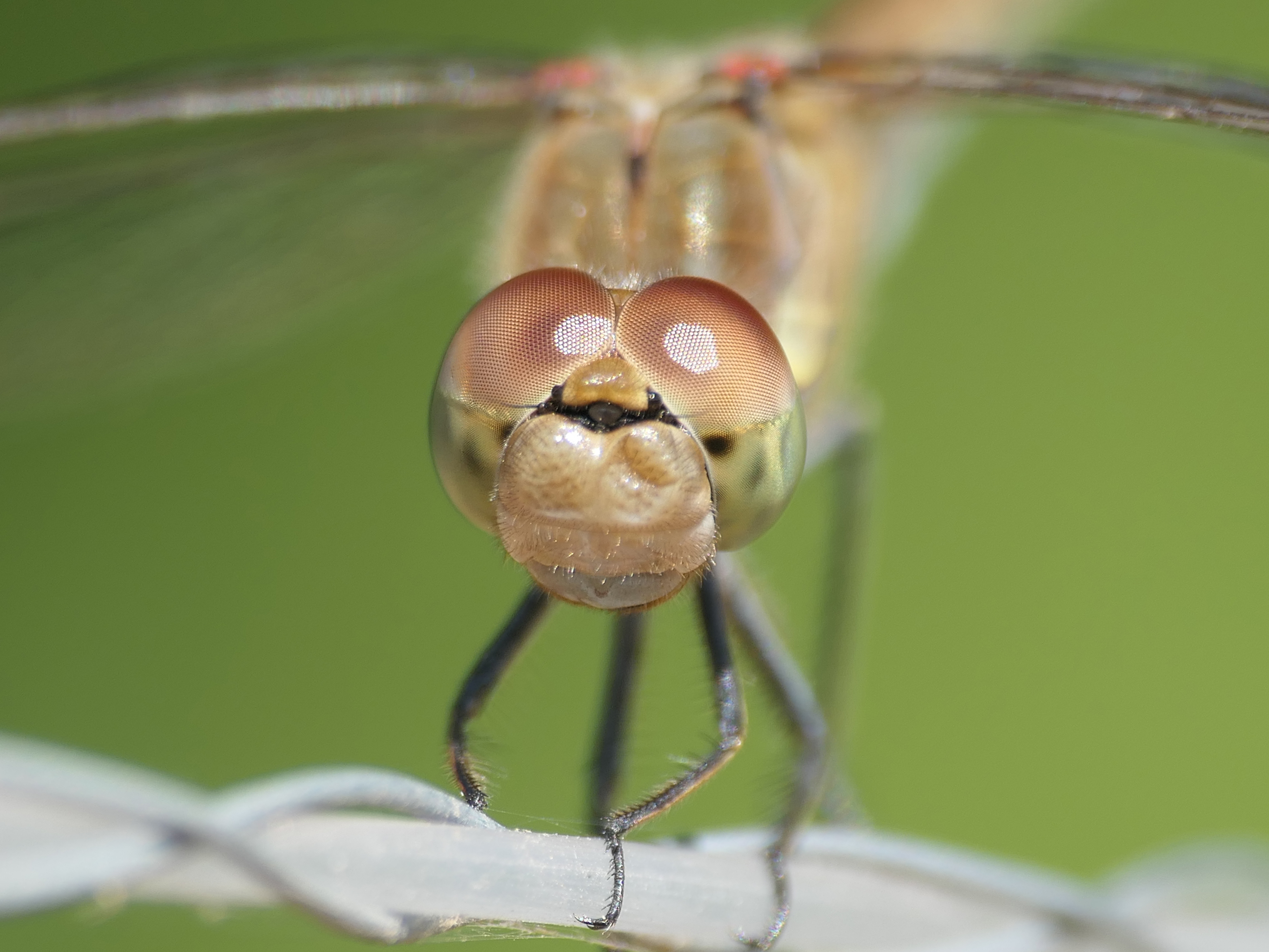 Große Heidelibelle, kenntlich an der waagerechten schwarzen Querlinie auf der Stirn vor den Augen, die nicht an den Augen herabläuft, bei Zwickau, Juli 2013