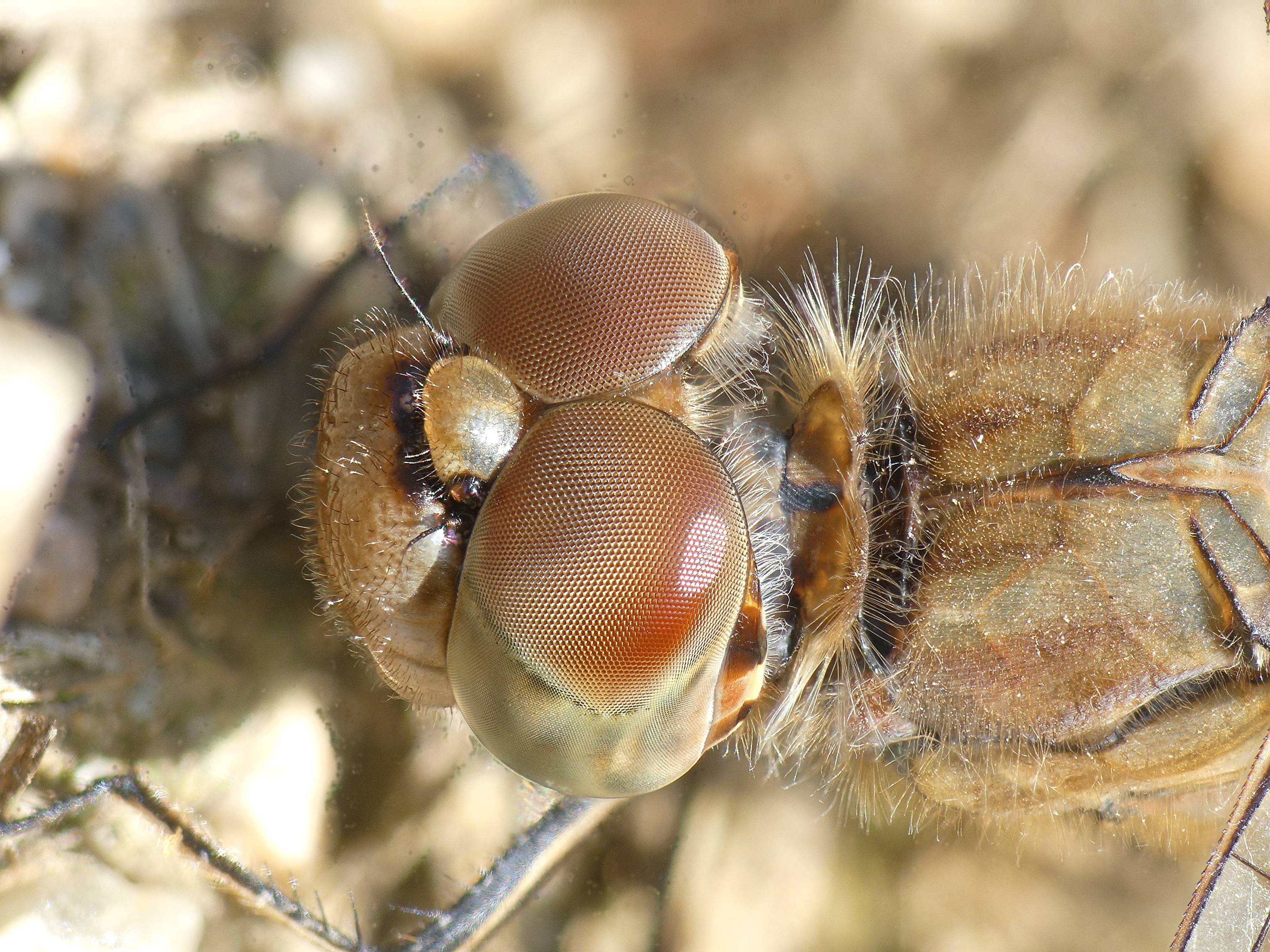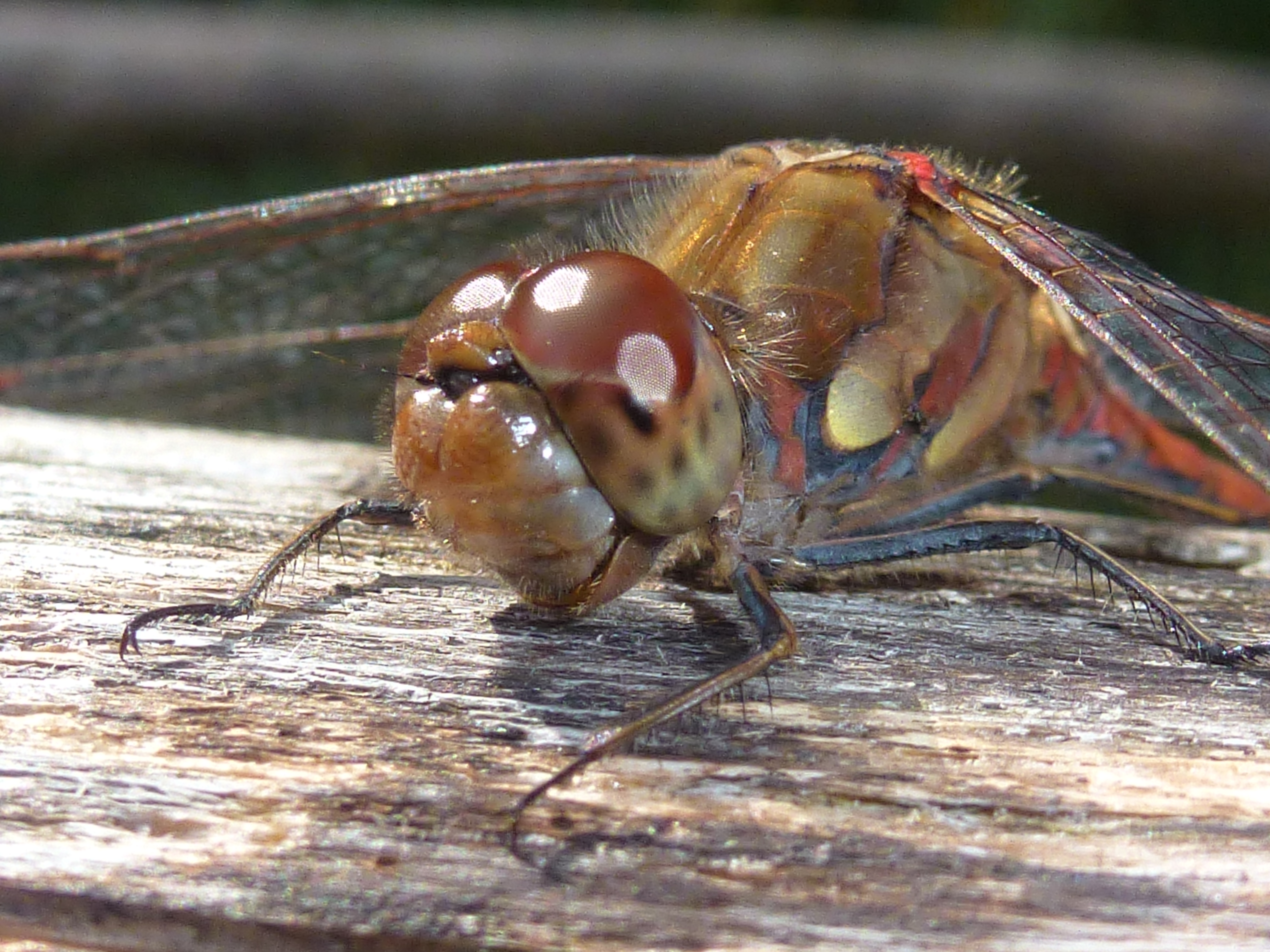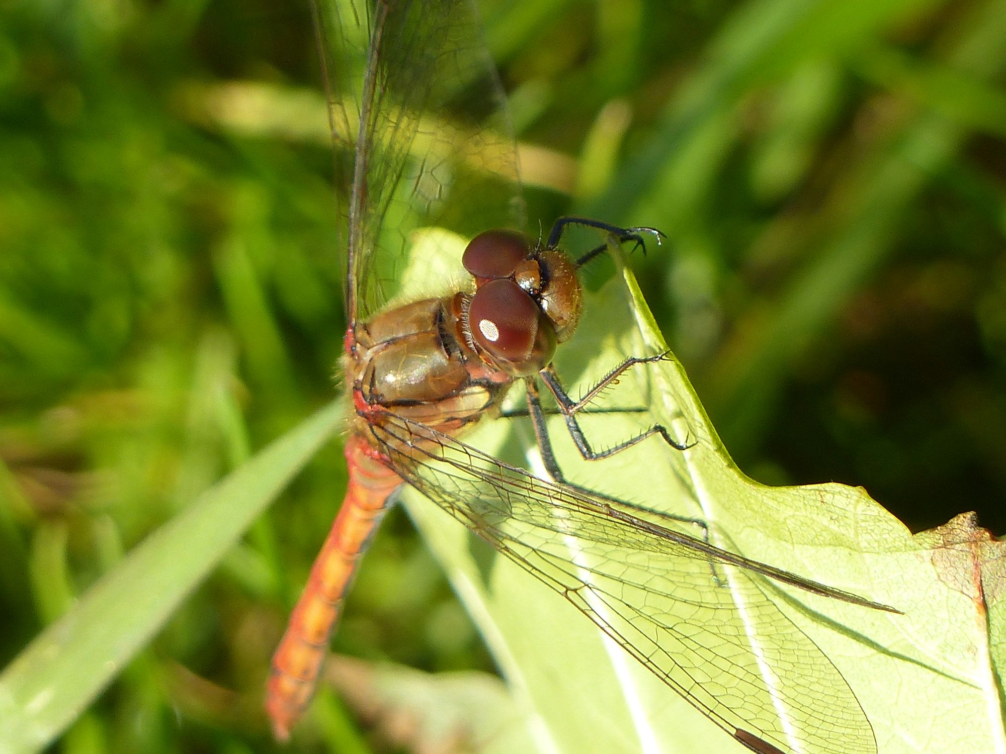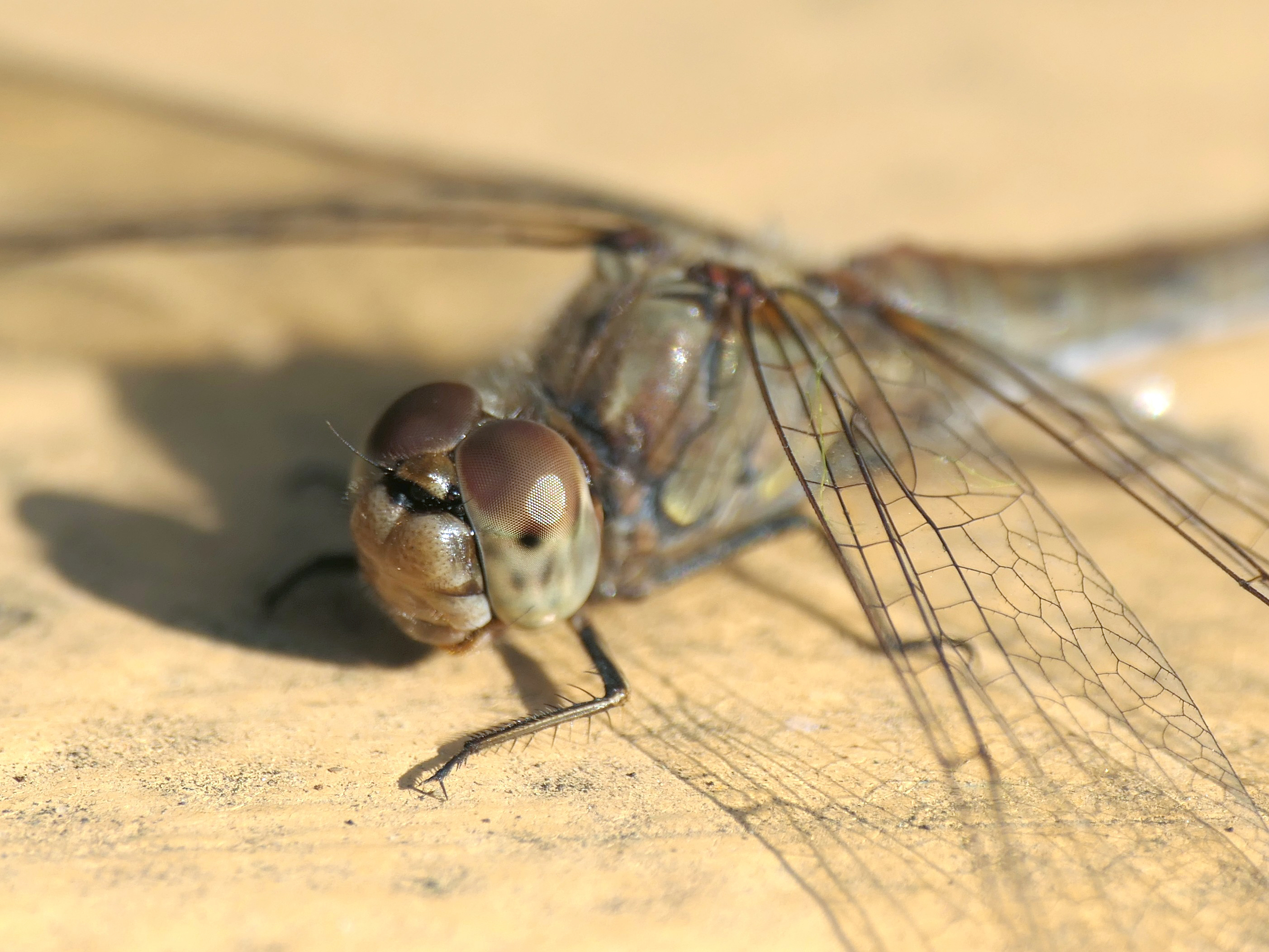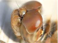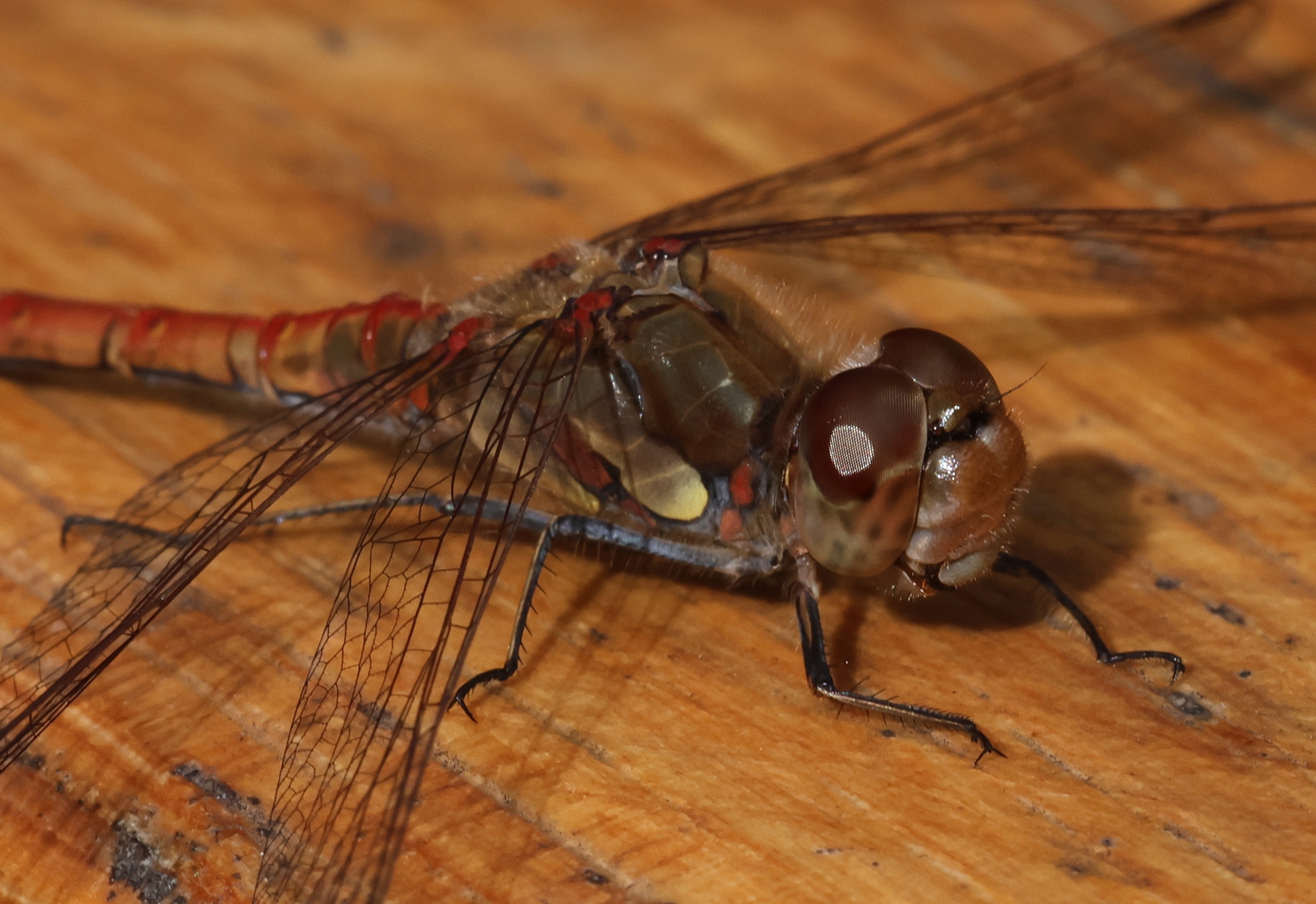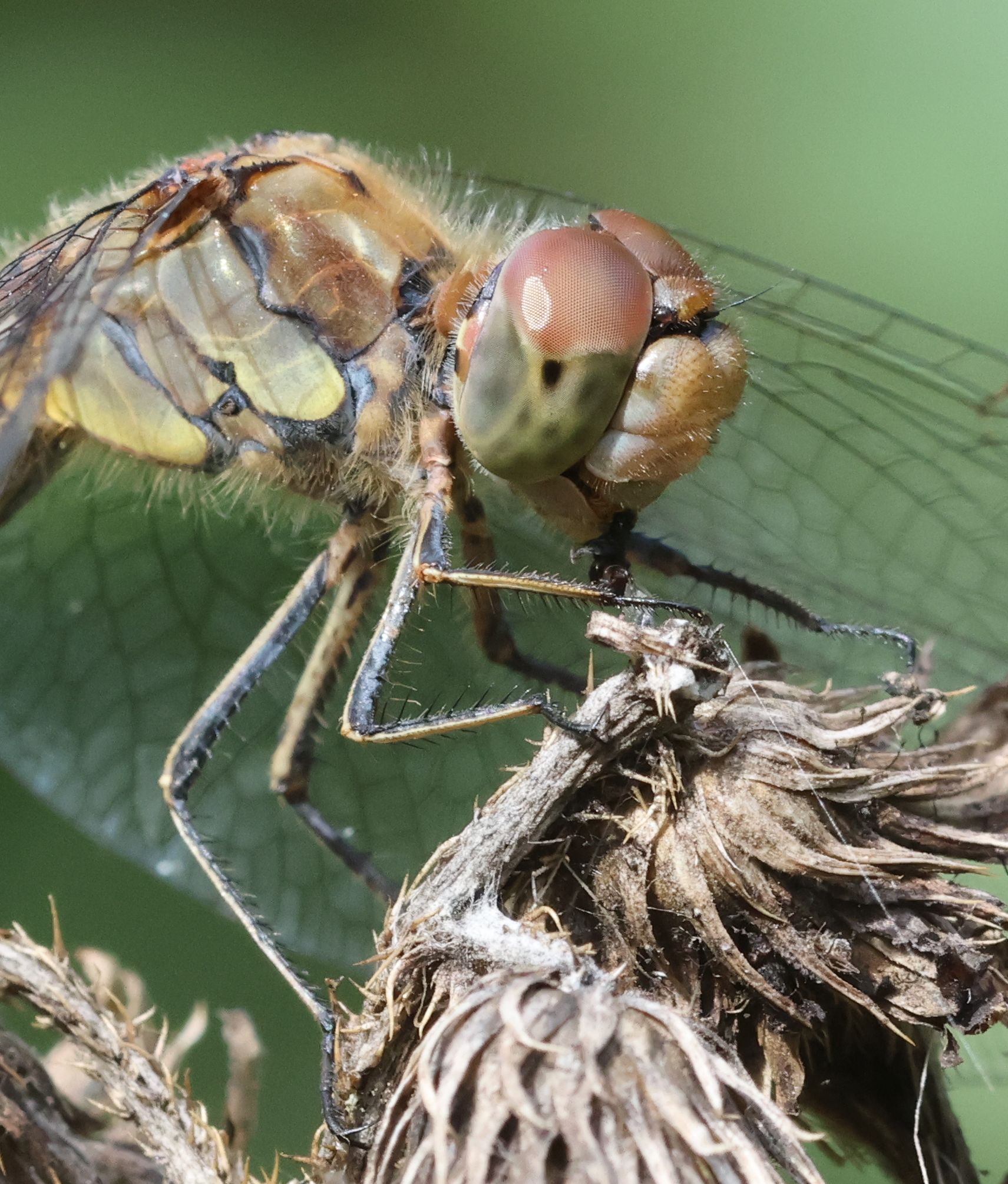 Große Heidelibelle, kenntlich an der waagerechten schwarzen Querlinie auf der Stirn vor den Augen, die nicht an den Augen herabläuft, bei Zwickau, Juli 2013