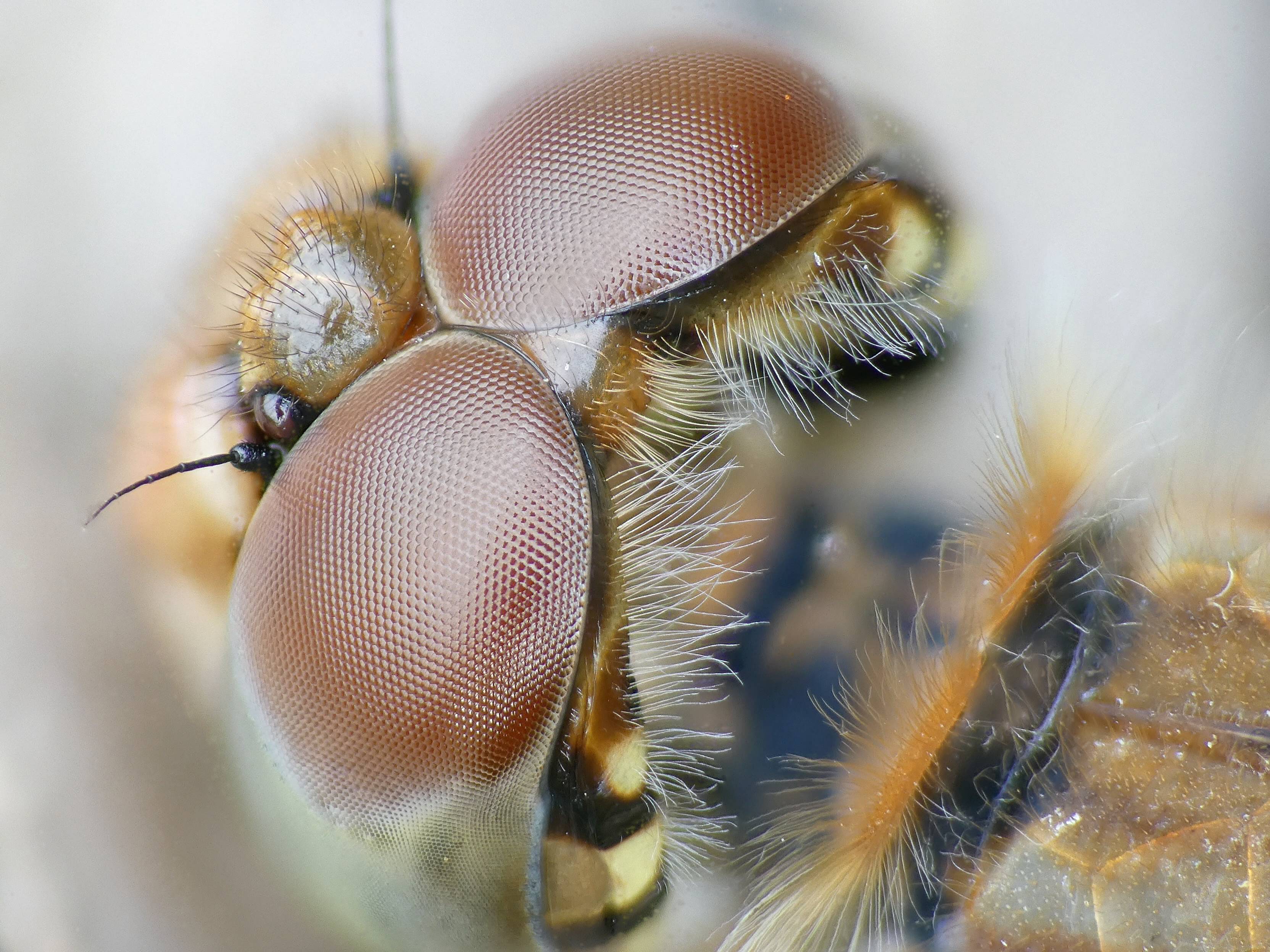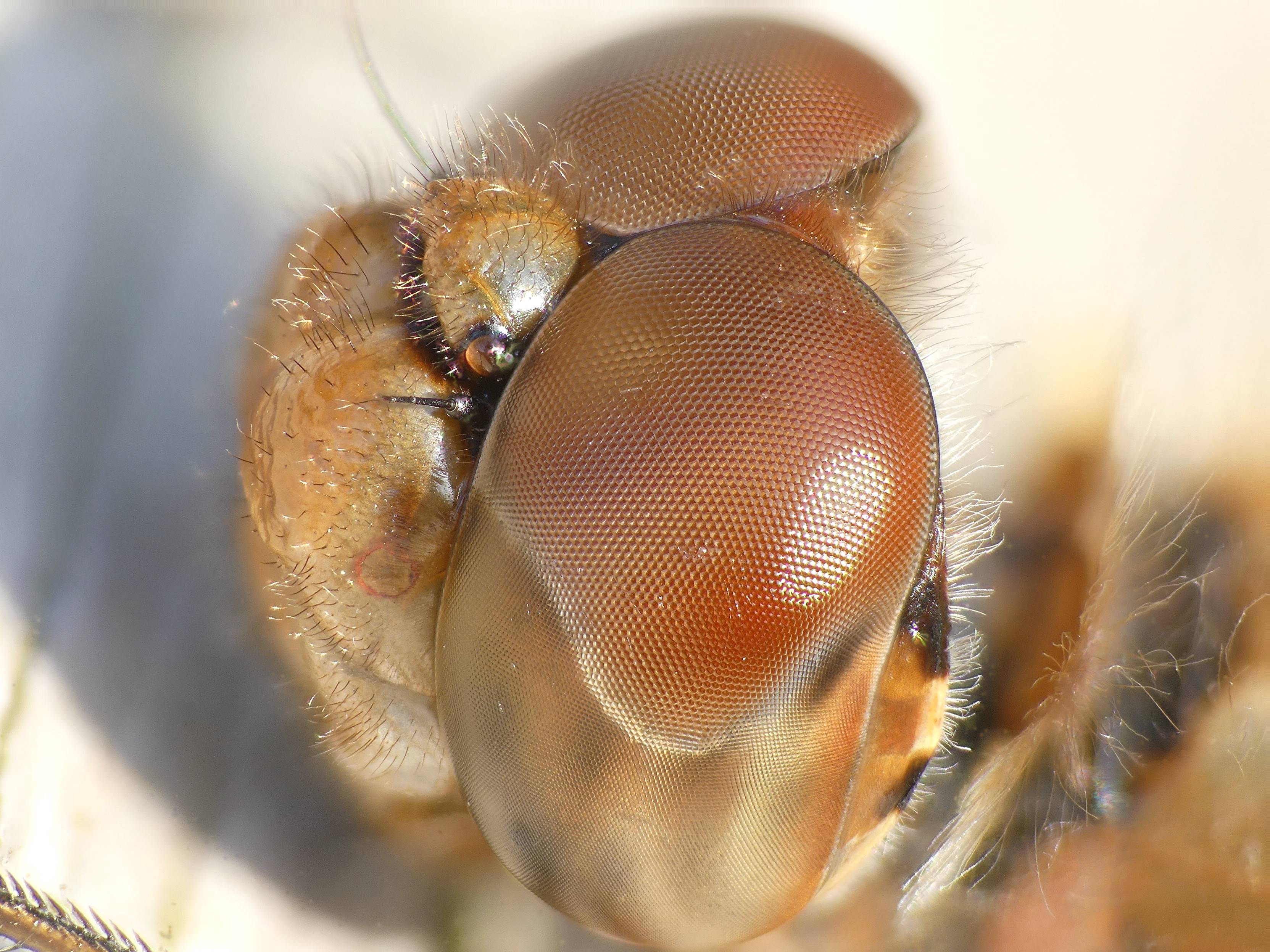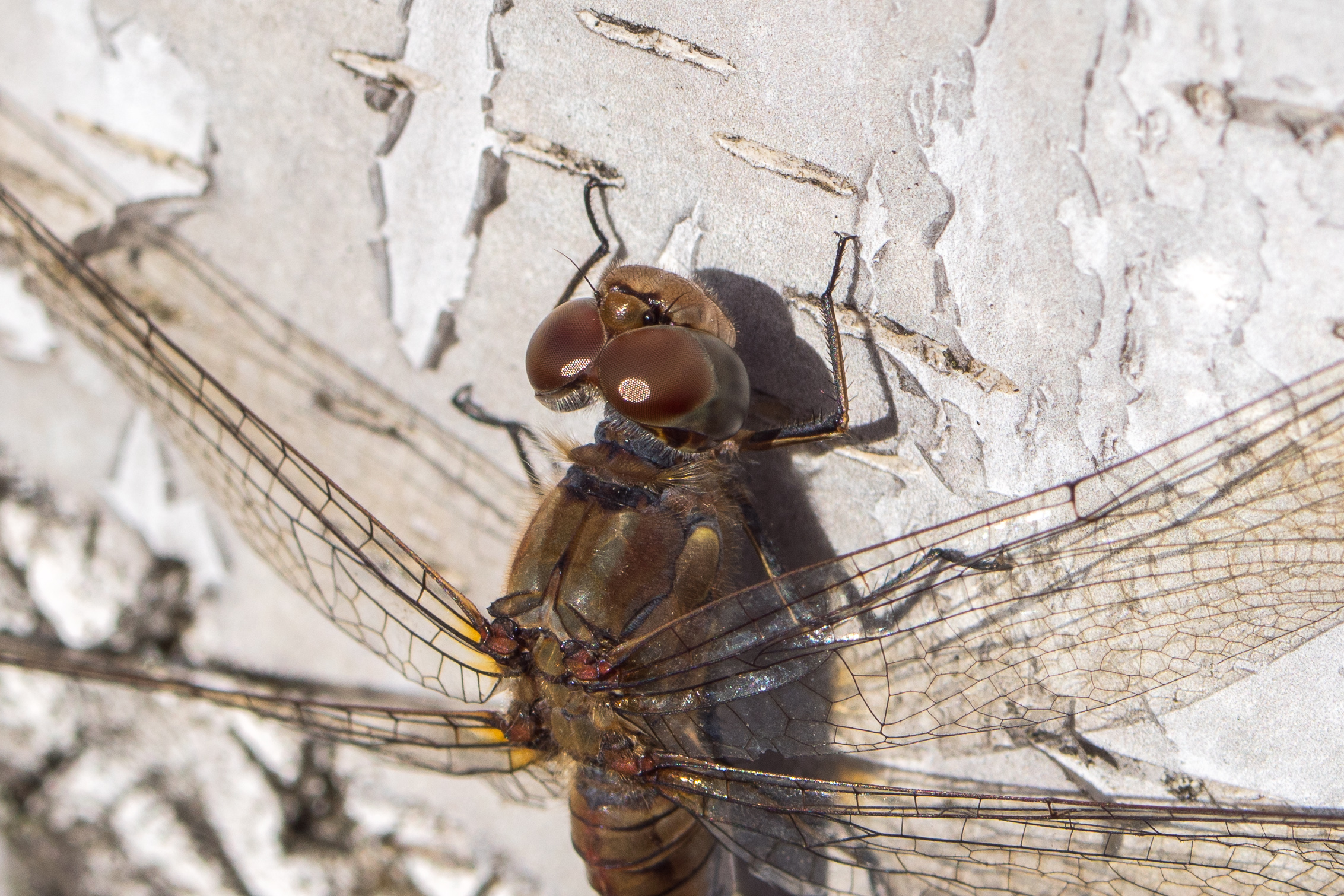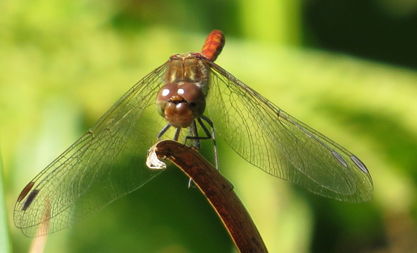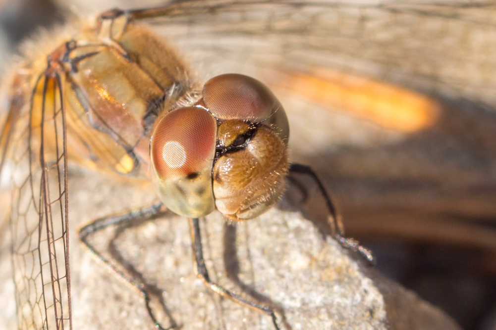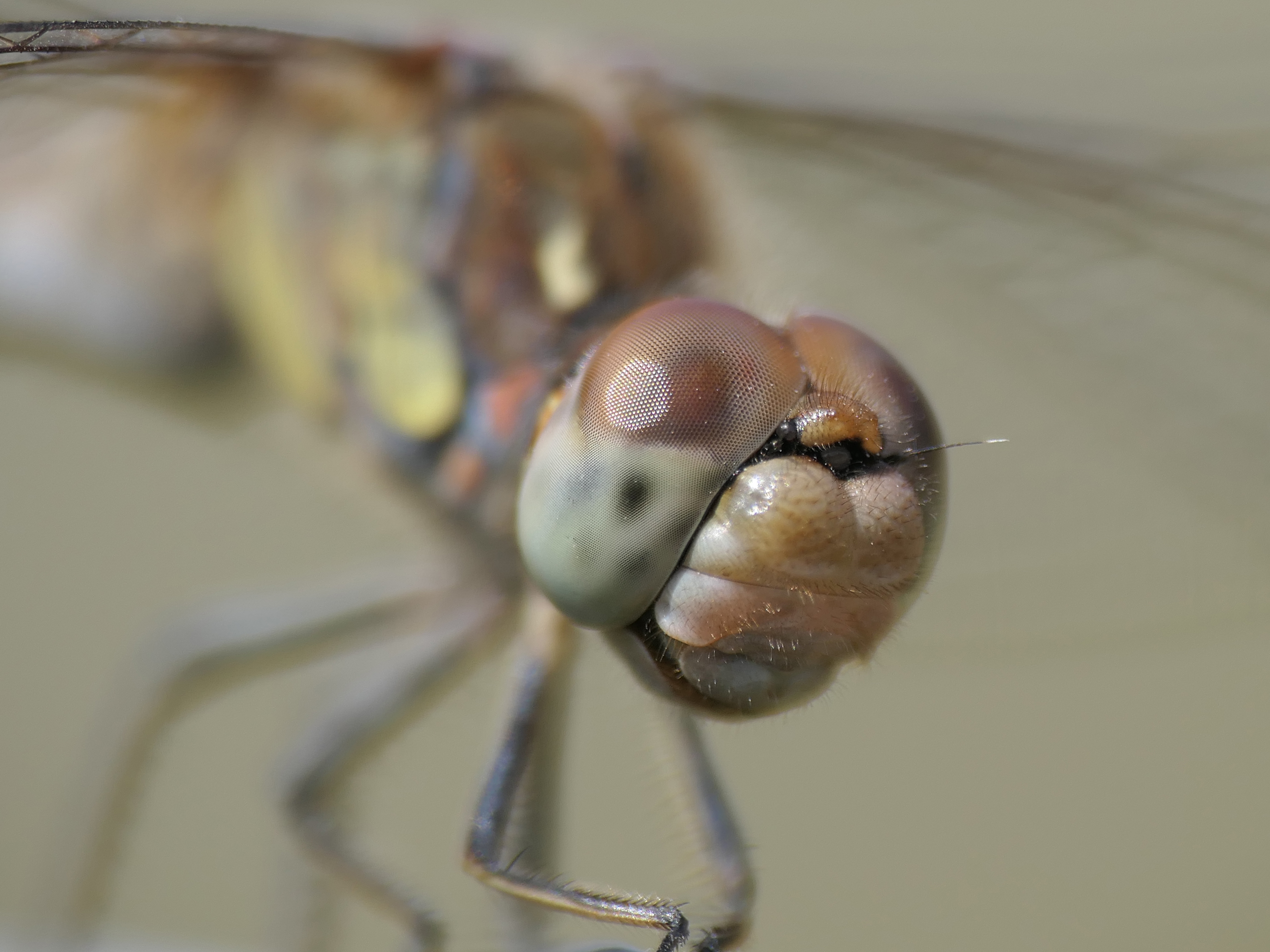 Große Heidelibelle, kenntlich an der waagerechten schwarzen Querlinie auf der Stirn vor den Augen, die nicht an den Augen herabläuft, bei Zwickau, Juli 2013