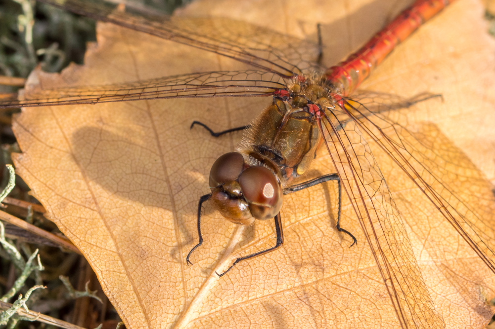 Männchen der Großen Heidelibelle am Heidemoor Cunnewitz, Mitte Oktober 2018. Die schwarze Zeichnung an der Stirnbasis läuft bei beiden Geschlechtern nicht an den Augenrändern herab.