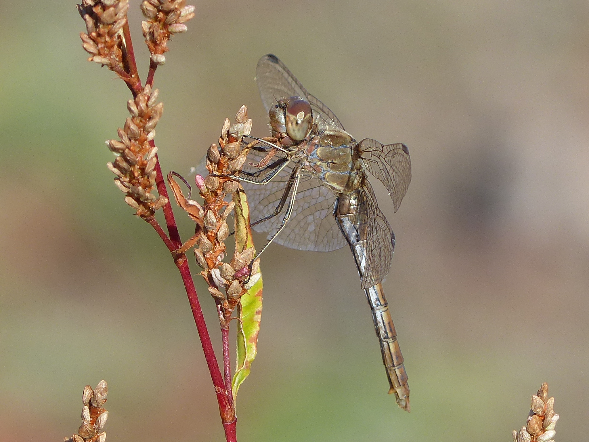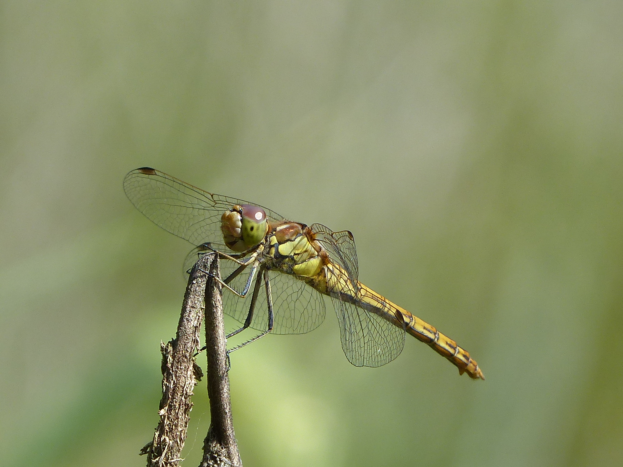 Hinterleib: Rötliche (Männchen) oder gelbe bis ockerfarbene Grundfarbe (Weibchen und junge Individuen), Segmente 8 und 9 oberseits mit schwarzer Zeichnung. Männchen mit leicht keulenfömigem Hinterleib (Segmente 6-8 breiter als 3-5). Legescheide der Weibchen steht rechtwinklig ab.