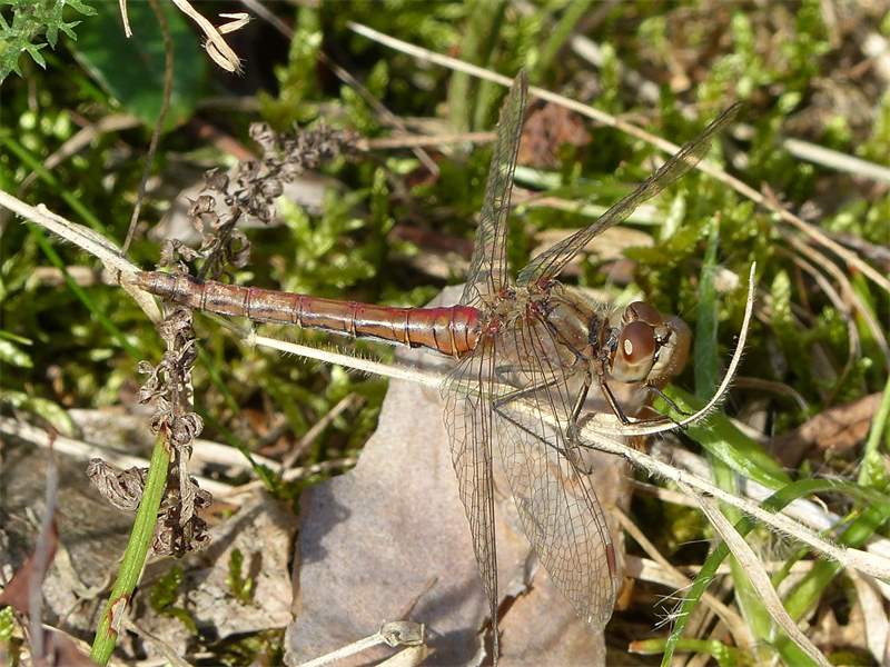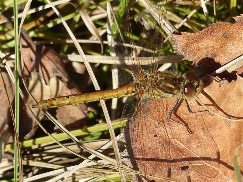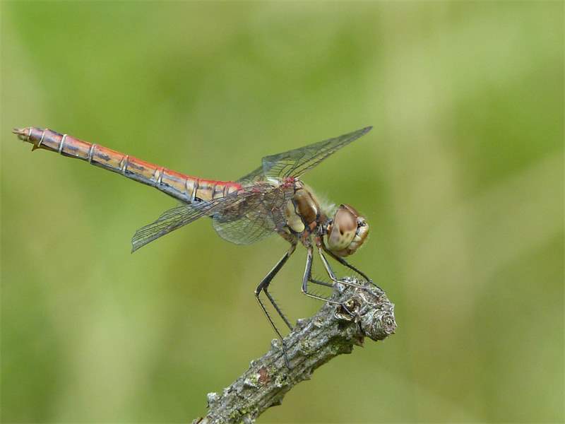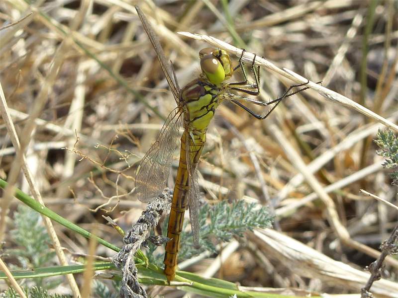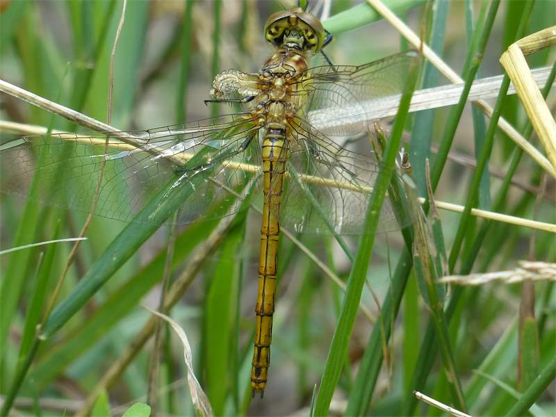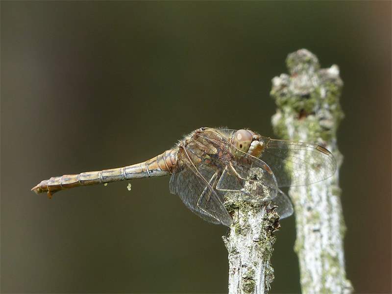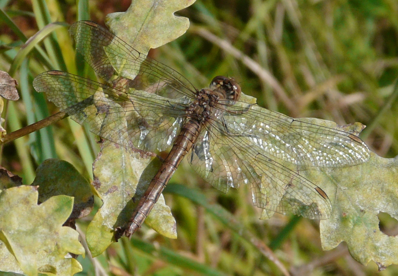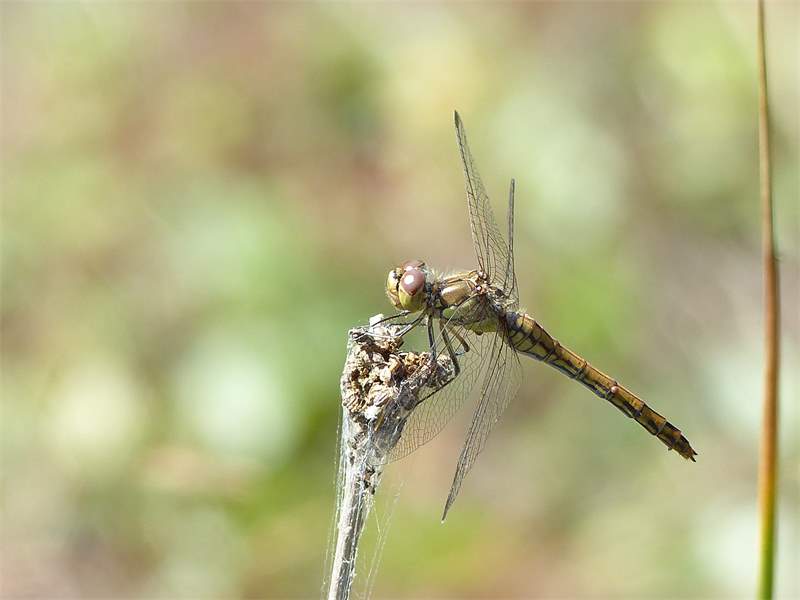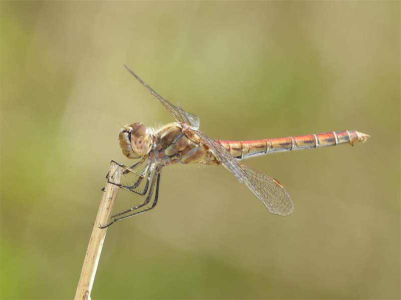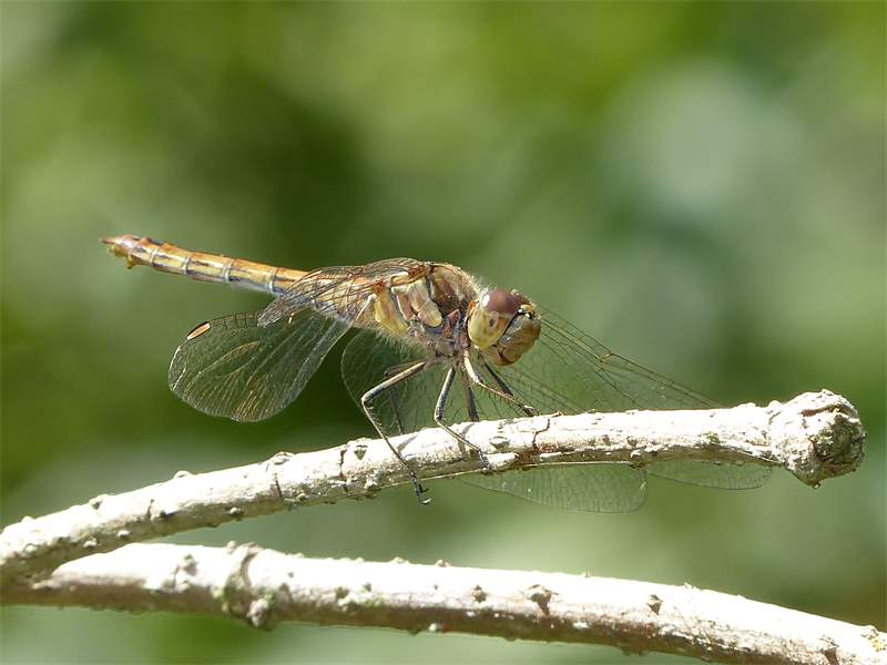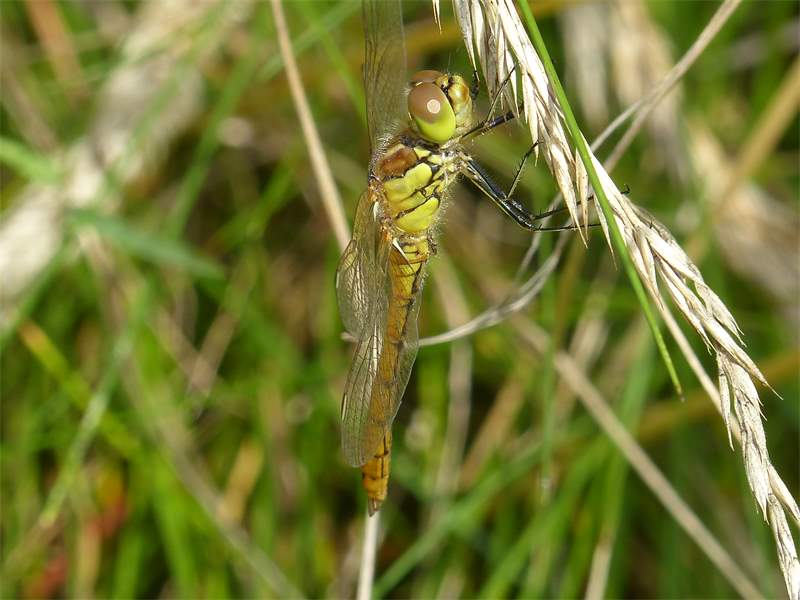 Gemeine Heidelibelle, Gemarkung Hohenprießnitz, Rieselgraben am Fichtbusch, altes Weibchen, Merkmale: gestreifte Beine, senkrecht abstehende Legescheide, August 2013