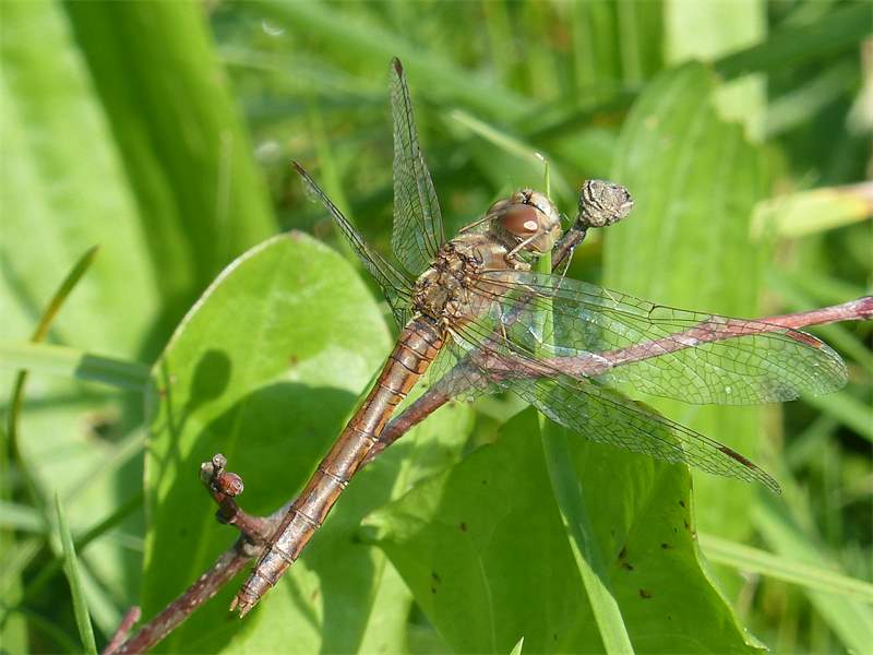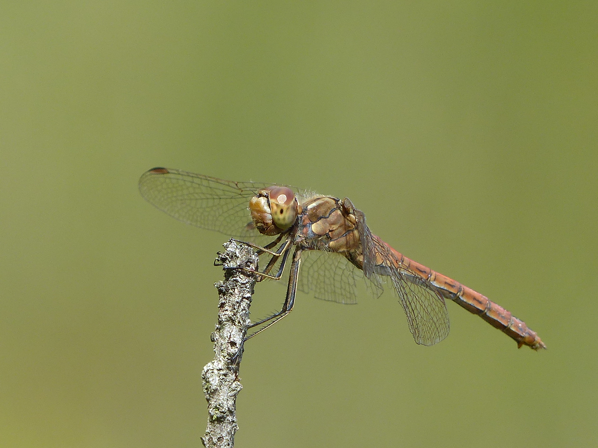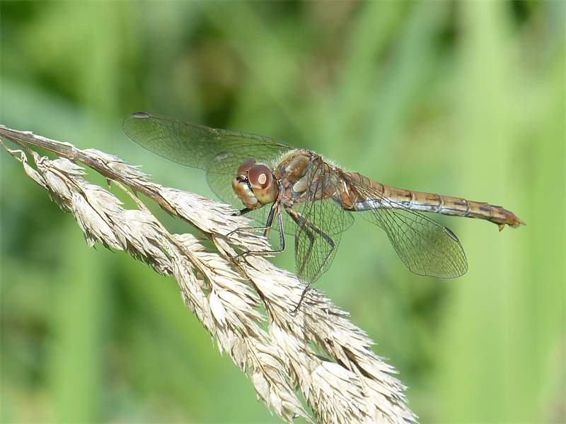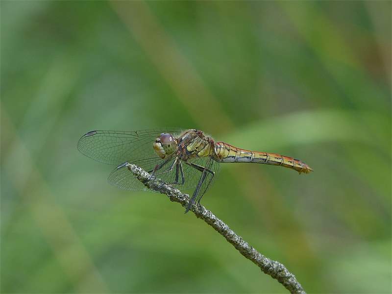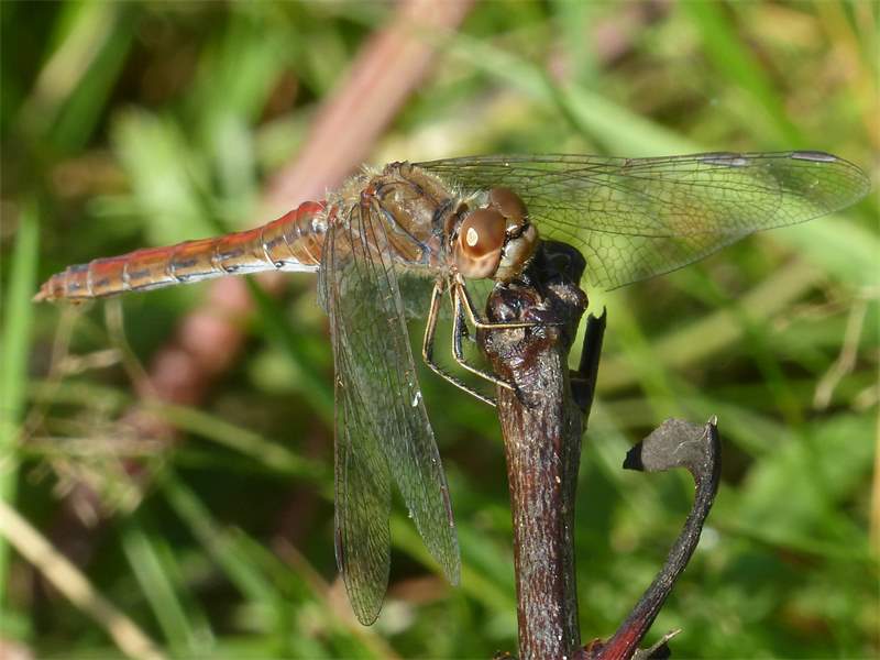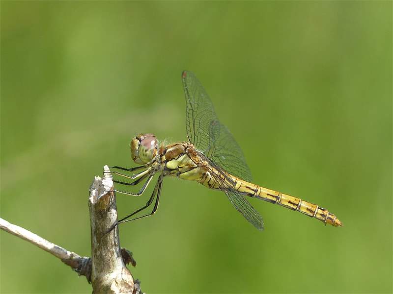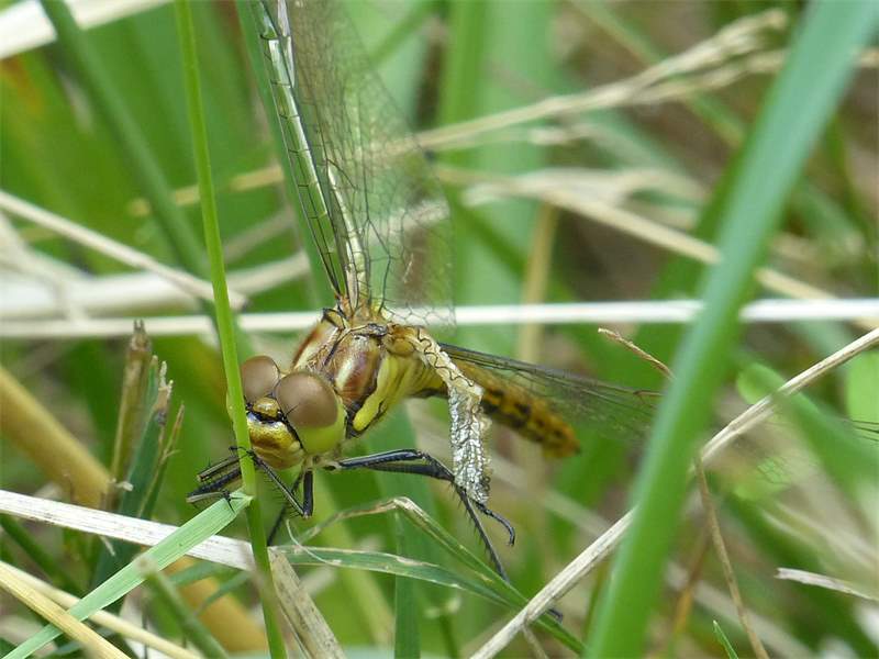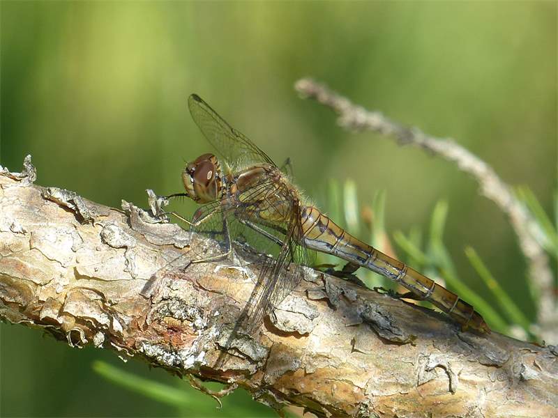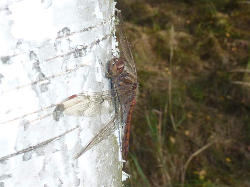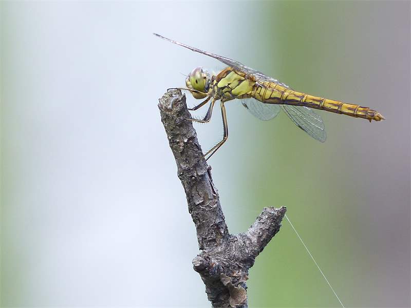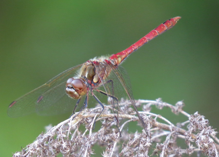 Gemeine Heidelibelle, Gemarkung Hohenprießnitz, Rieselgraben am Fichtbusch, altes Weibchen, Merkmale: gestreifte Beine, senkrecht abstehende Legescheide, August 2013