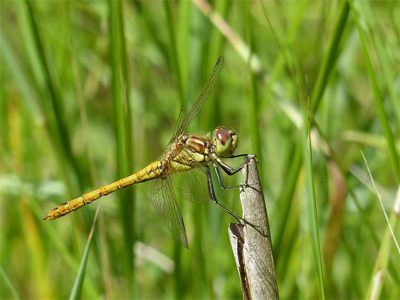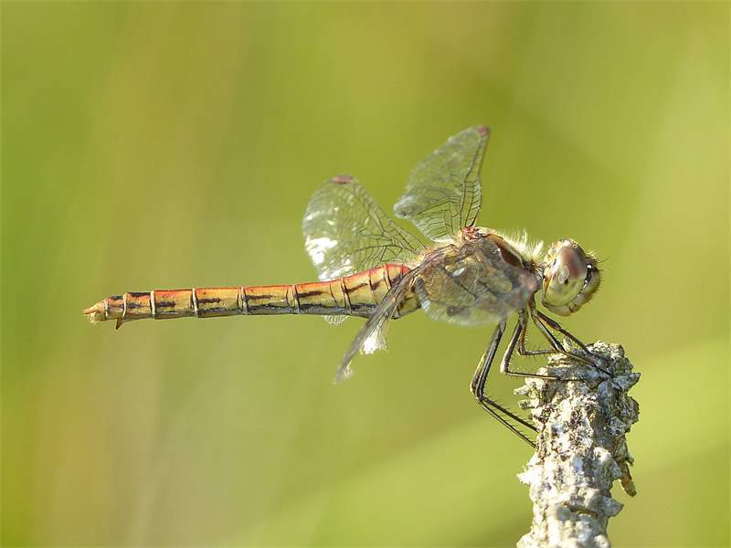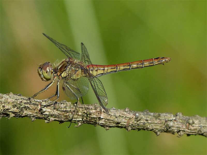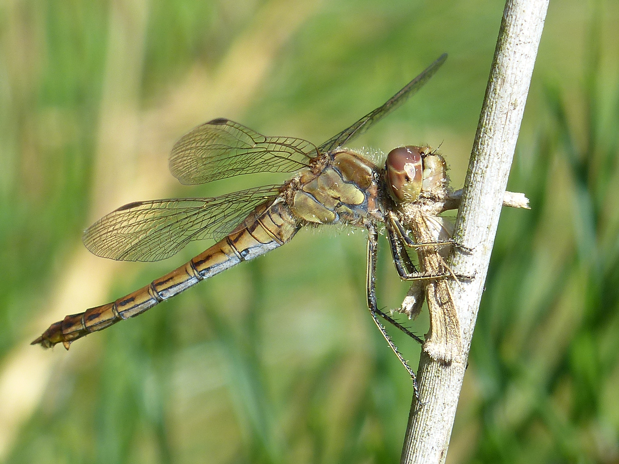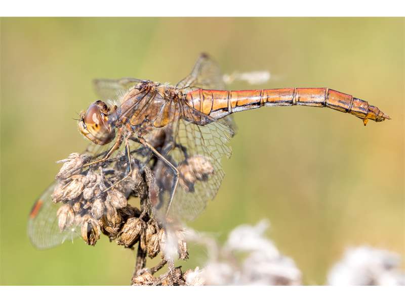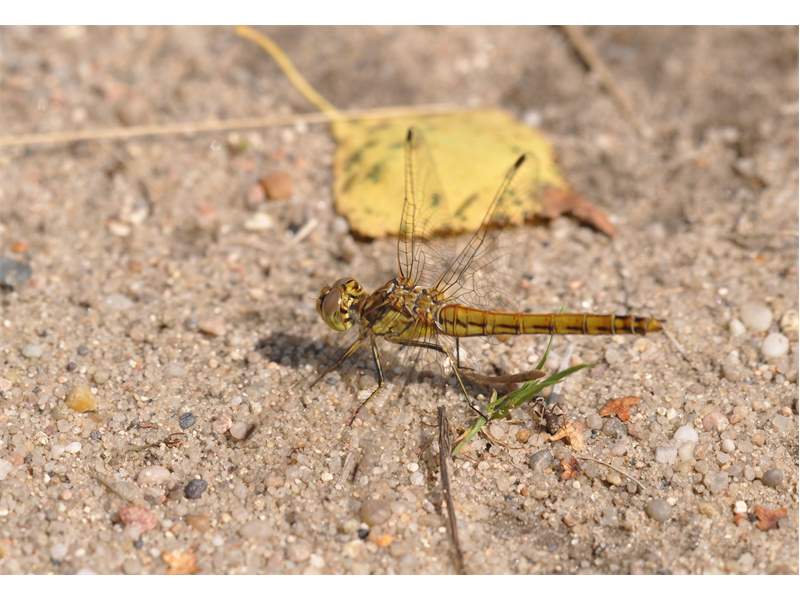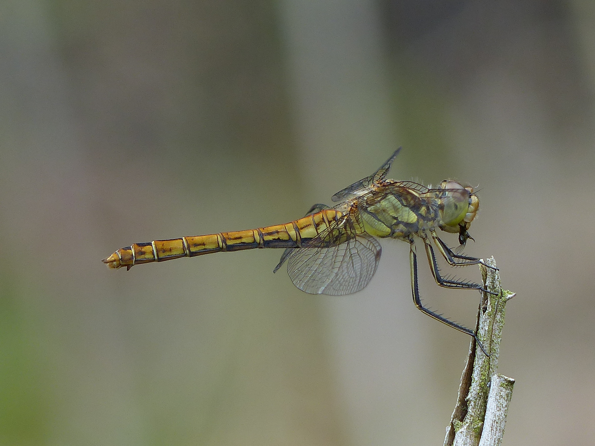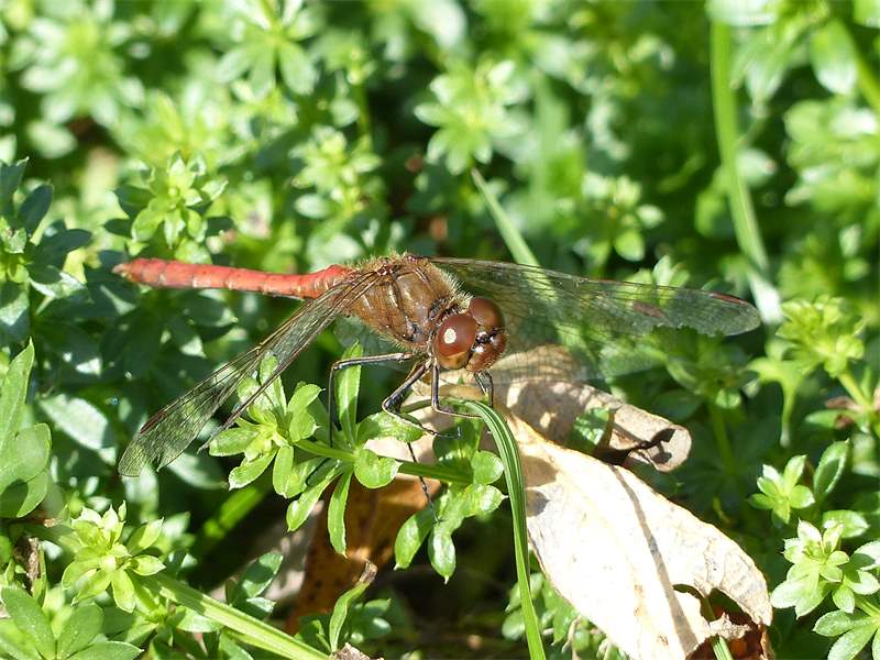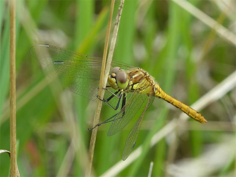 Gemeine Heidelibelle, Gemarkung Hohenprießnitz, Rieselgraben am Fichtbusch, altes Weibchen, Merkmale: gestreifte Beine, senkrecht abstehende Legescheide, August 2013