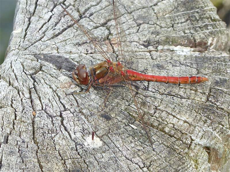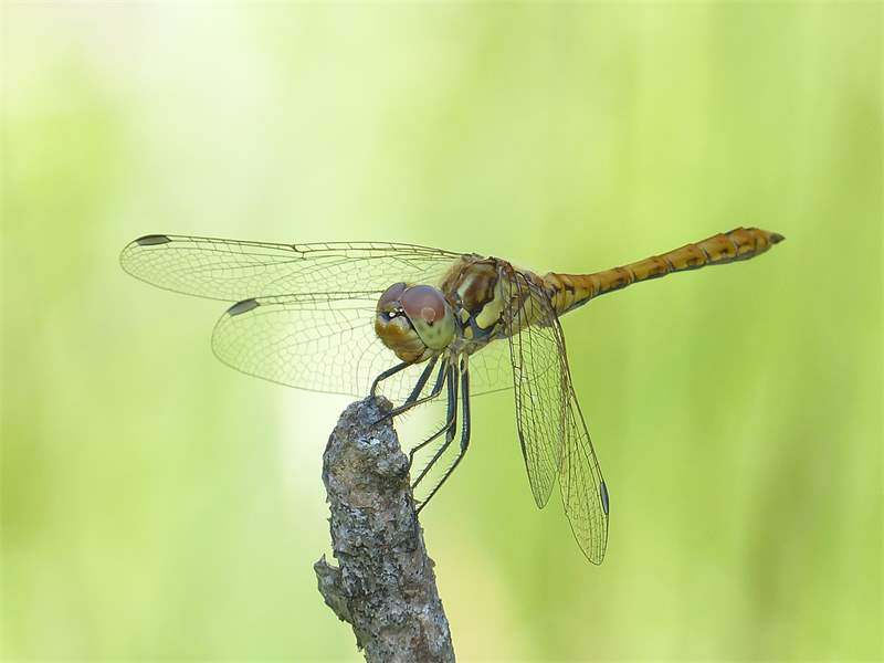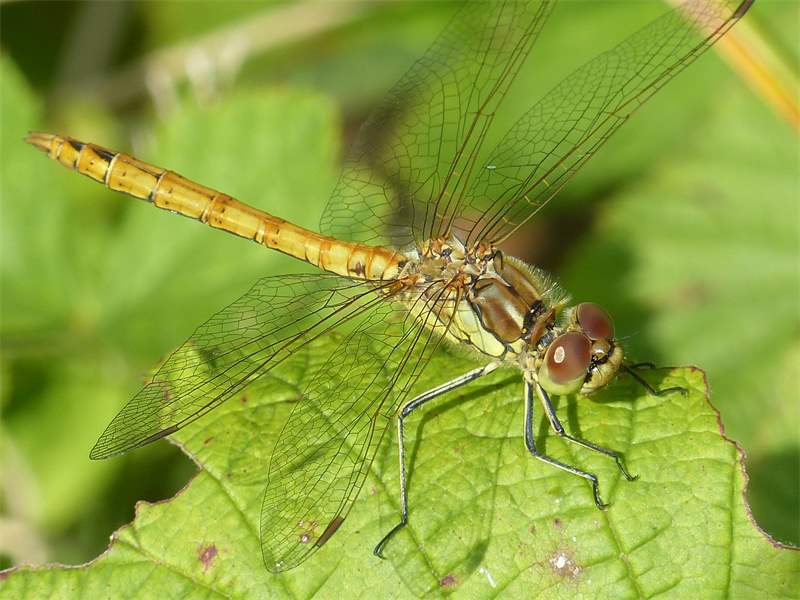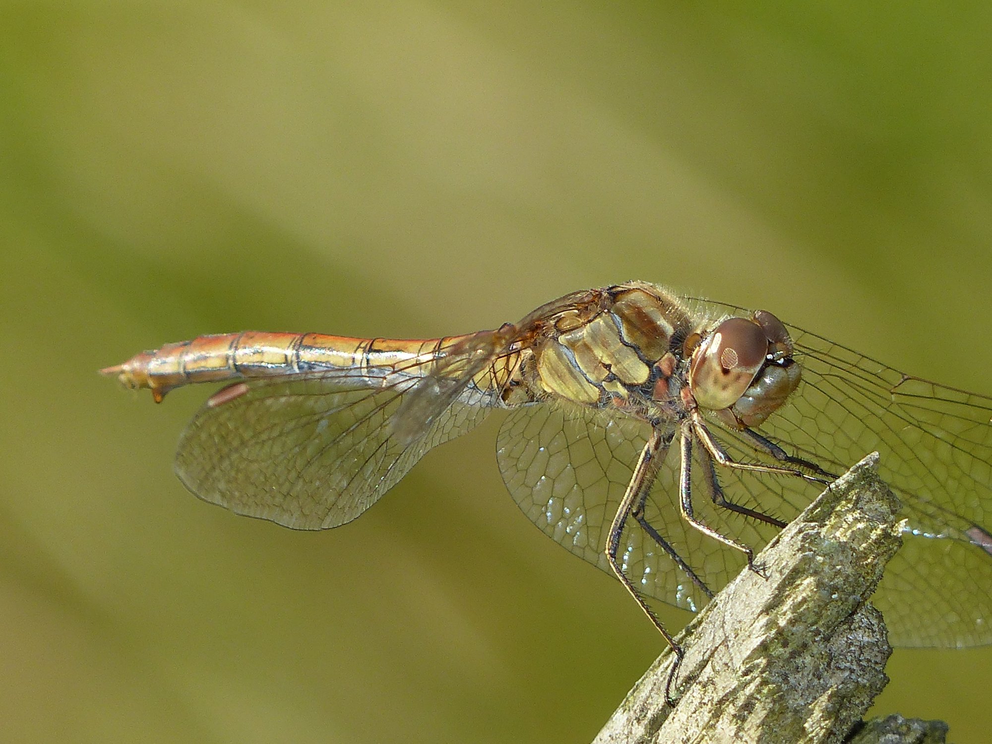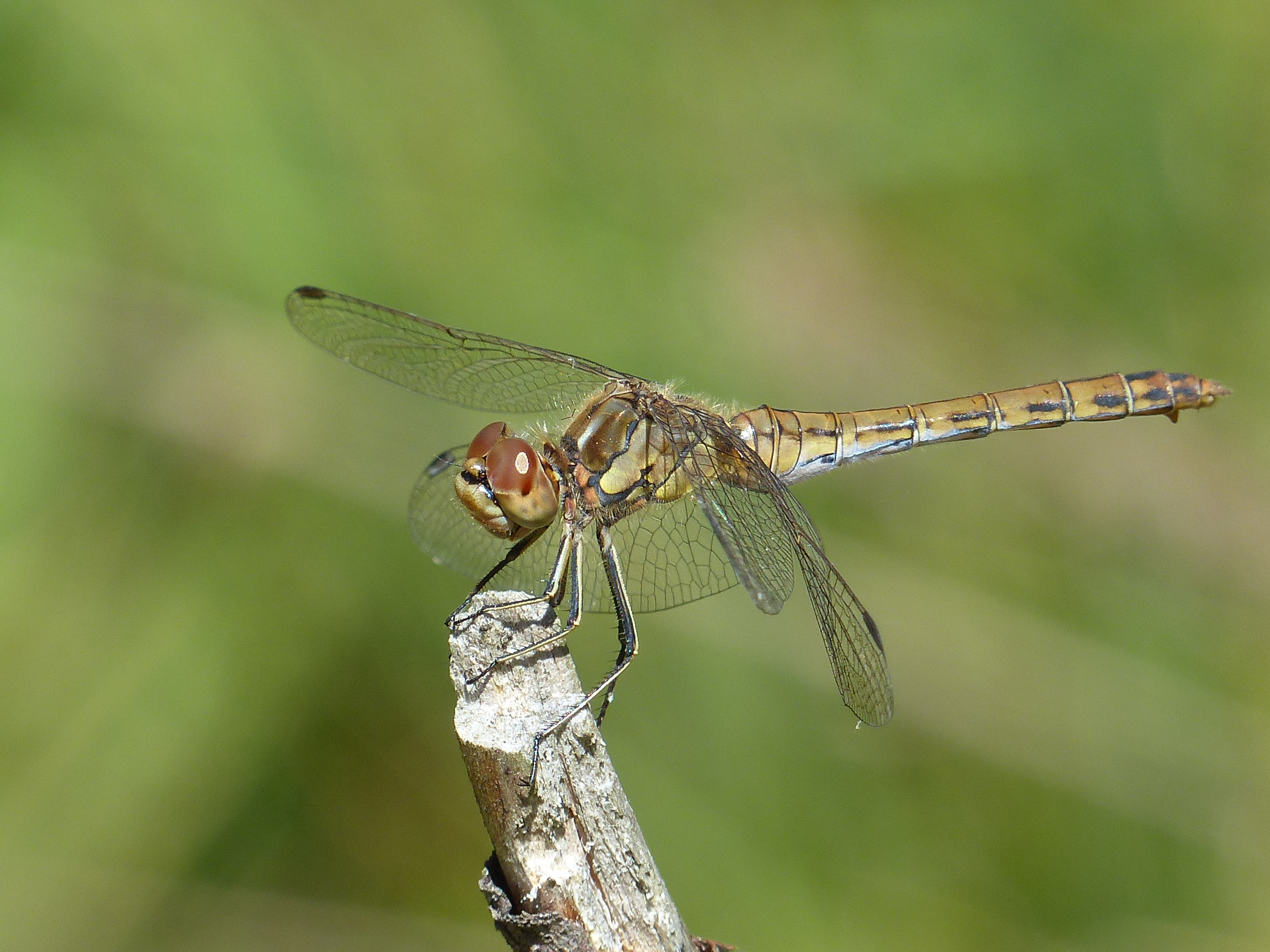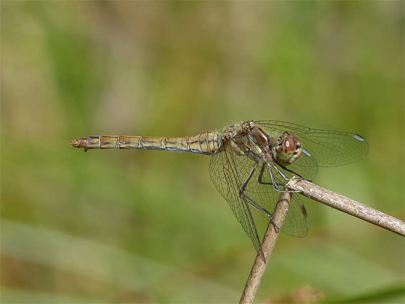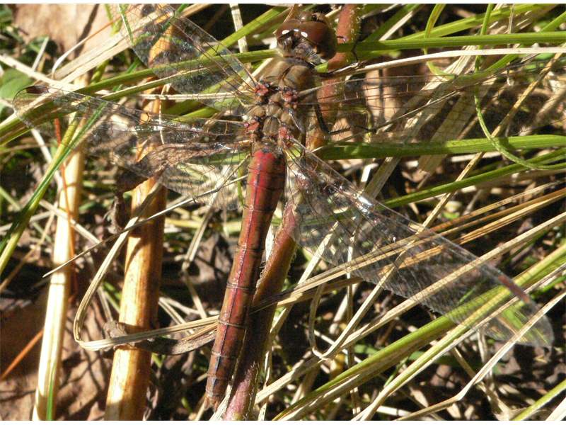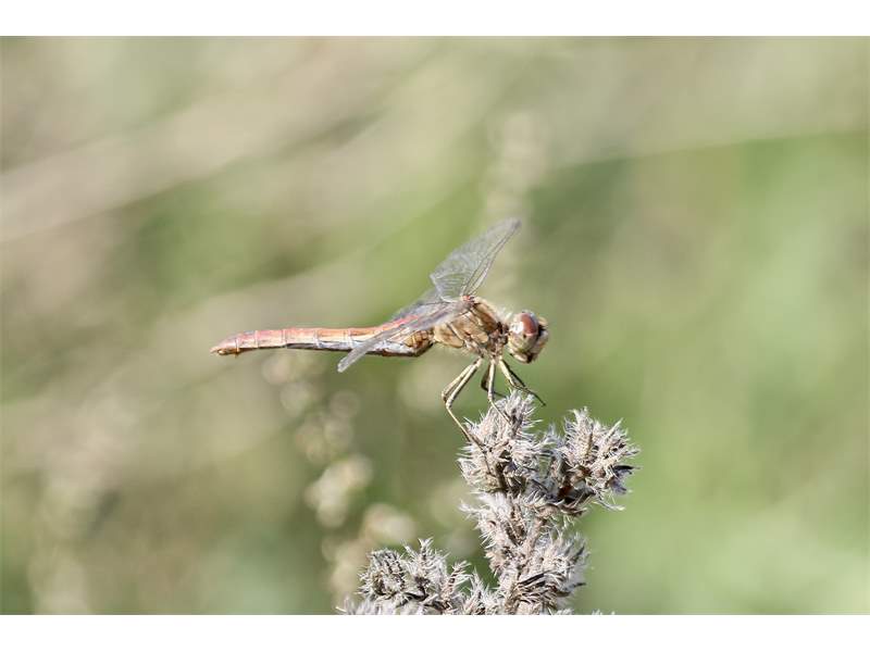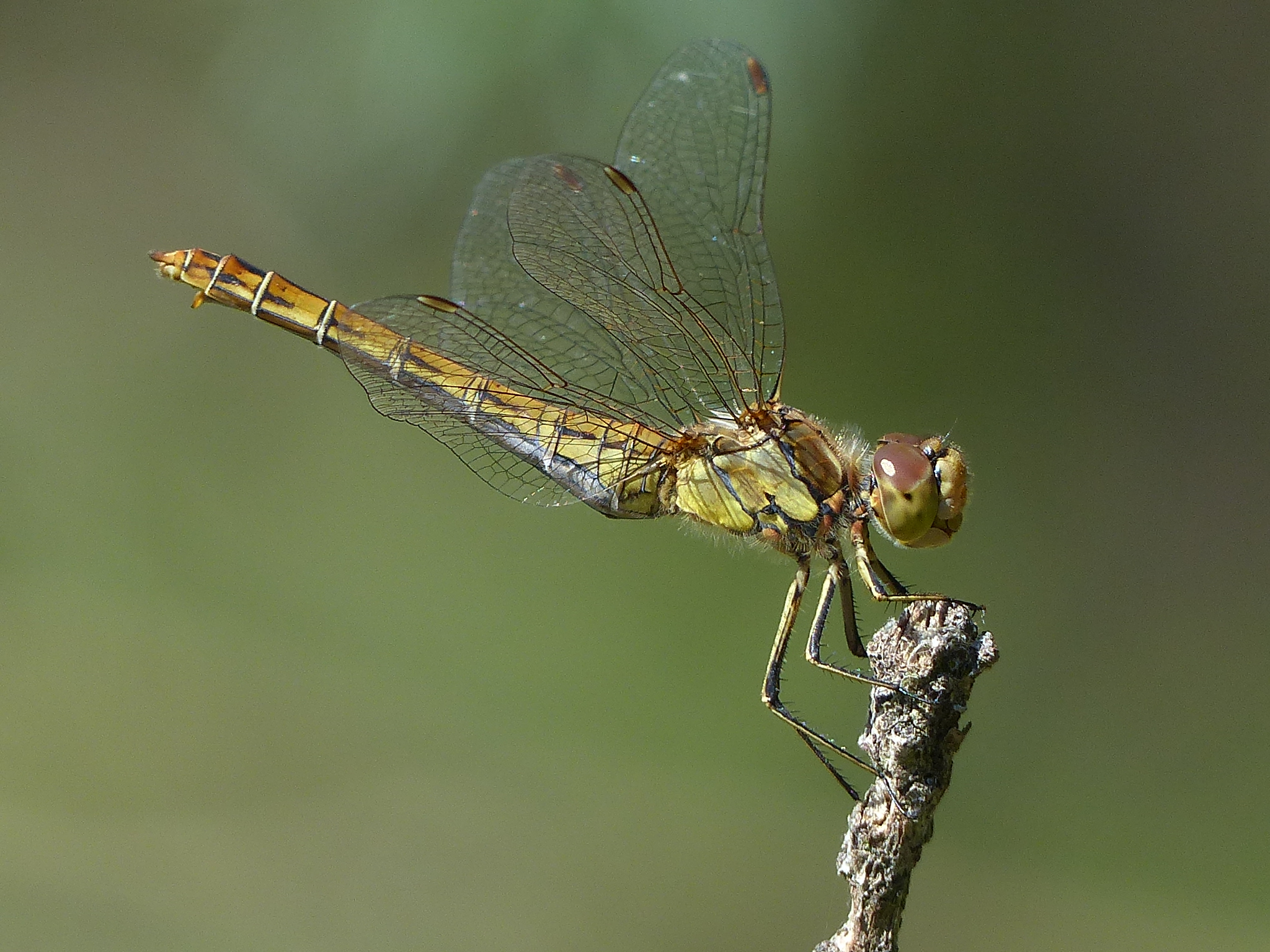 Gemeine Heidelibelle, Gemarkung Hohenprießnitz, Rieselgraben am Fichtbusch, altes Weibchen, Merkmale: gestreifte Beine, senkrecht abstehende Legescheide, August 2013