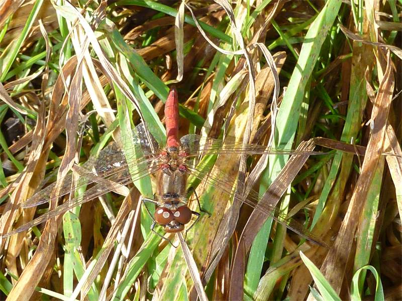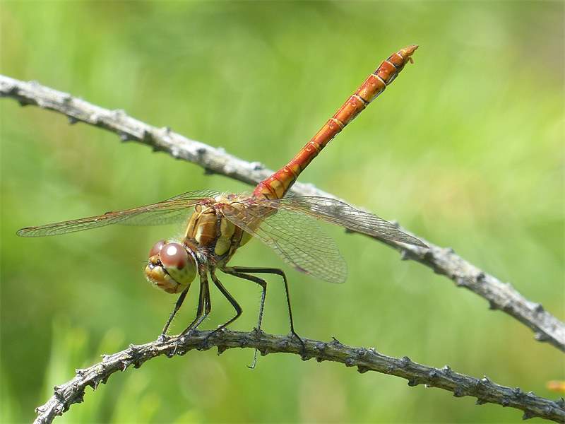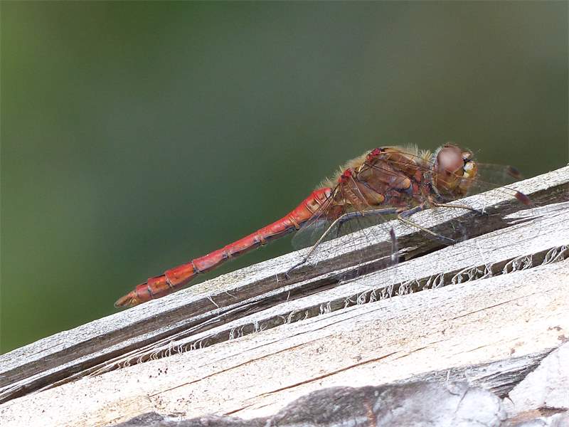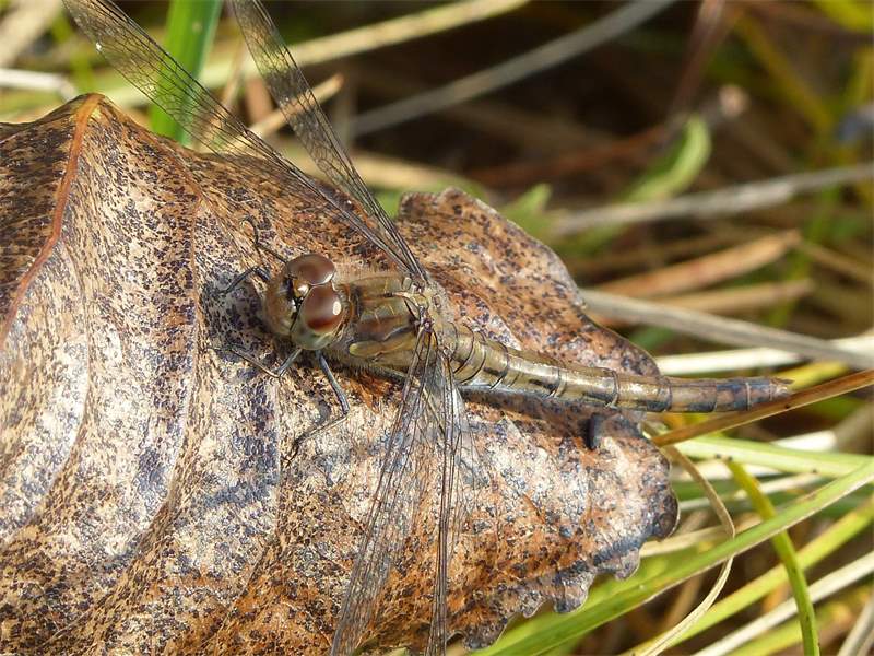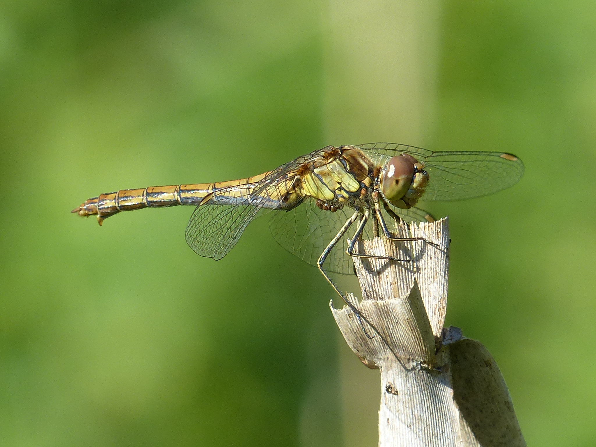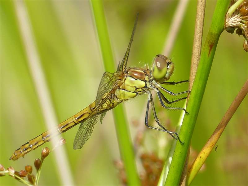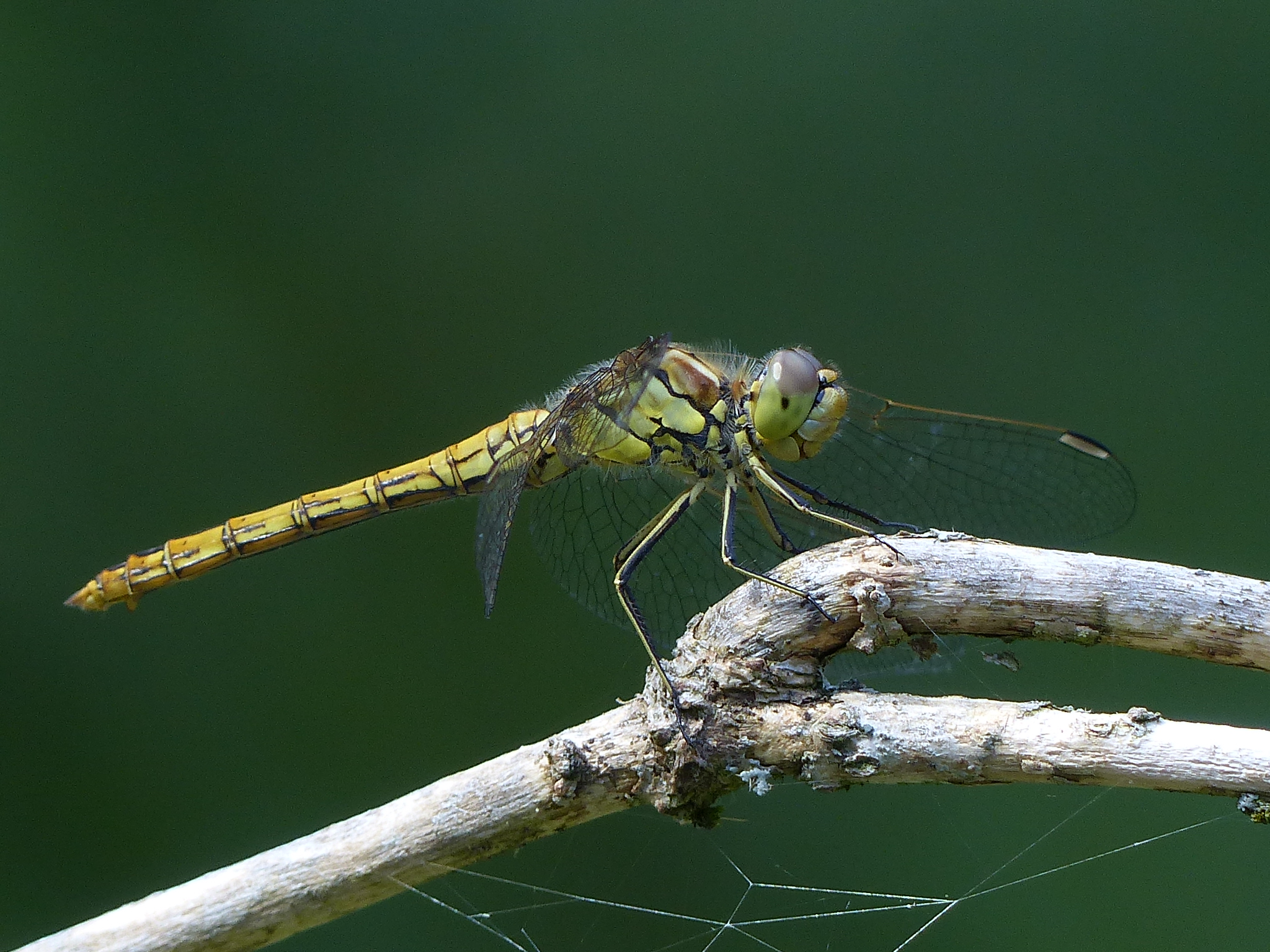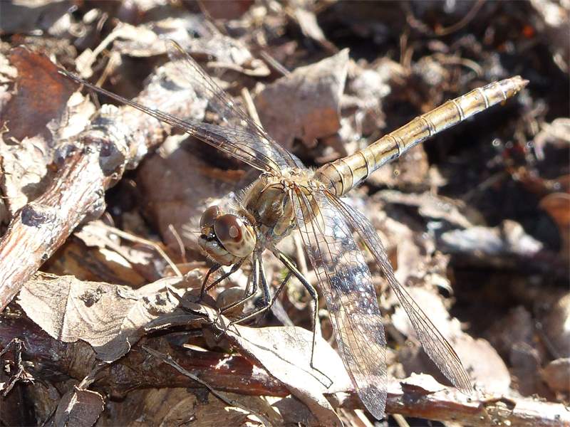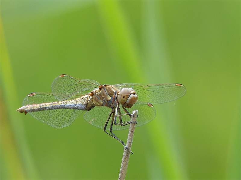 Gemeine Heidelibelle, Gemarkung Hohenprießnitz, Rieselgraben am Fichtbusch, altes Weibchen, Merkmale: gestreifte Beine, senkrecht abstehende Legescheide, August 2013