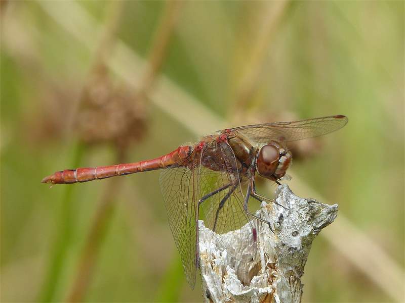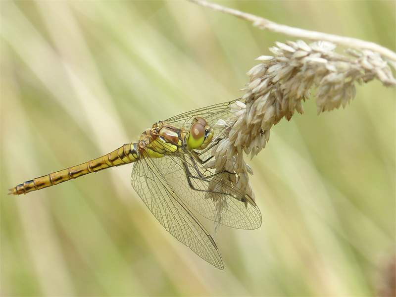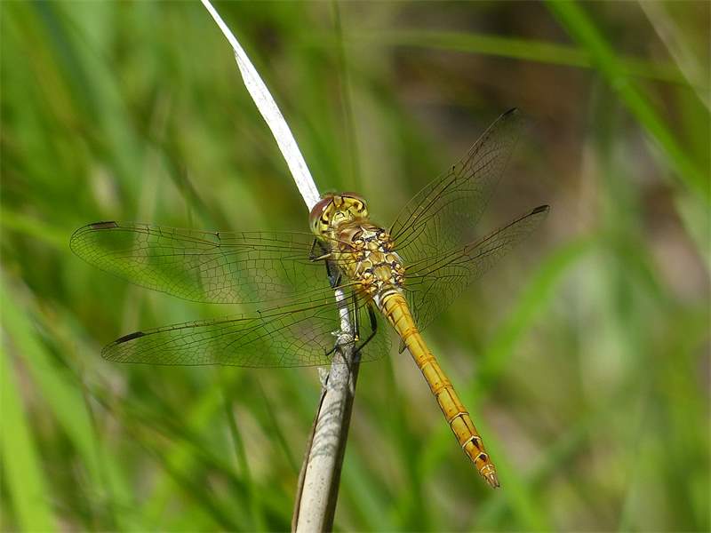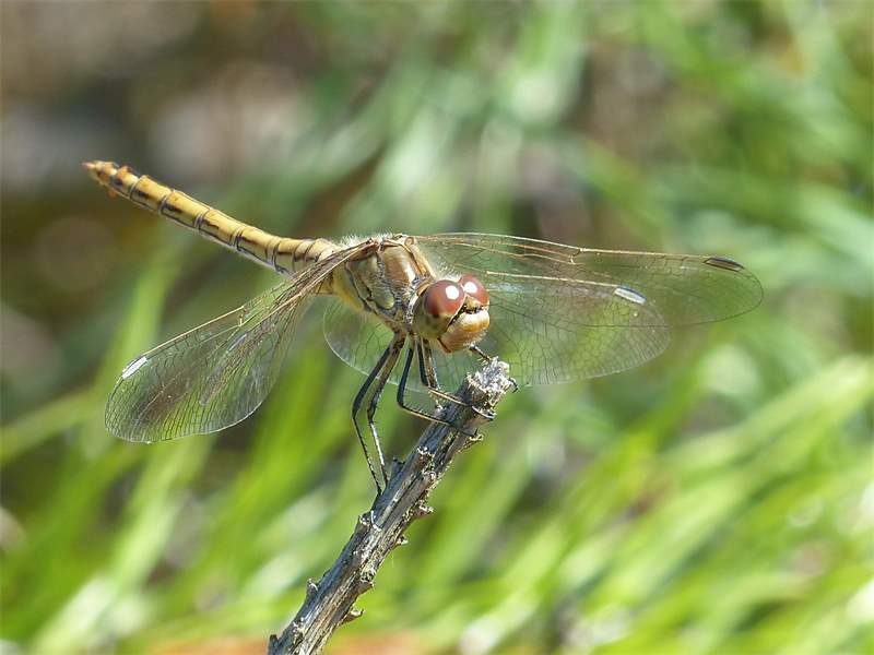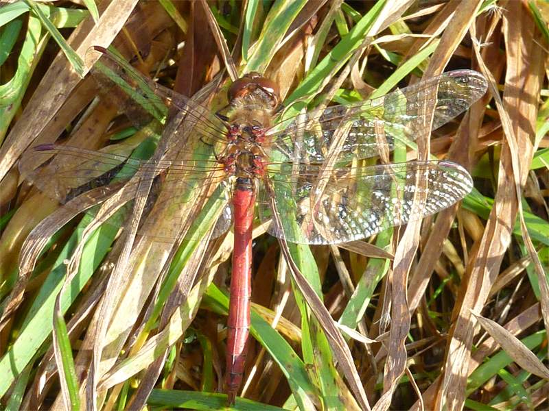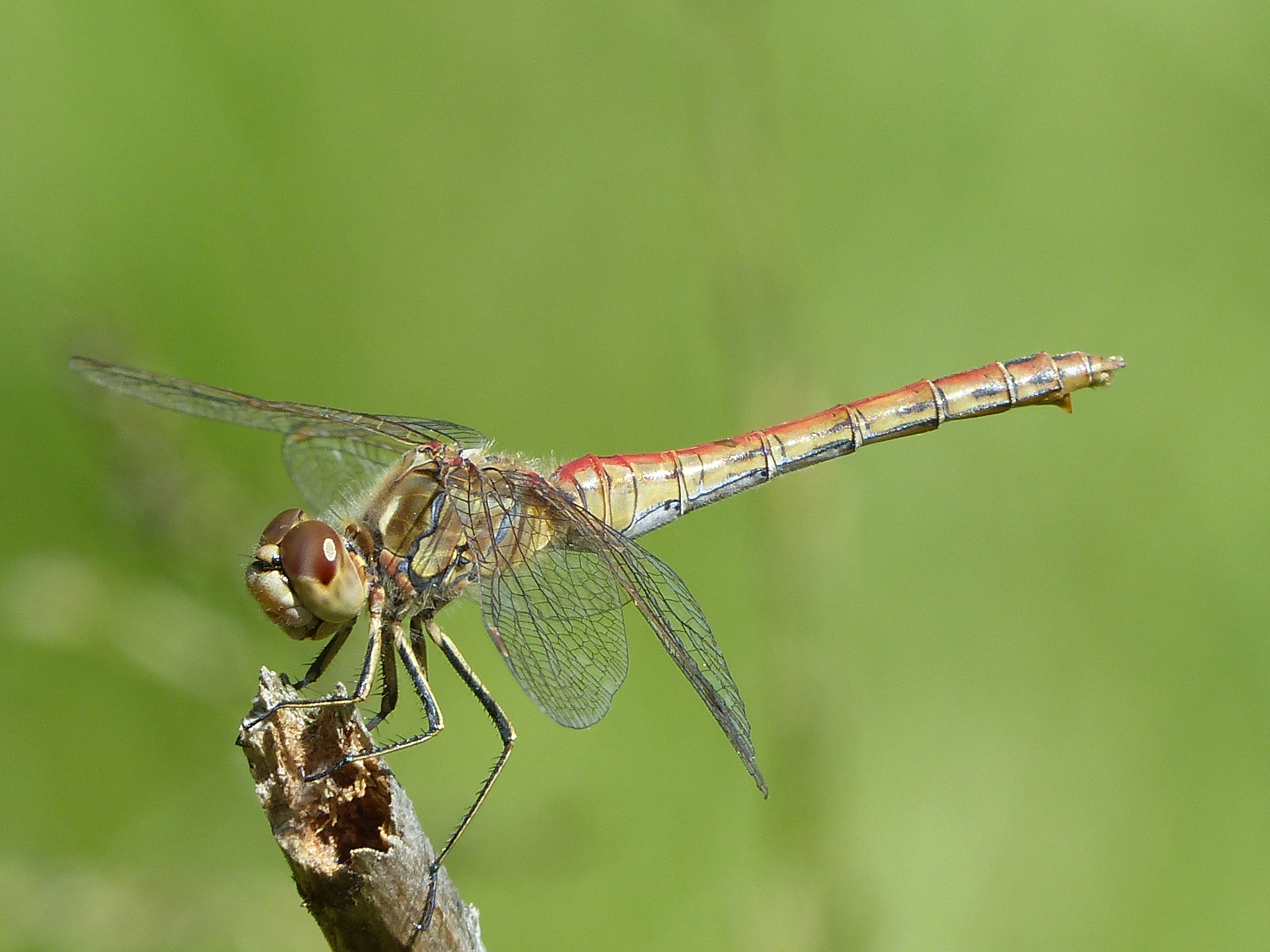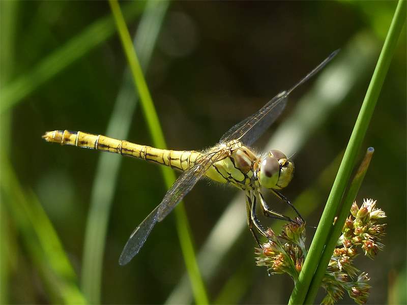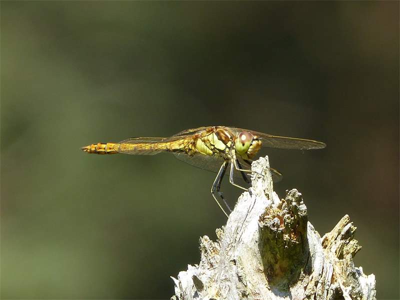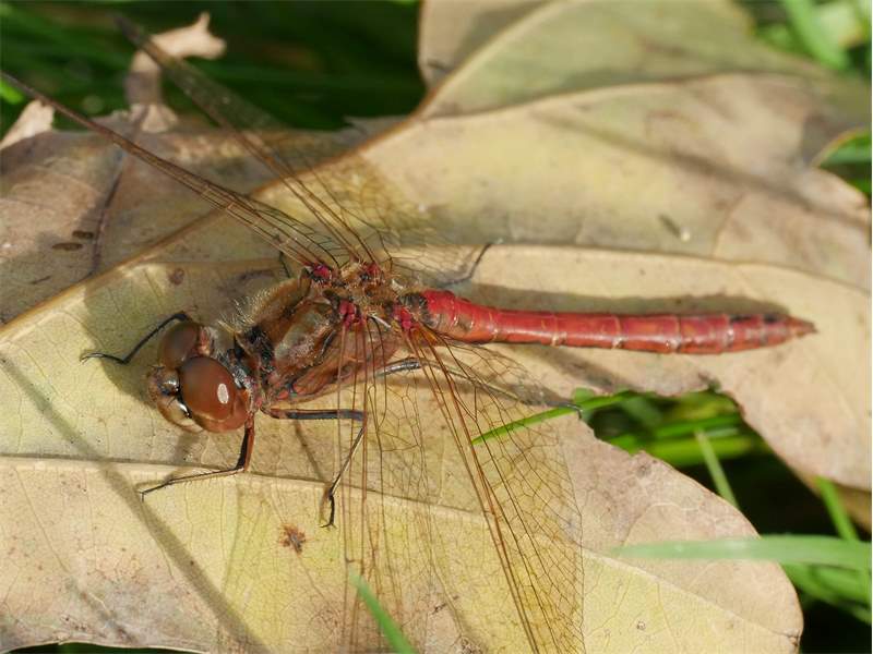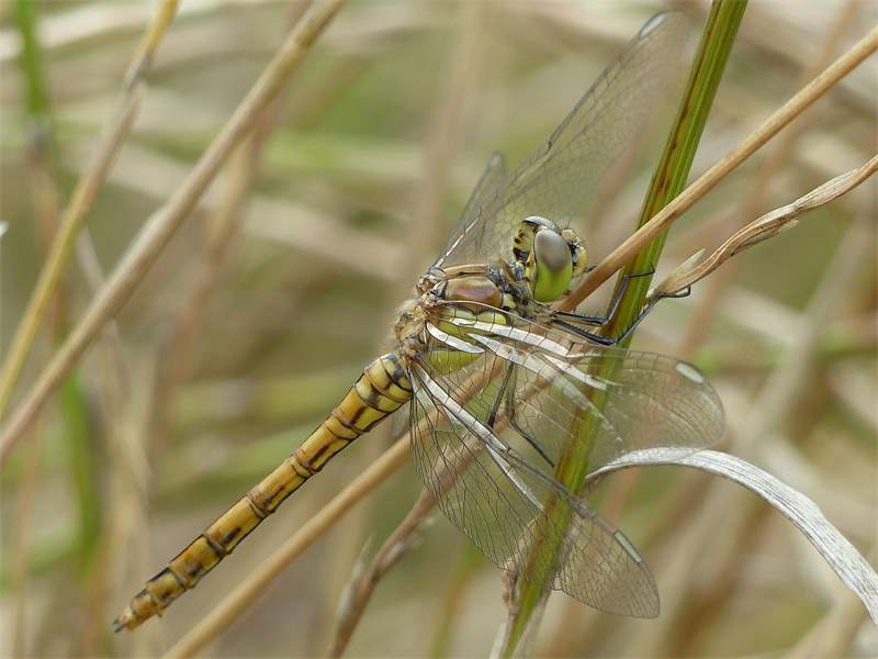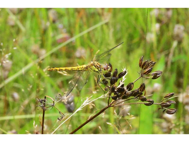 Gemeine Heidelibelle, Gemarkung Hohenprießnitz, Rieselgraben am Fichtbusch, altes Weibchen, Merkmale: gestreifte Beine, senkrecht abstehende Legescheide, August 2013