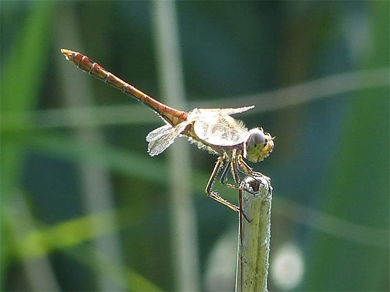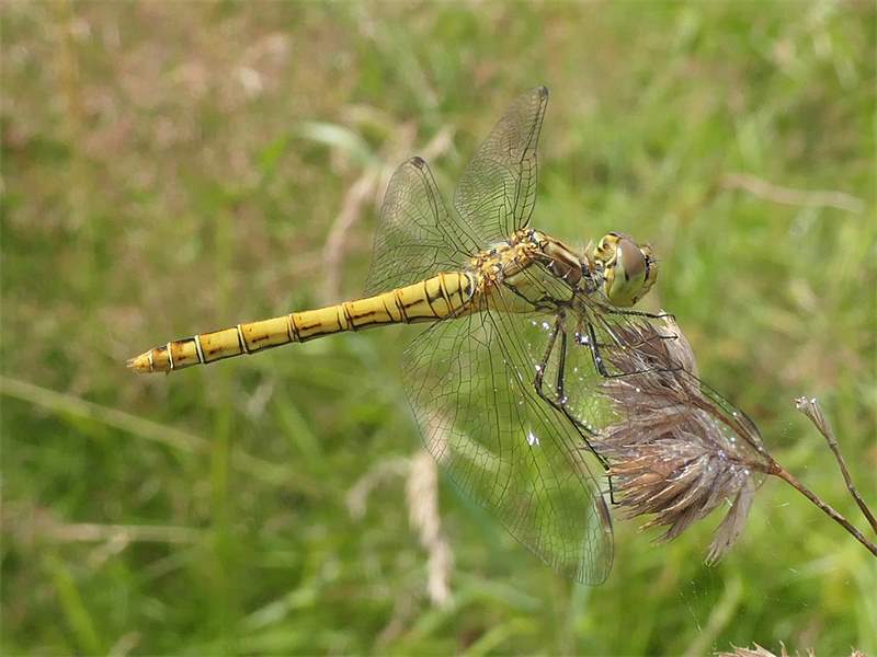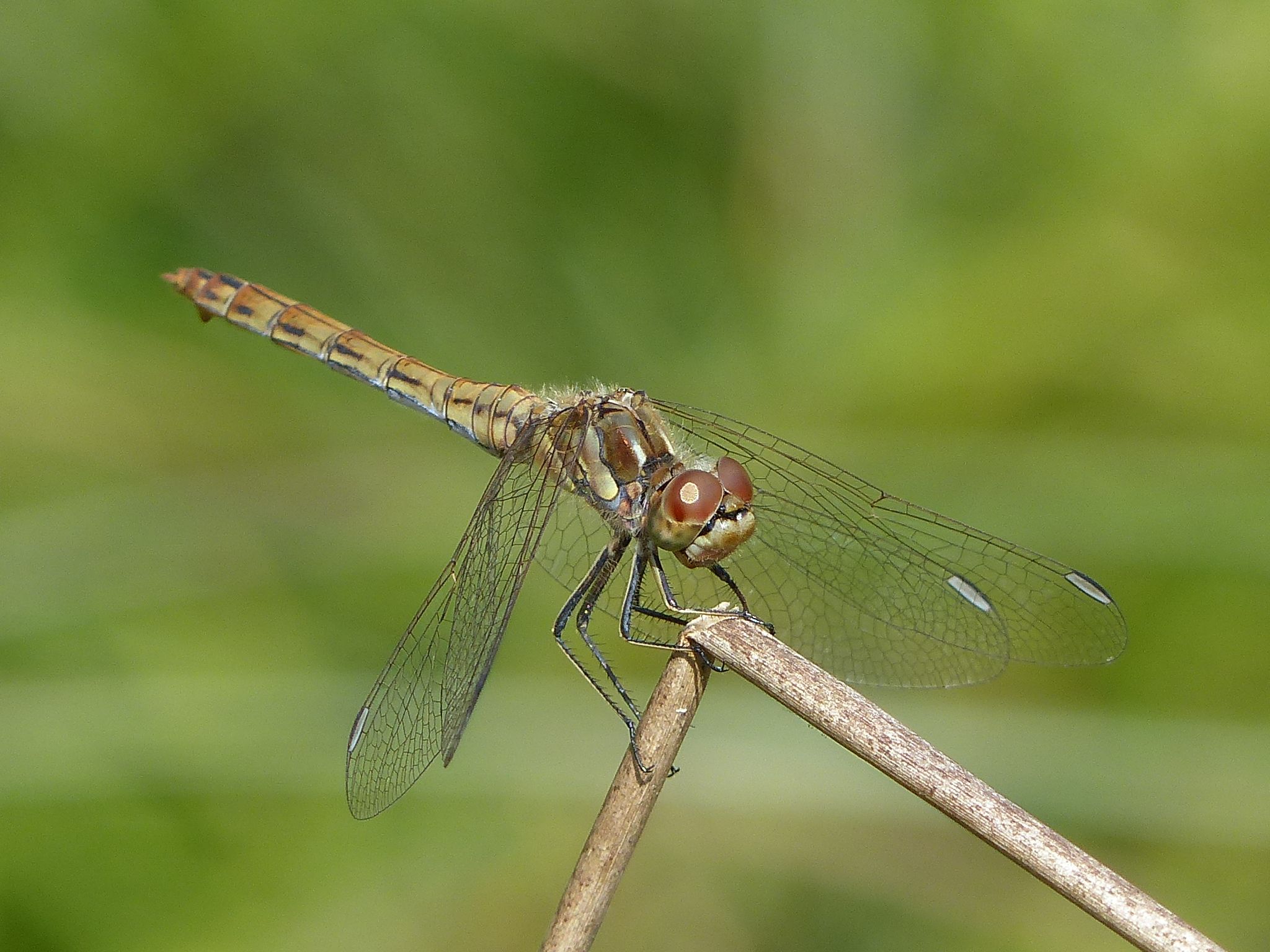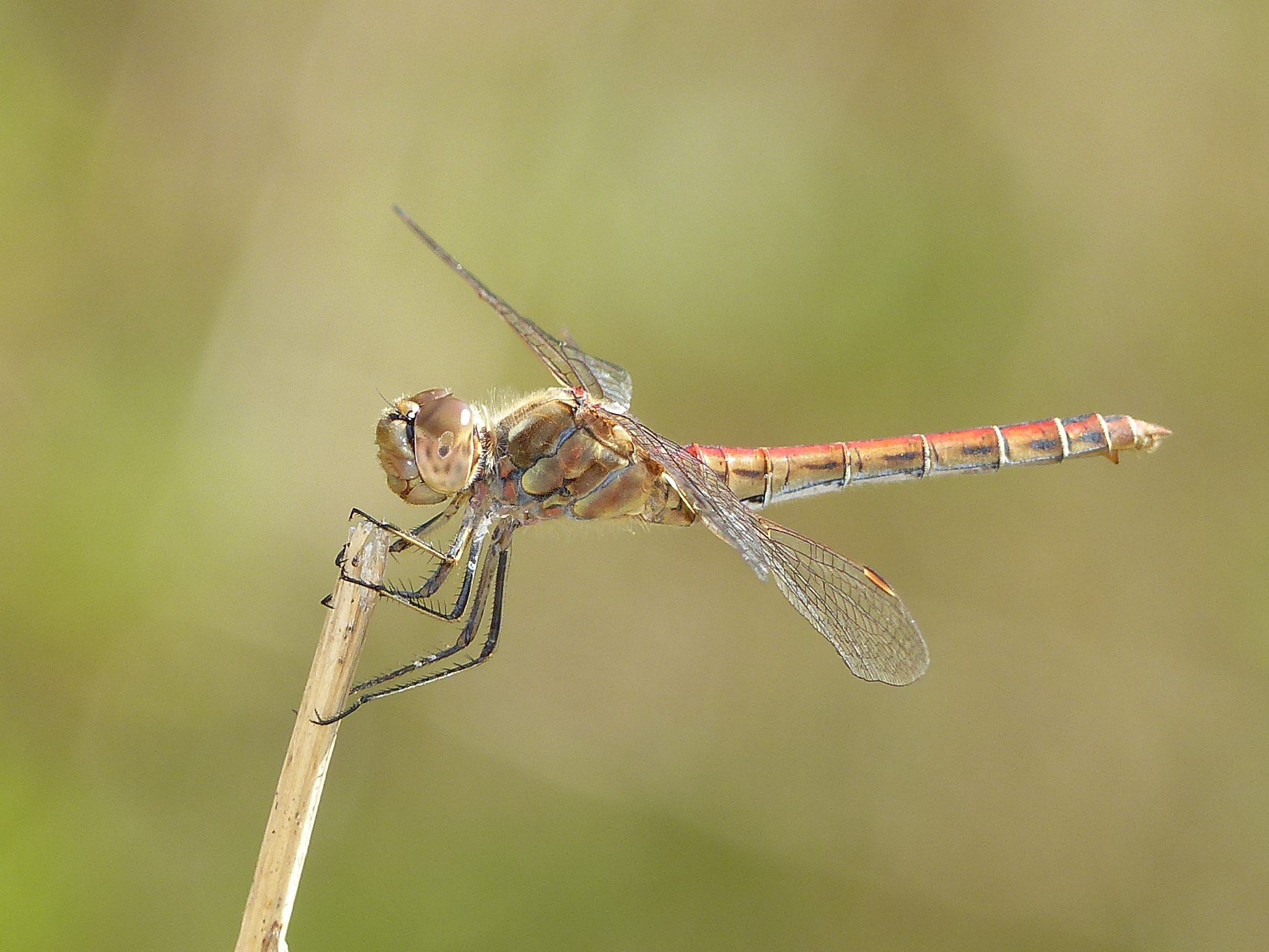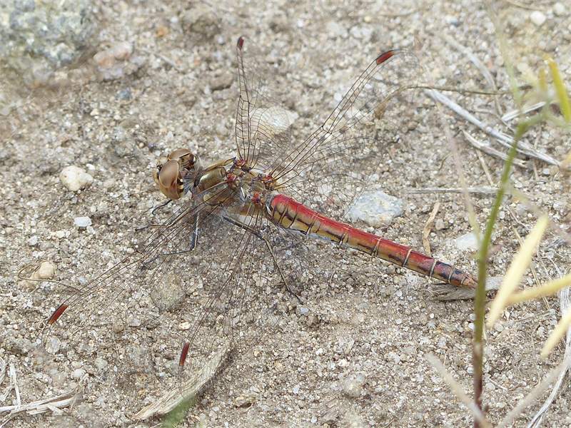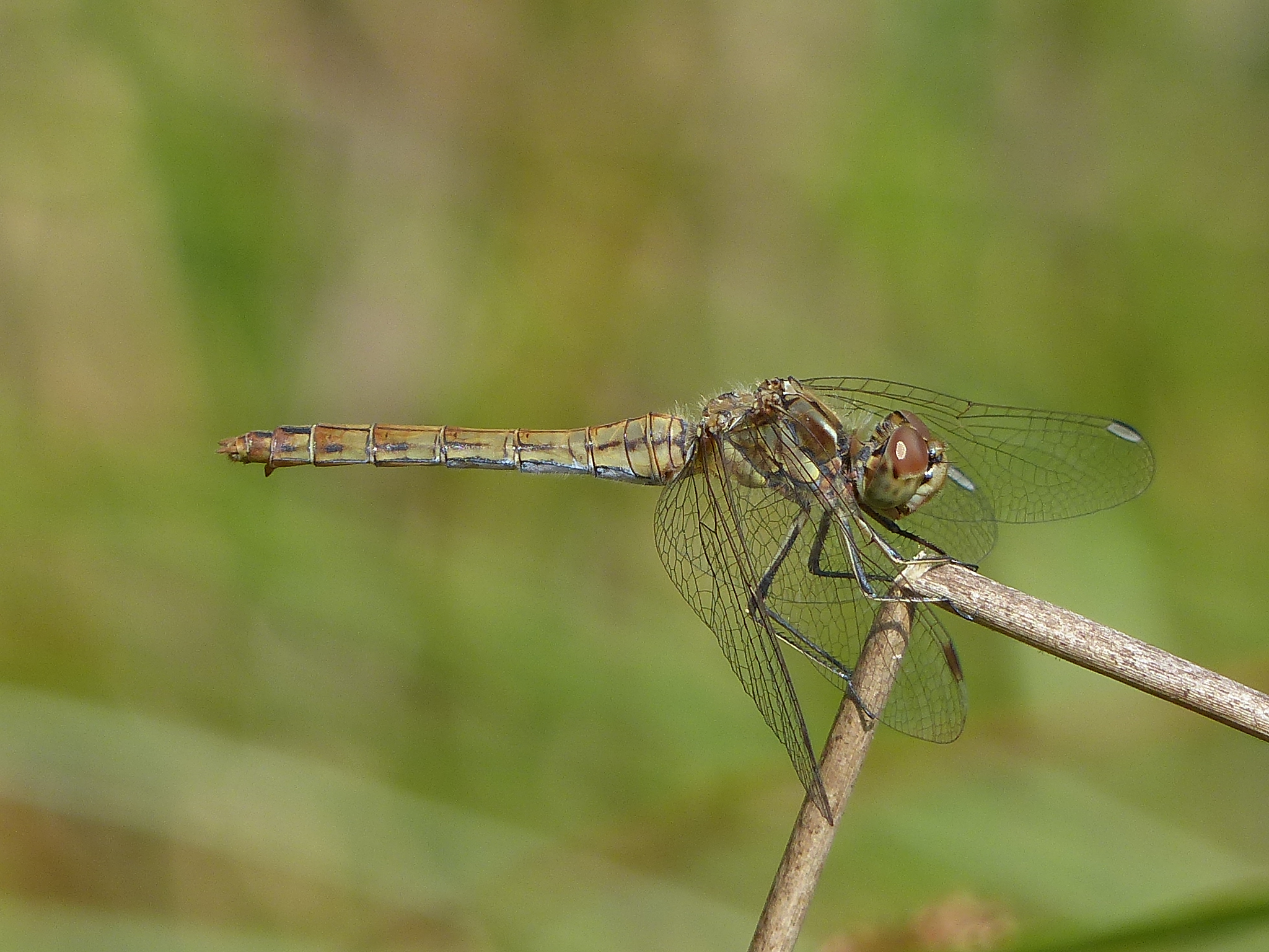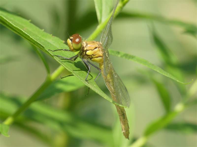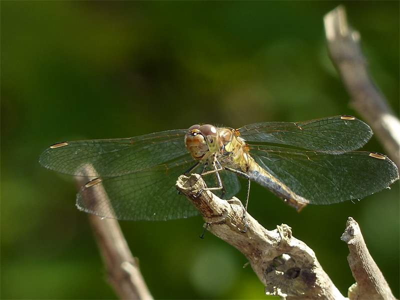 Gemeine Heidelibelle, Gemarkung Hohenprießnitz, Rieselgraben am Fichtbusch, altes Weibchen, Merkmale: gestreifte Beine, senkrecht abstehende Legescheide, August 2013