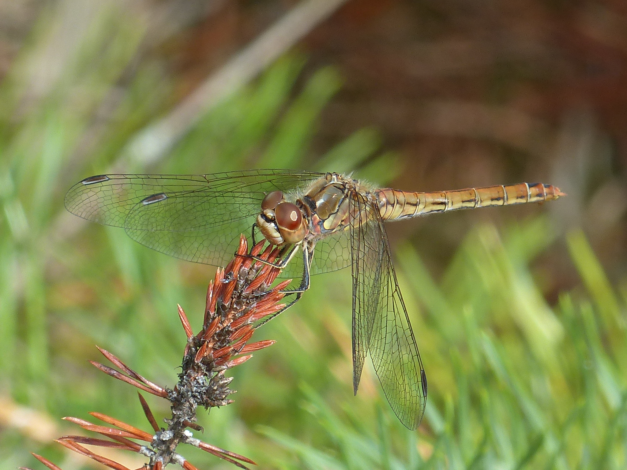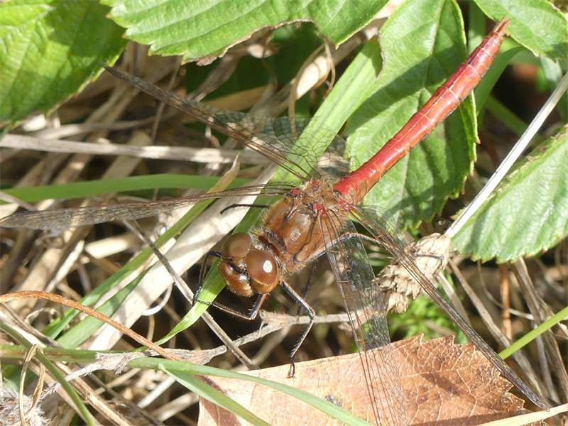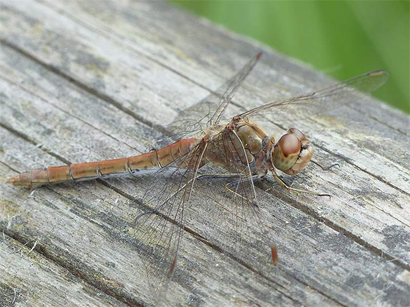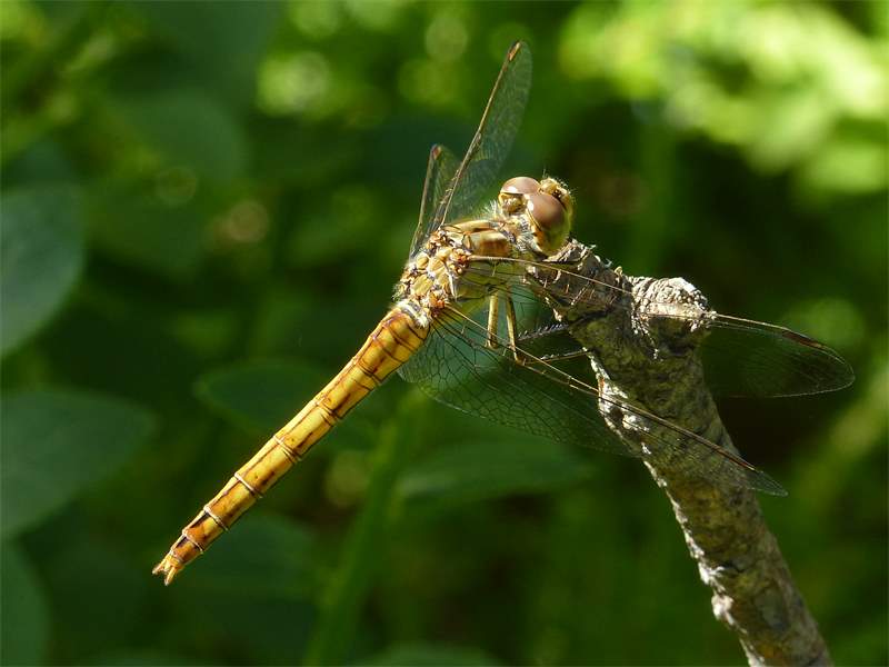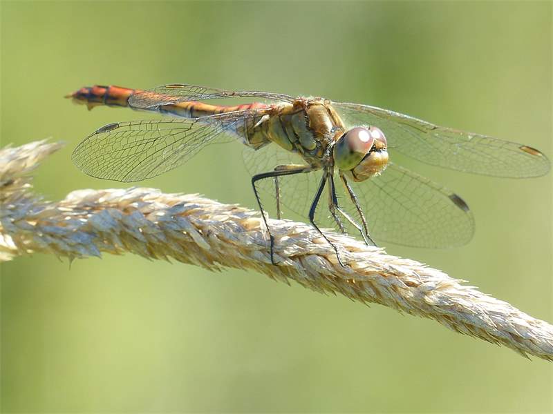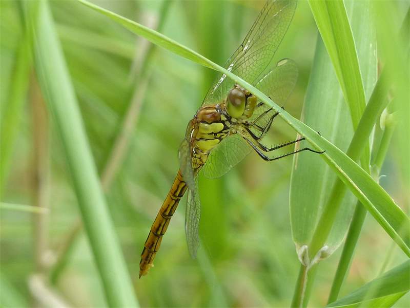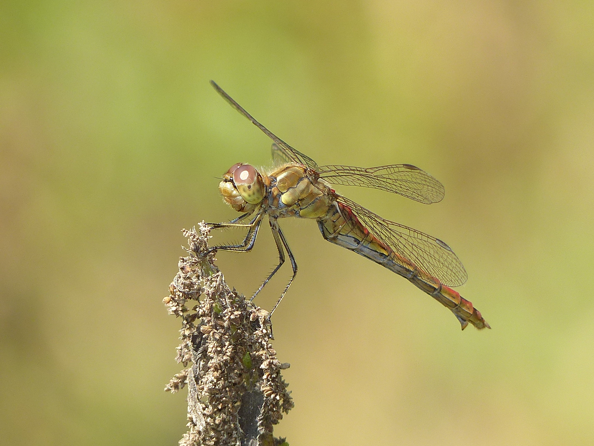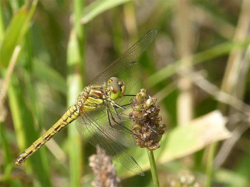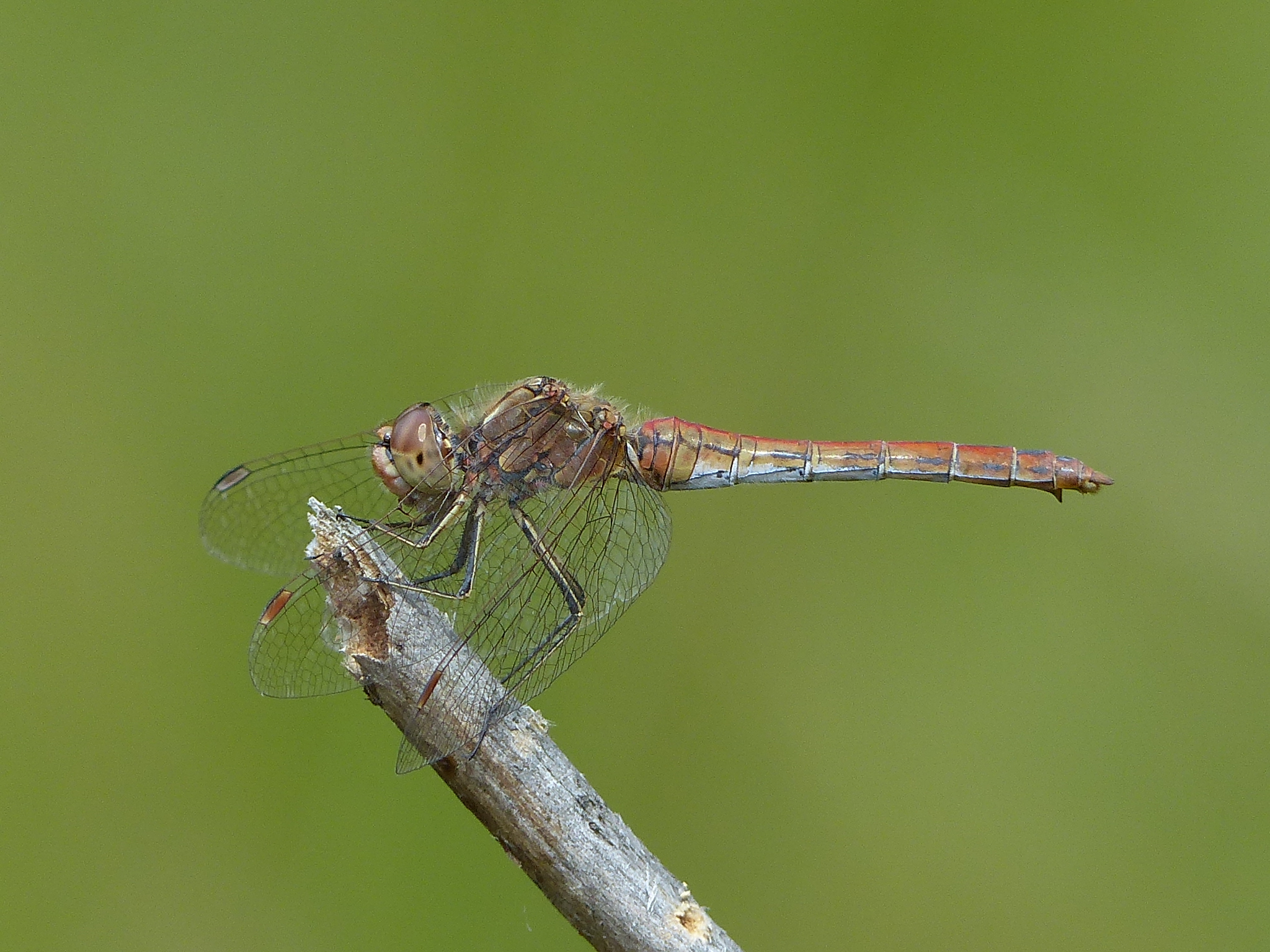 Gemeine Heidelibelle, Gemarkung Hohenprießnitz, Rieselgraben am Fichtbusch, altes Weibchen, Merkmale: gestreifte Beine, senkrecht abstehende Legescheide, August 2013