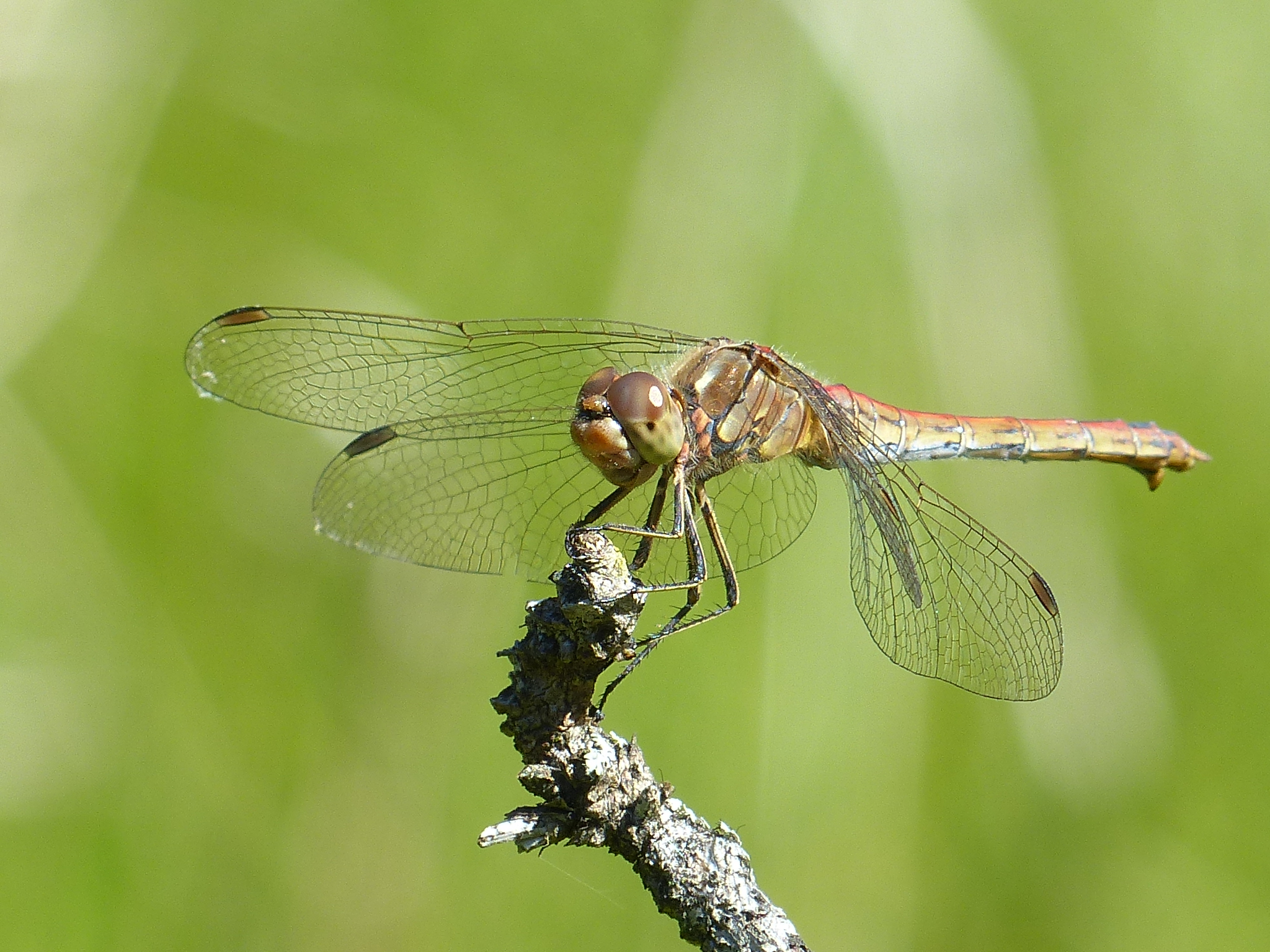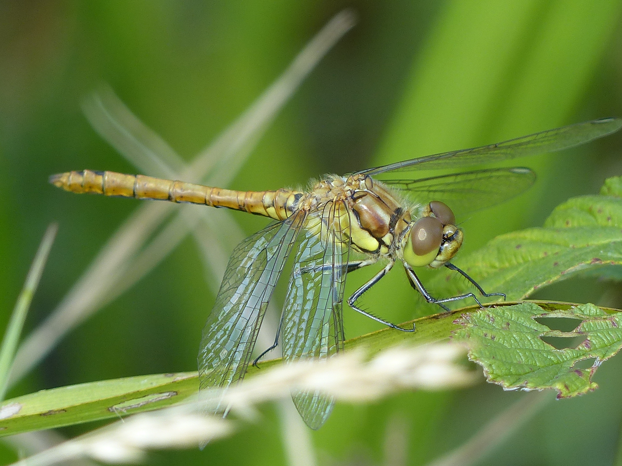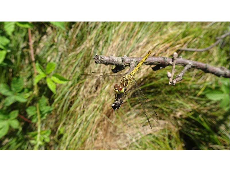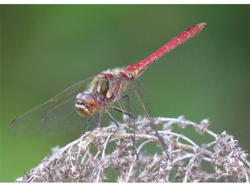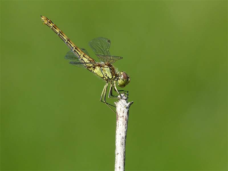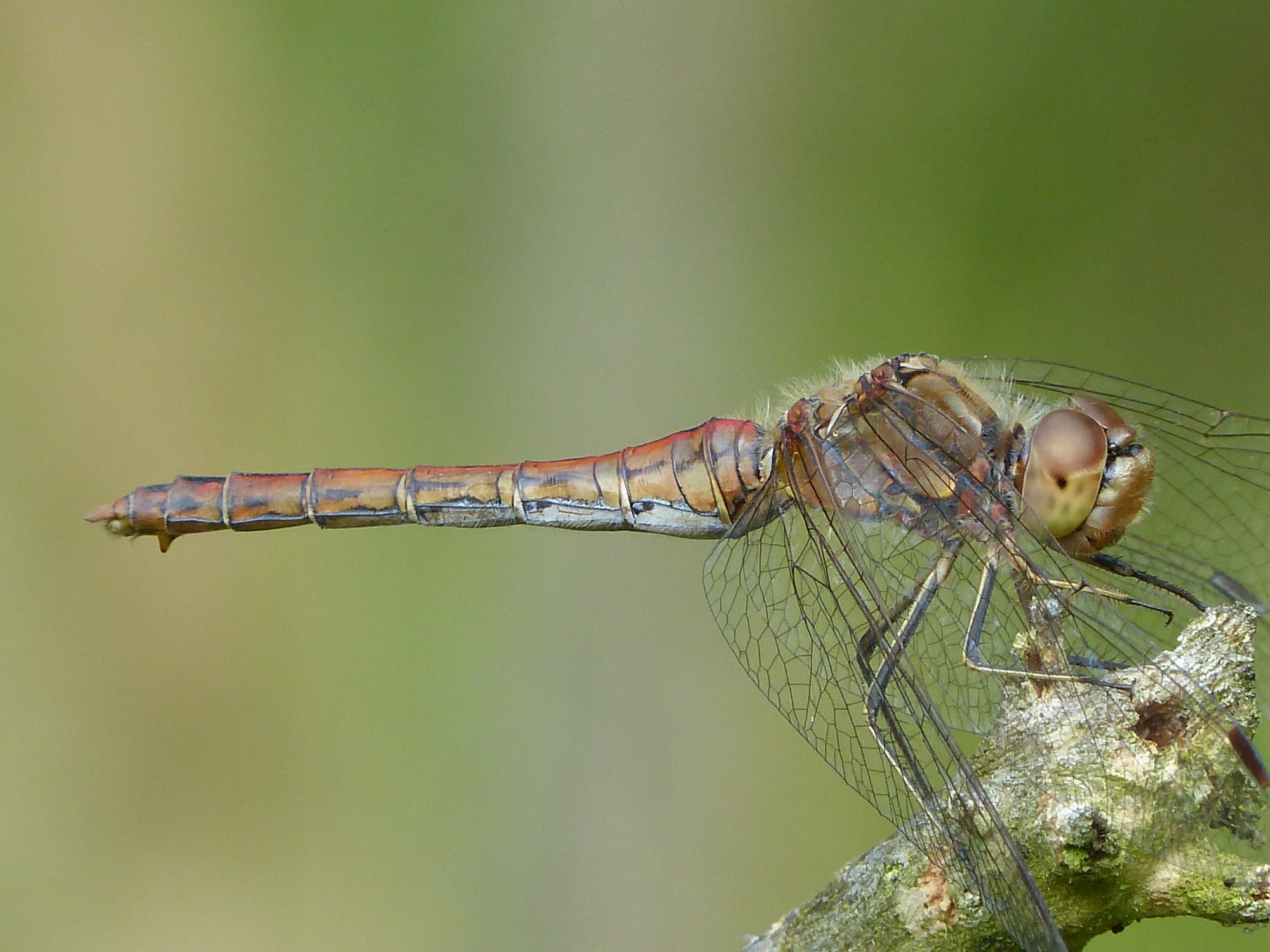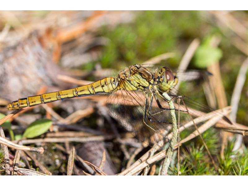 Gemeine Heidelibelle, Gemarkung Hohenprießnitz, Rieselgraben am Fichtbusch, altes Weibchen, Merkmale: gestreifte Beine, senkrecht abstehende Legescheide, August 2013