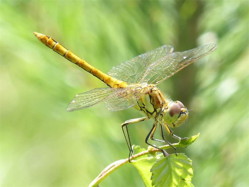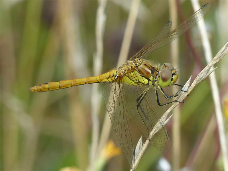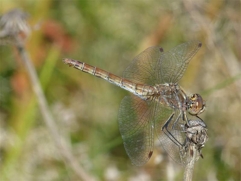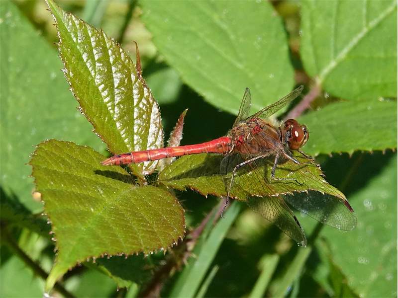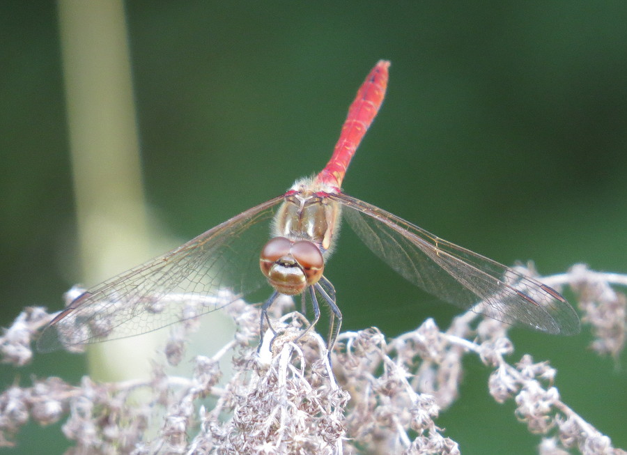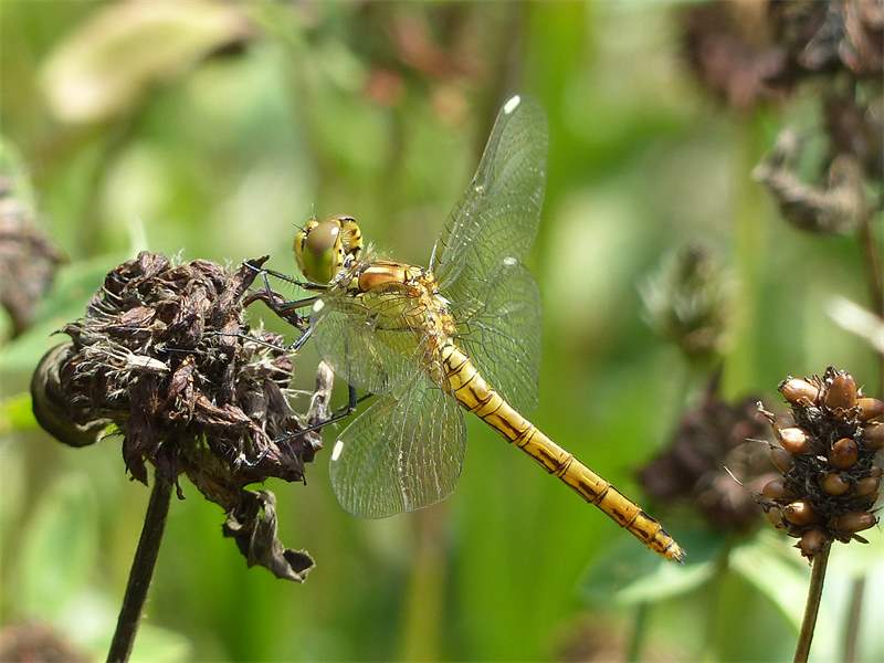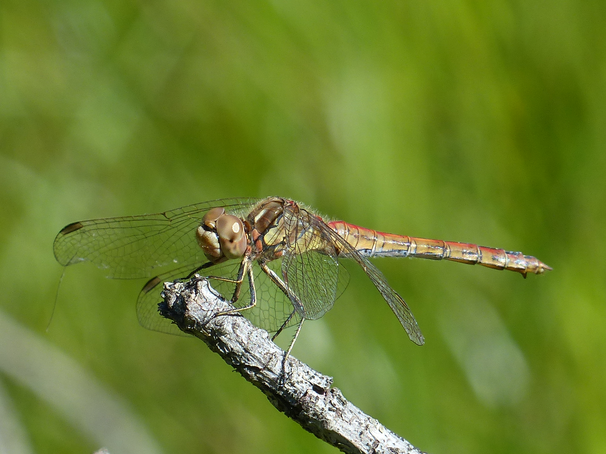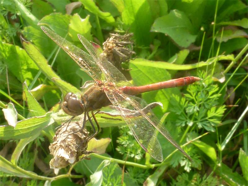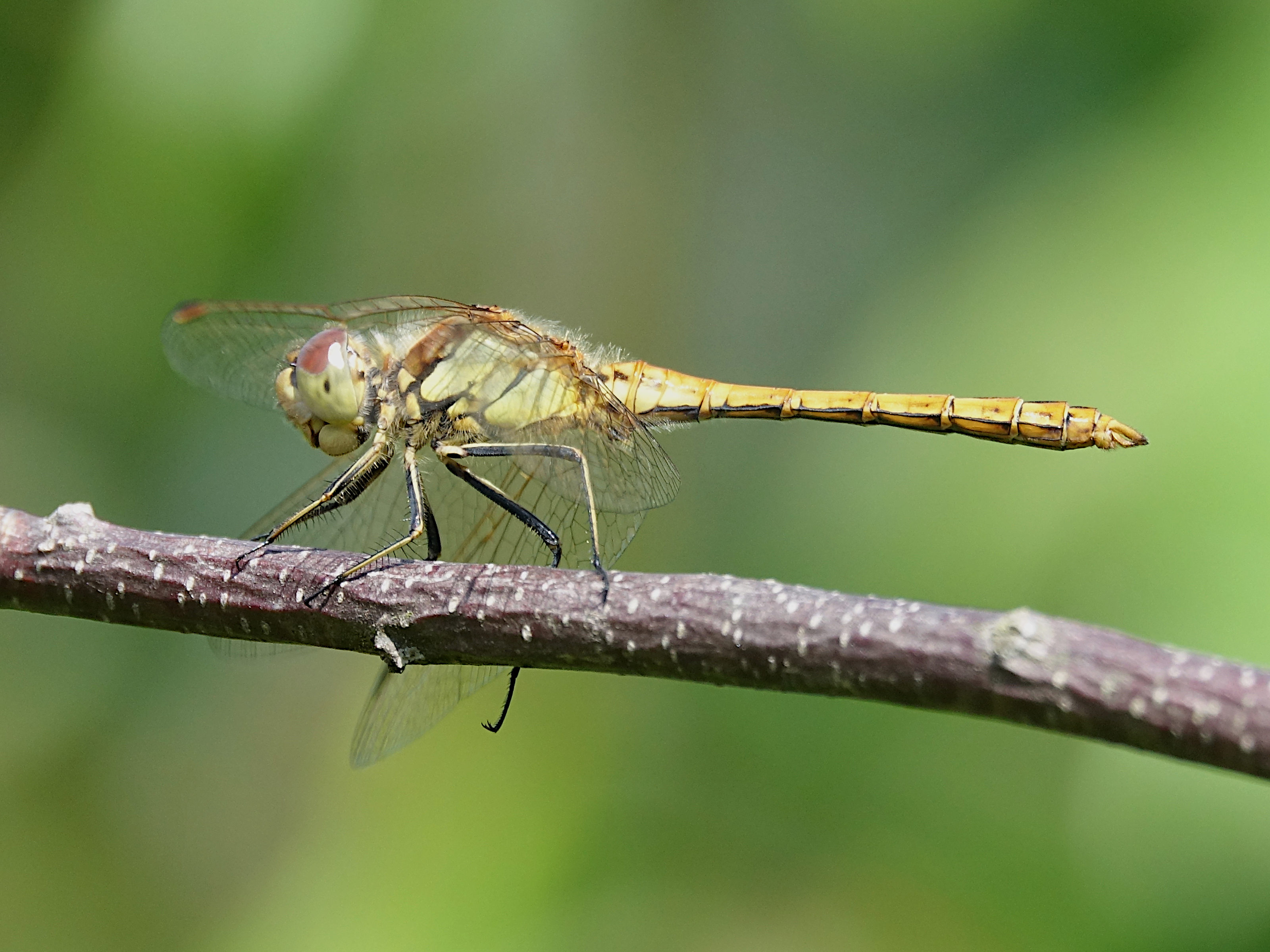 Gemeine Heidelibelle, Gemarkung Hohenprießnitz, Rieselgraben am Fichtbusch, altes Weibchen, Merkmale: gestreifte Beine, senkrecht abstehende Legescheide, August 2013