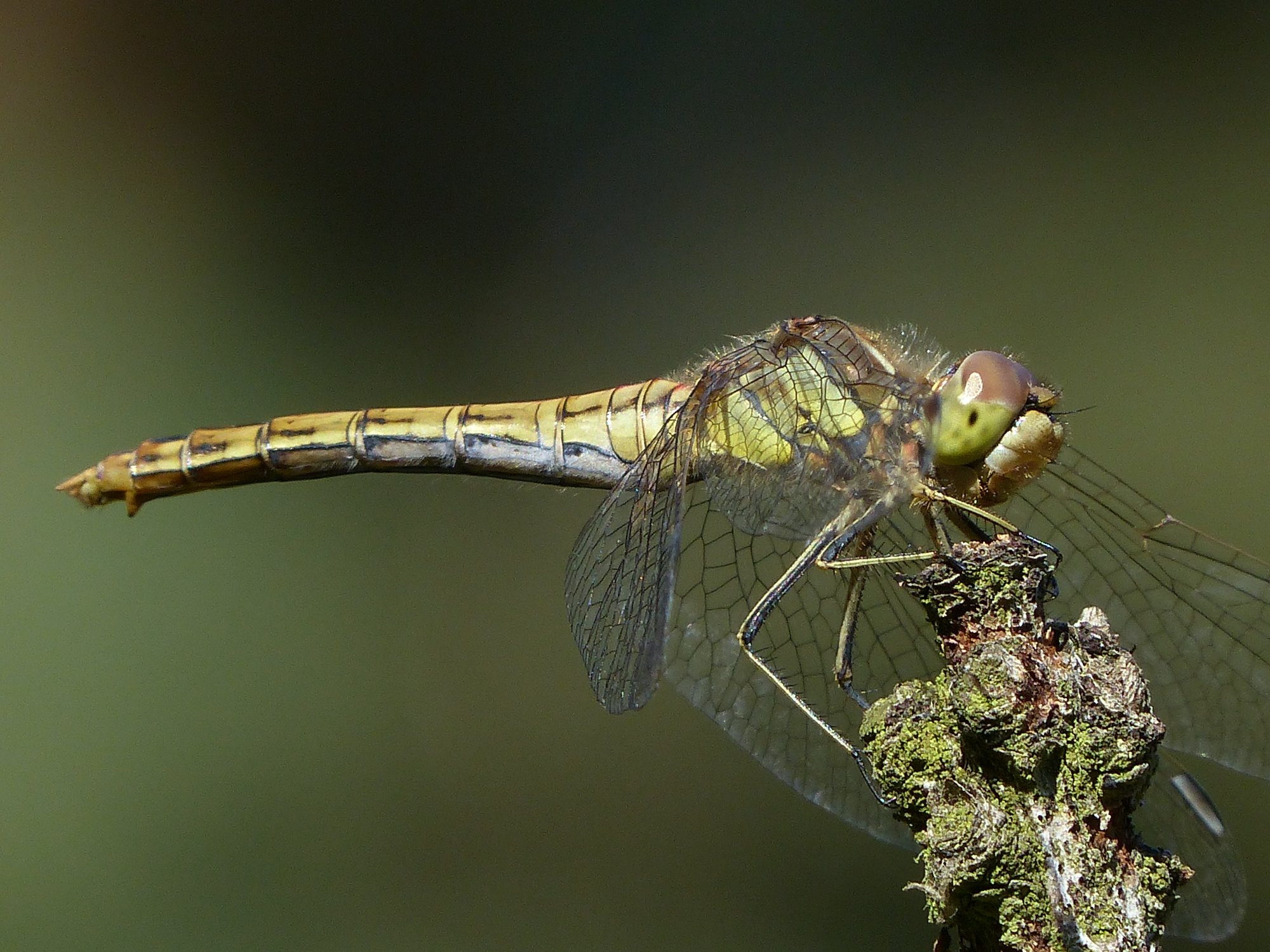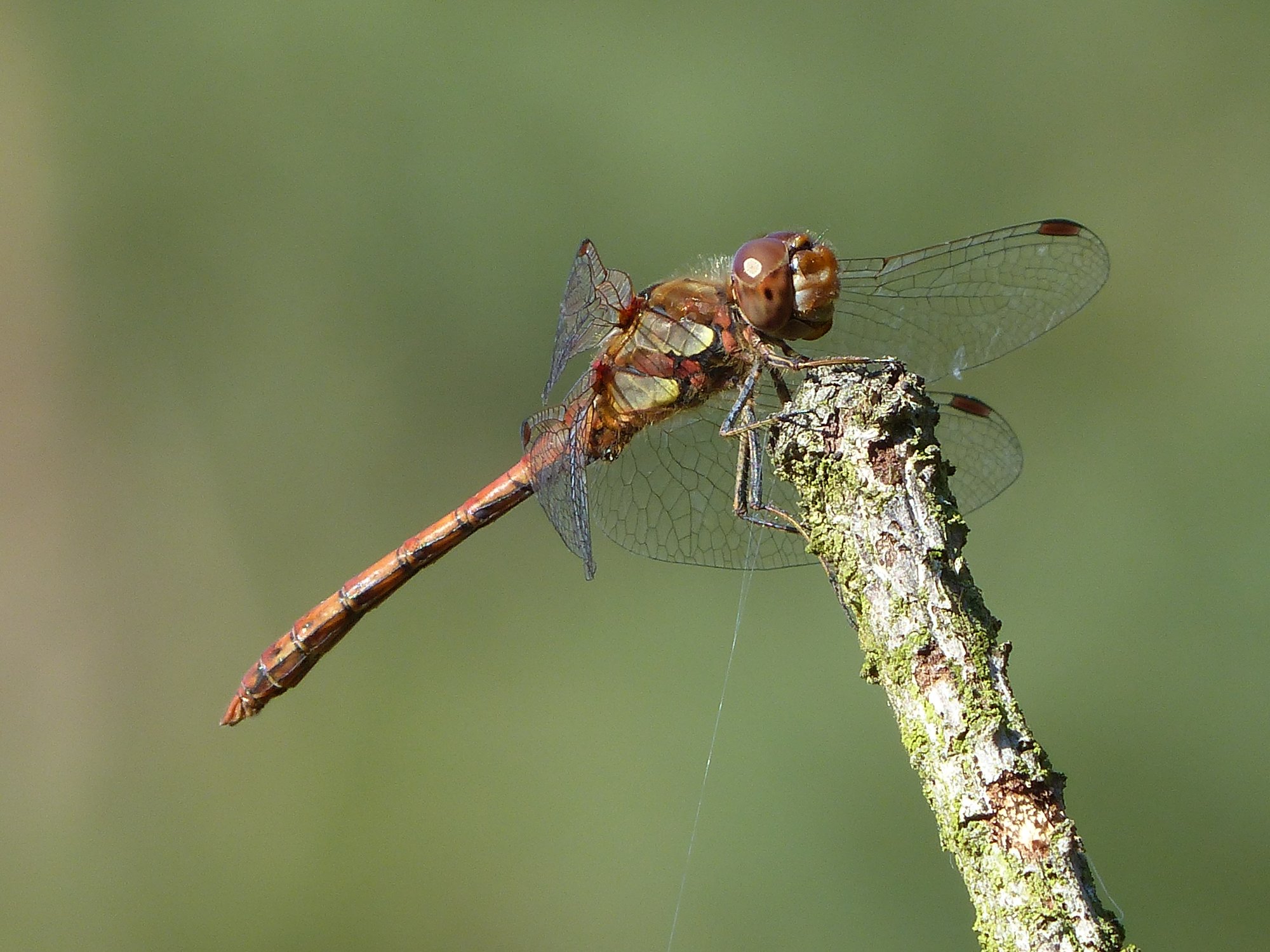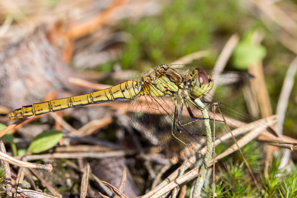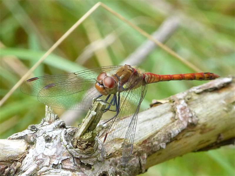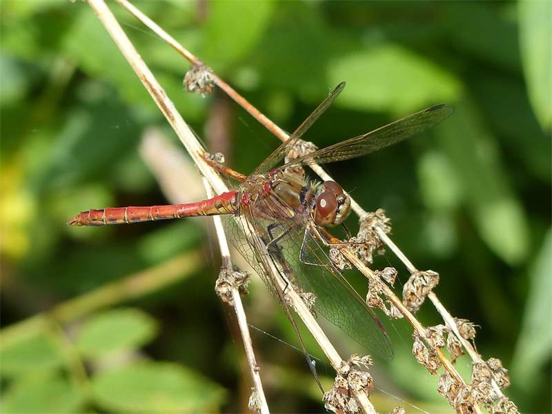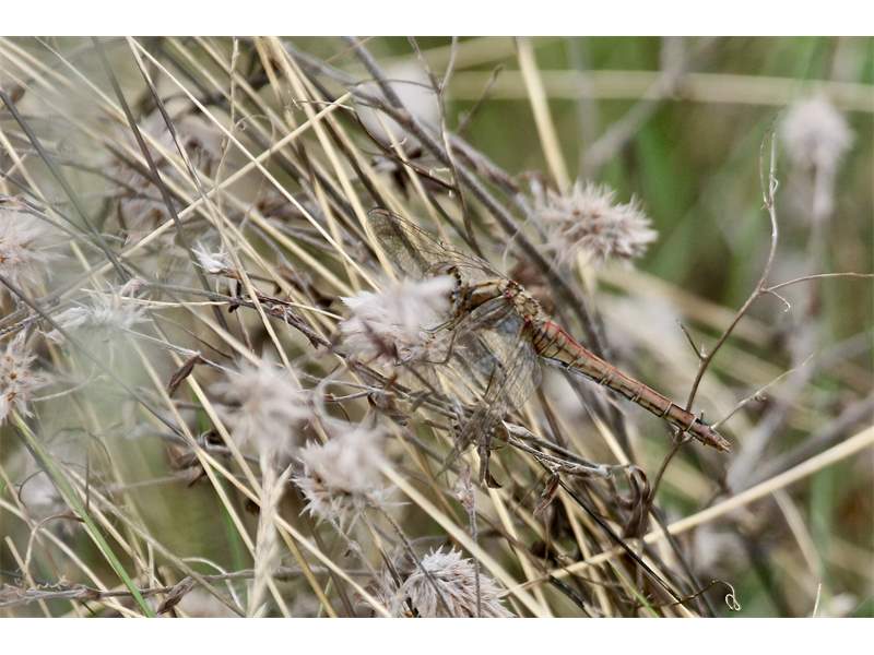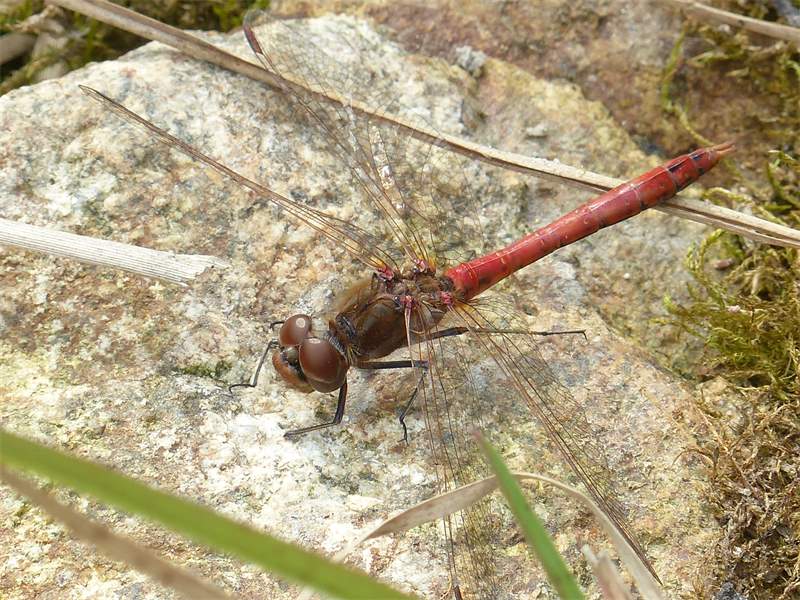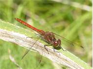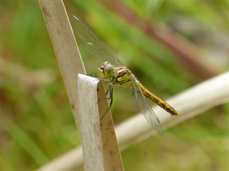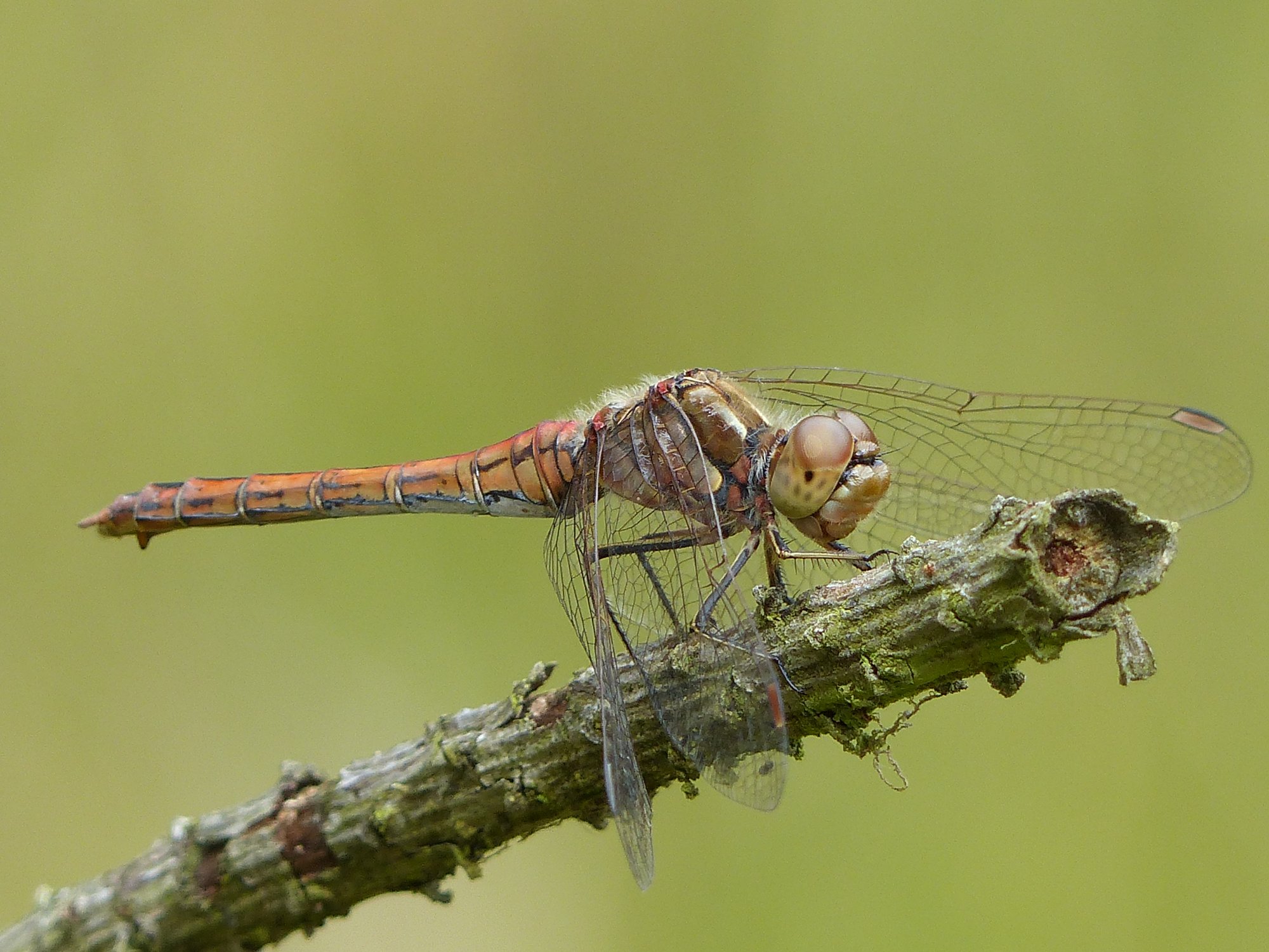 Gemeine Heidelibelle, Gemarkung Hohenprießnitz, Rieselgraben am Fichtbusch, altes Weibchen, Merkmale: gestreifte Beine, senkrecht abstehende Legescheide, August 2013