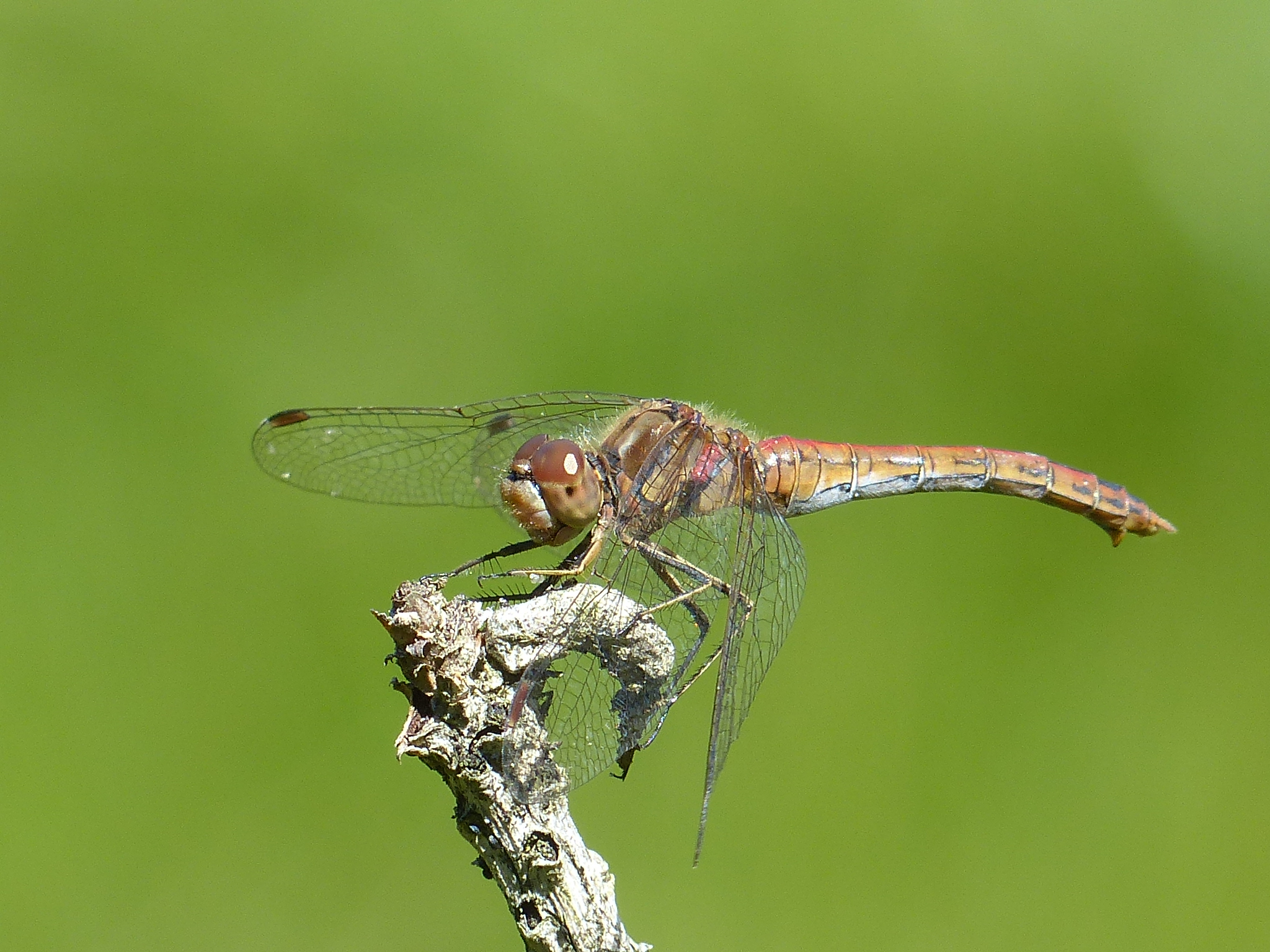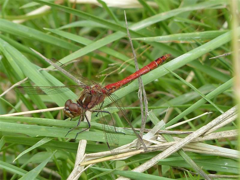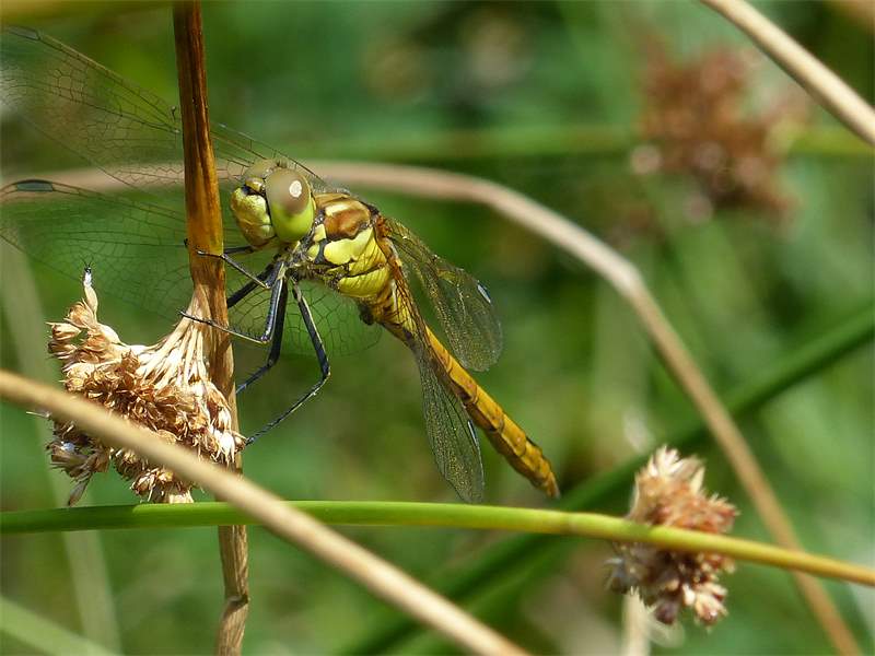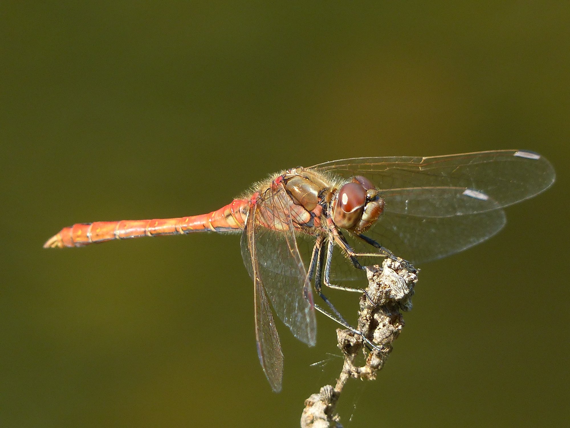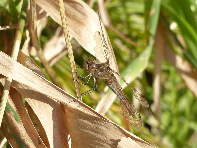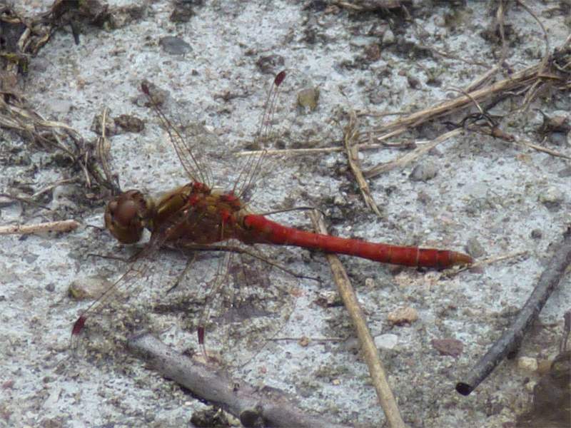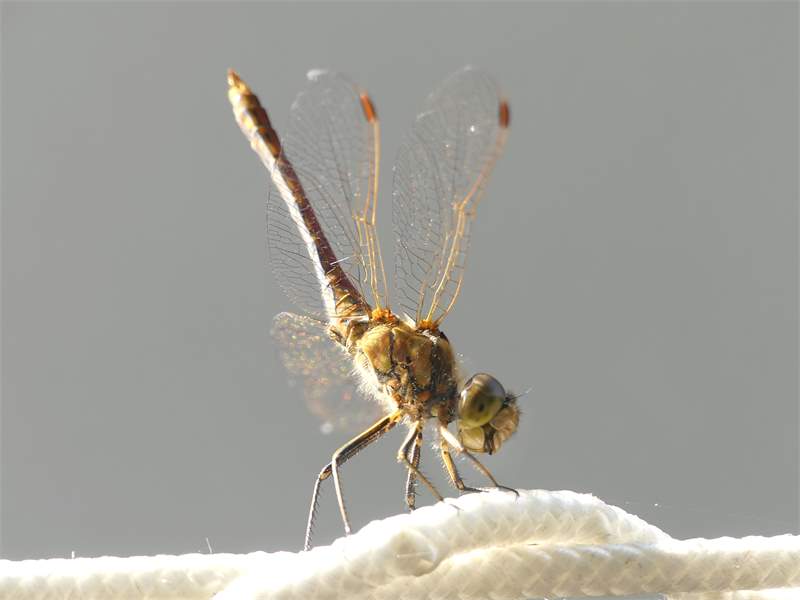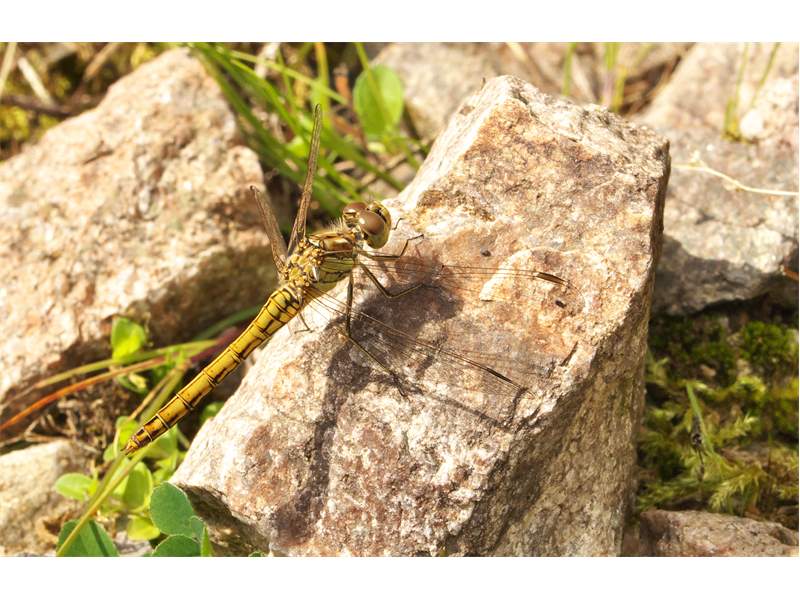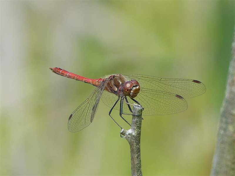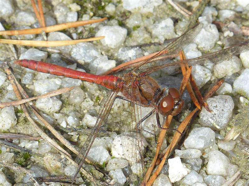Gemeine Heidelibelle, Gemarkung Hohenprießnitz, Rieselgraben am Fichtbusch, altes Weibchen, Merkmale: gestreifte Beine, senkrecht abstehende Legescheide, August 2013
