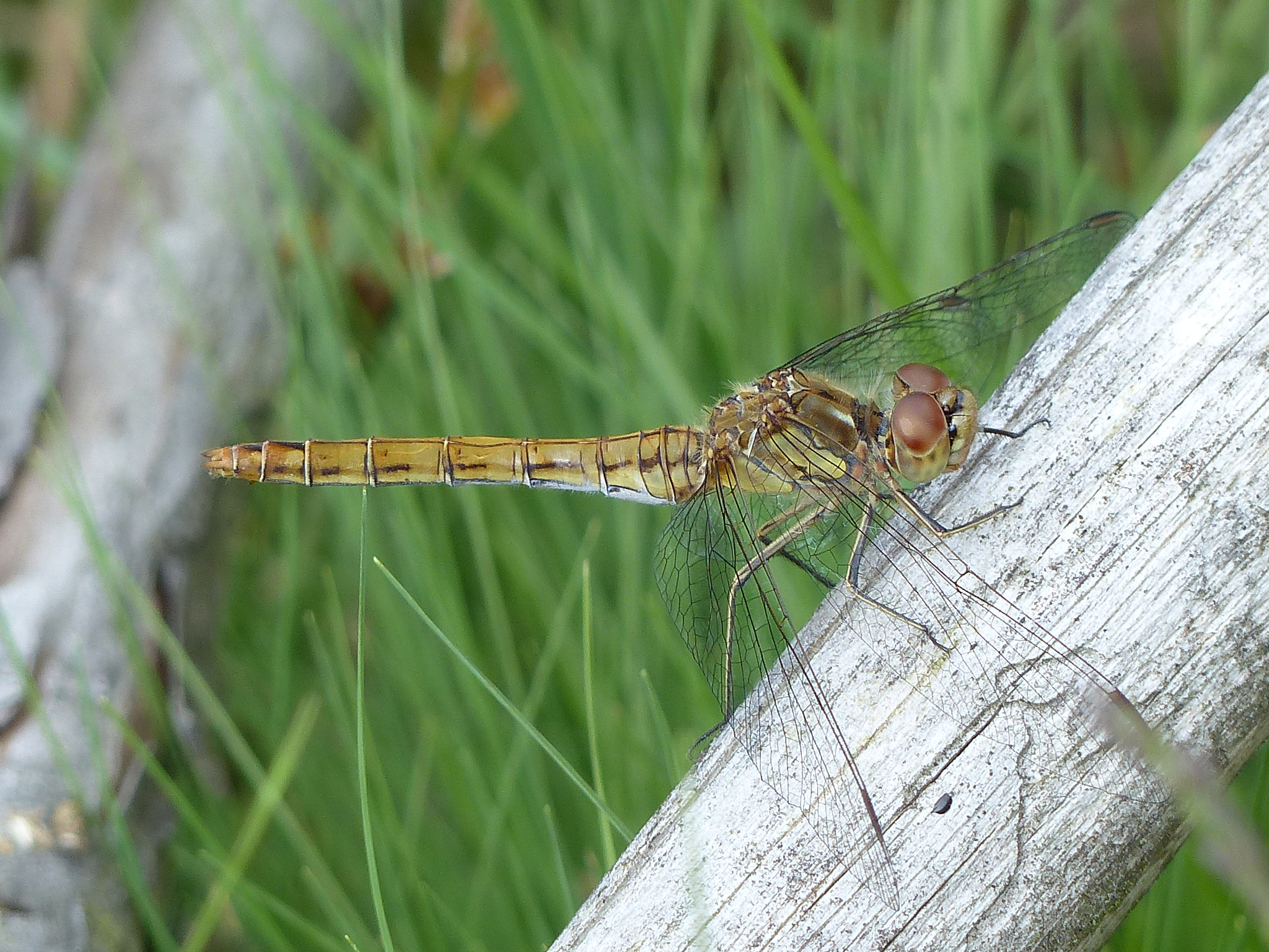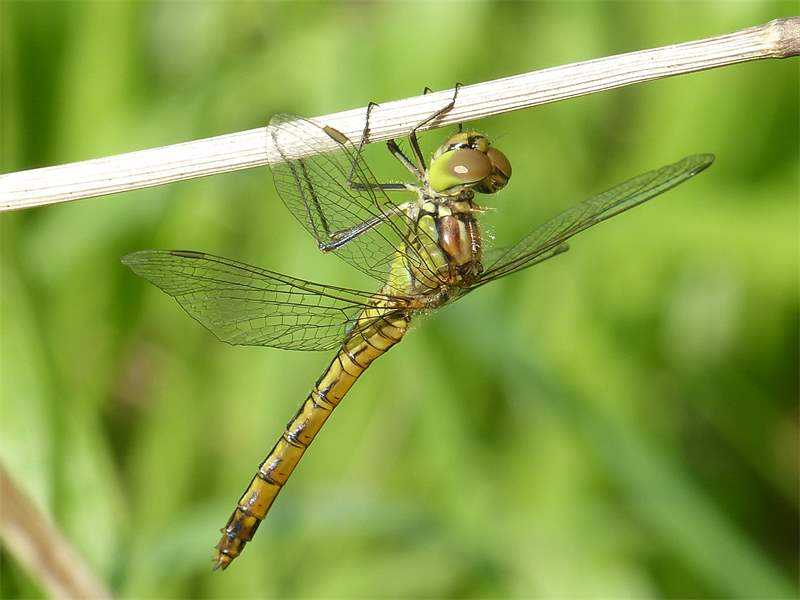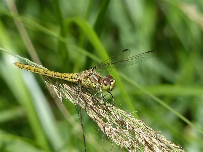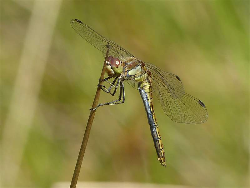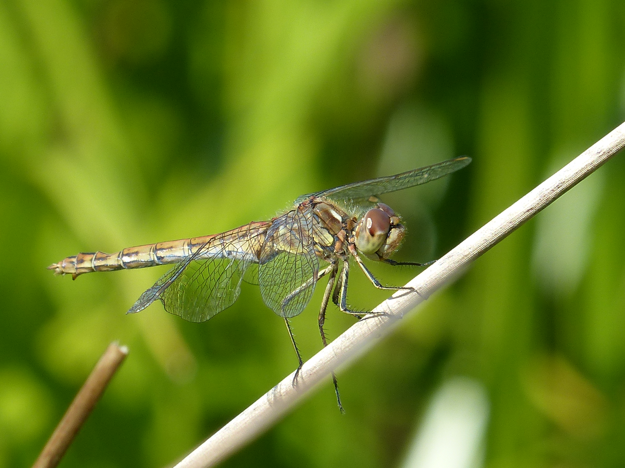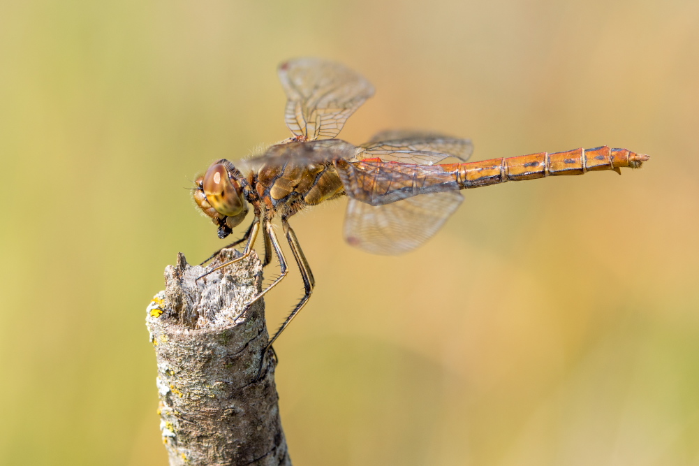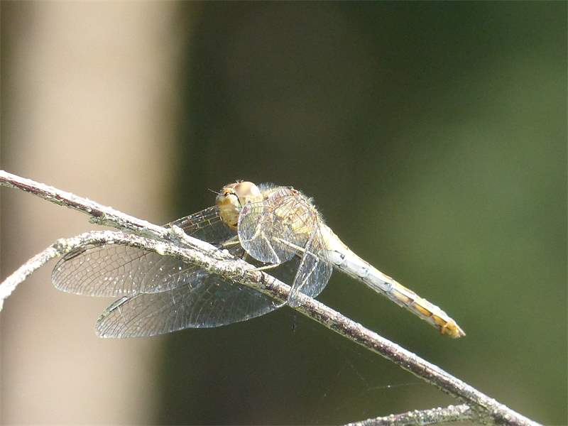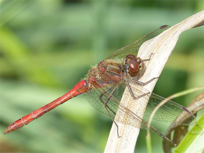 Gemeine Heidelibelle, Gemarkung Hohenprießnitz, Rieselgraben am Fichtbusch, altes Weibchen, Merkmale: gestreifte Beine, senkrecht abstehende Legescheide, August 2013