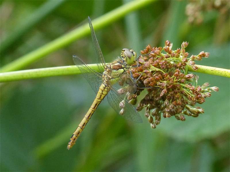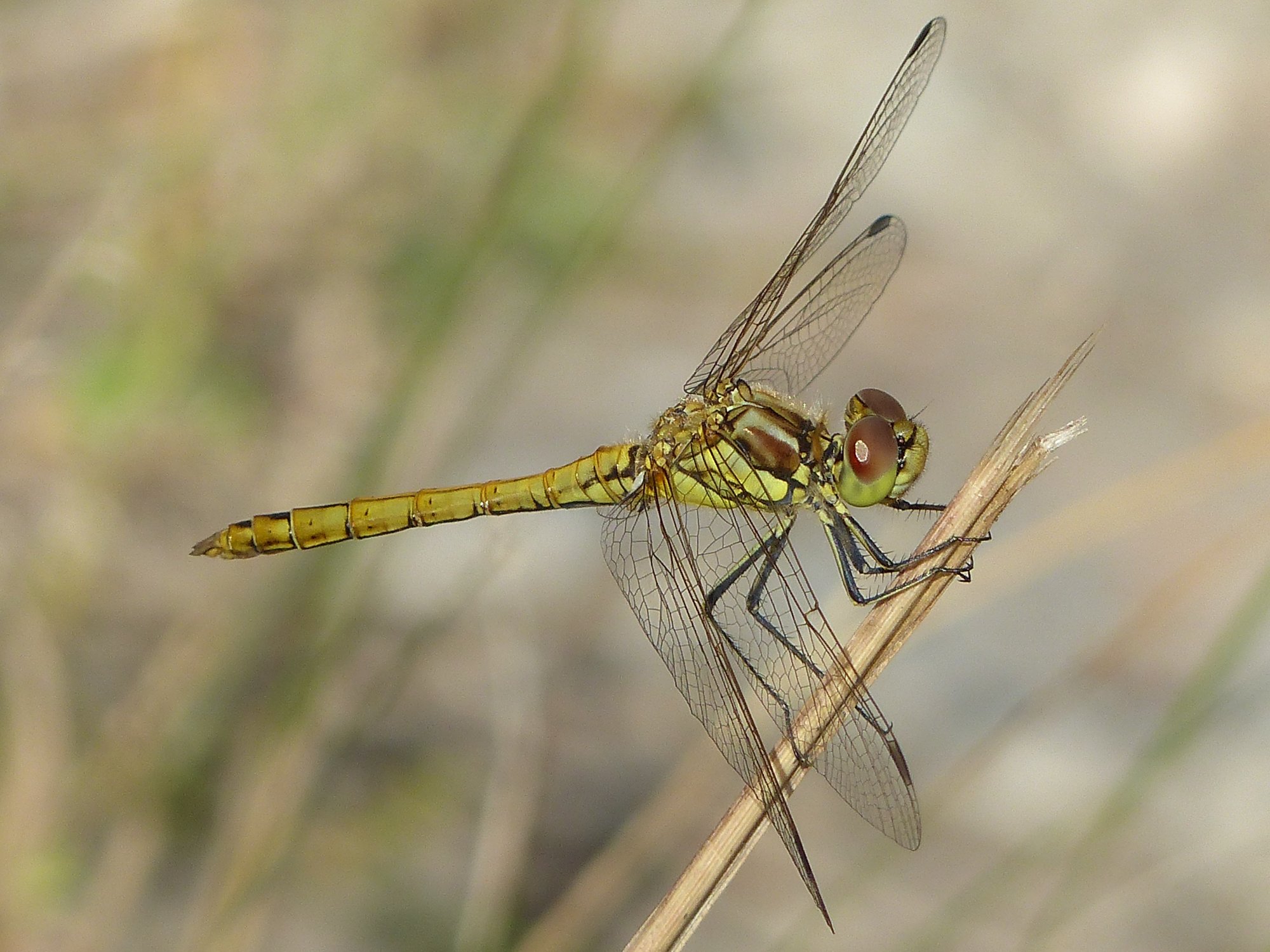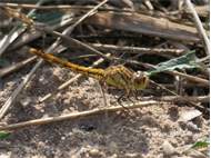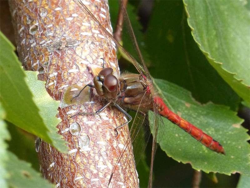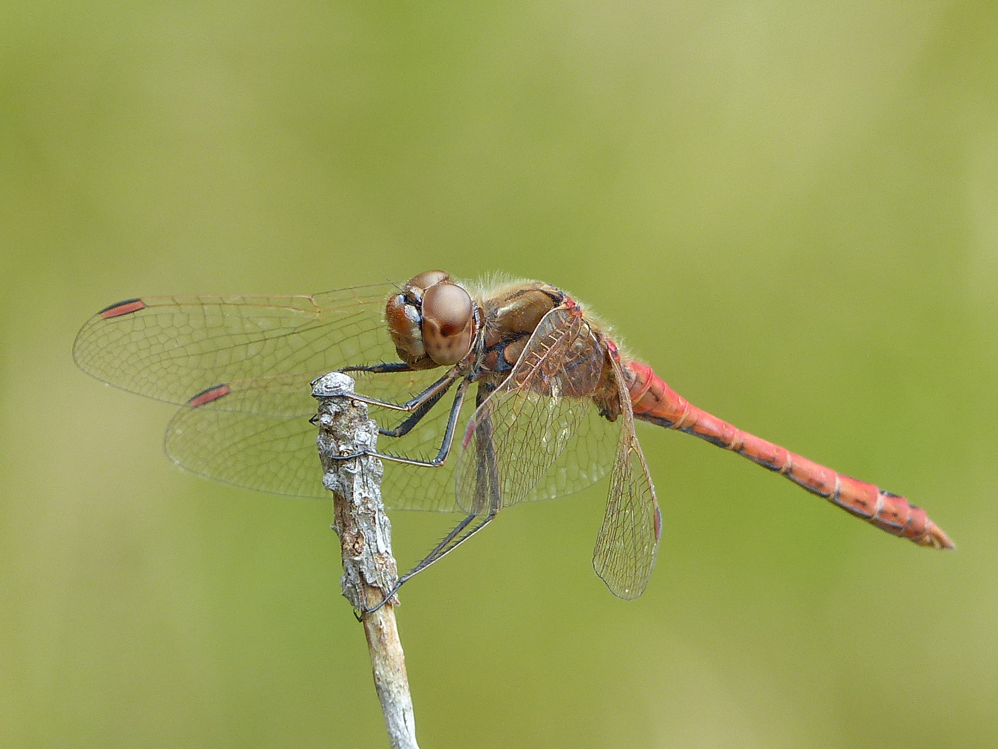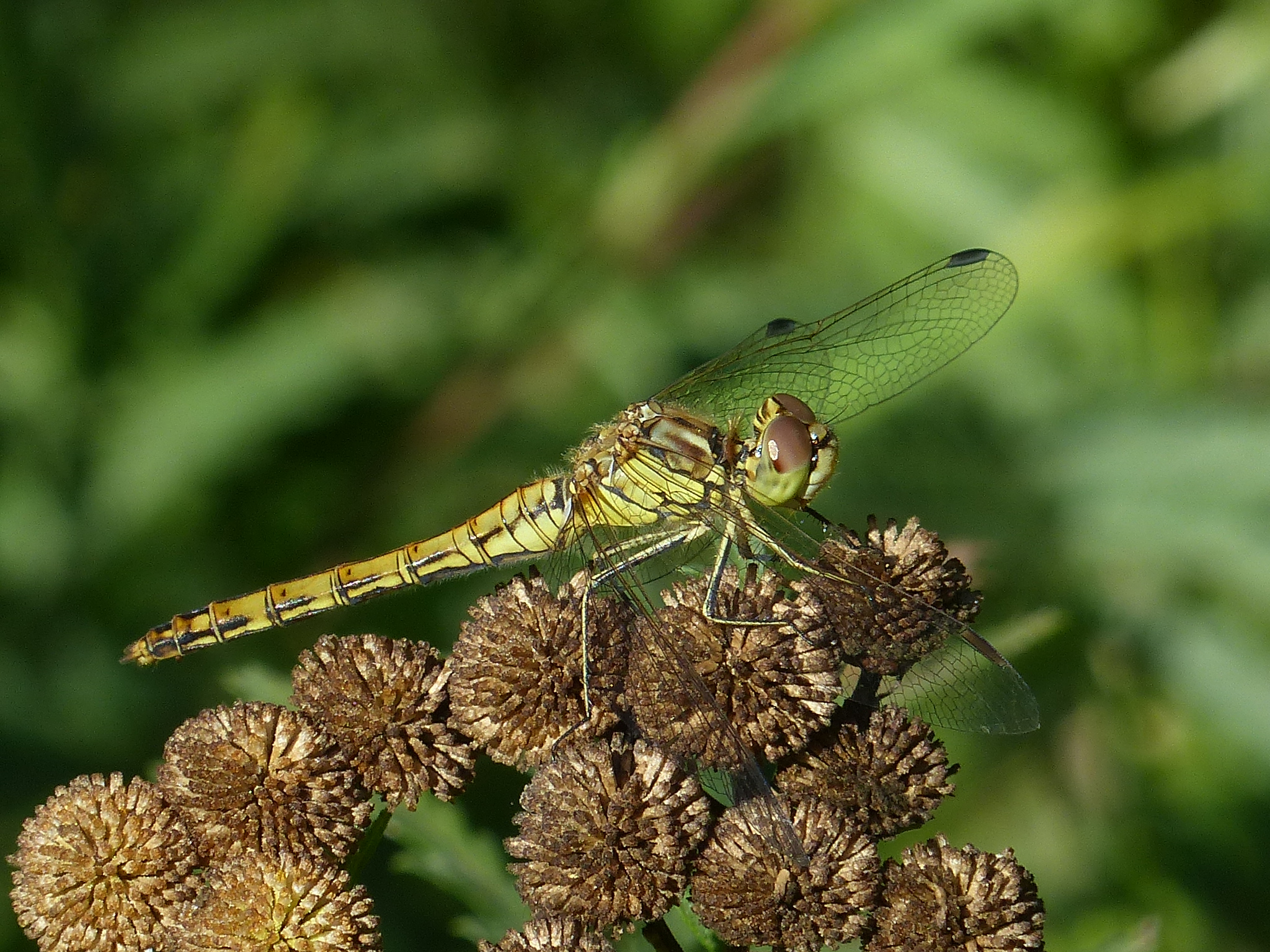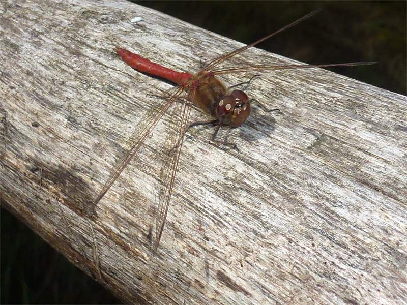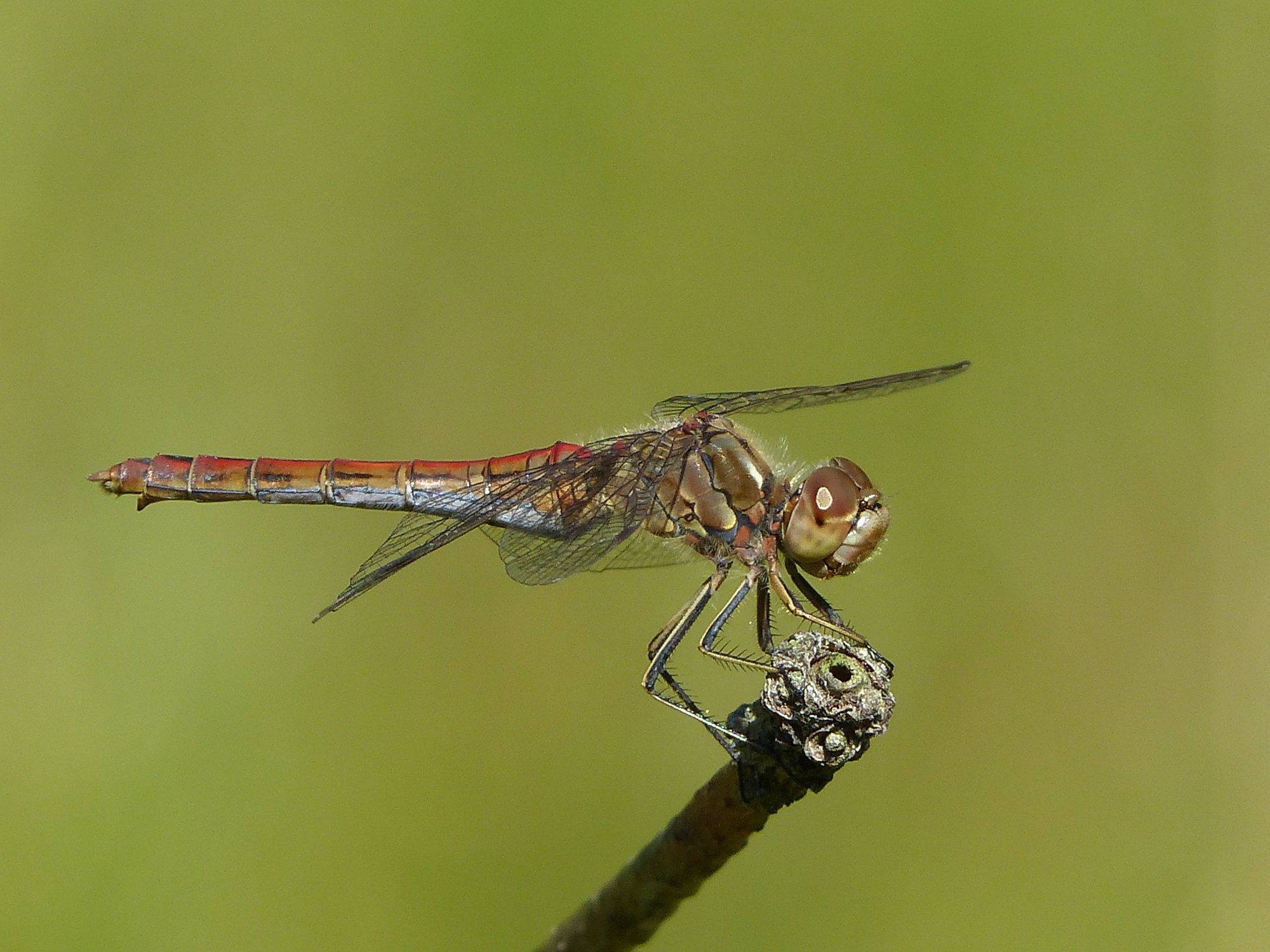 Gemeine Heidelibelle, Gemarkung Hohenprießnitz, Rieselgraben am Fichtbusch, altes Weibchen, Merkmale: gestreifte Beine, senkrecht abstehende Legescheide, August 2013