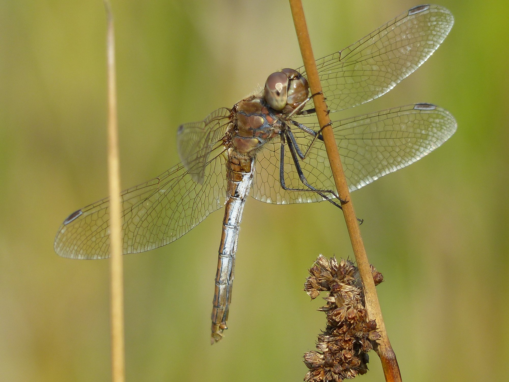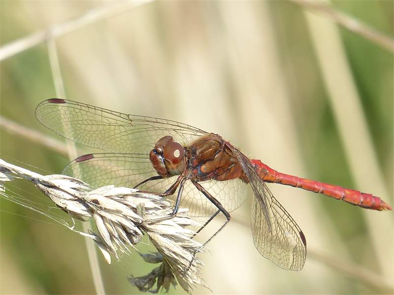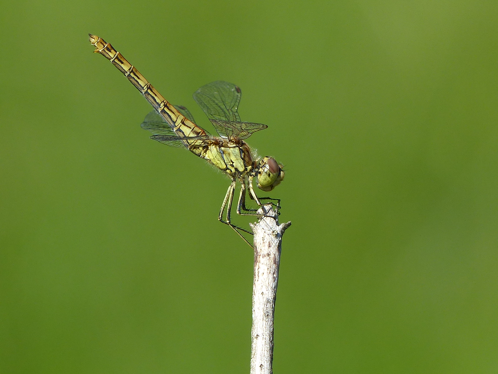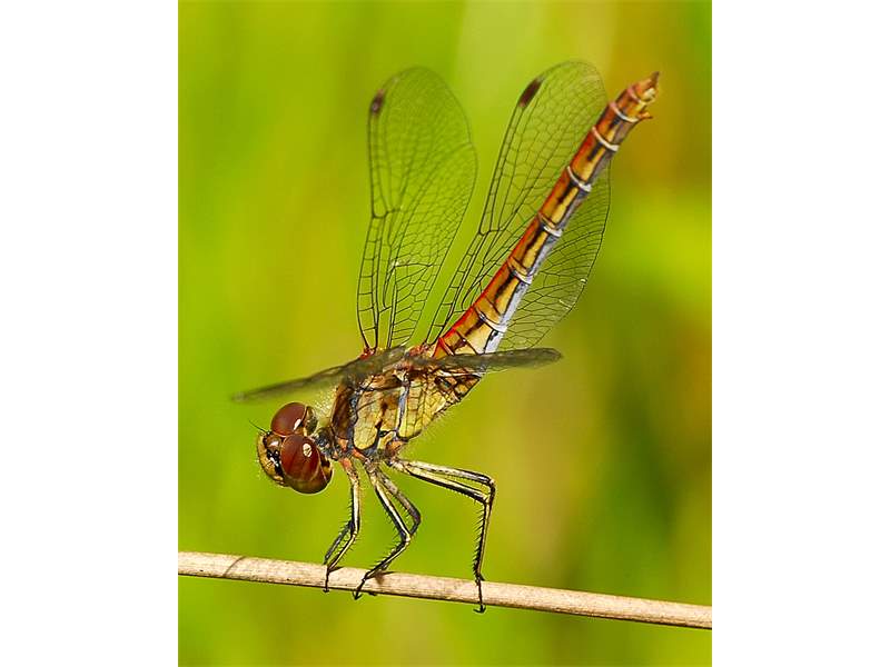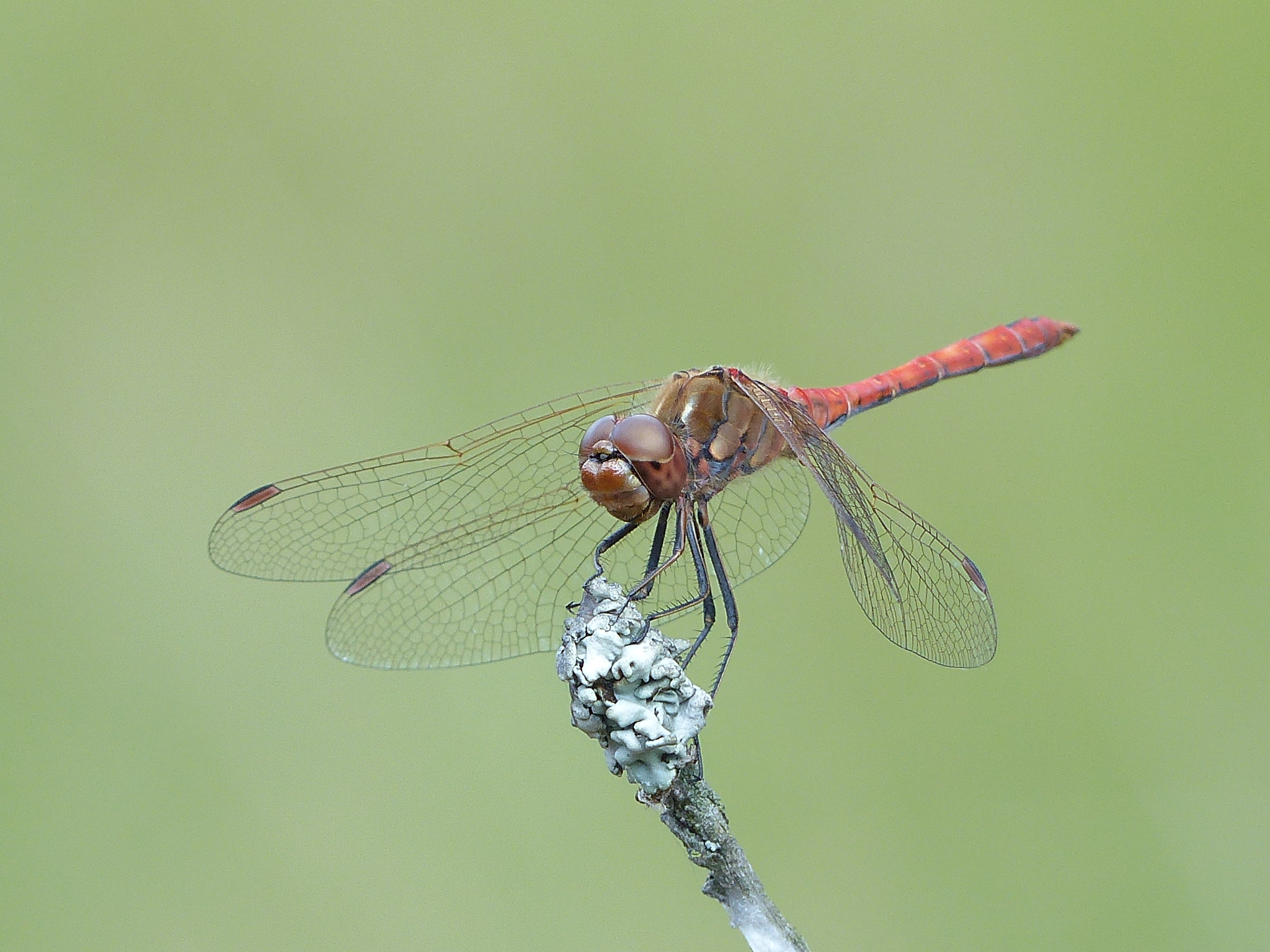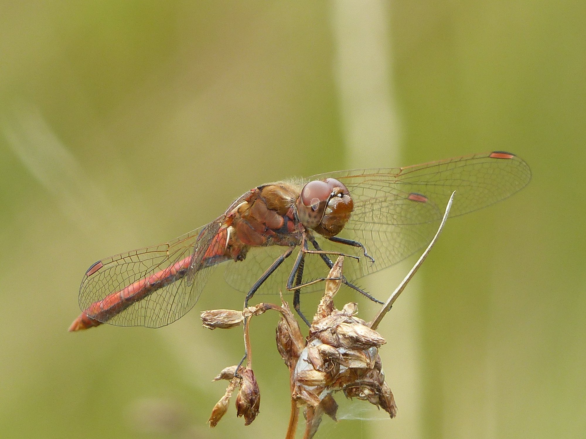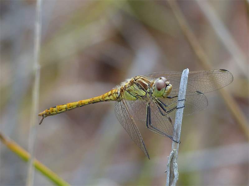 Gemeine Heidelibelle, Gemarkung Hohenprießnitz, Rieselgraben am Fichtbusch, altes Weibchen, Merkmale: gestreifte Beine, senkrecht abstehende Legescheide, August 2013