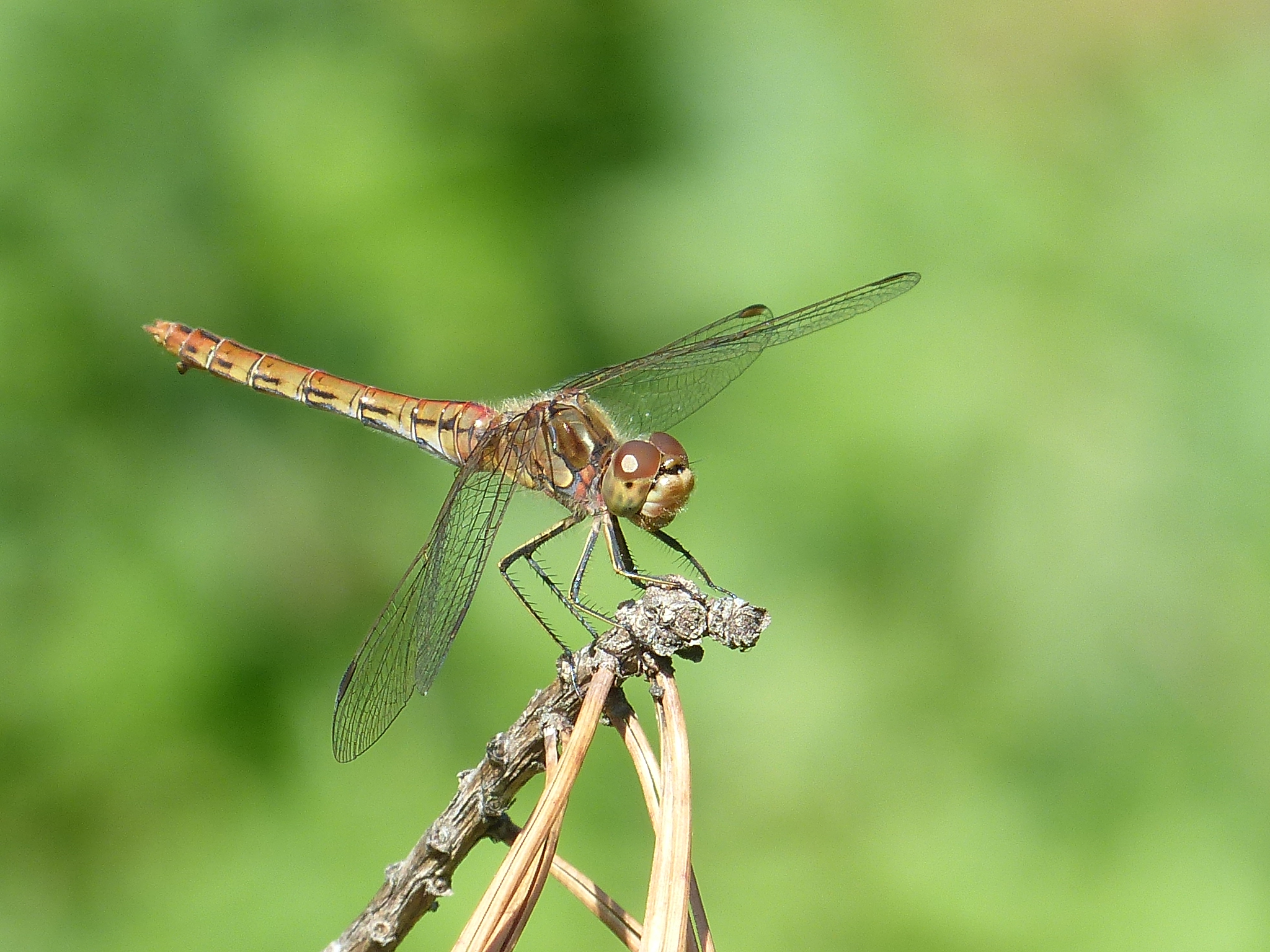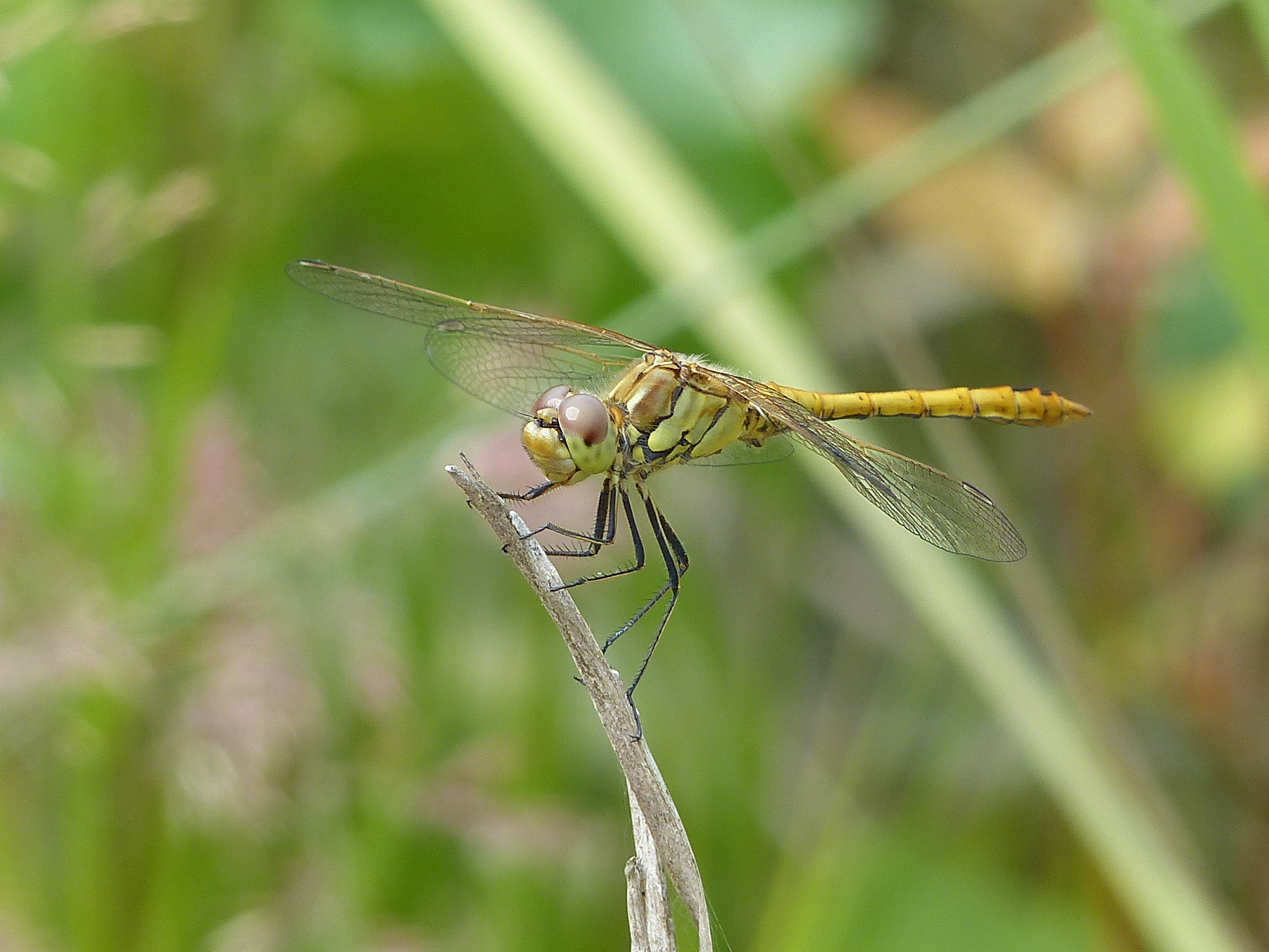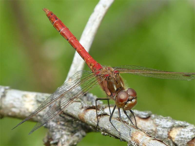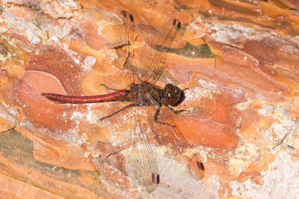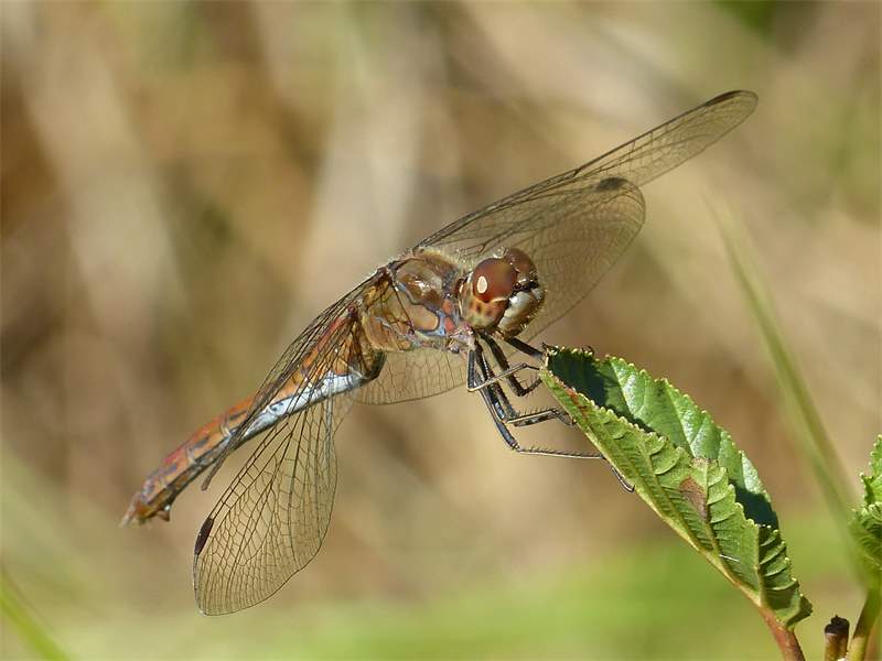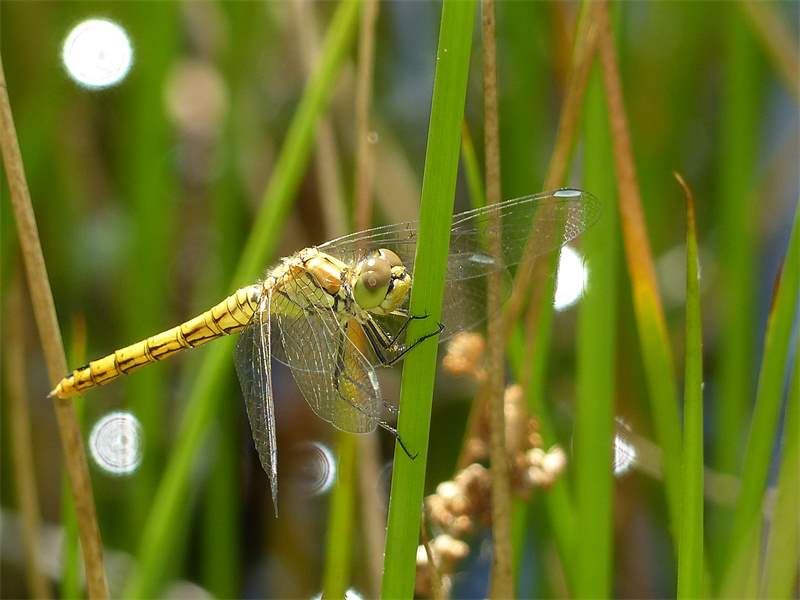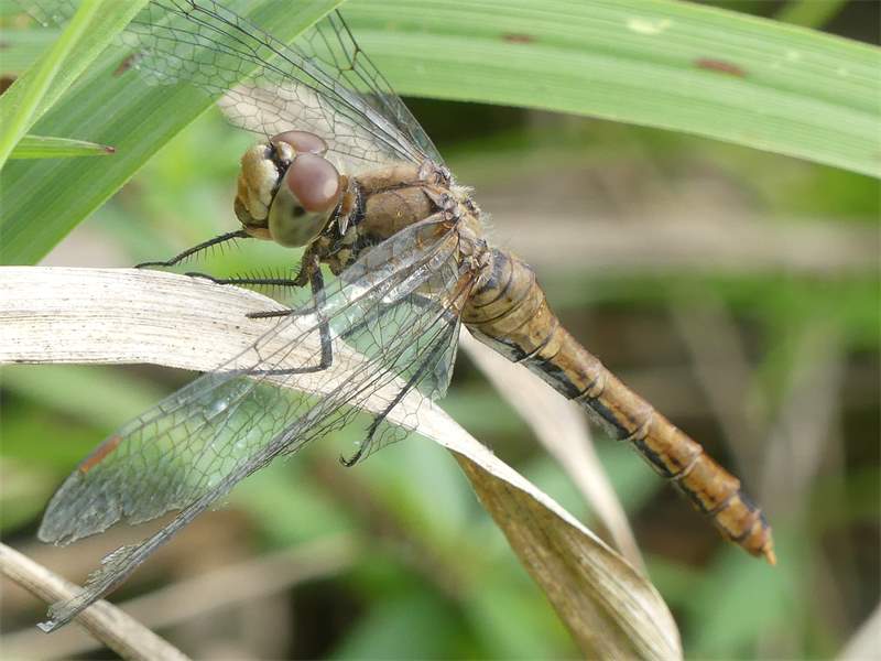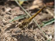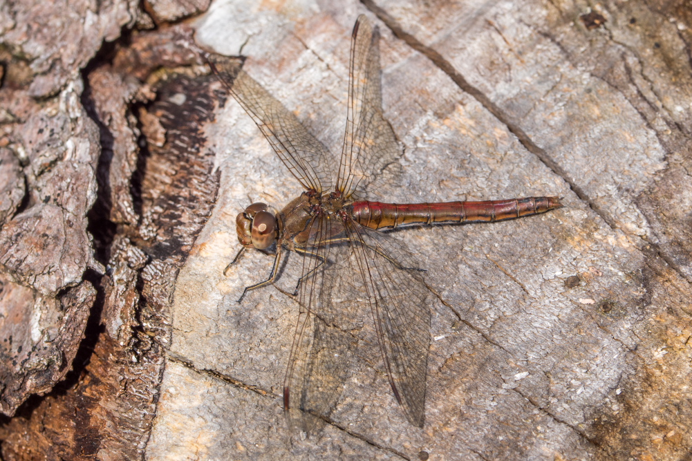 Gemeine Heidelibelle, Gemarkung Hohenprießnitz, Rieselgraben am Fichtbusch, altes Weibchen, Merkmale: gestreifte Beine, senkrecht abstehende Legescheide, August 2013