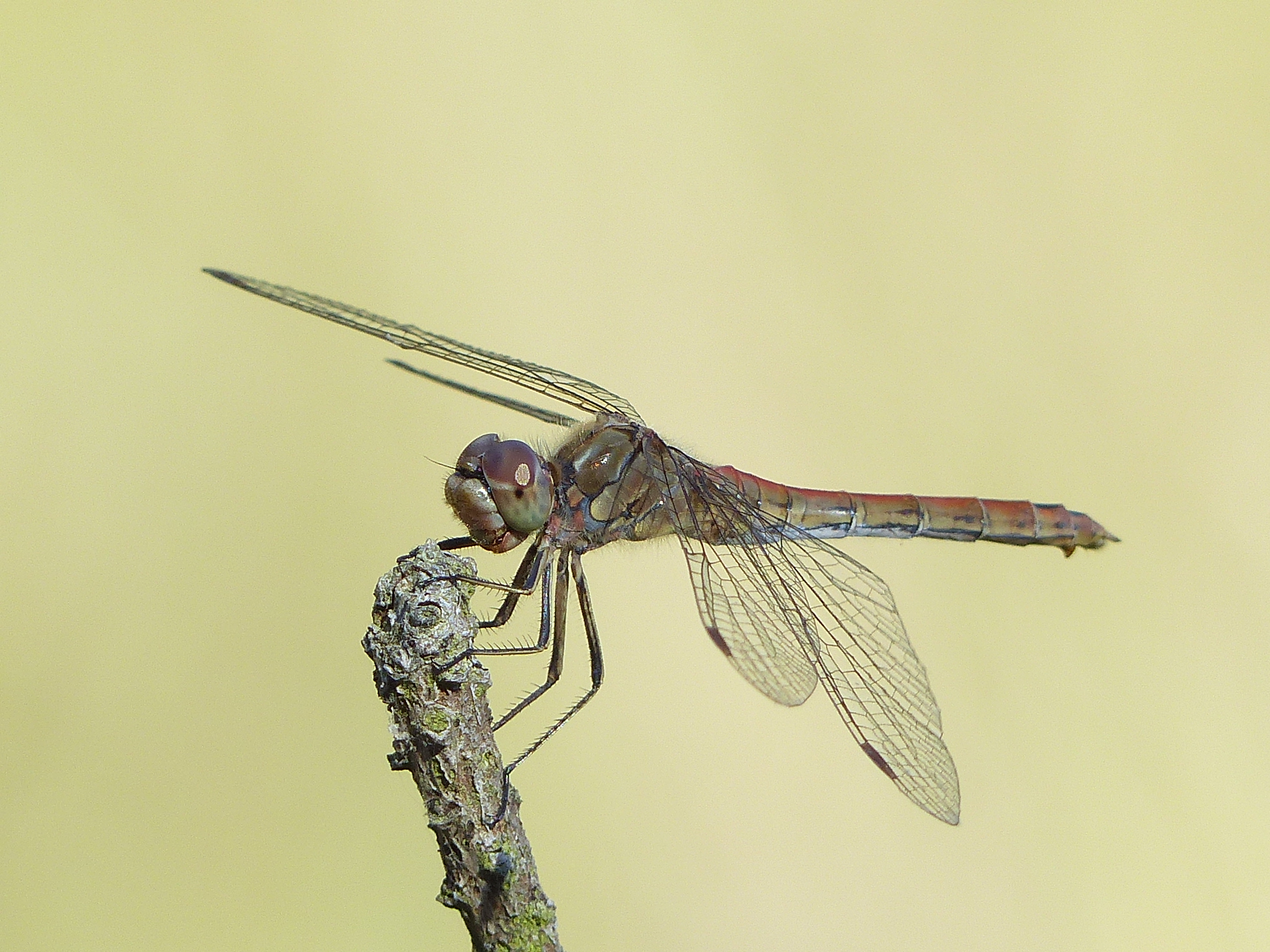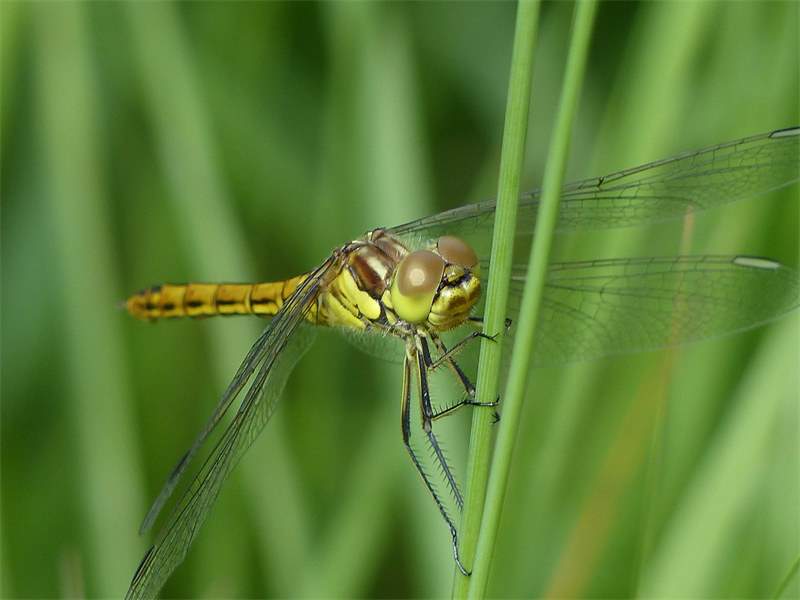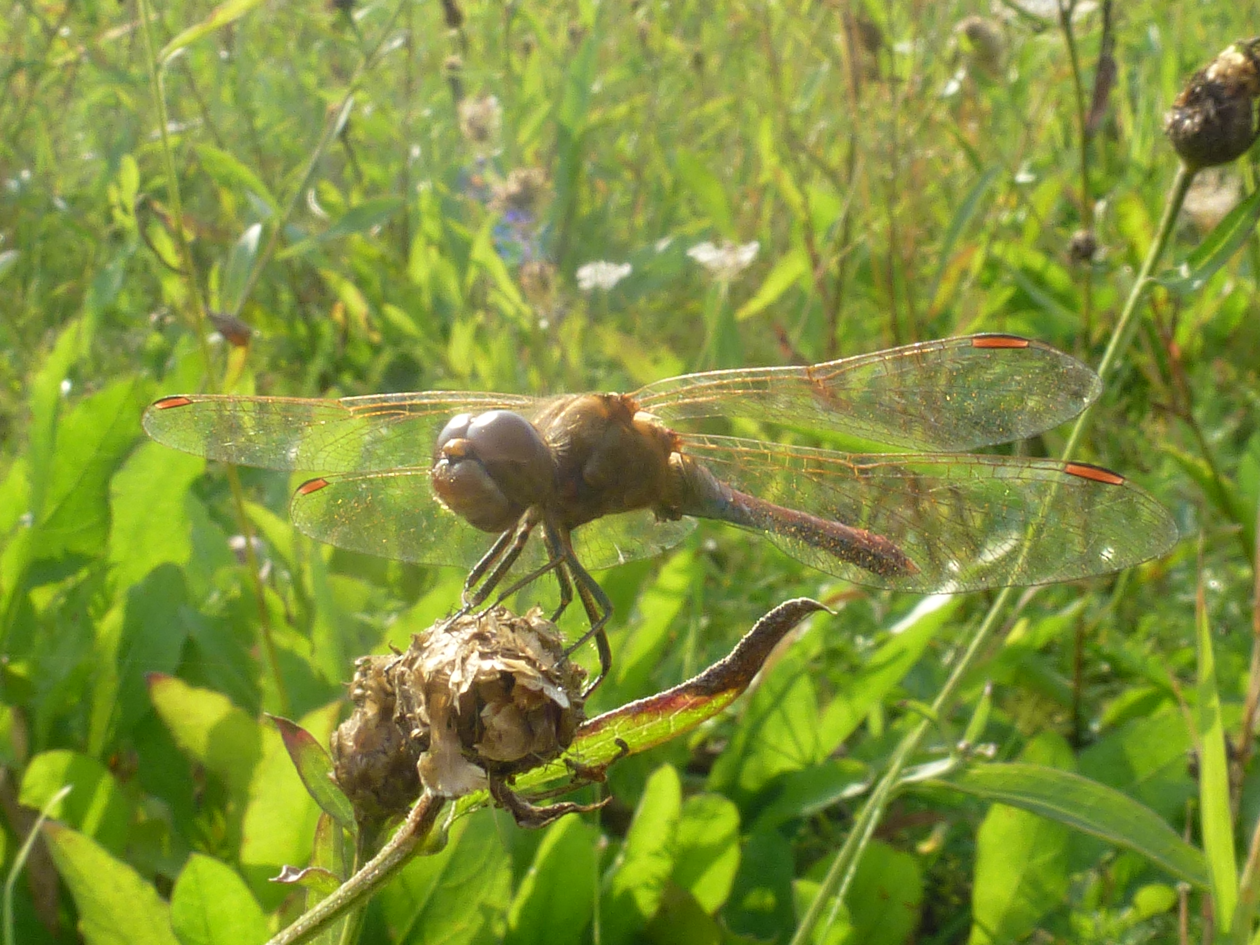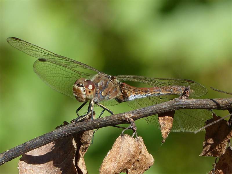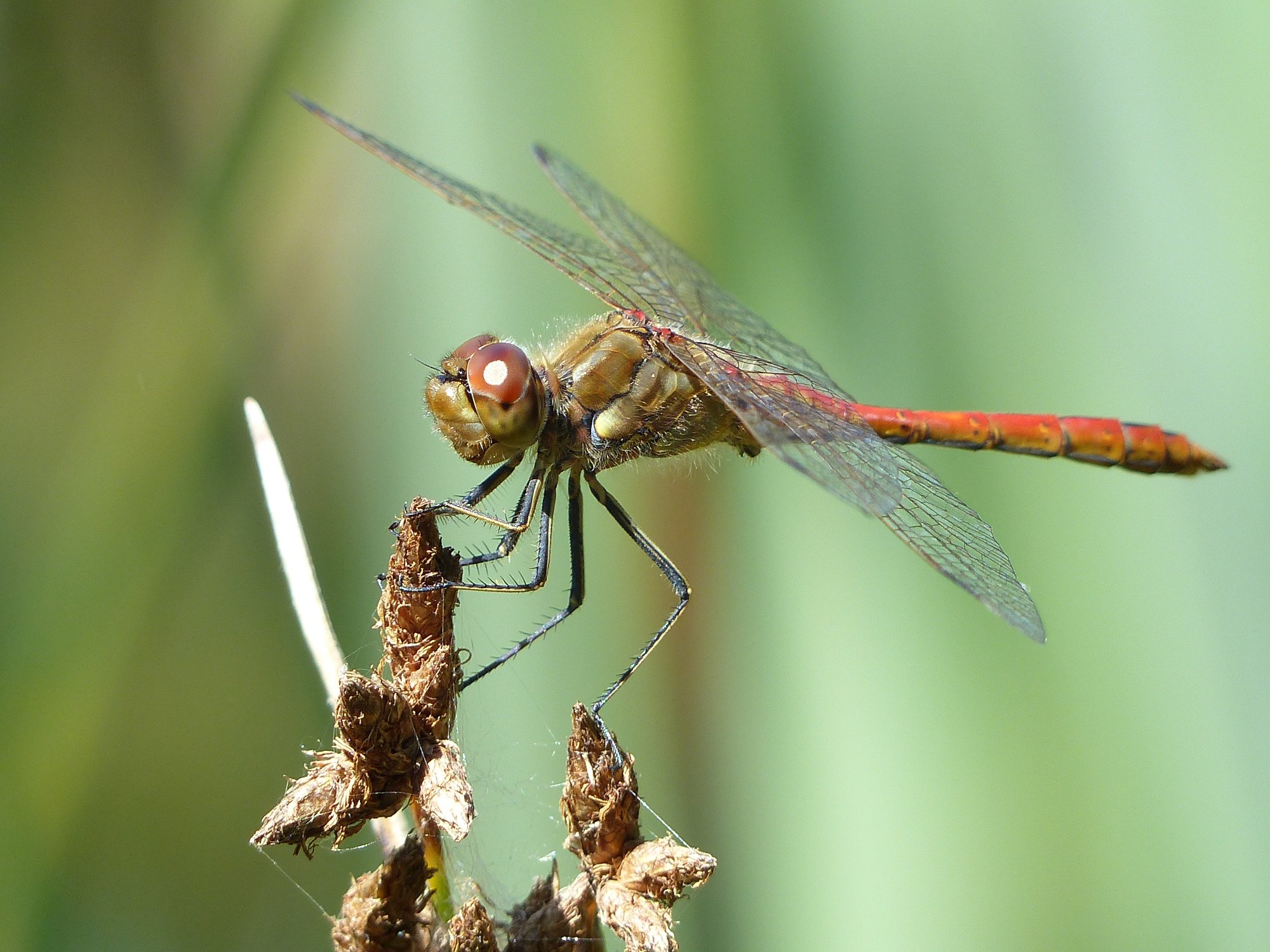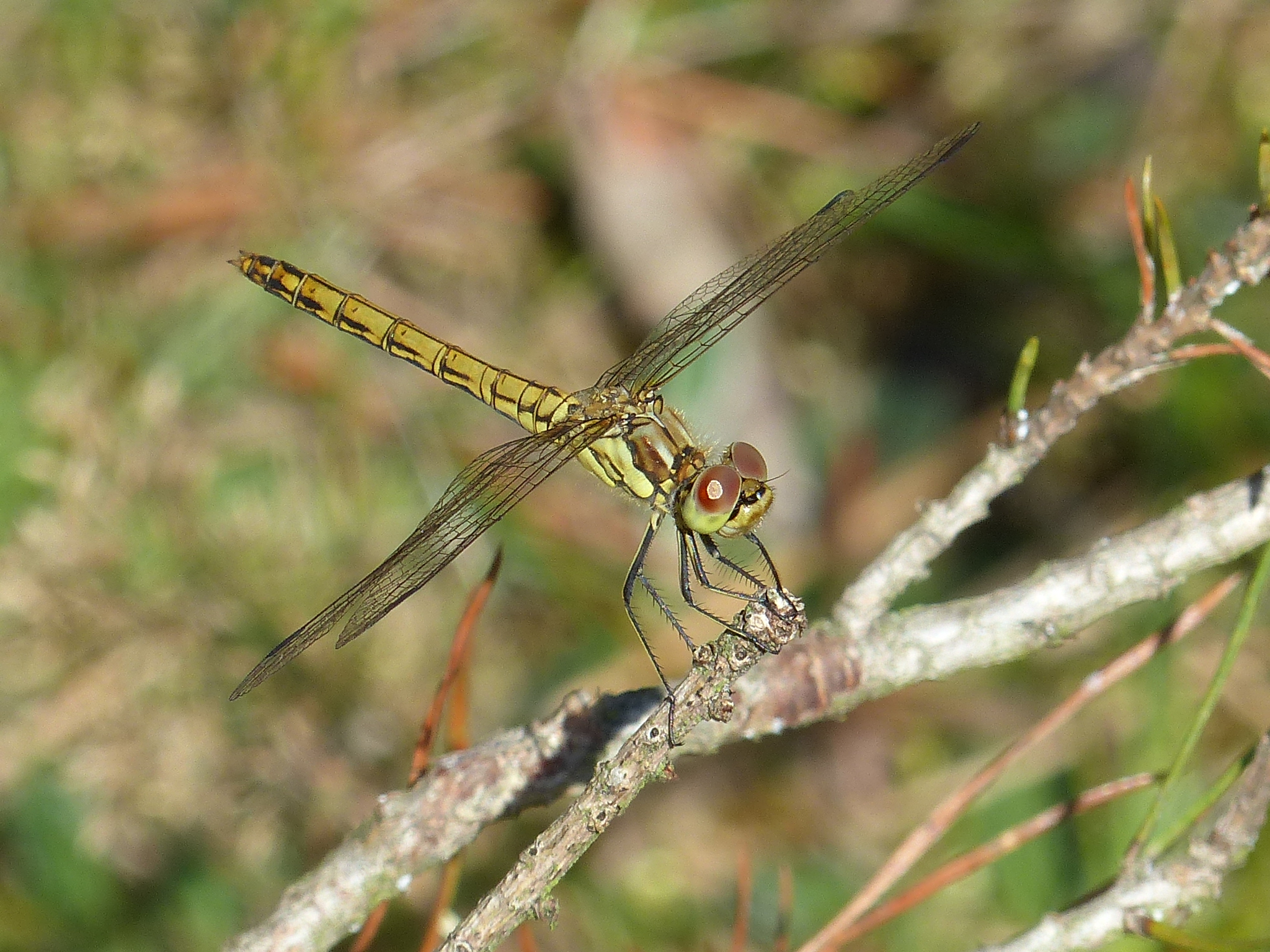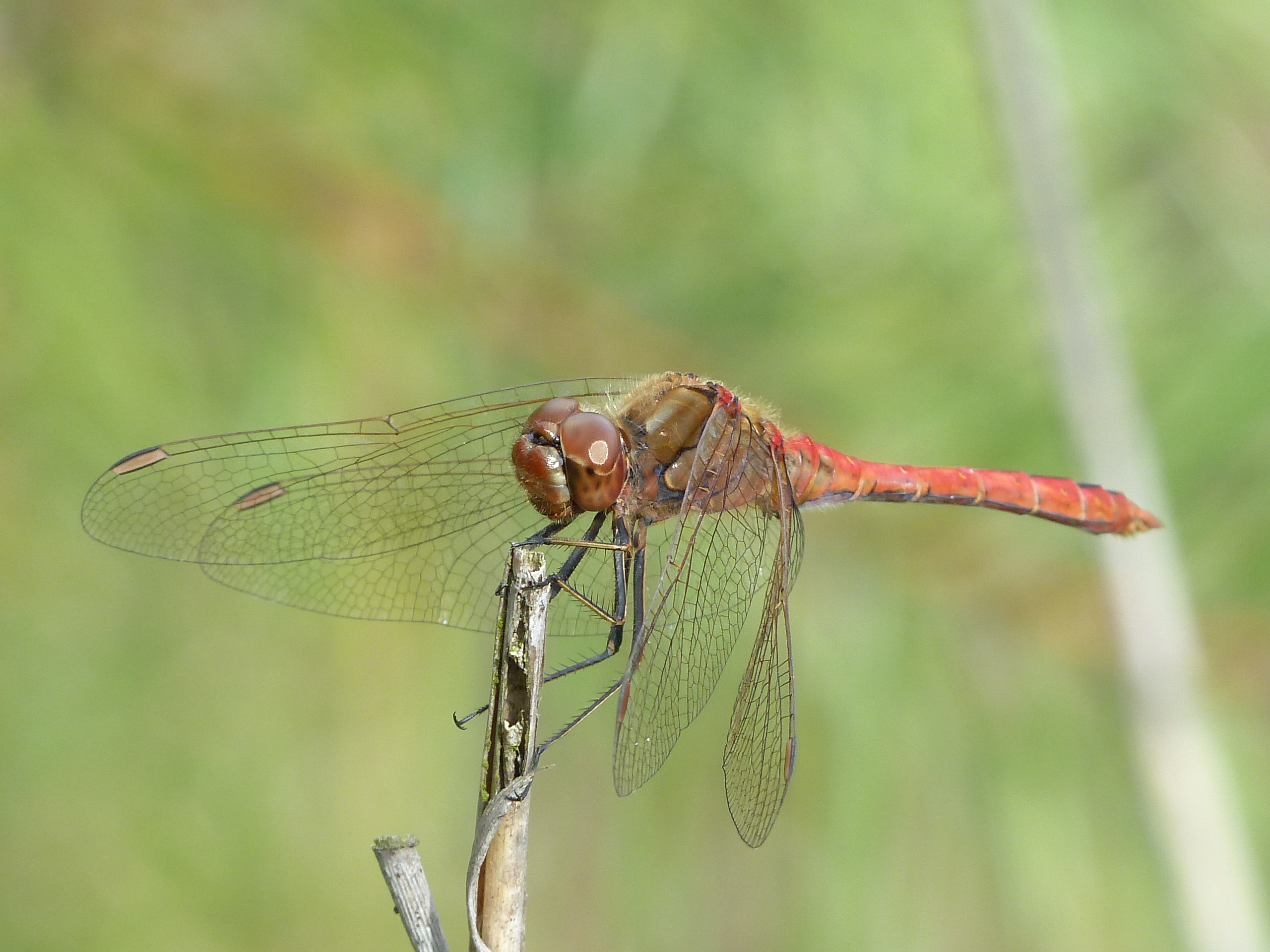 Gemeine Heidelibelle, Gemarkung Hohenprießnitz, Rieselgraben am Fichtbusch, altes Weibchen, Merkmale: gestreifte Beine, senkrecht abstehende Legescheide, August 2013