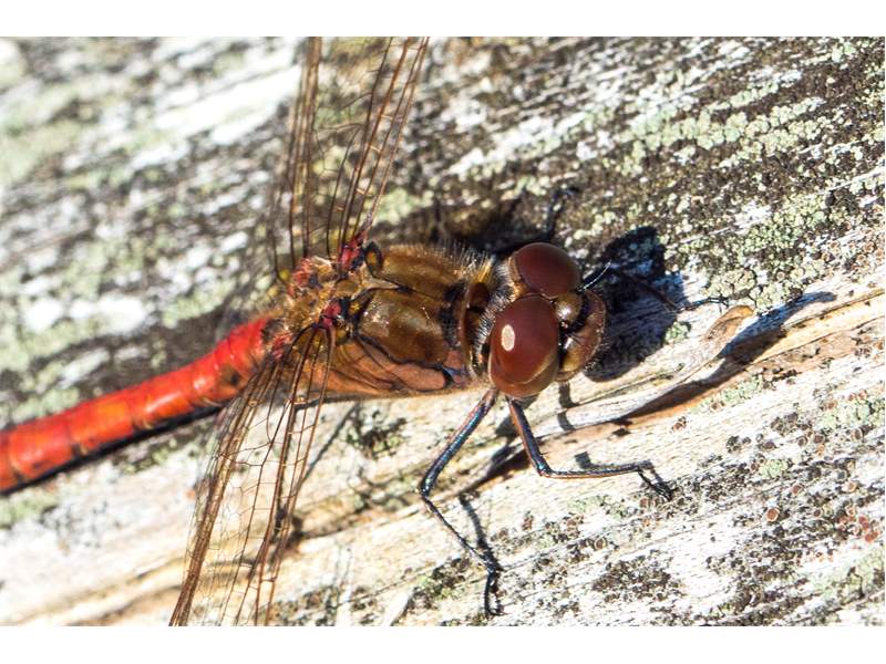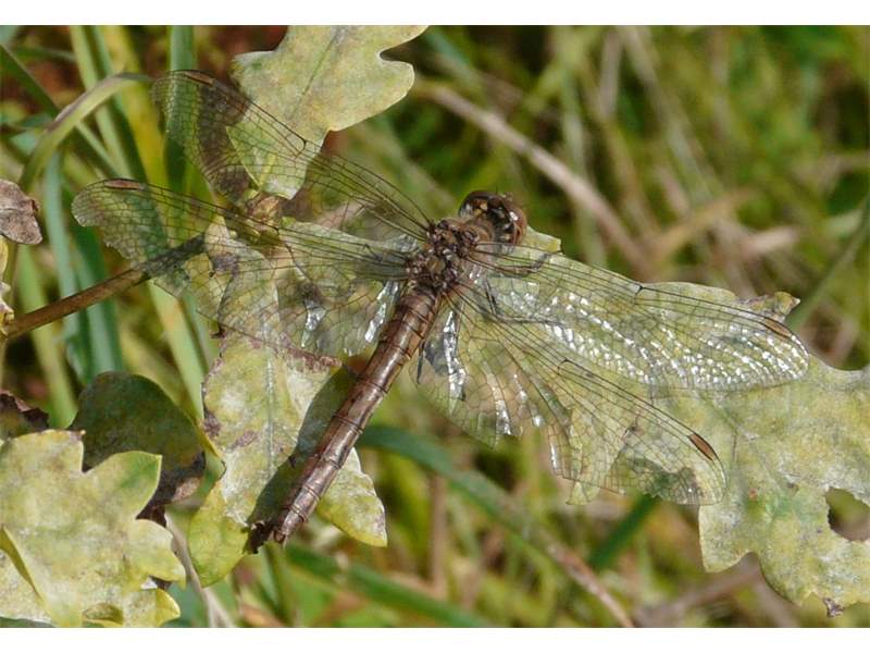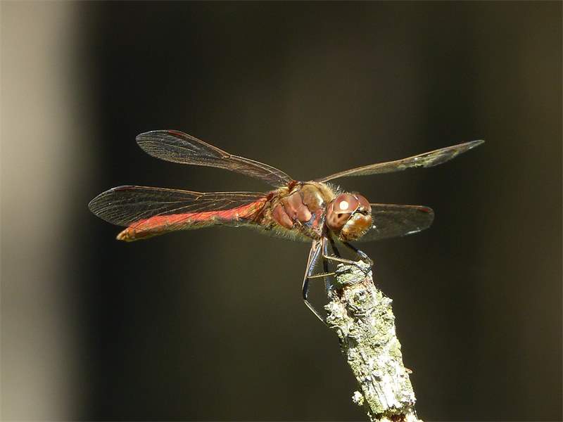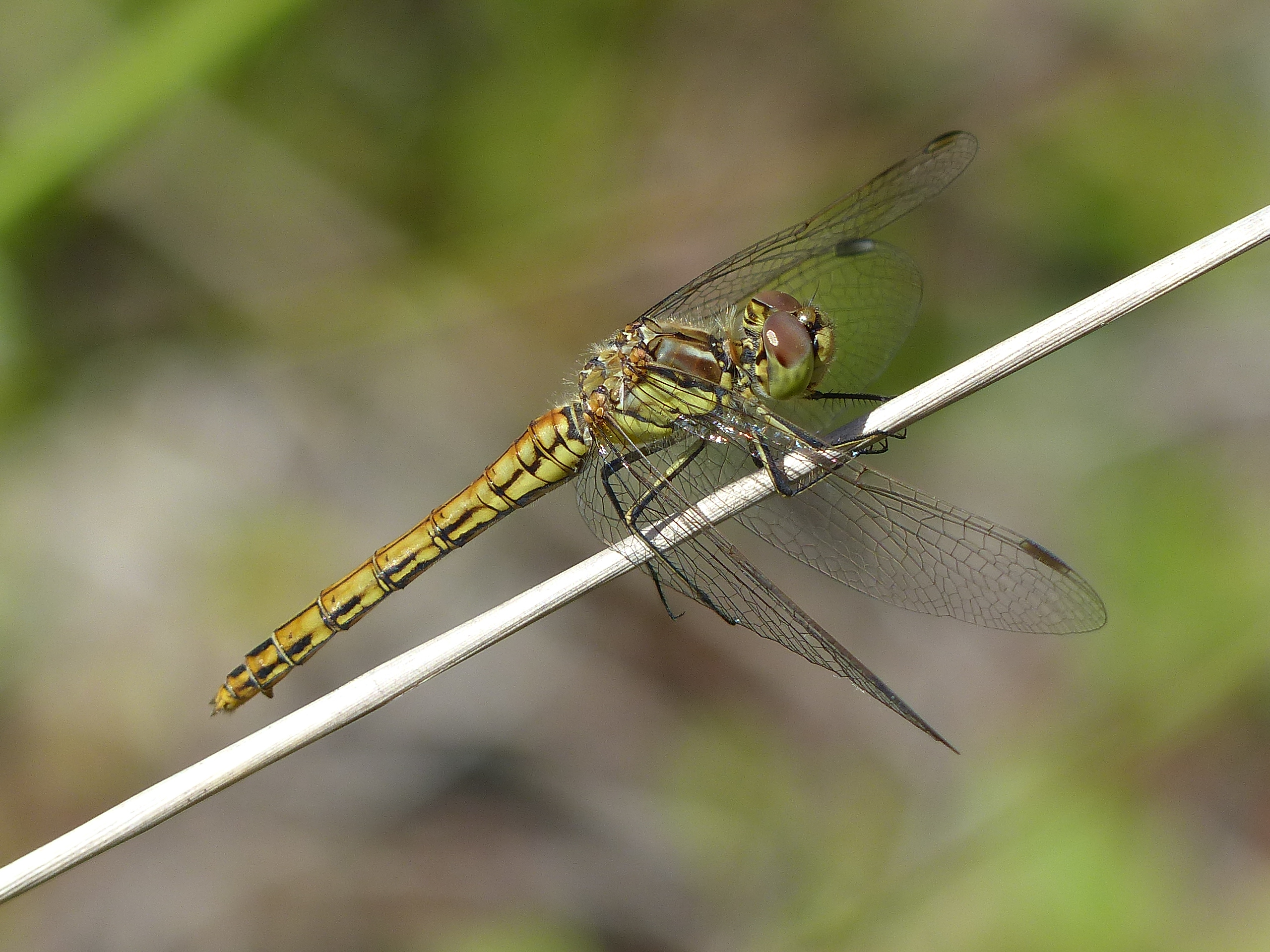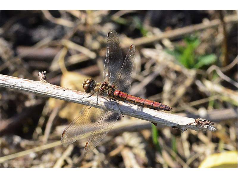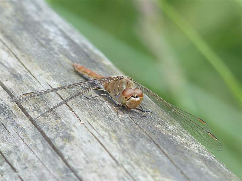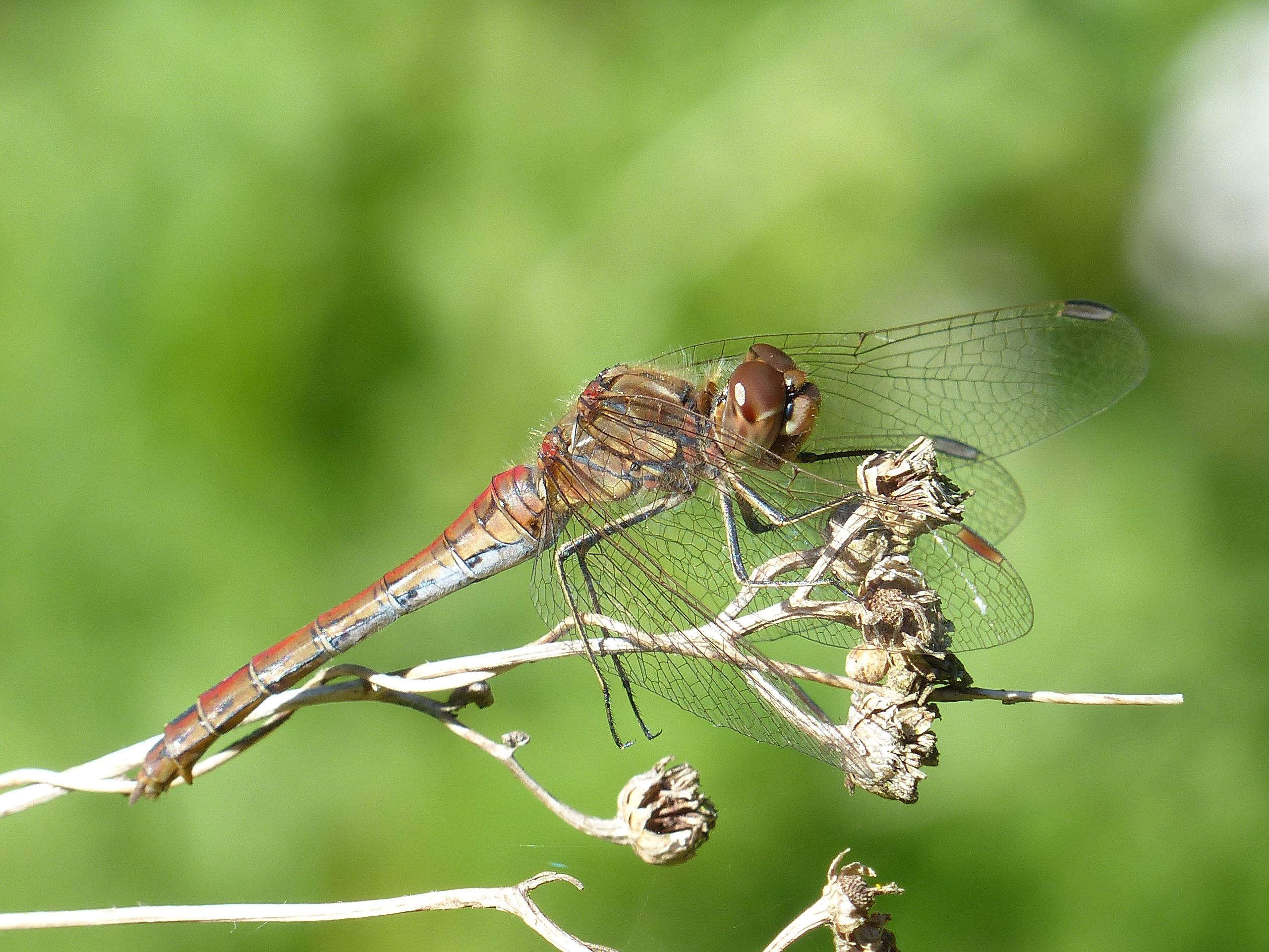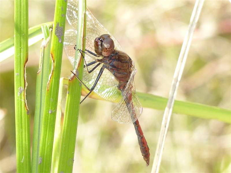 Gemeine Heidelibelle, Gemarkung Hohenprießnitz, Rieselgraben am Fichtbusch, altes Weibchen, Merkmale: gestreifte Beine, senkrecht abstehende Legescheide, August 2013