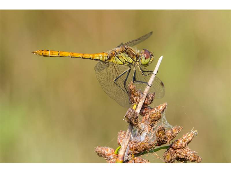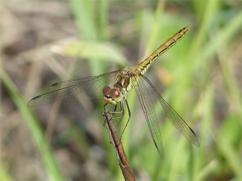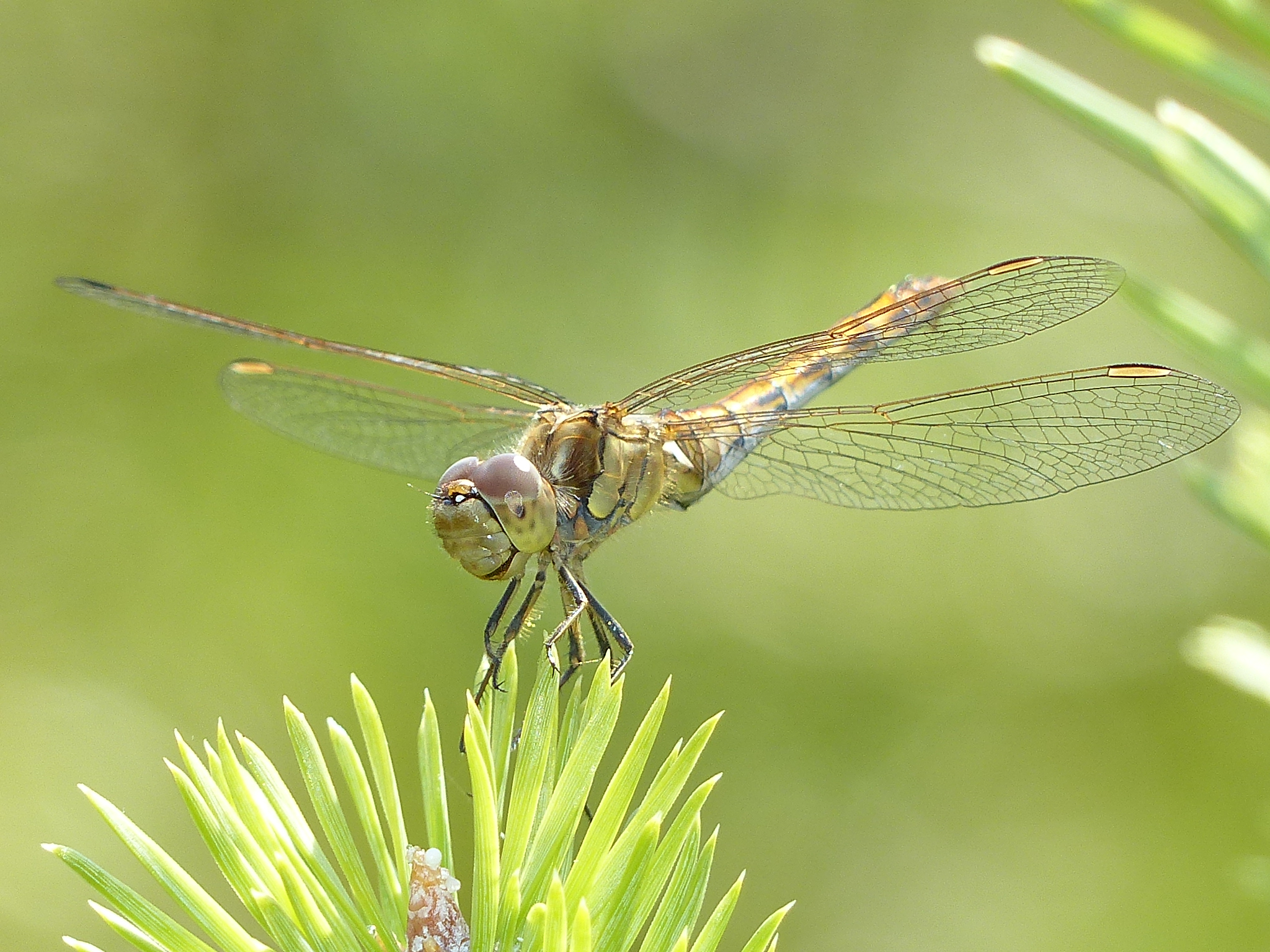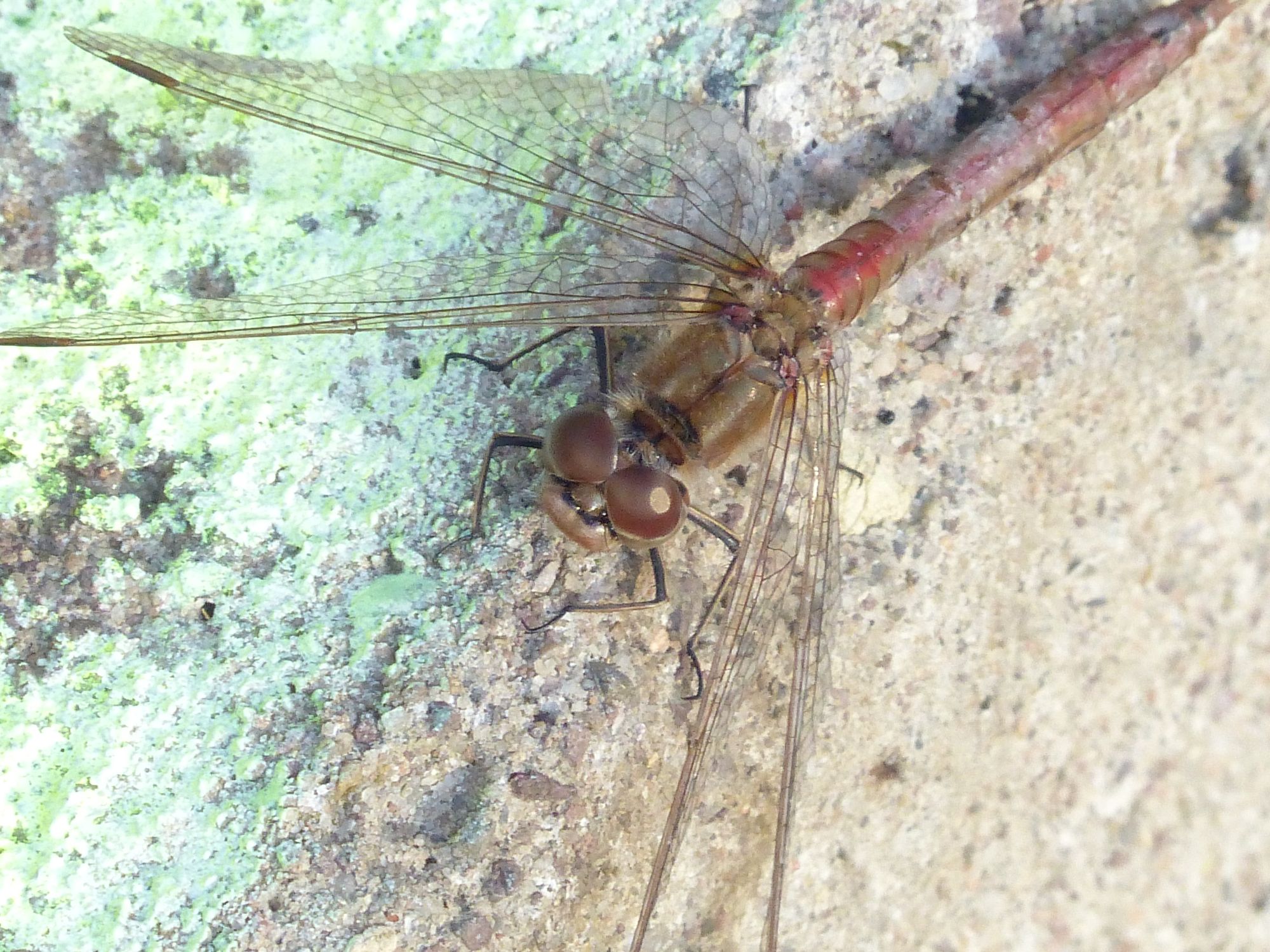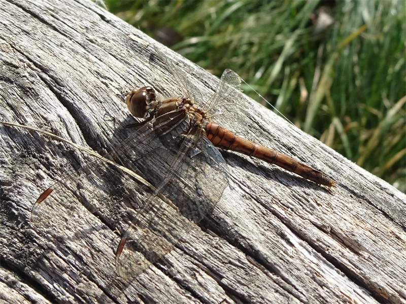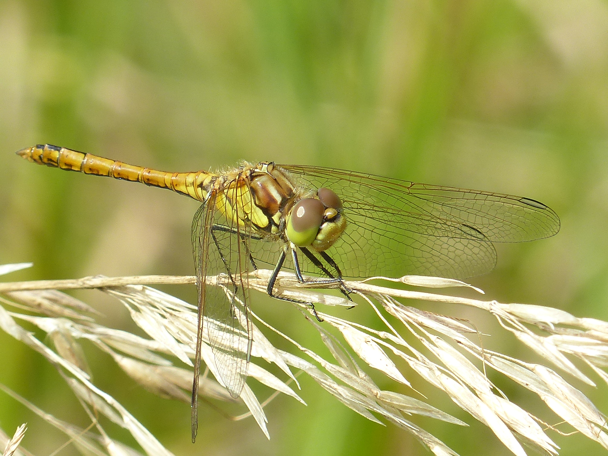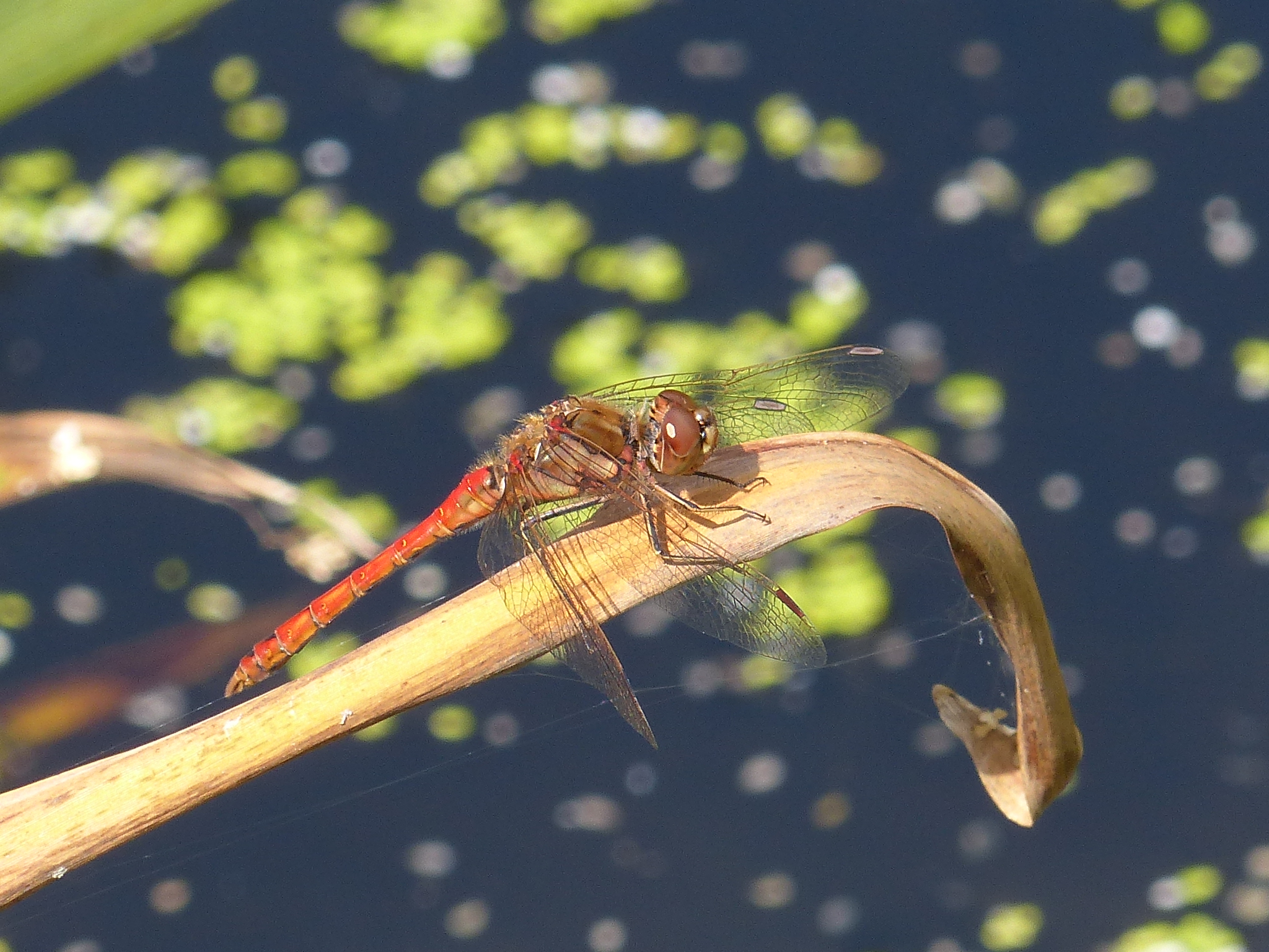 Gemeine Heidelibelle, Gemarkung Hohenprießnitz, Rieselgraben am Fichtbusch, altes Weibchen, Merkmale: gestreifte Beine, senkrecht abstehende Legescheide, August 2013