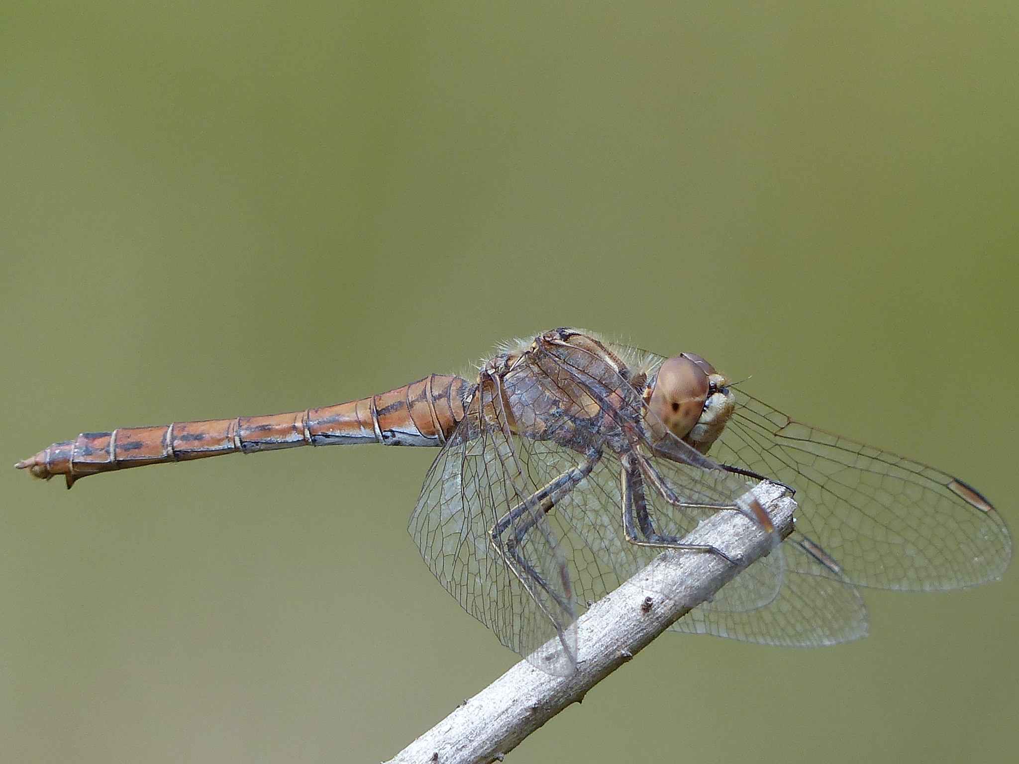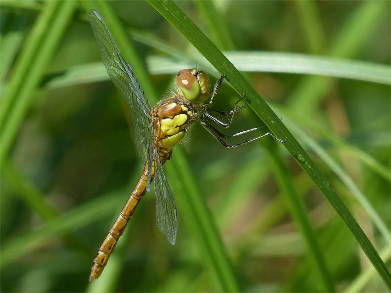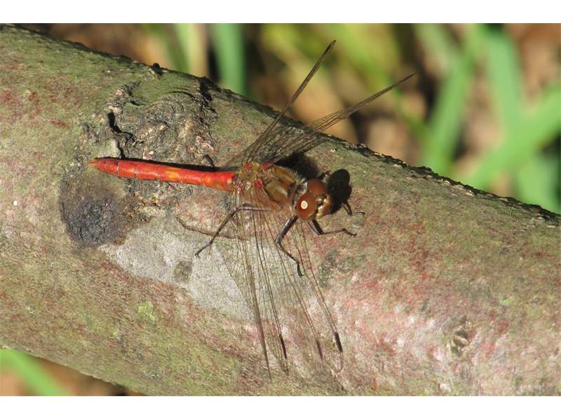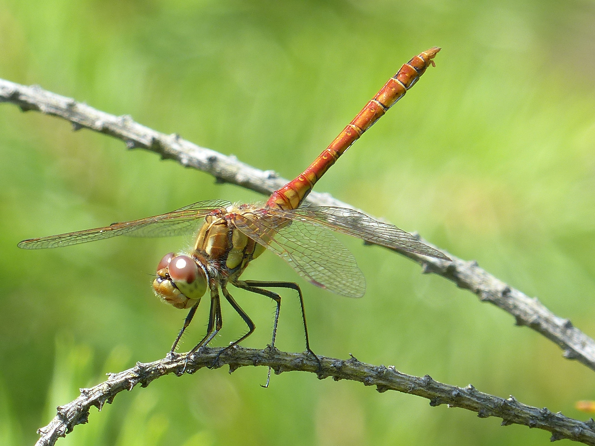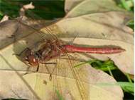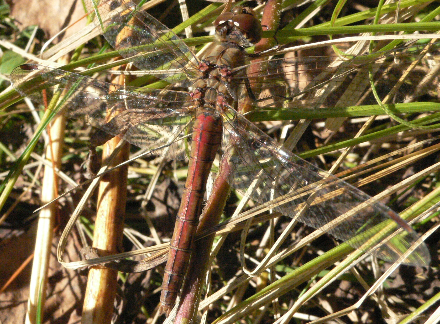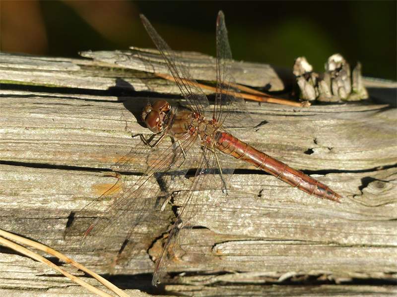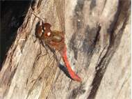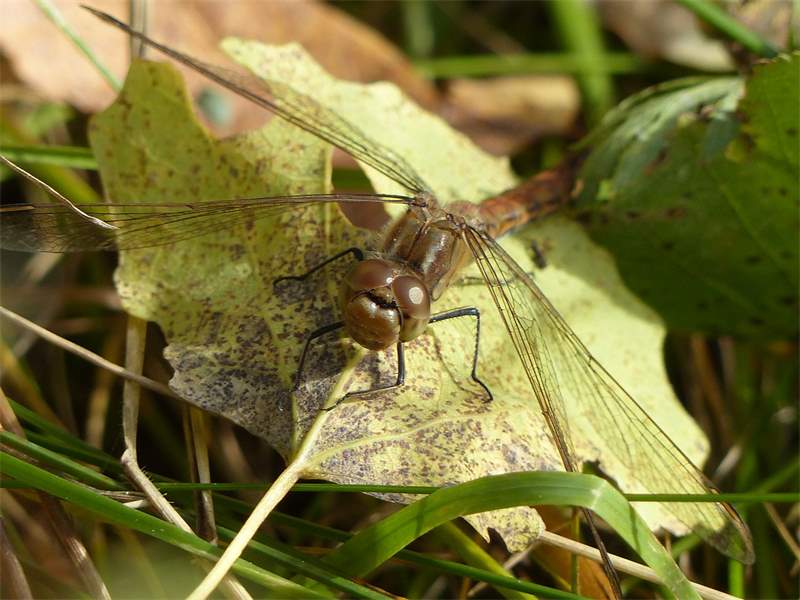 Gemeine Heidelibelle, Gemarkung Hohenprießnitz, Rieselgraben am Fichtbusch, altes Weibchen, Merkmale: gestreifte Beine, senkrecht abstehende Legescheide, August 2013