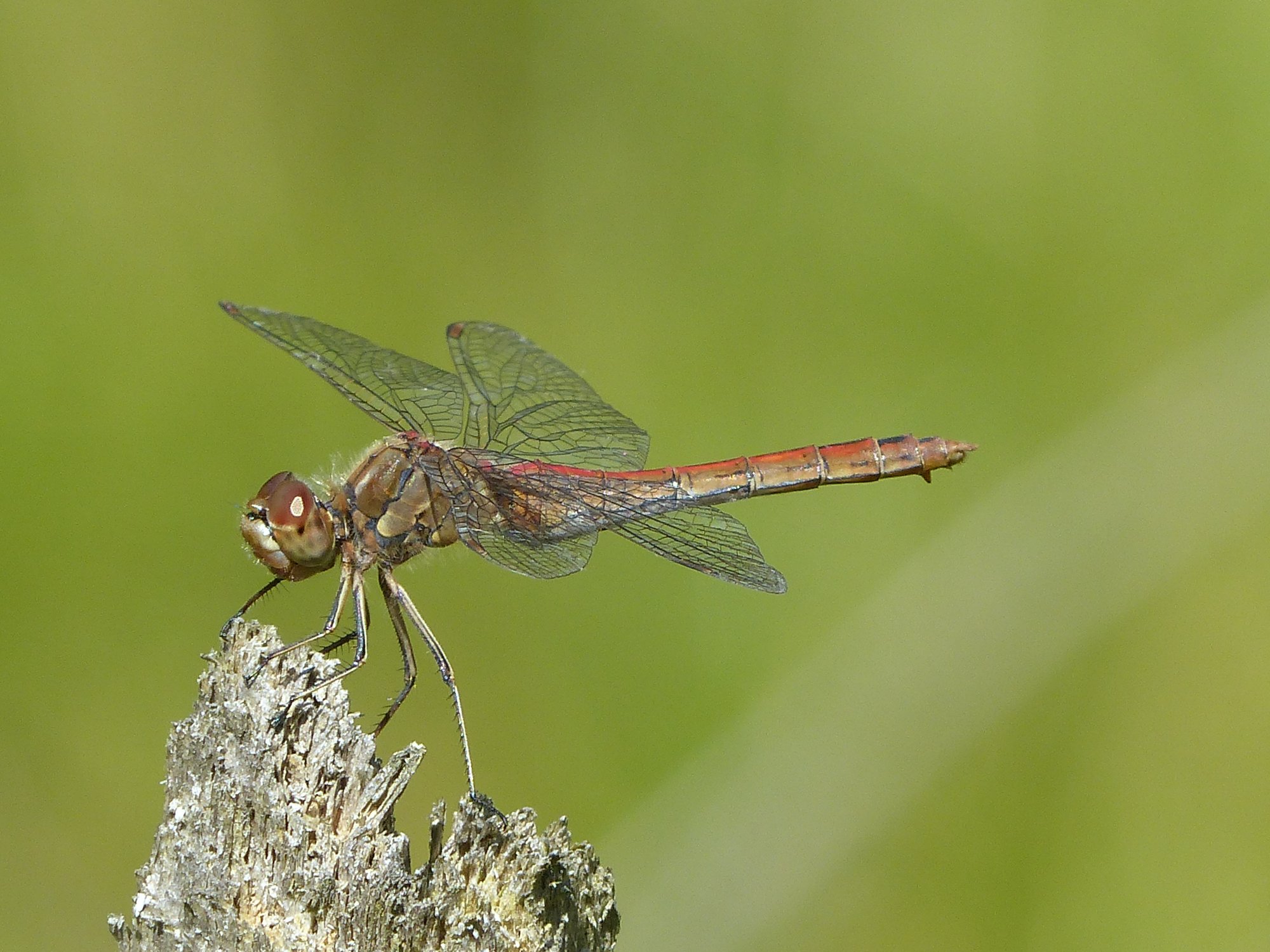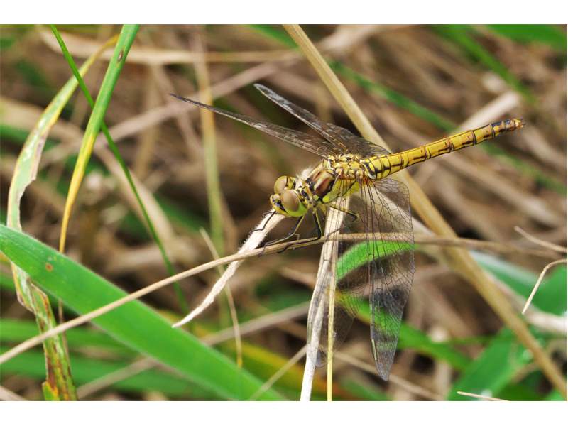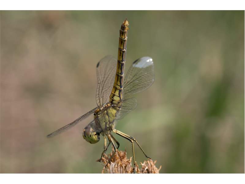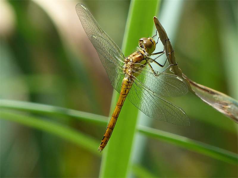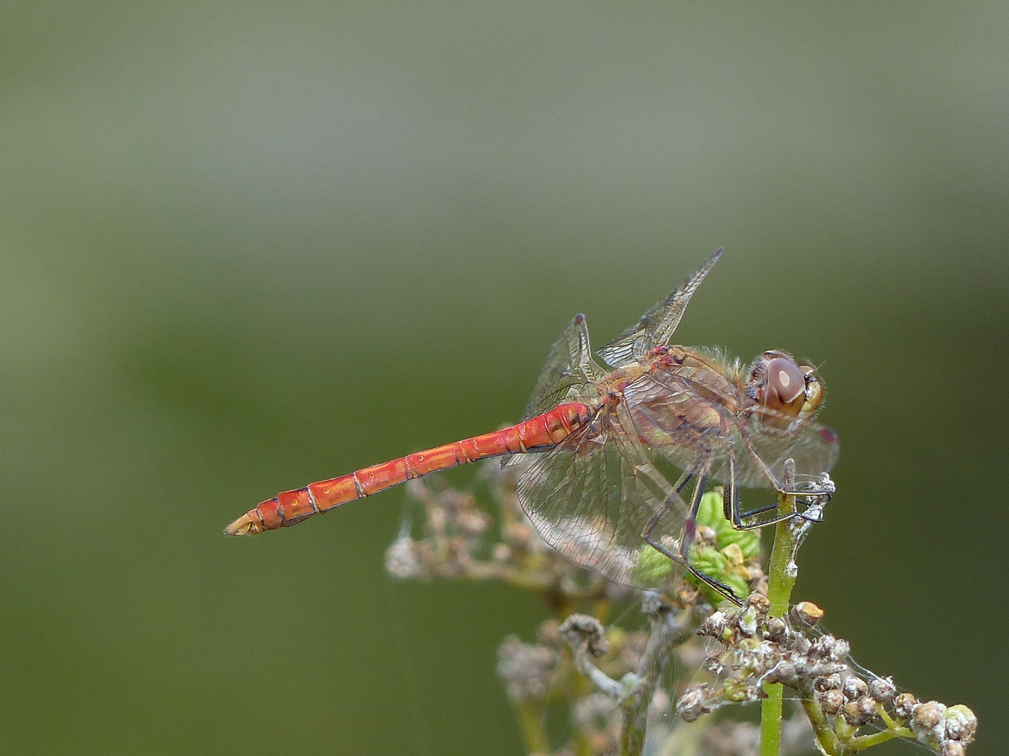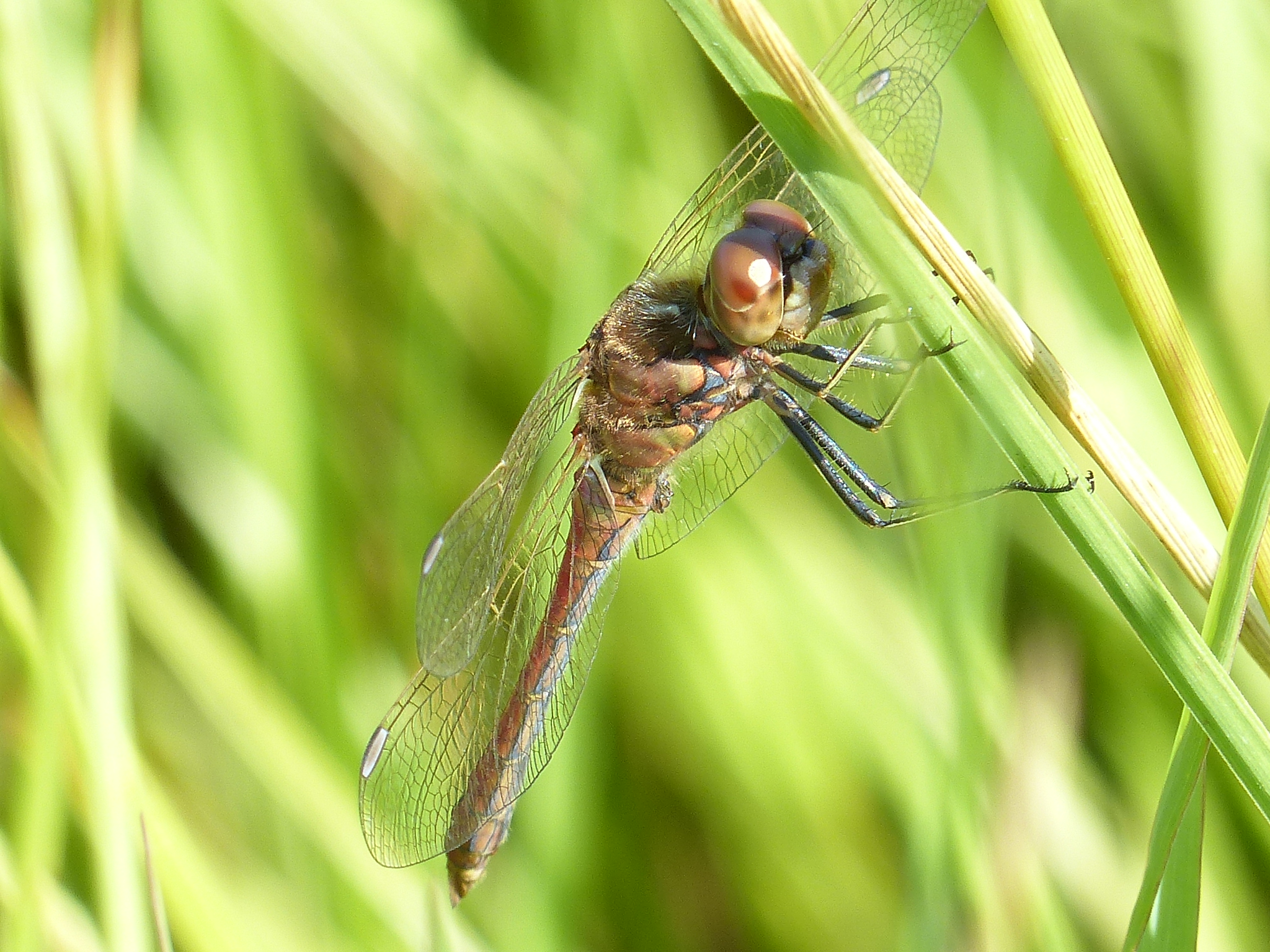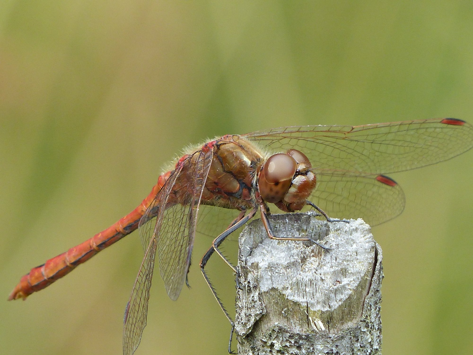 Gemeine Heidelibelle, Gemarkung Hohenprießnitz, Rieselgraben am Fichtbusch, altes Weibchen, Merkmale: gestreifte Beine, senkrecht abstehende Legescheide, August 2013