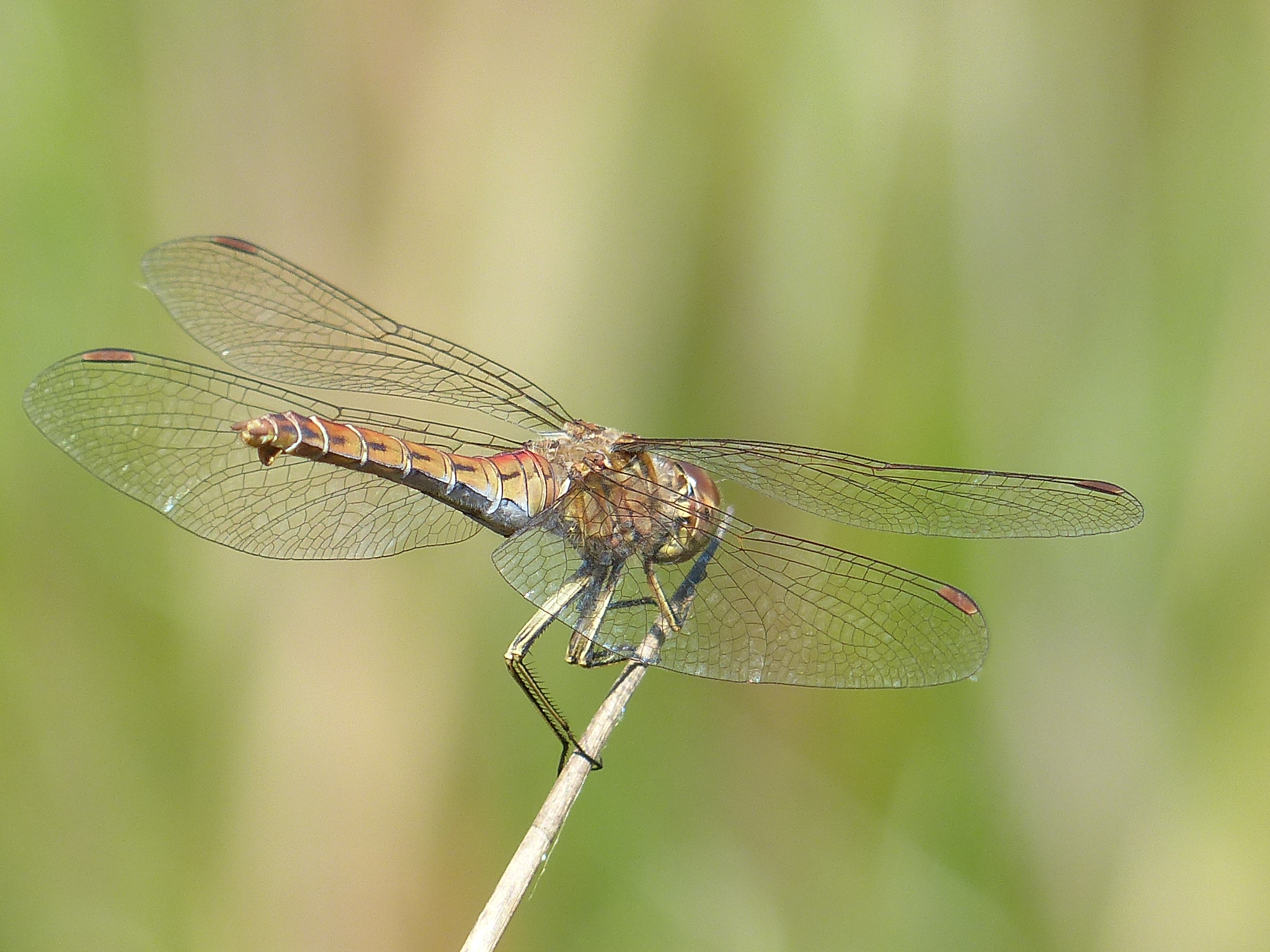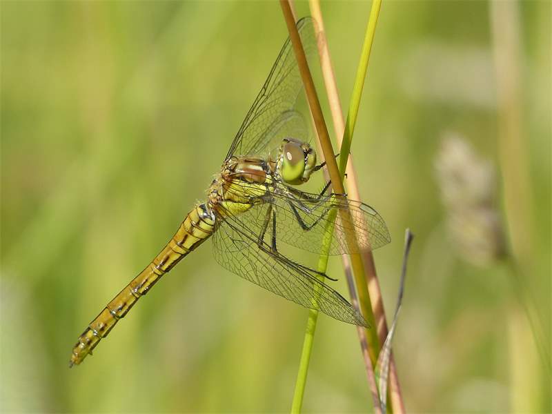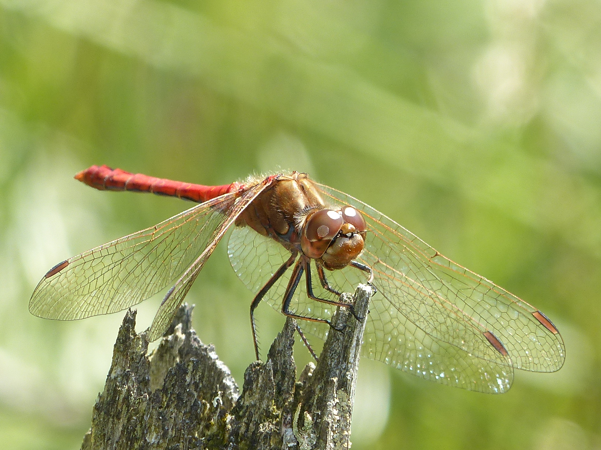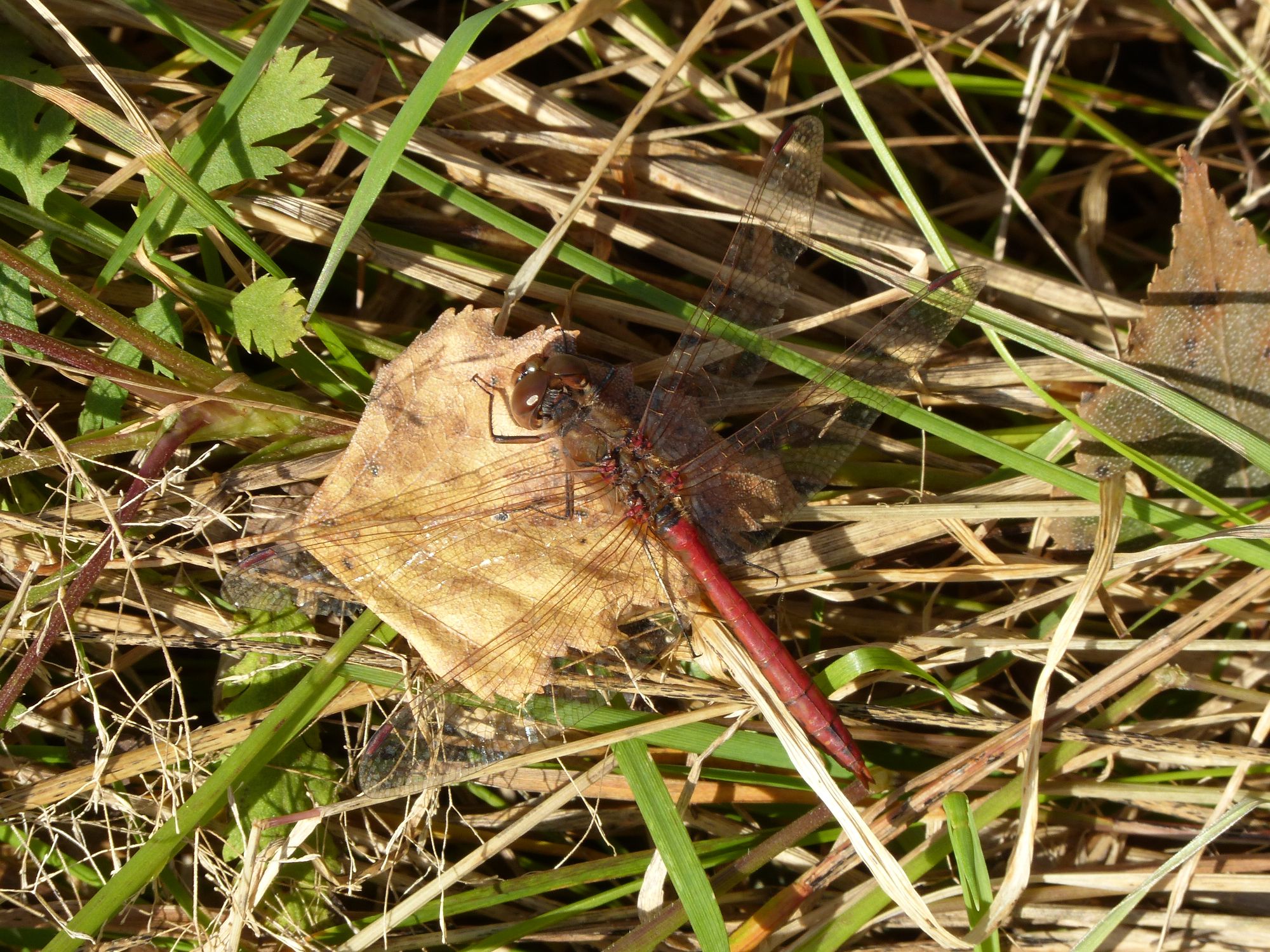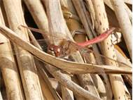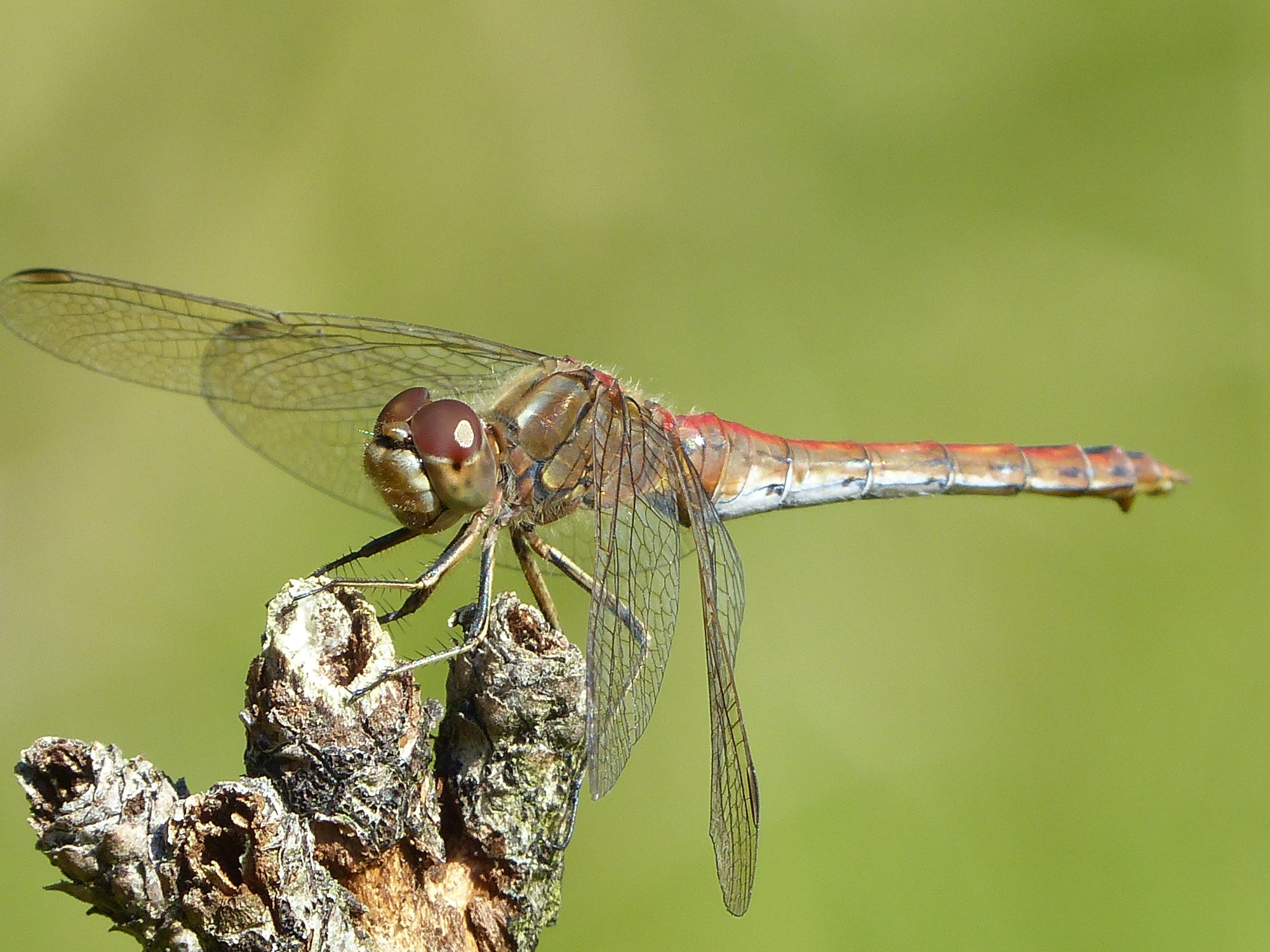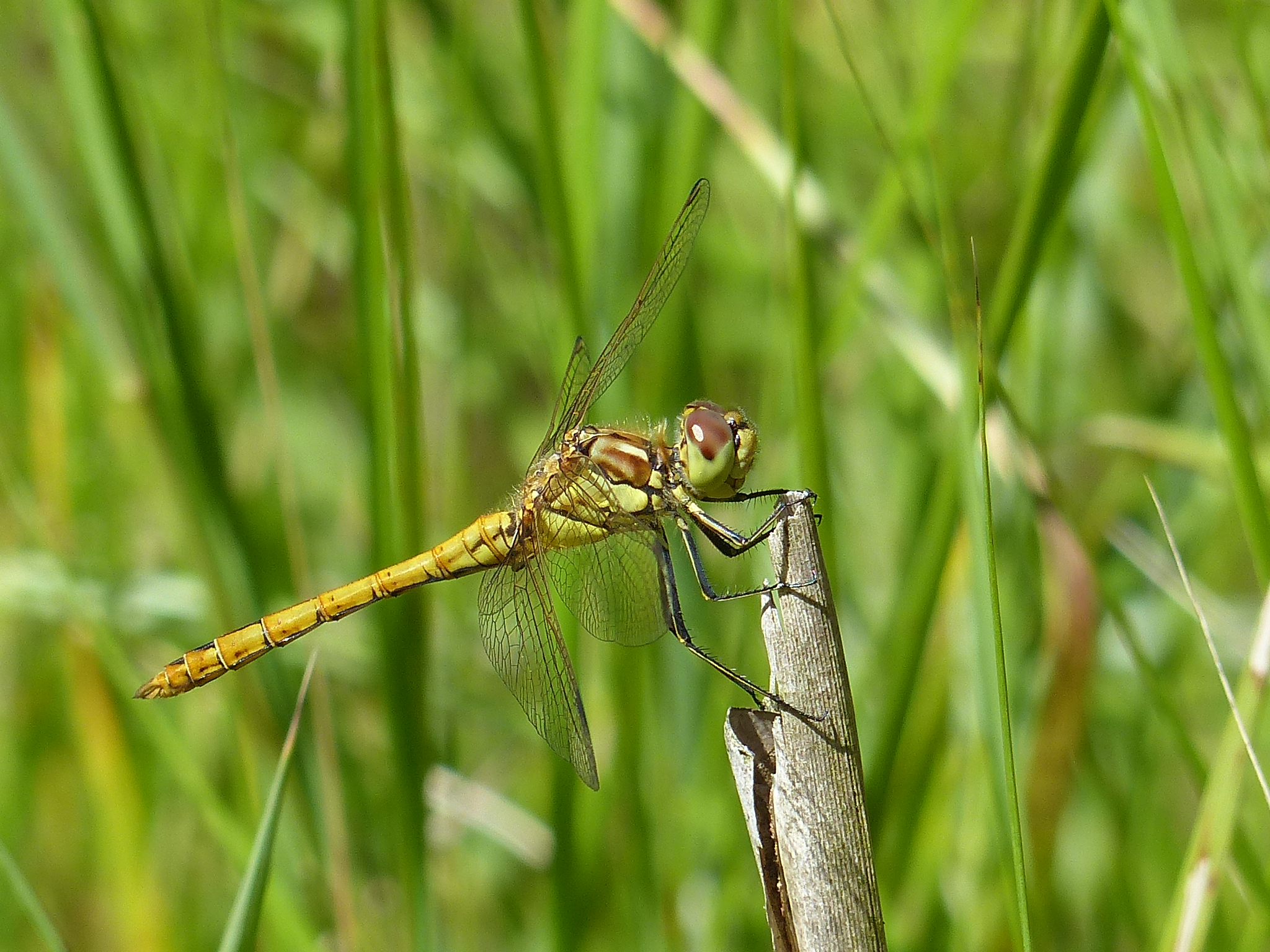 Gemeine Heidelibelle, Gemarkung Hohenprießnitz, Rieselgraben am Fichtbusch, altes Weibchen, Merkmale: gestreifte Beine, senkrecht abstehende Legescheide, August 2013