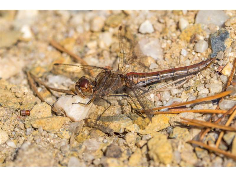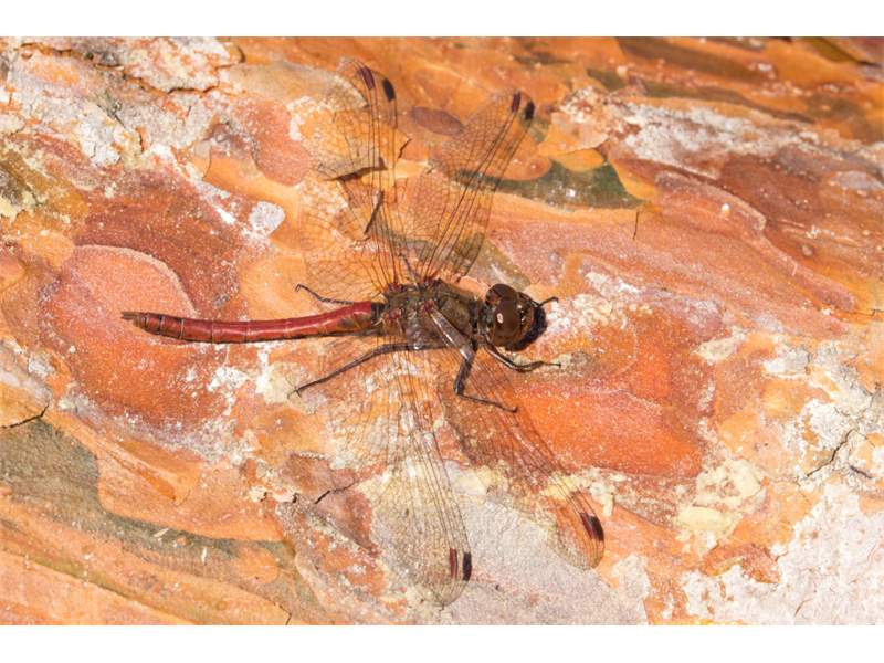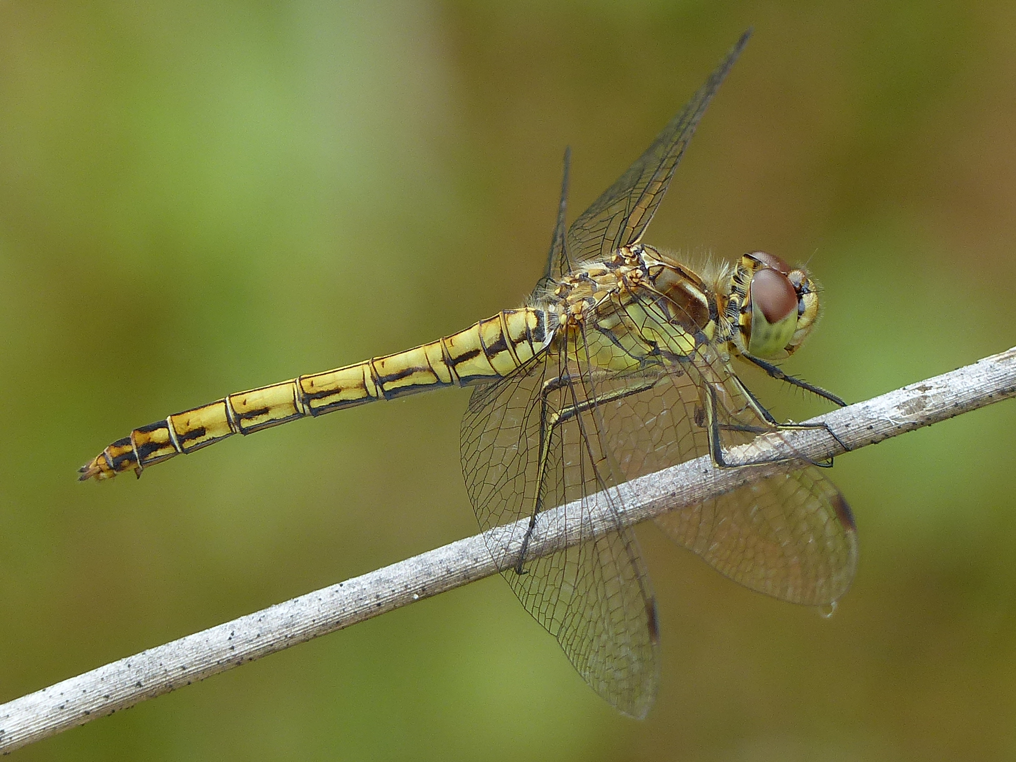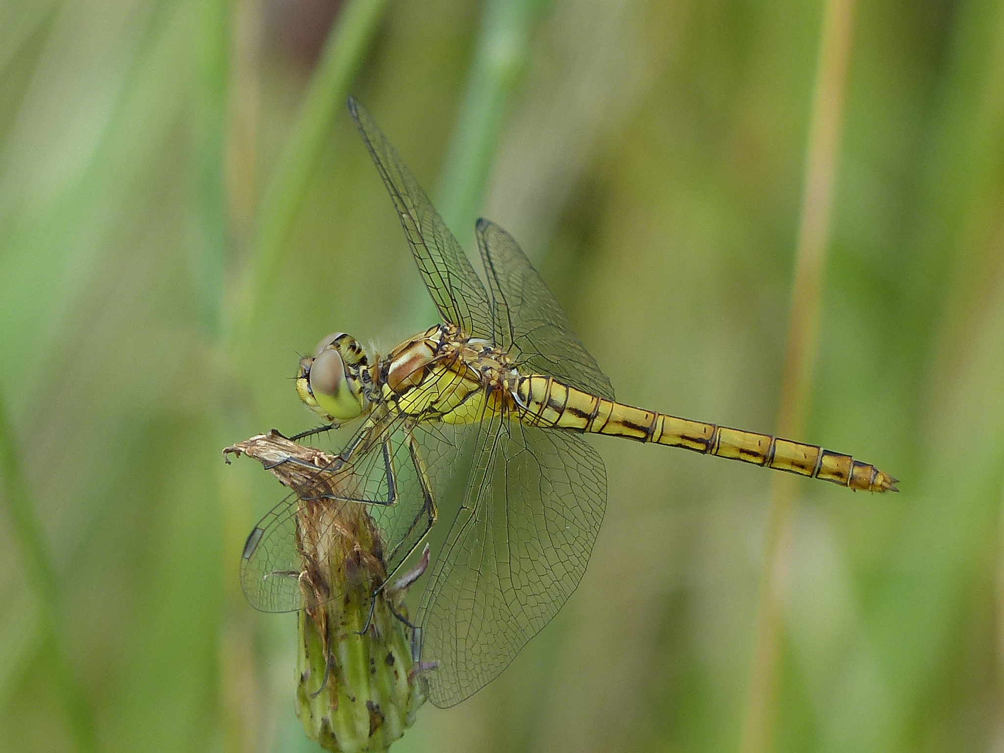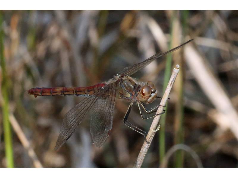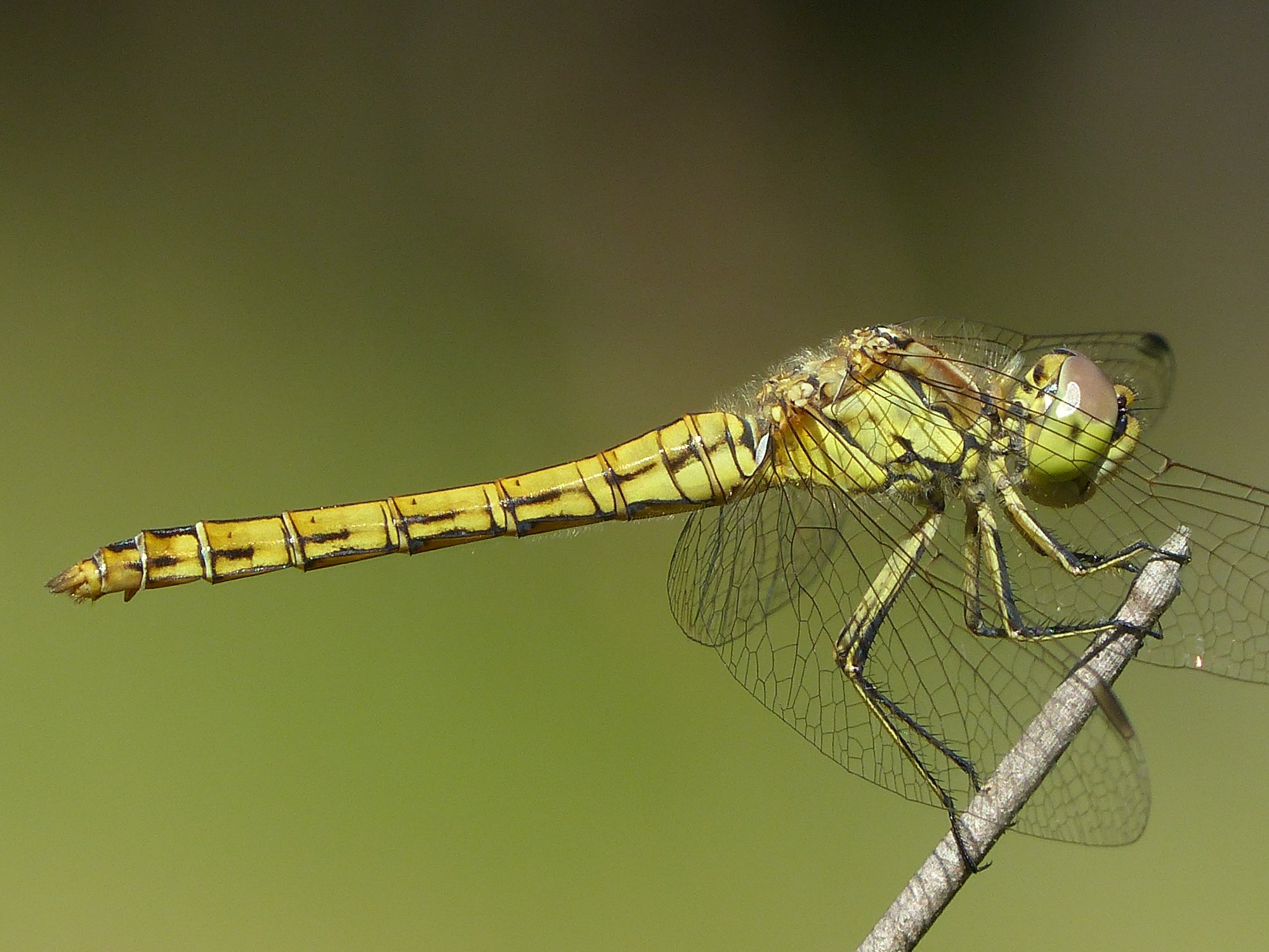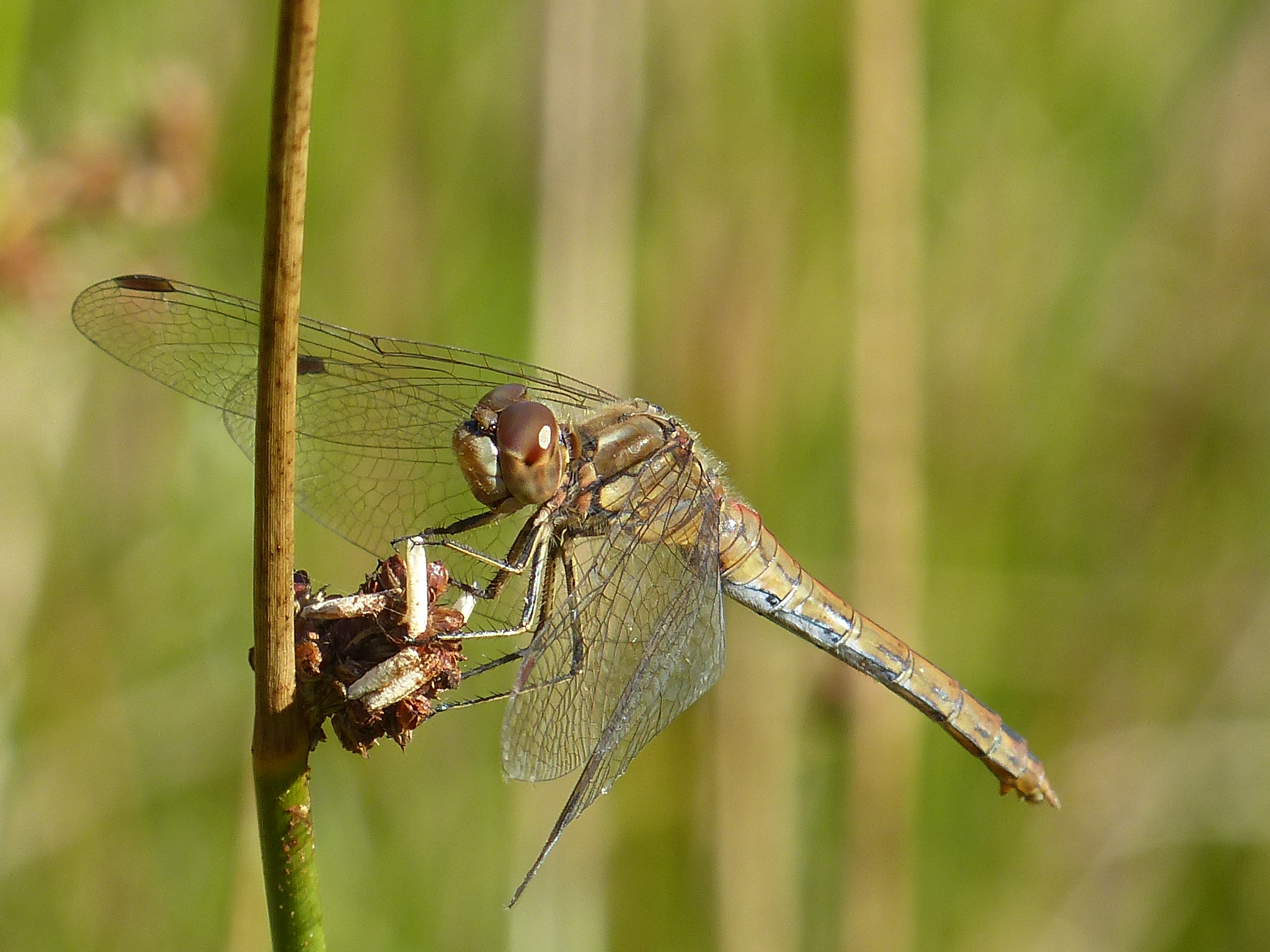 Gemeine Heidelibelle, Gemarkung Hohenprießnitz, Rieselgraben am Fichtbusch, altes Weibchen, Merkmale: gestreifte Beine, senkrecht abstehende Legescheide, August 2013