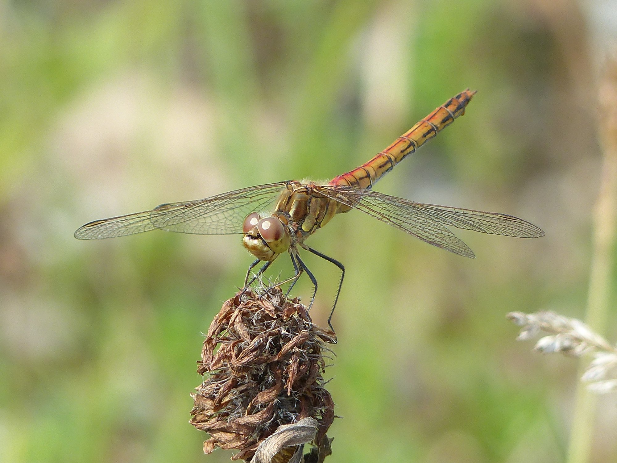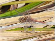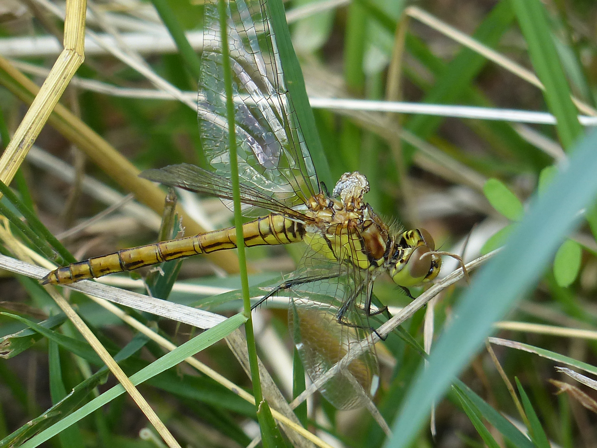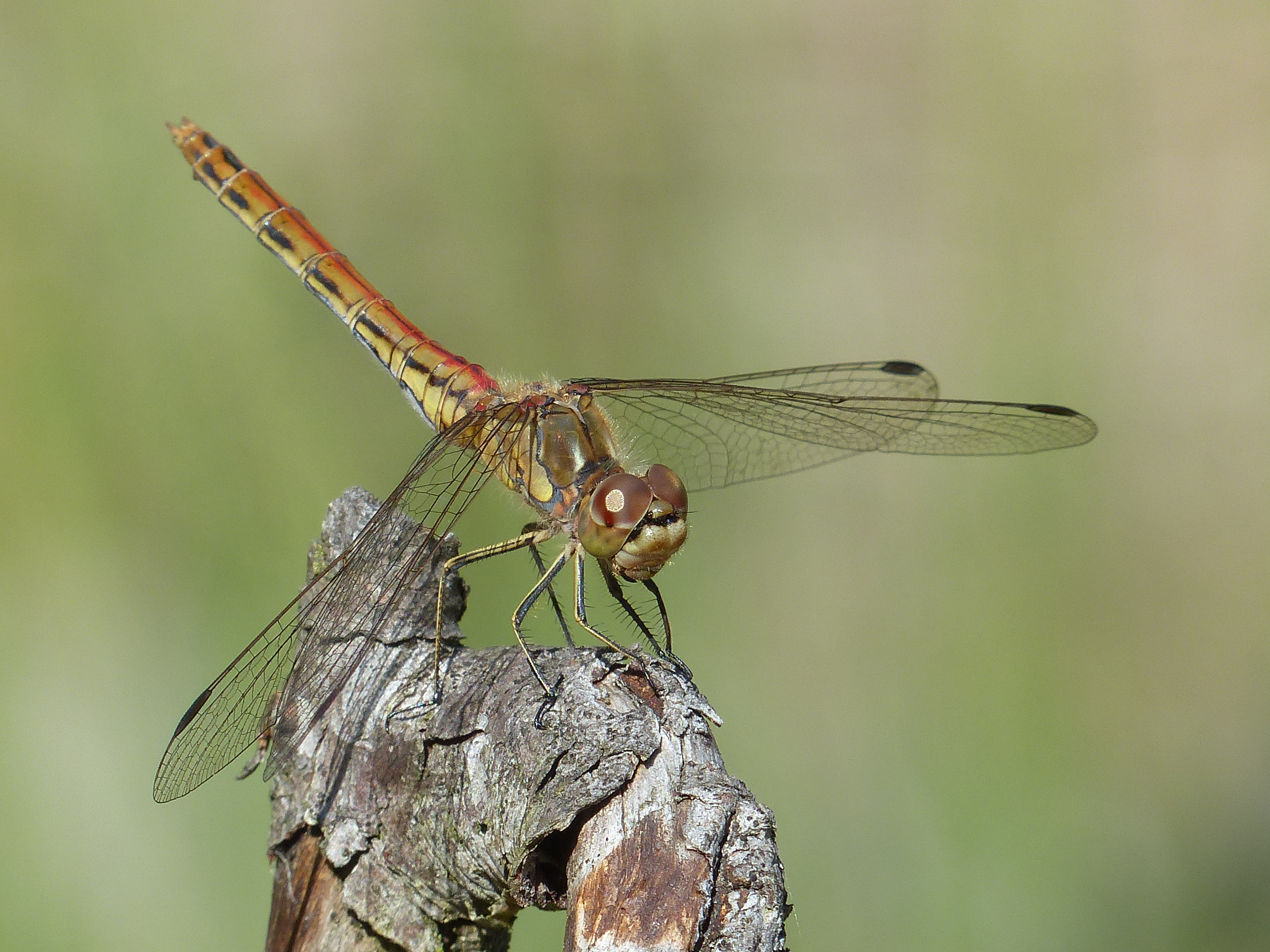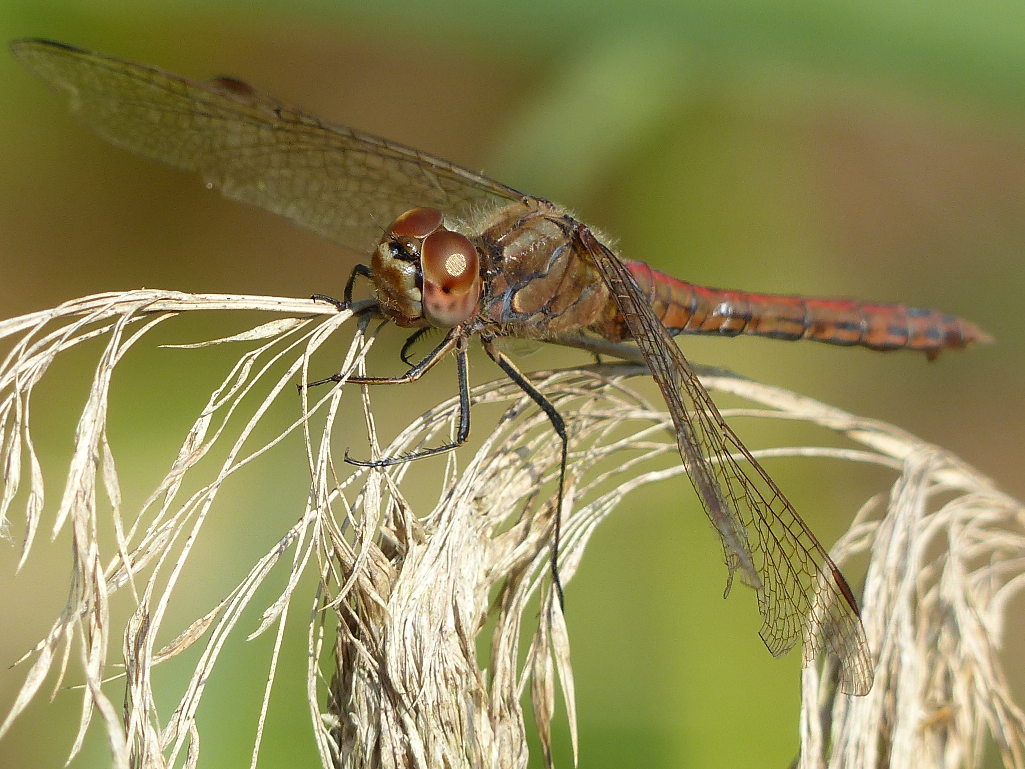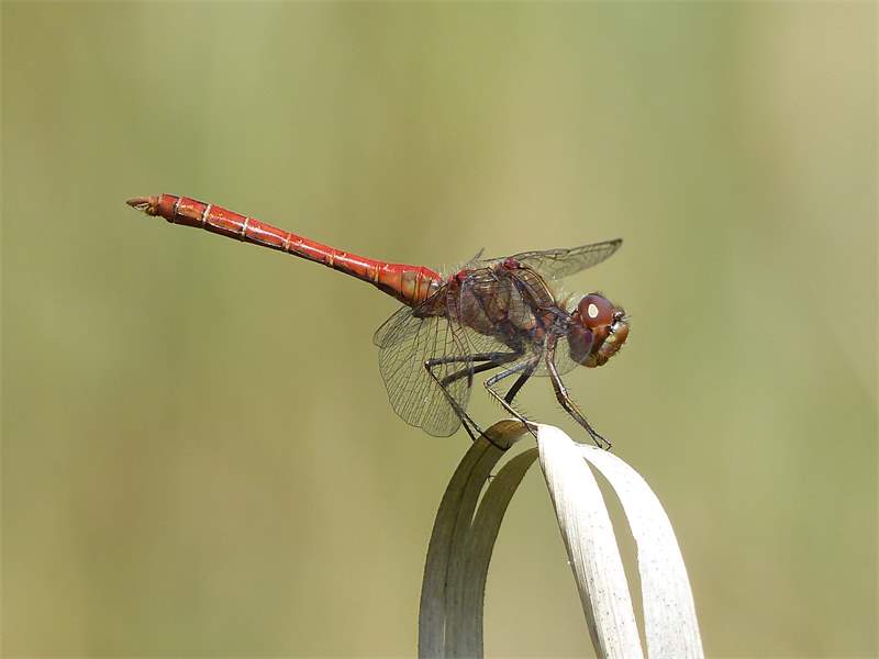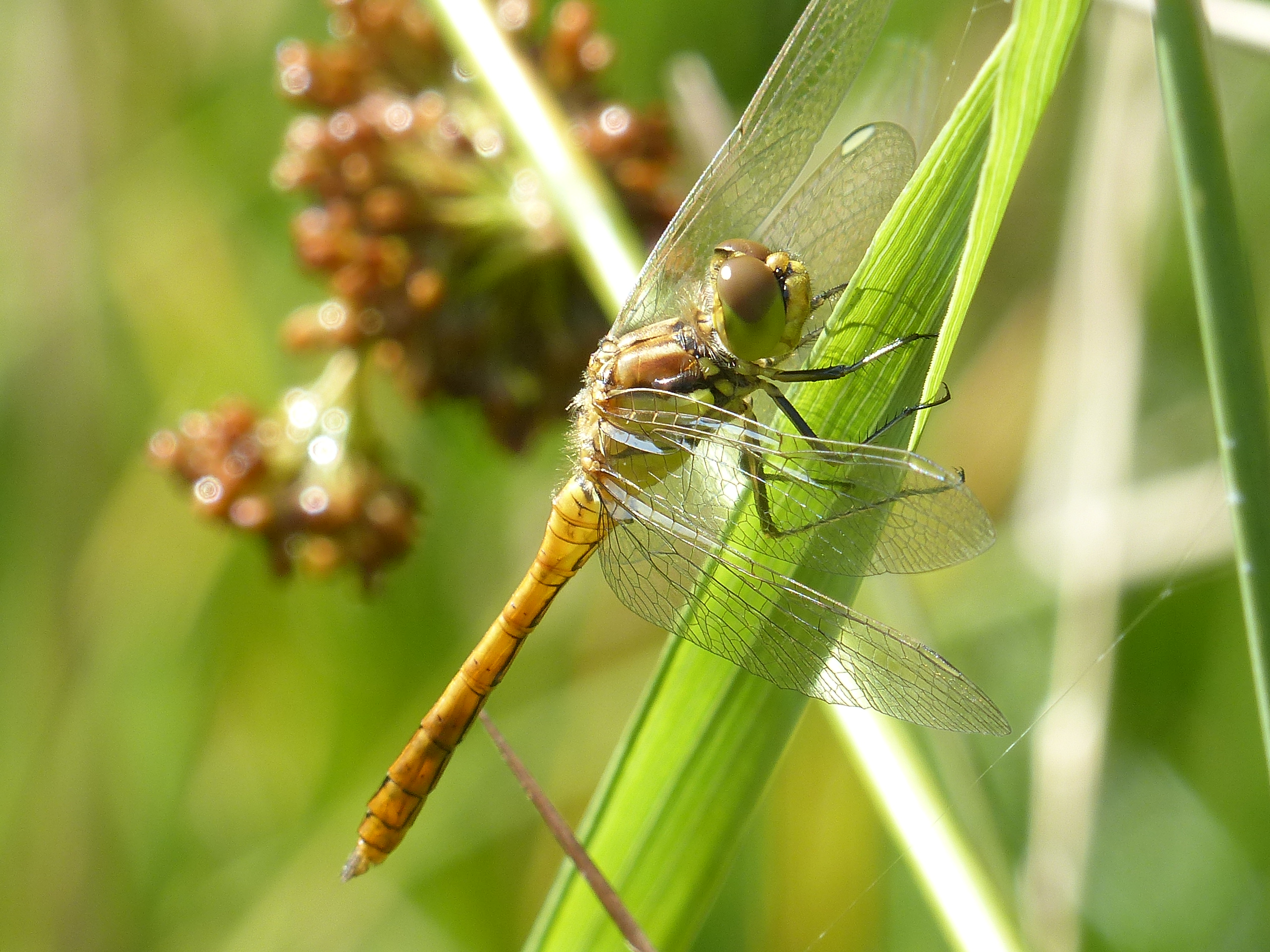 Gemeine Heidelibelle, Gemarkung Hohenprießnitz, Rieselgraben am Fichtbusch, altes Weibchen, Merkmale: gestreifte Beine, senkrecht abstehende Legescheide, August 2013