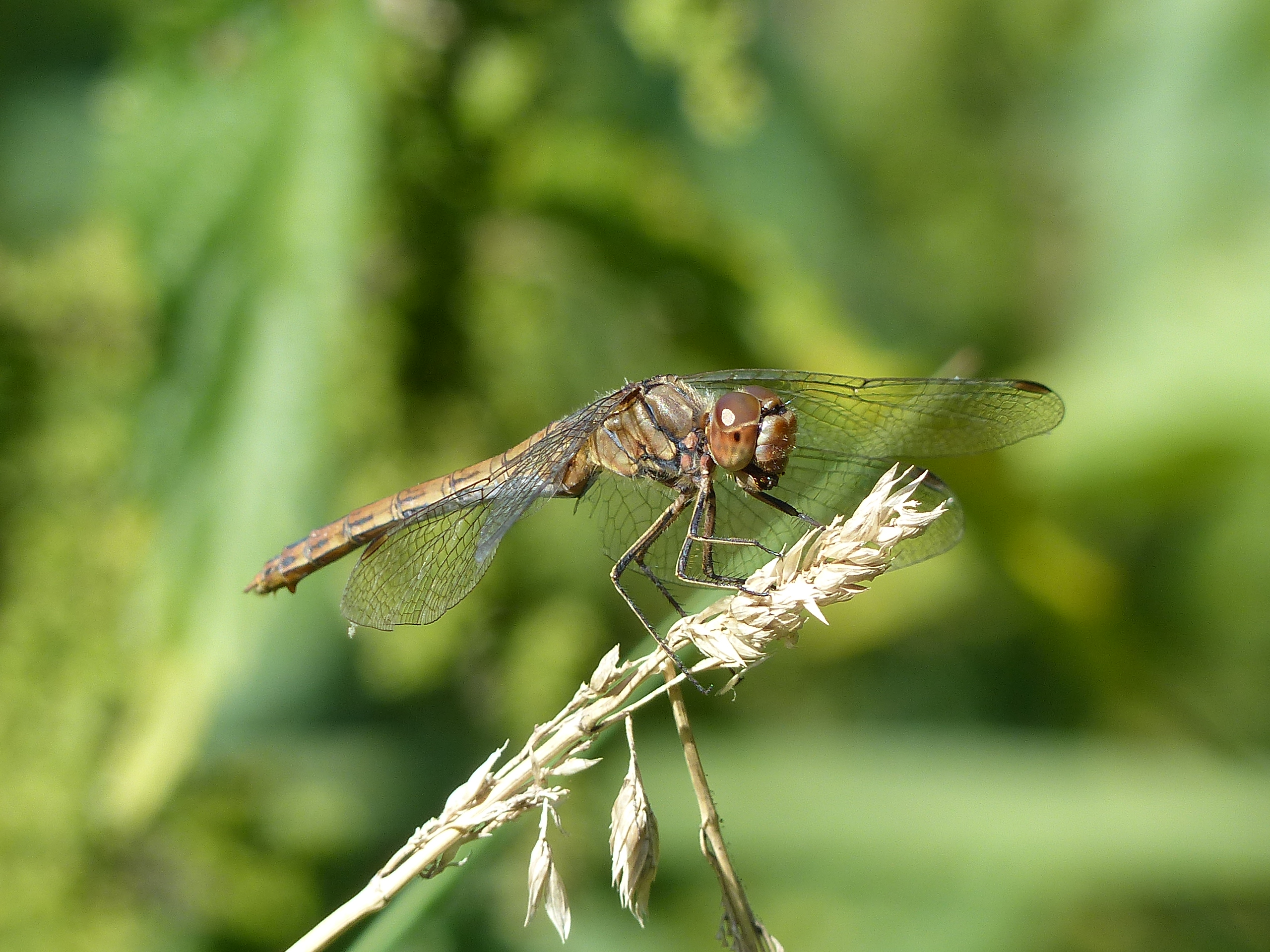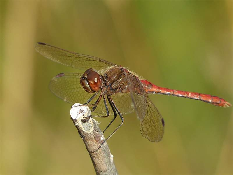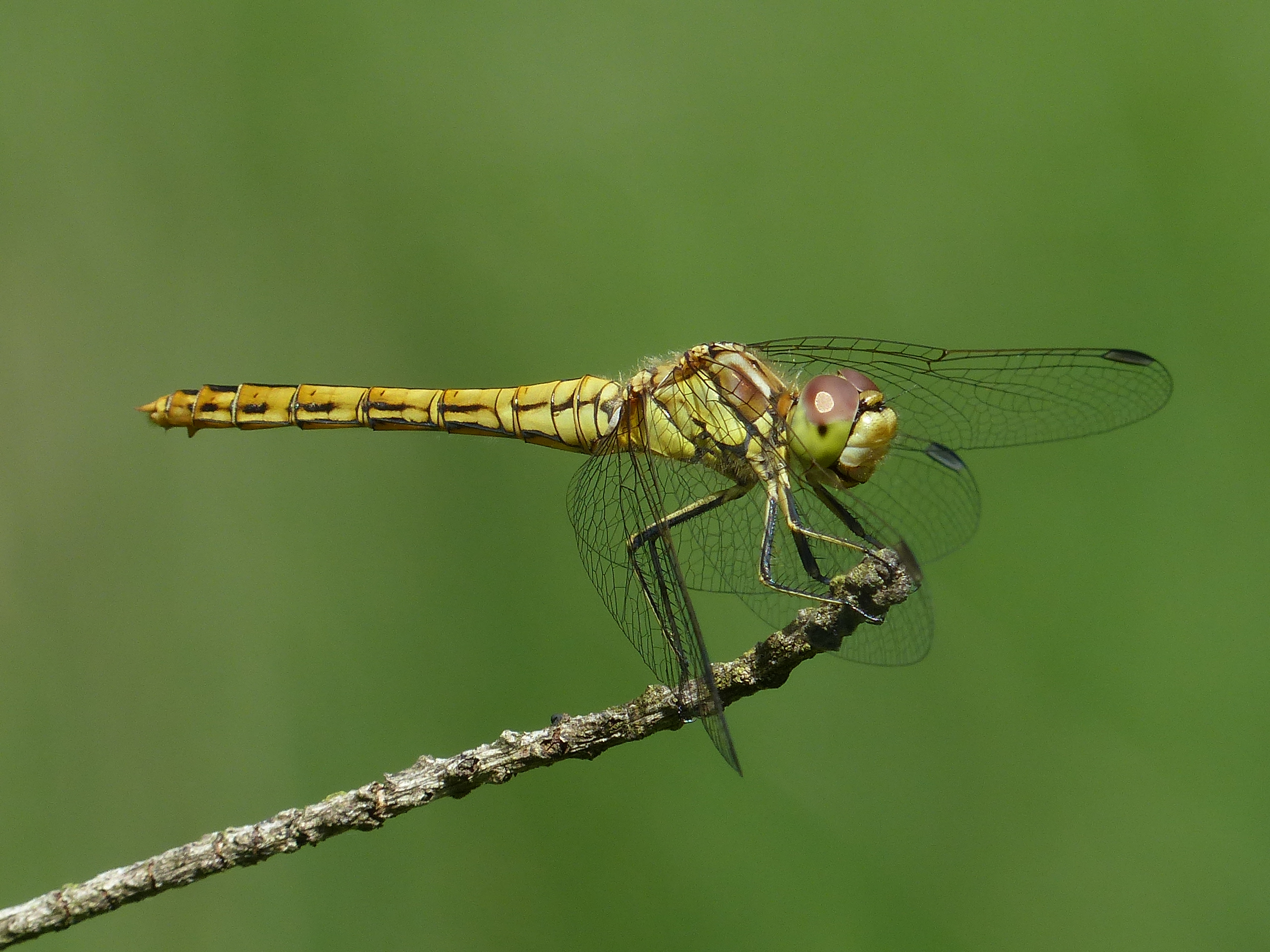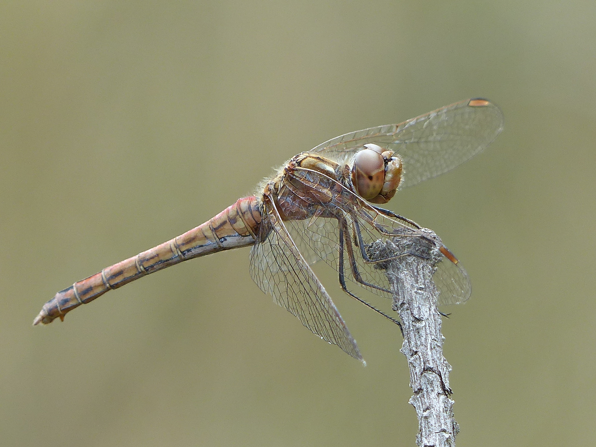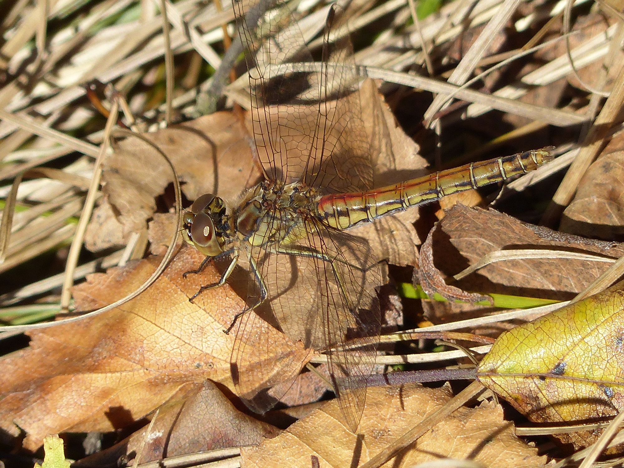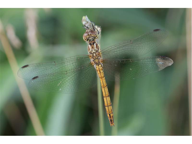 Gemeine Heidelibelle, Gemarkung Hohenprießnitz, Rieselgraben am Fichtbusch, altes Weibchen, Merkmale: gestreifte Beine, senkrecht abstehende Legescheide, August 2013