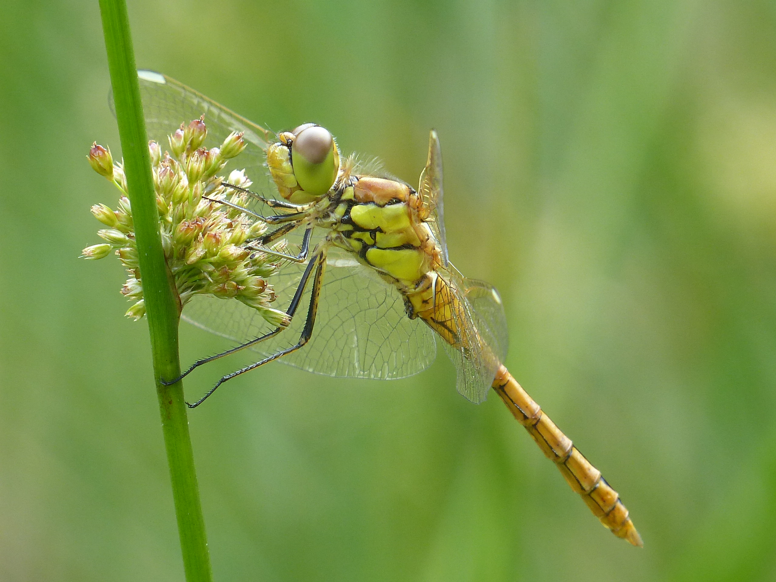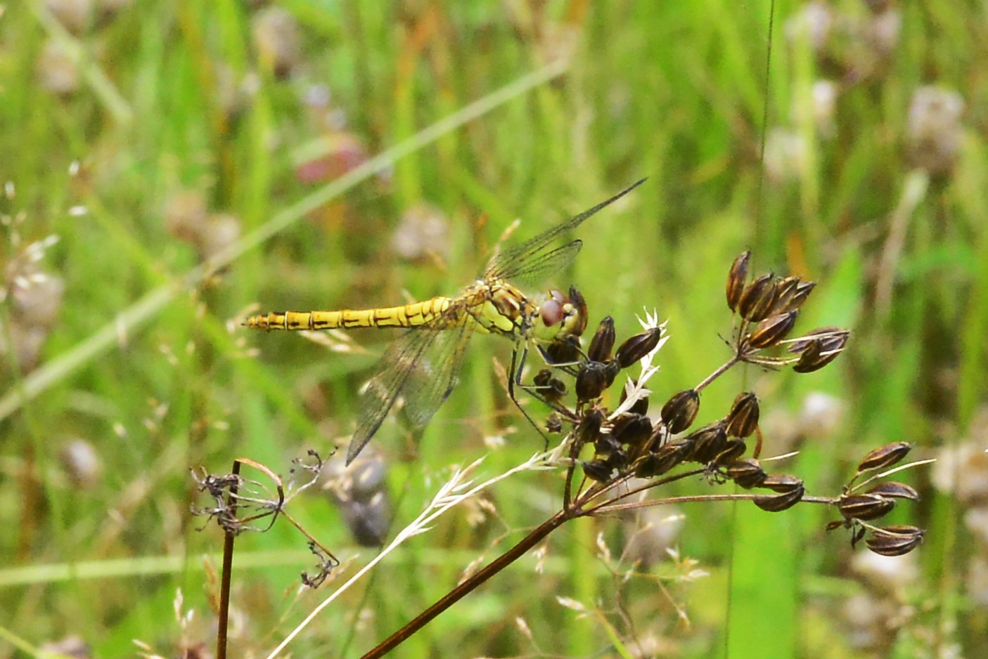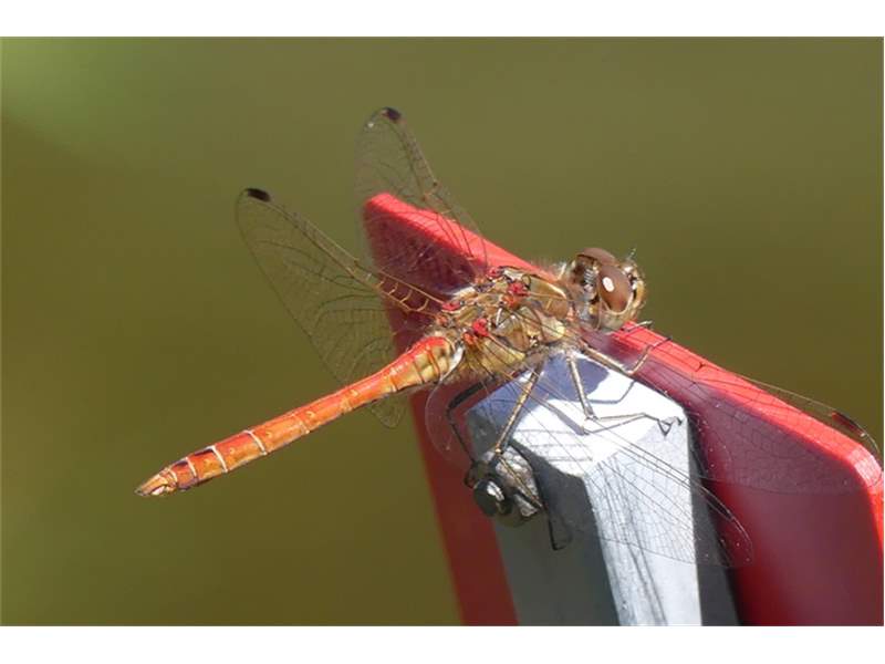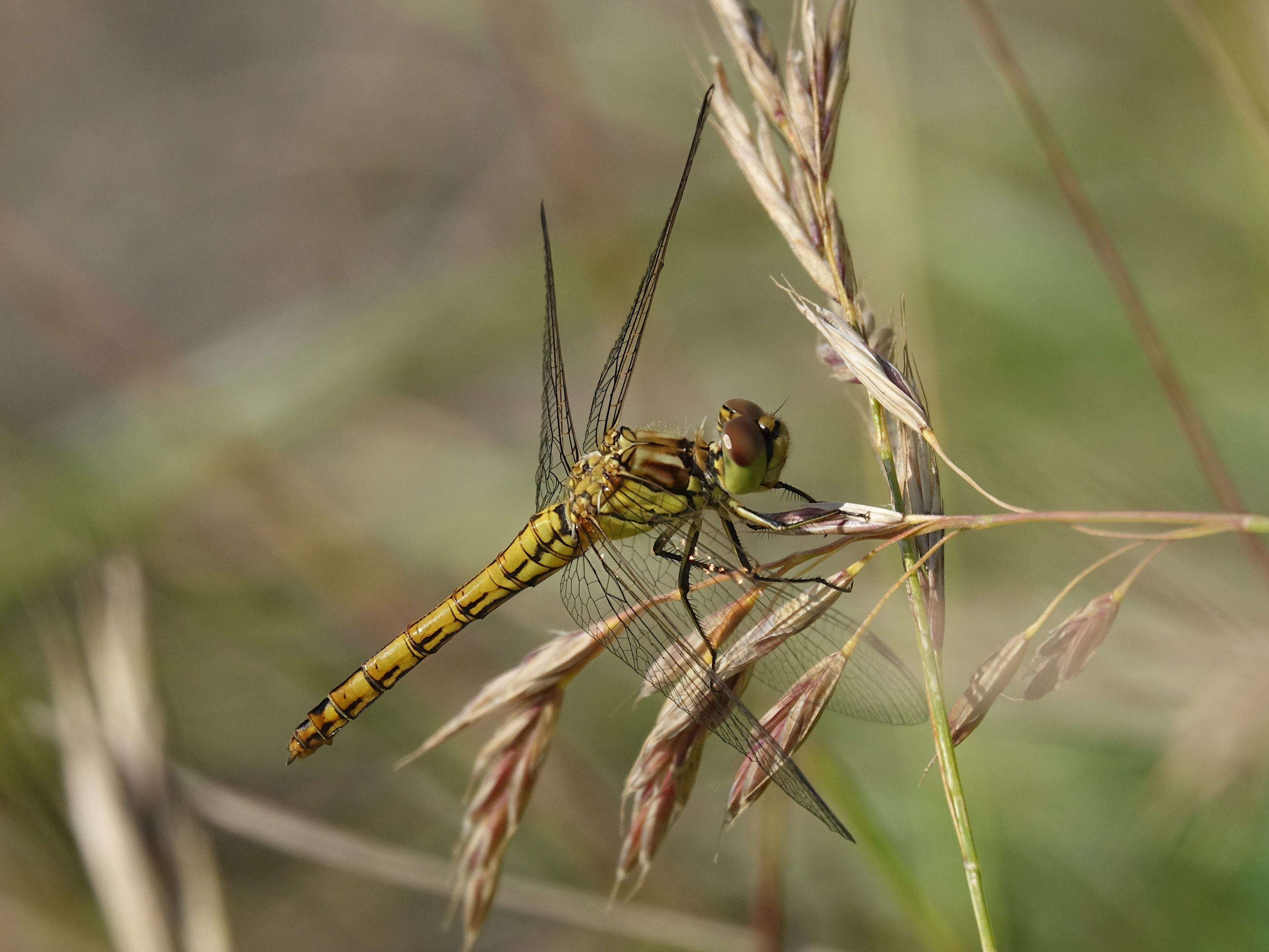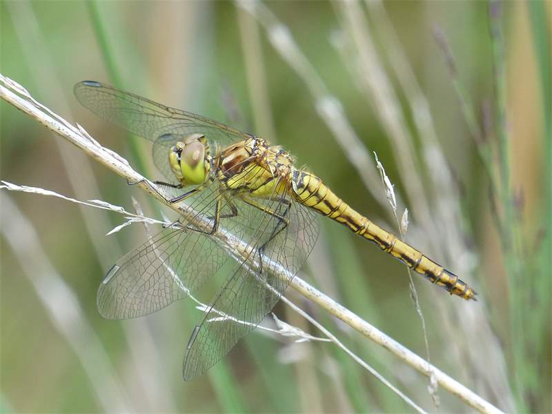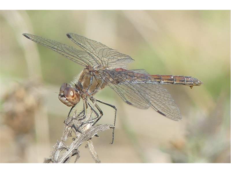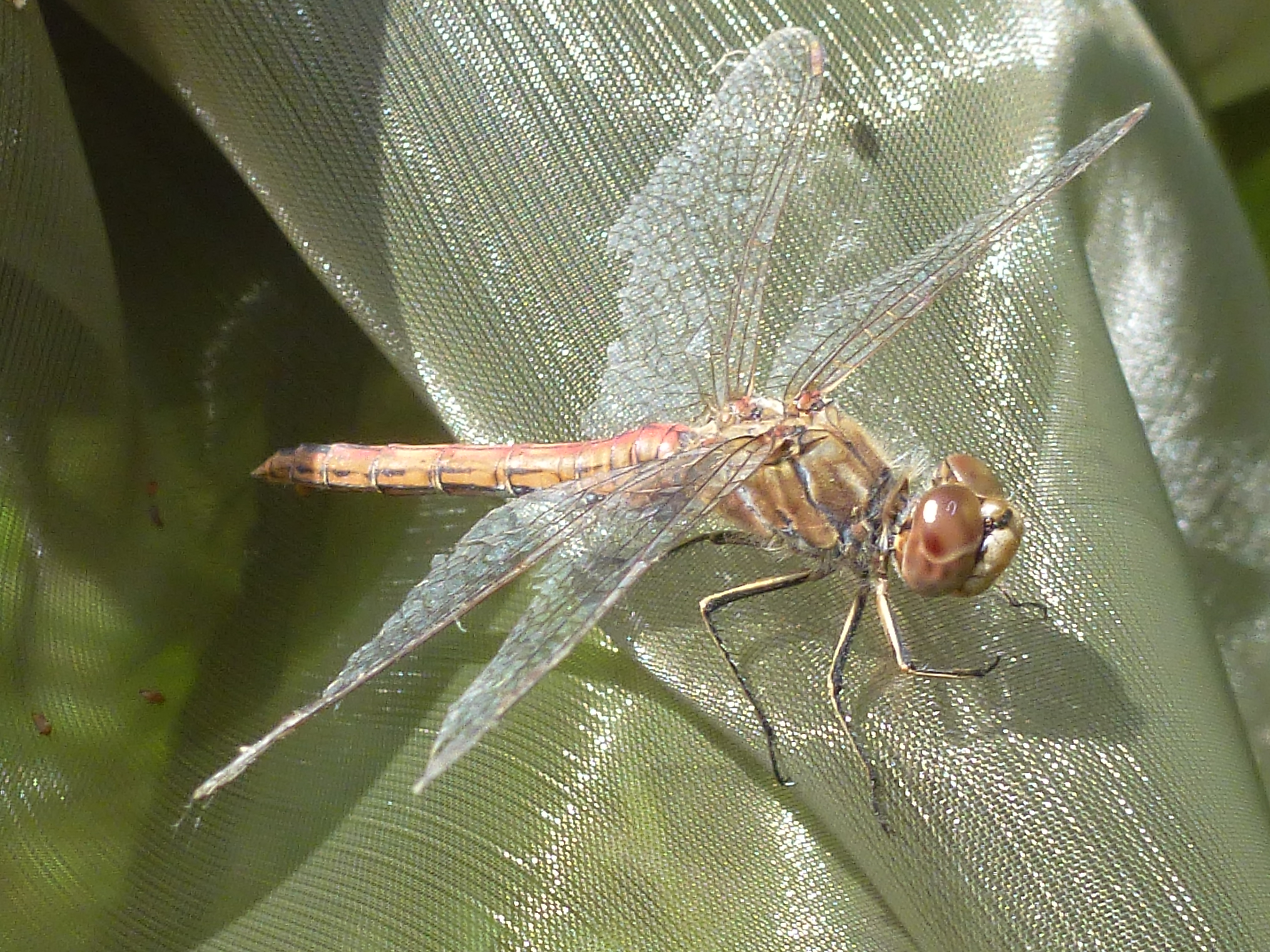 Gemeine Heidelibelle, Gemarkung Hohenprießnitz, Rieselgraben am Fichtbusch, altes Weibchen, Merkmale: gestreifte Beine, senkrecht abstehende Legescheide, August 2013