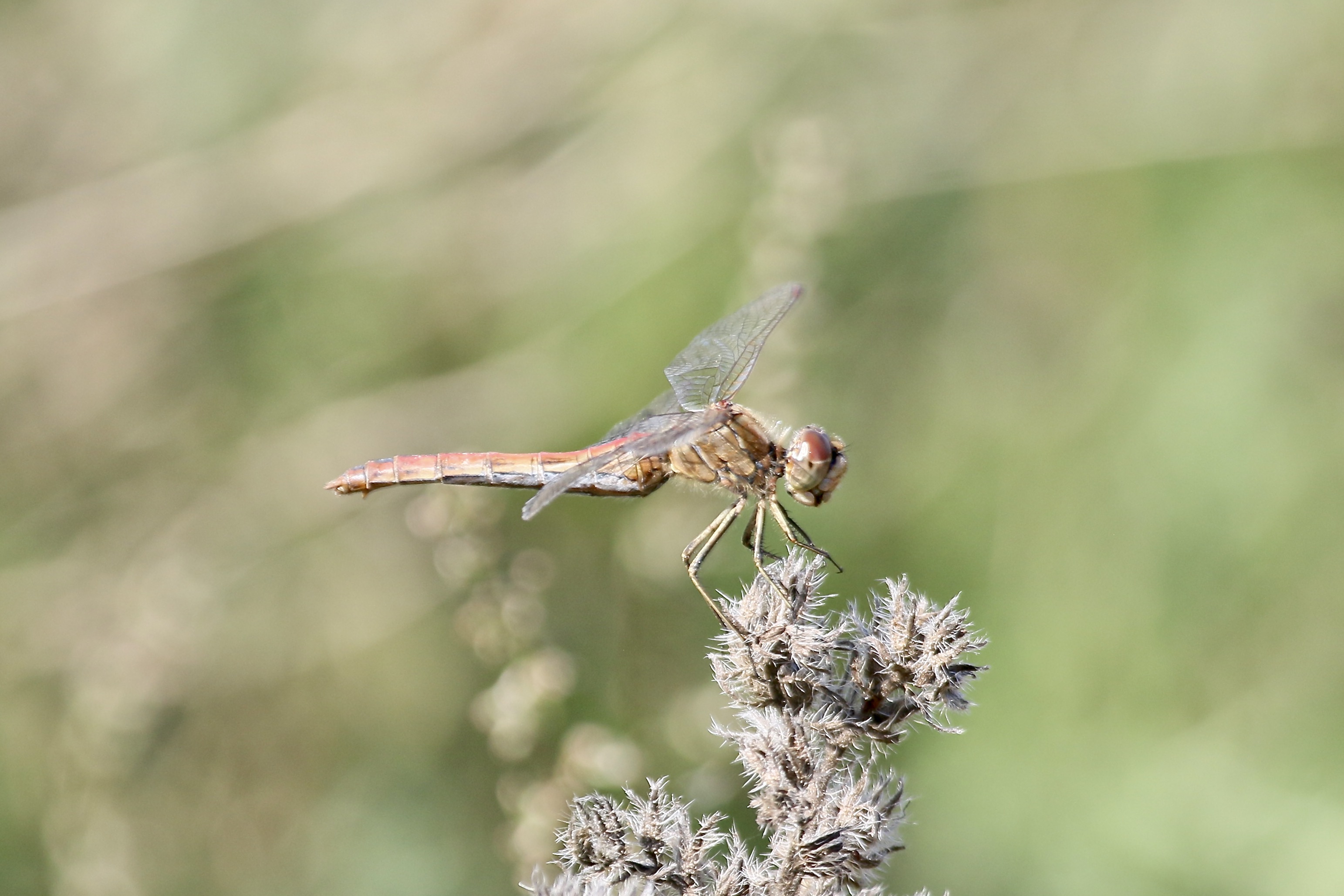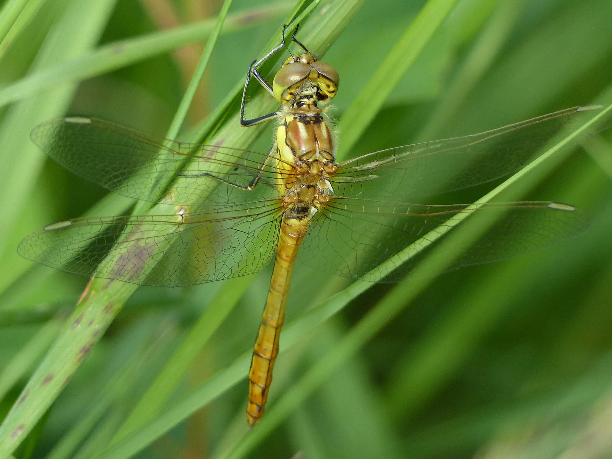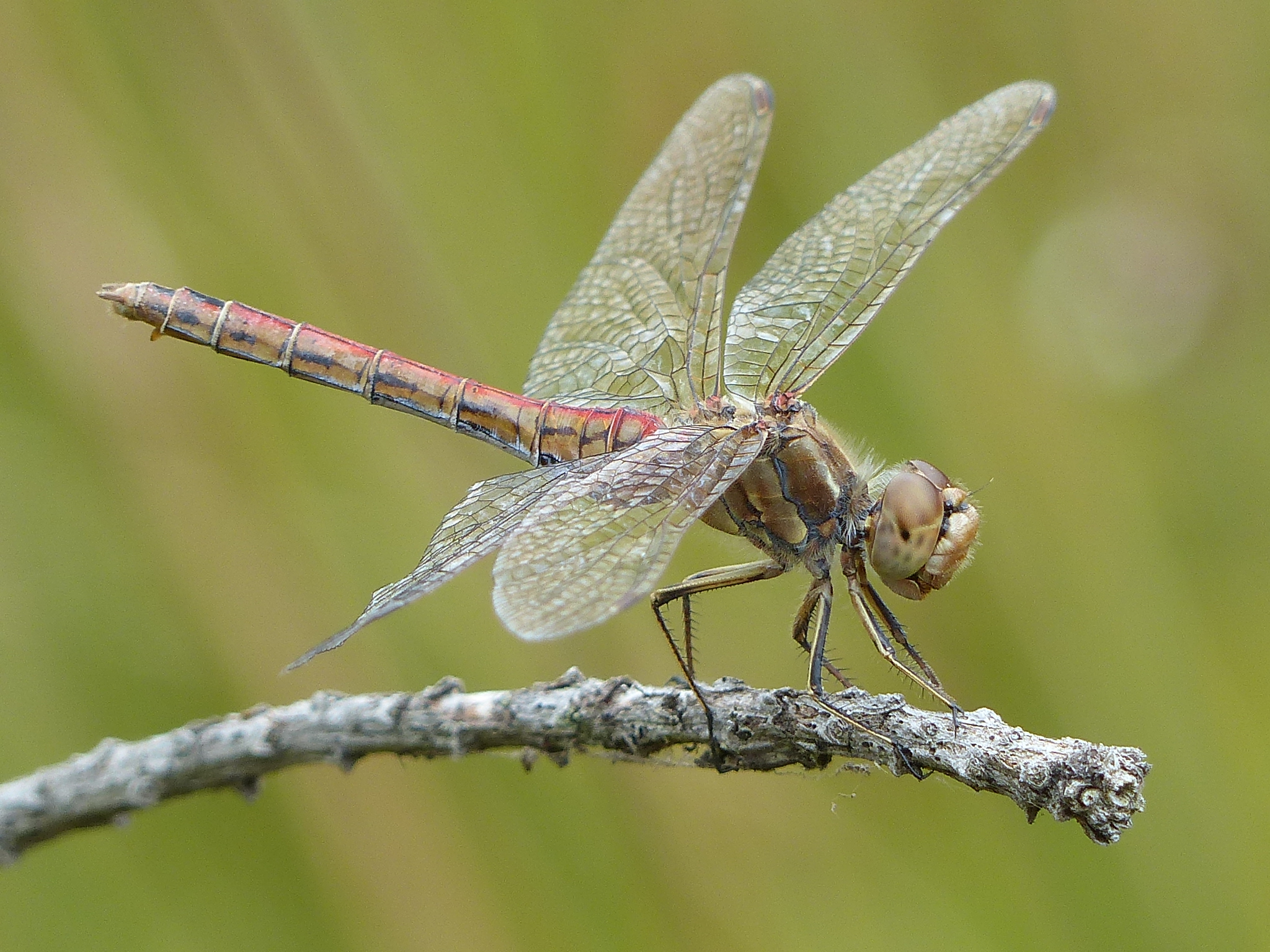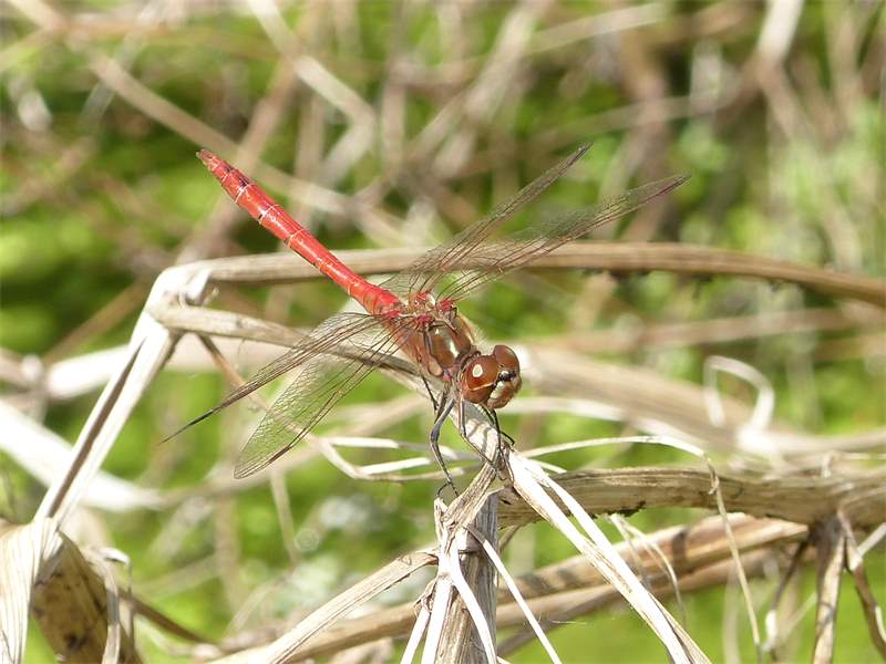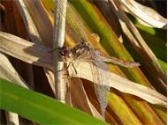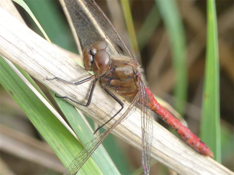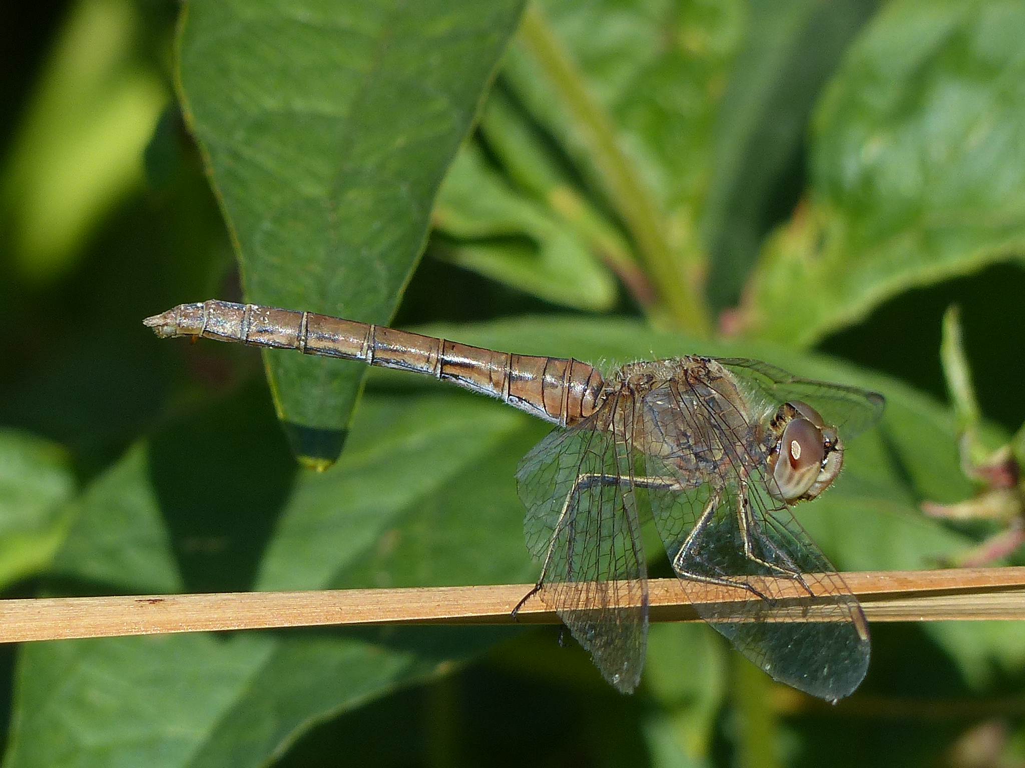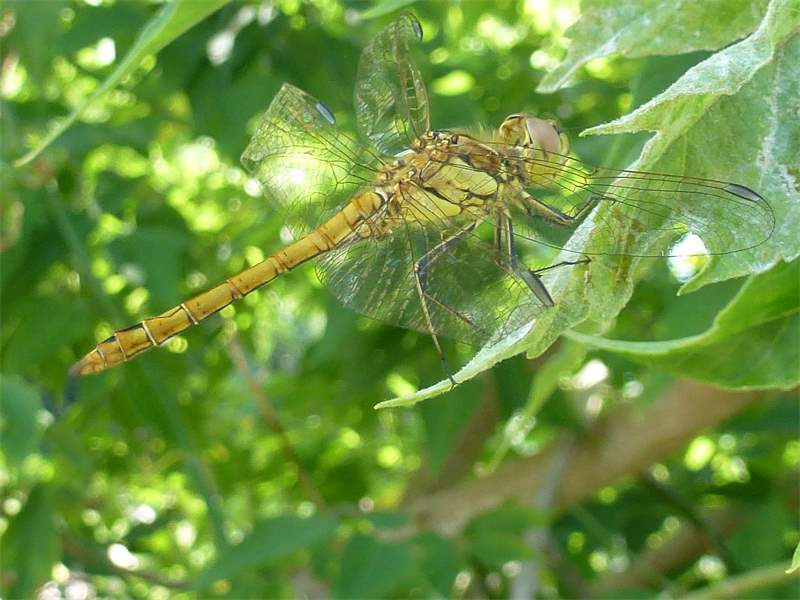 Gemeine Heidelibelle, Gemarkung Hohenprießnitz, Rieselgraben am Fichtbusch, altes Weibchen, Merkmale: gestreifte Beine, senkrecht abstehende Legescheide, August 2013