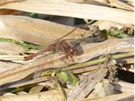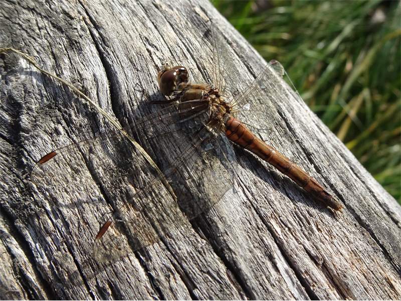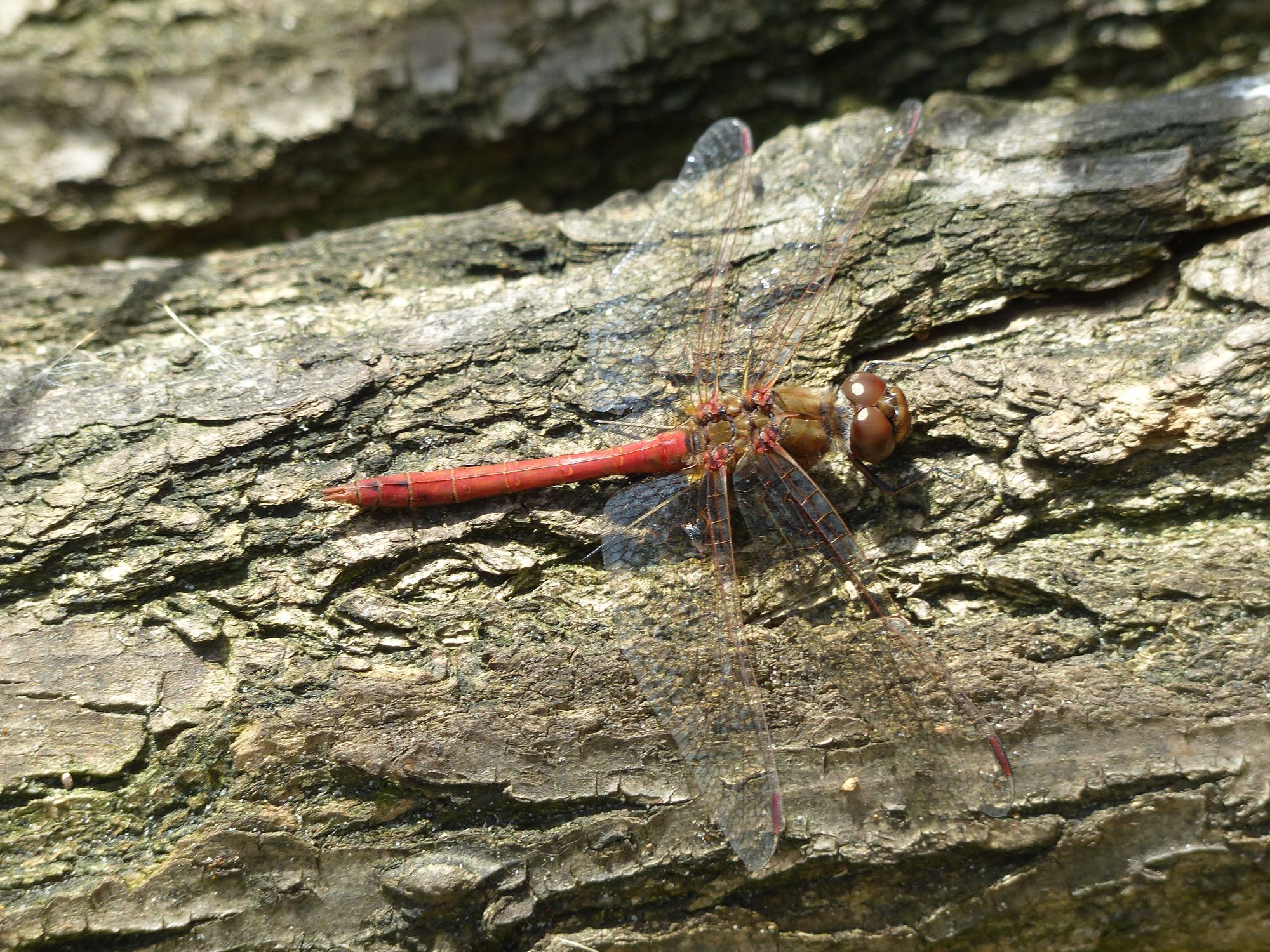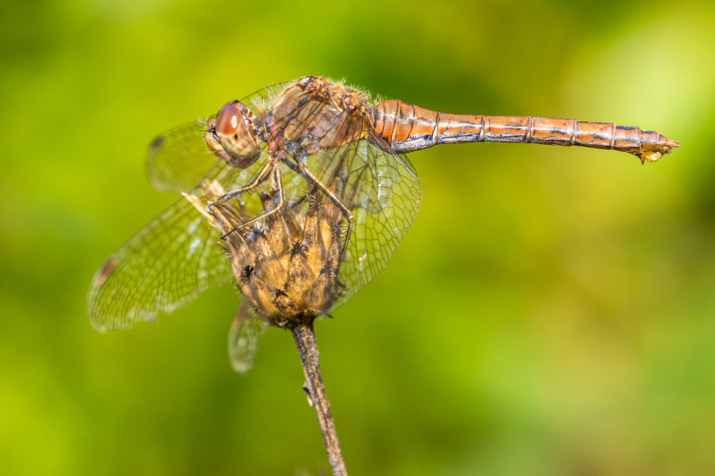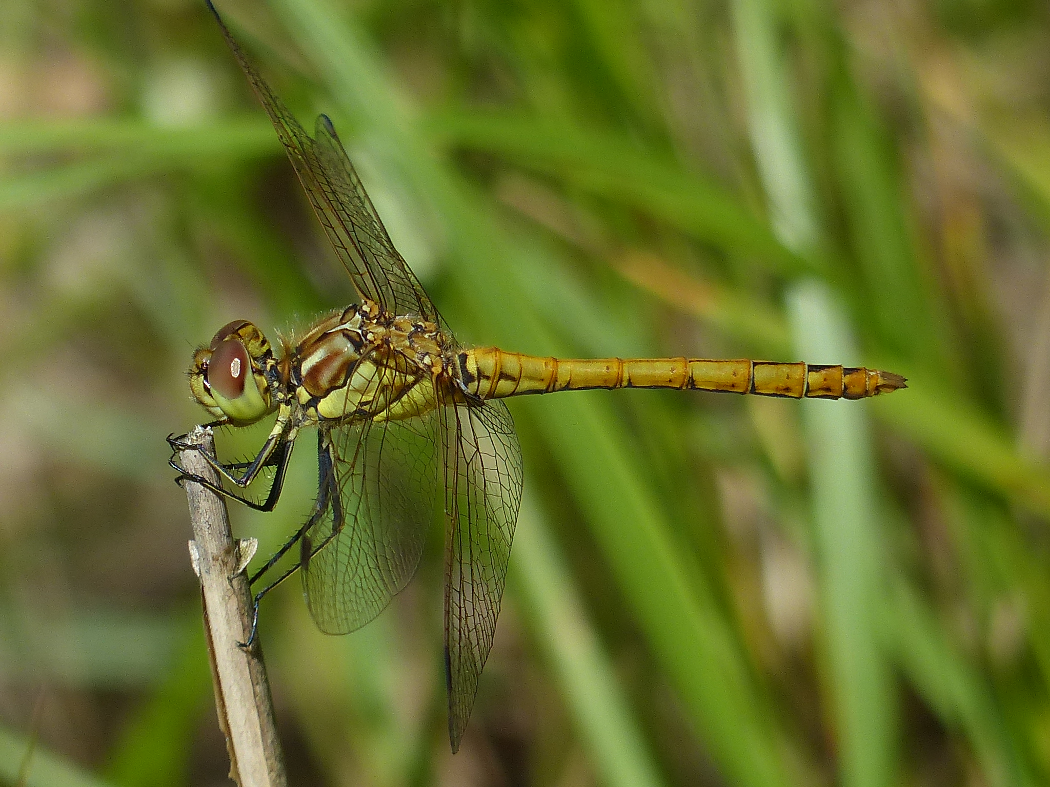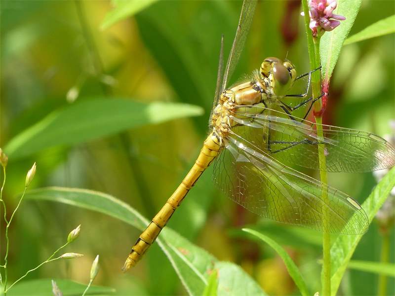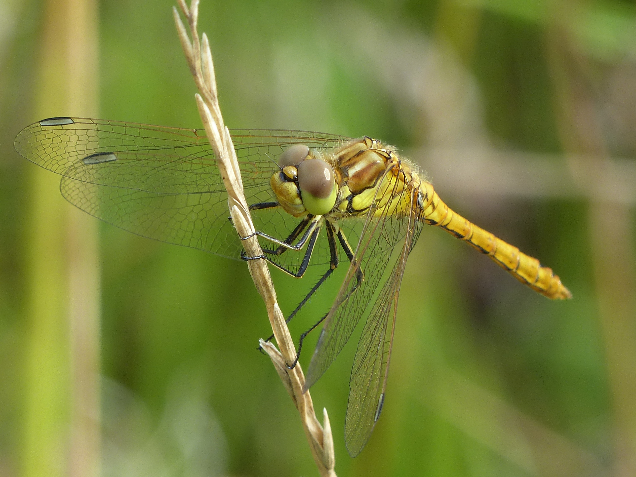 Gemeine Heidelibelle, Gemarkung Hohenprießnitz, Rieselgraben am Fichtbusch, altes Weibchen, Merkmale: gestreifte Beine, senkrecht abstehende Legescheide, August 2013