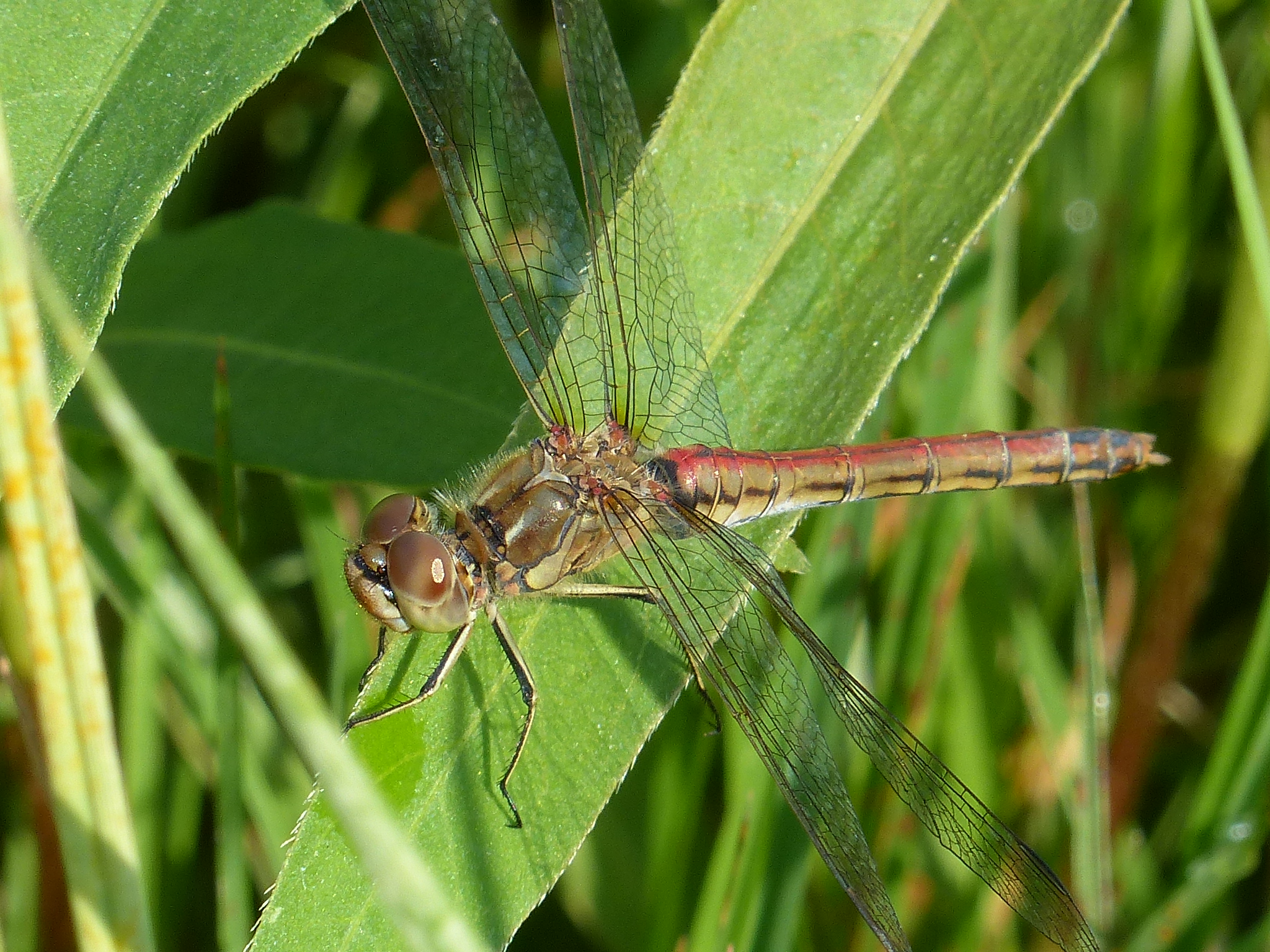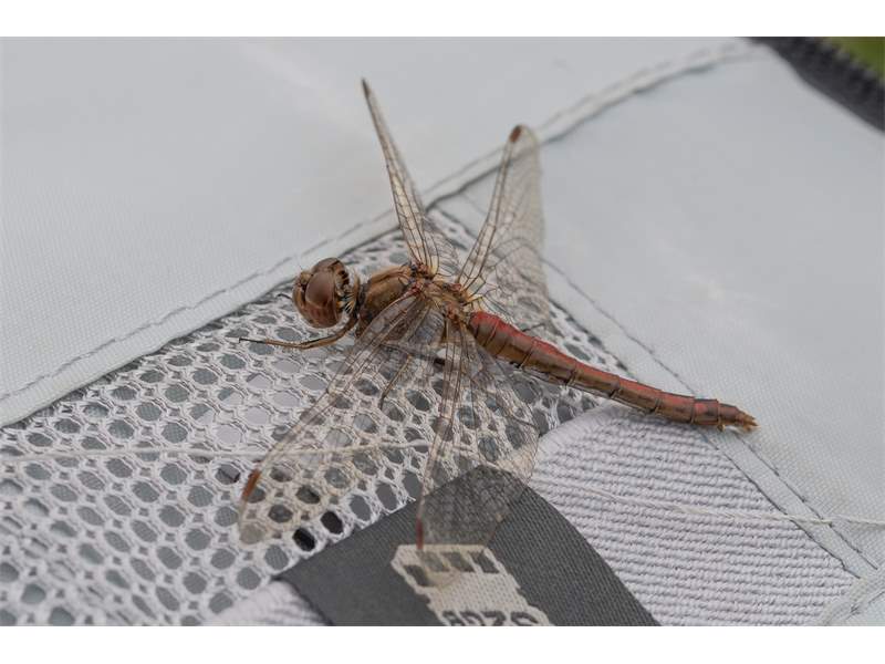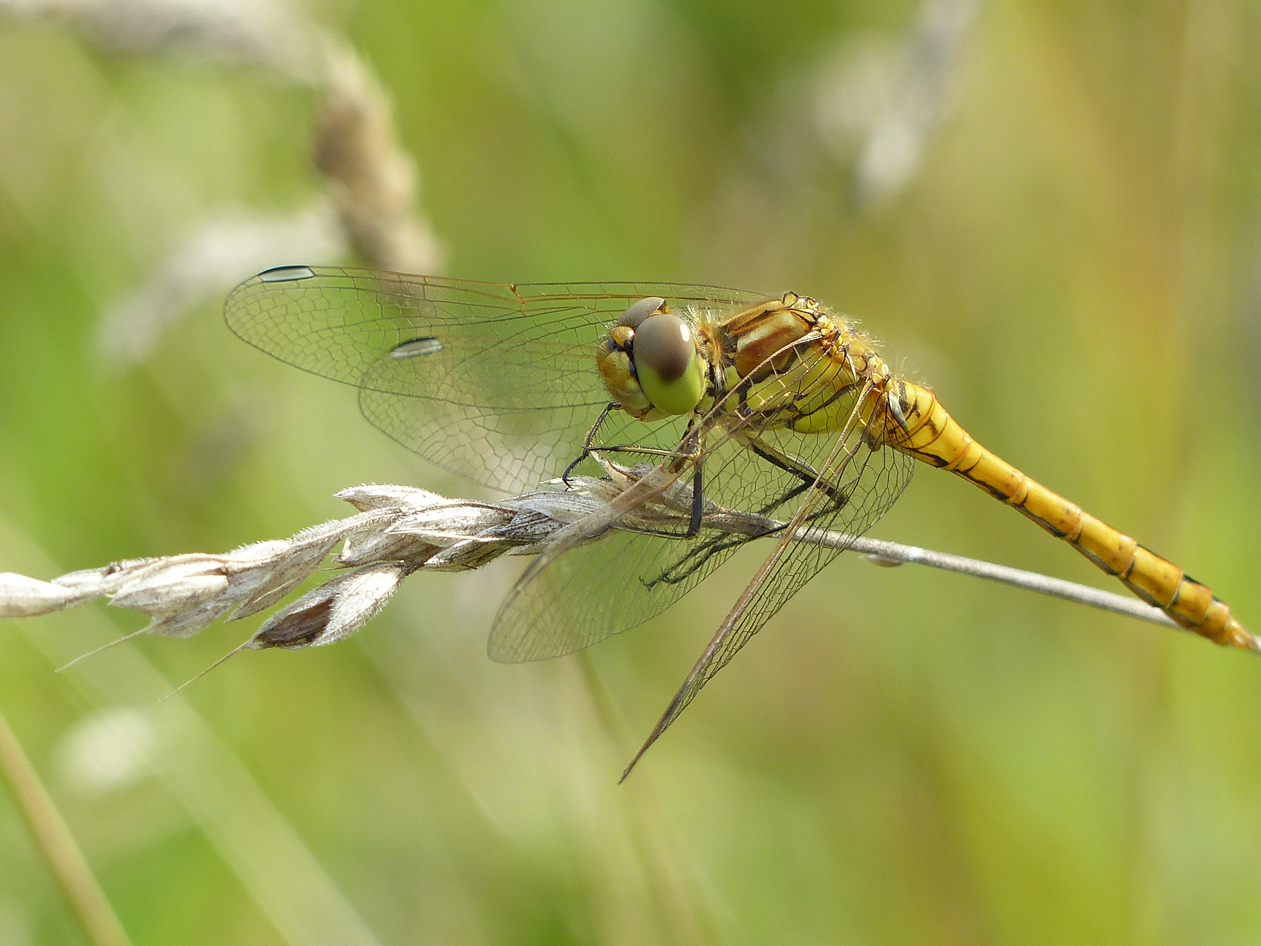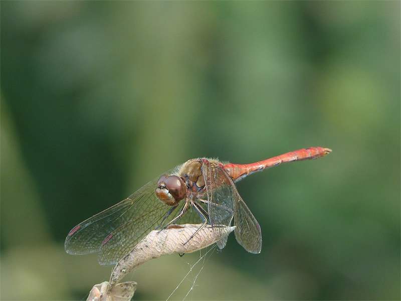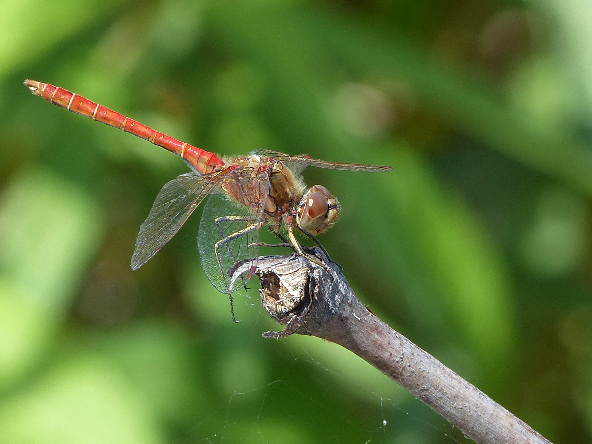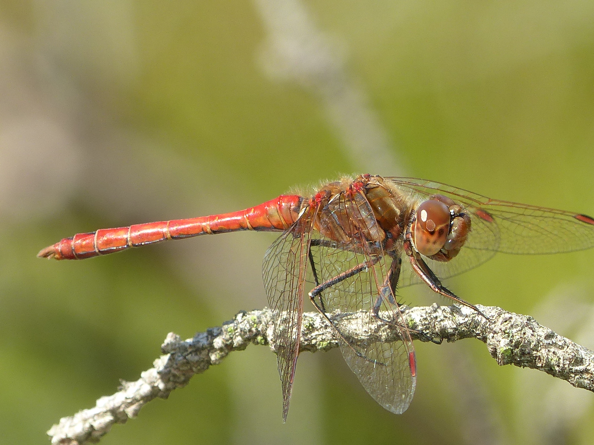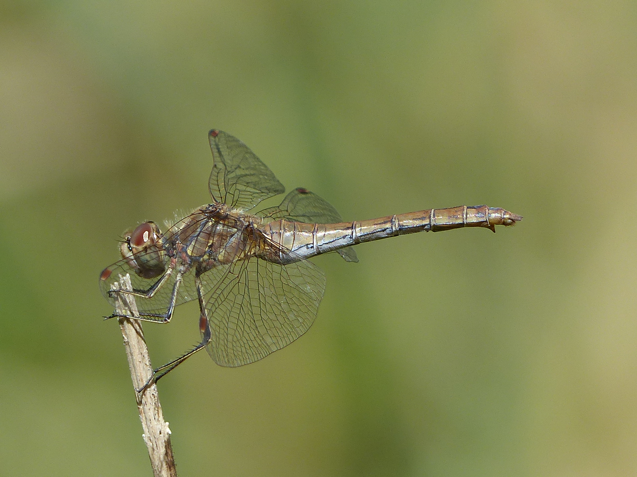 Gemeine Heidelibelle, Gemarkung Hohenprießnitz, Rieselgraben am Fichtbusch, altes Weibchen, Merkmale: gestreifte Beine, senkrecht abstehende Legescheide, August 2013