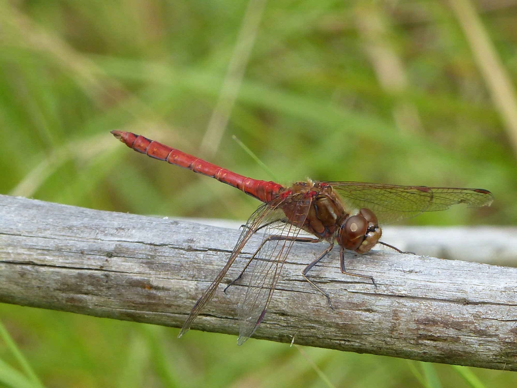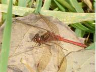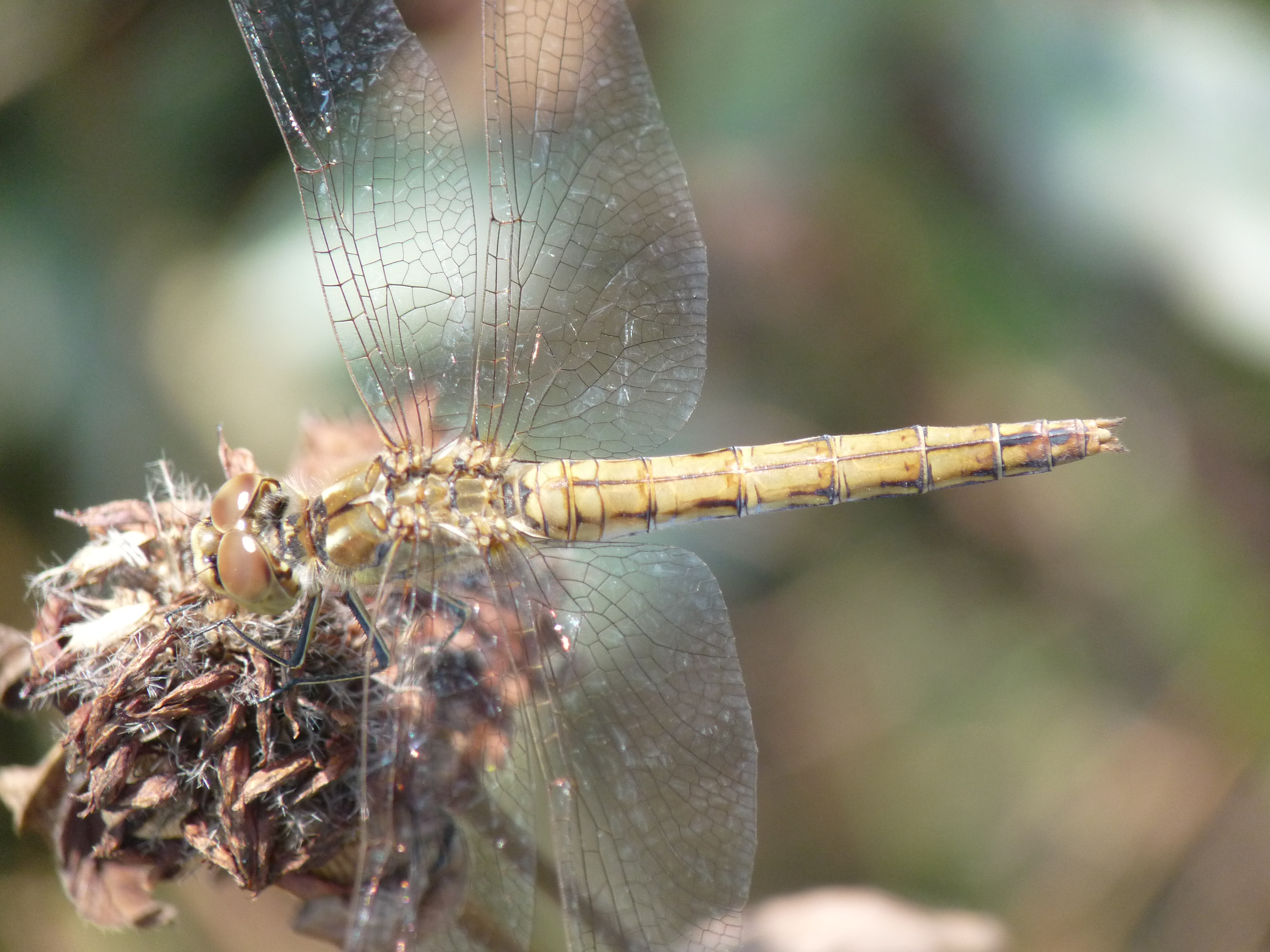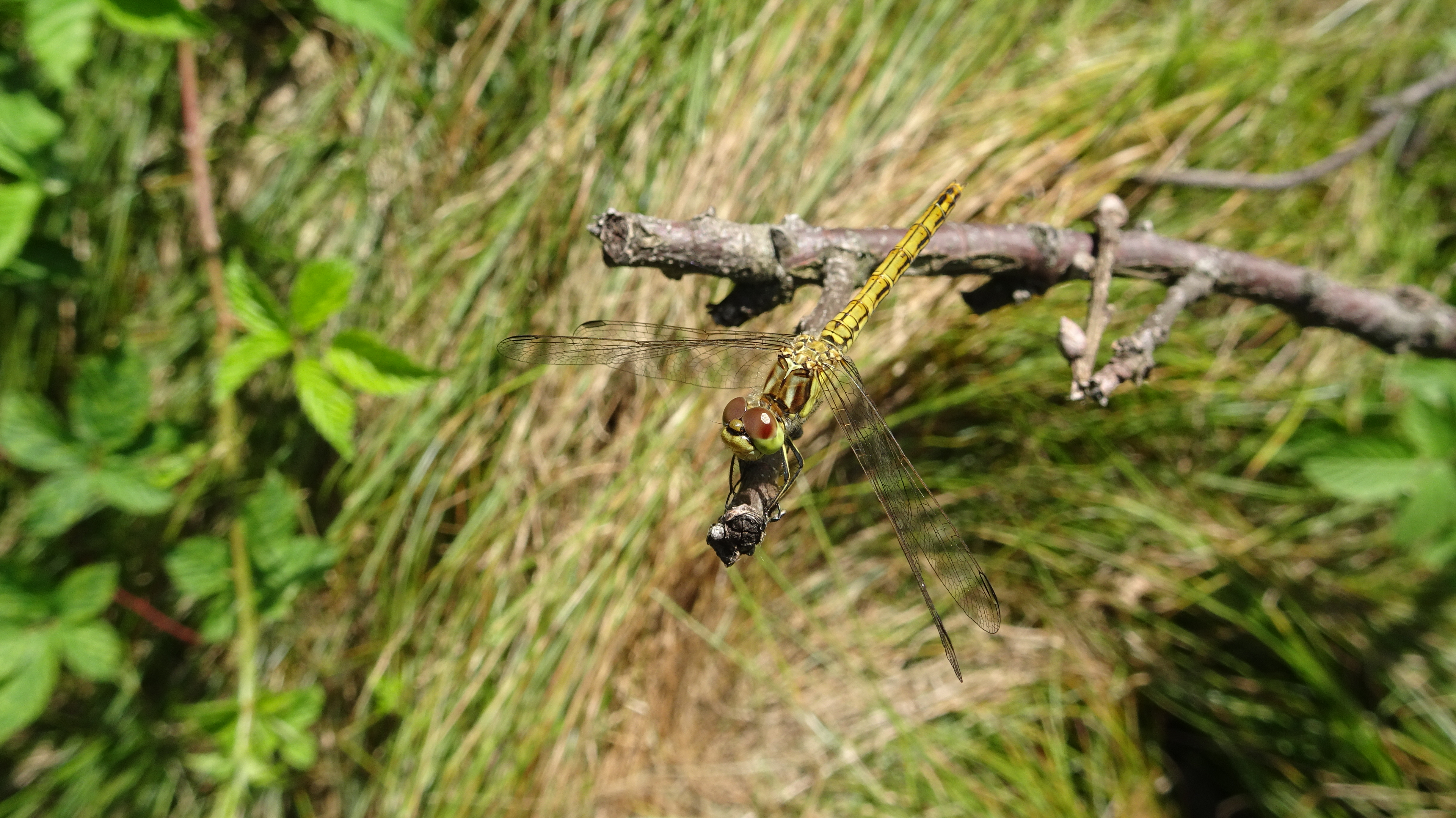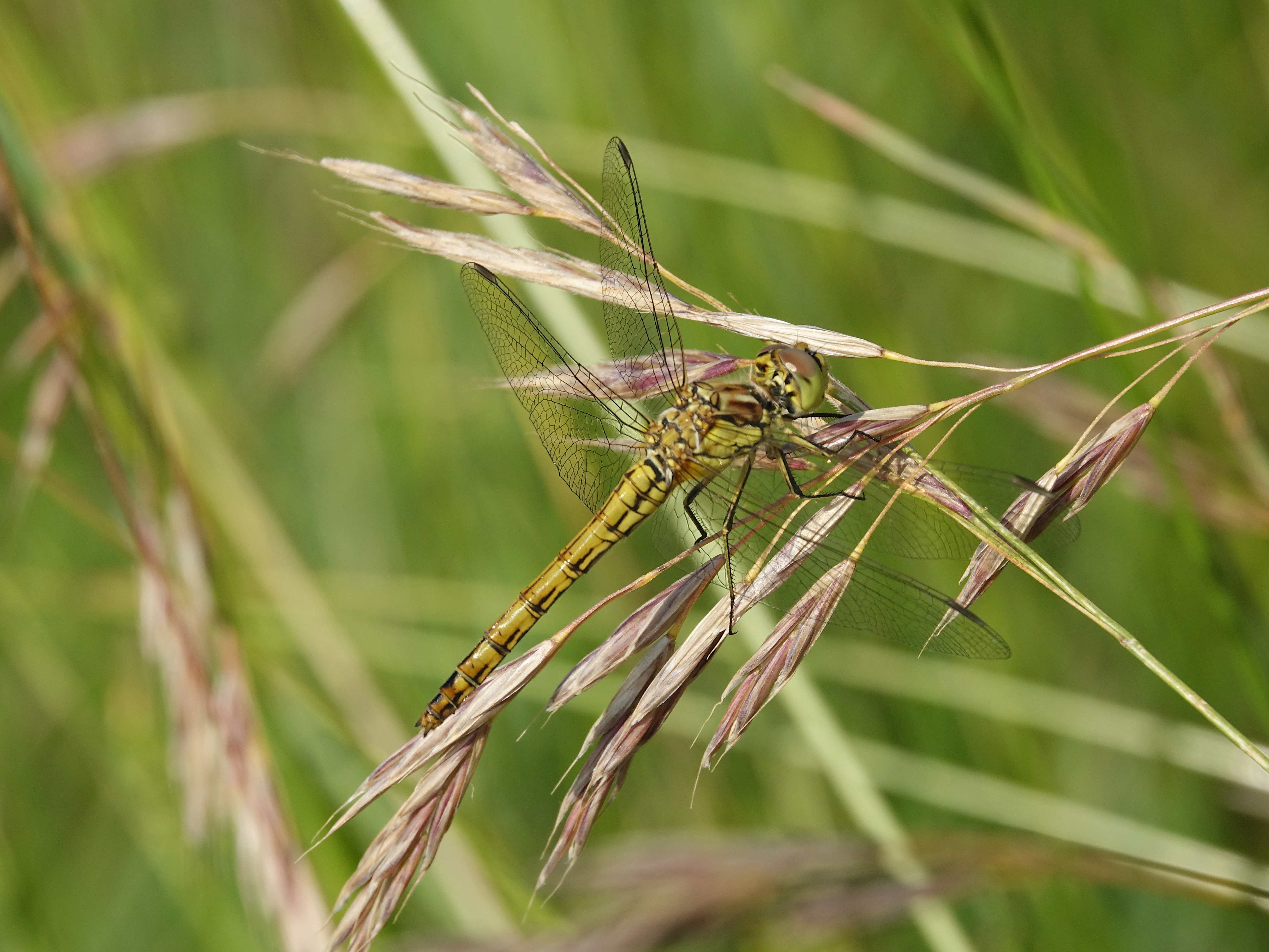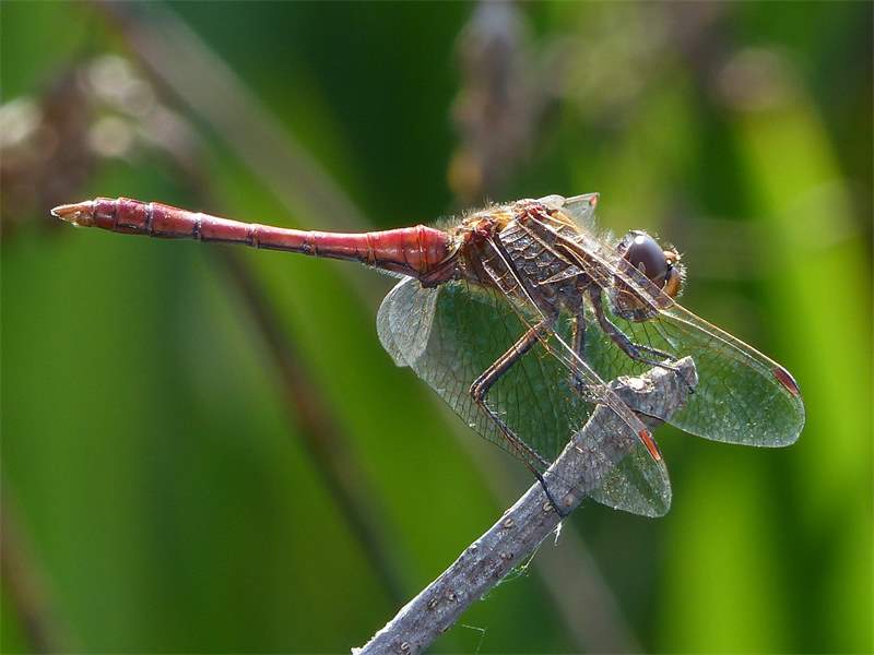 Gemeine Heidelibelle, Gemarkung Hohenprießnitz, Rieselgraben am Fichtbusch, altes Weibchen, Merkmale: gestreifte Beine, senkrecht abstehende Legescheide, August 2013