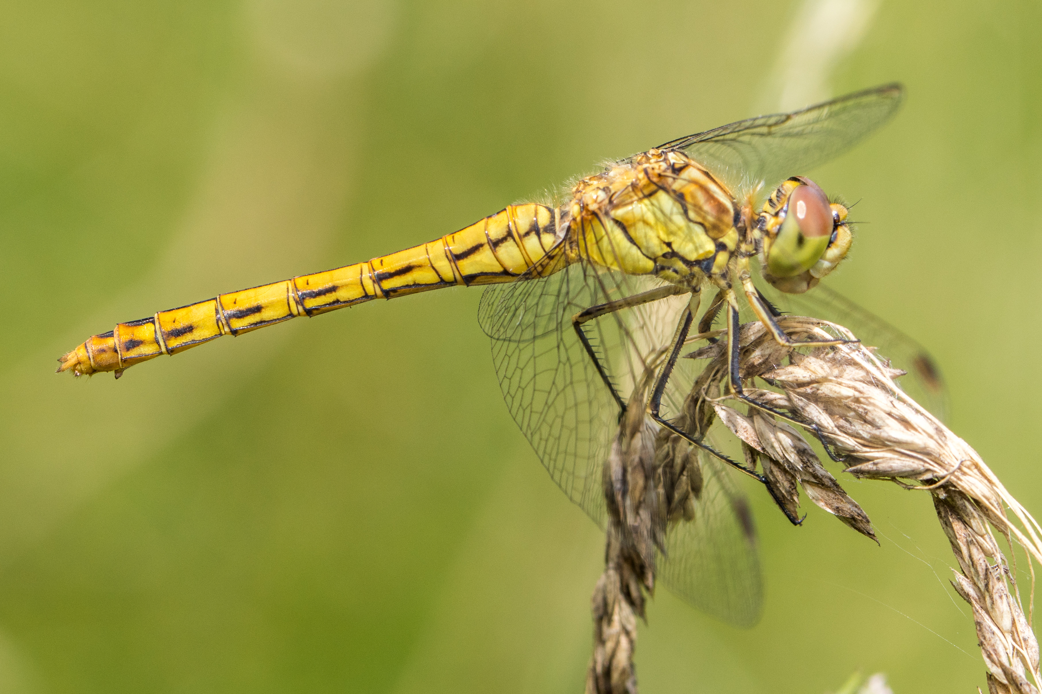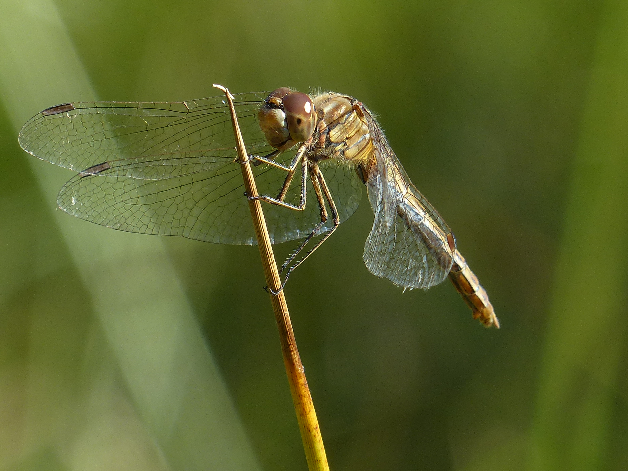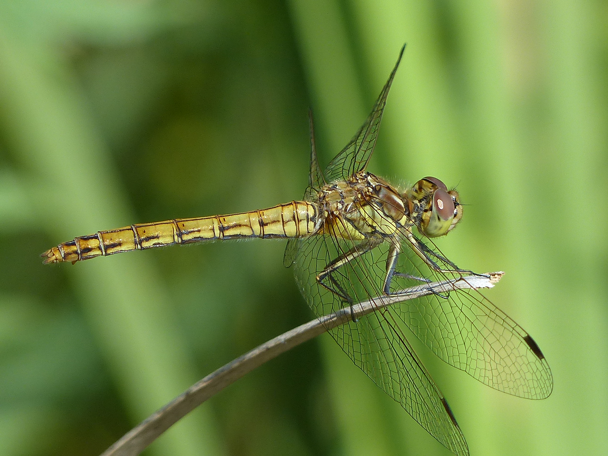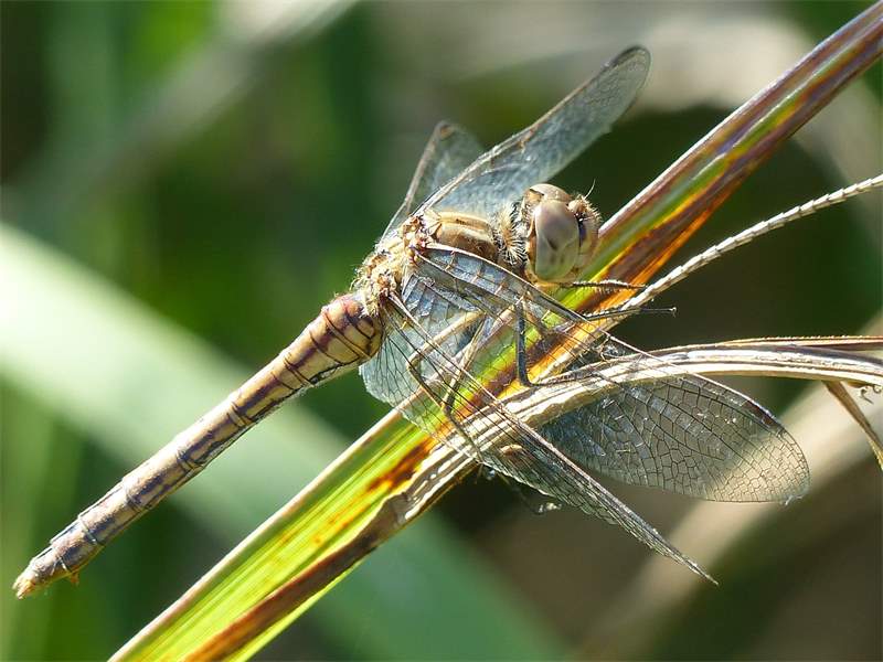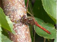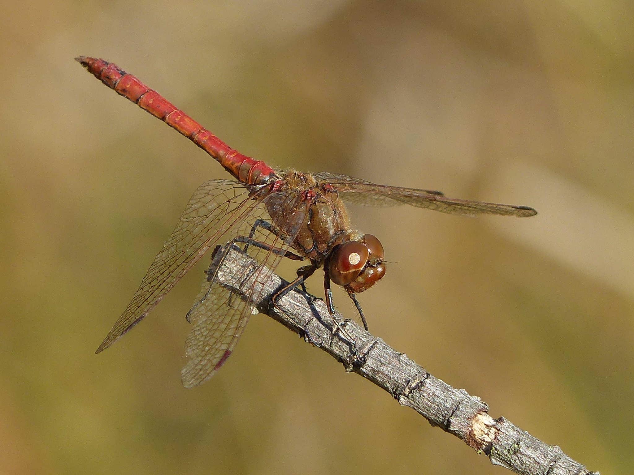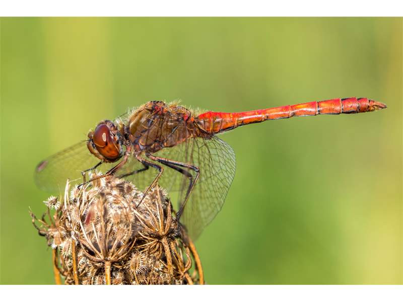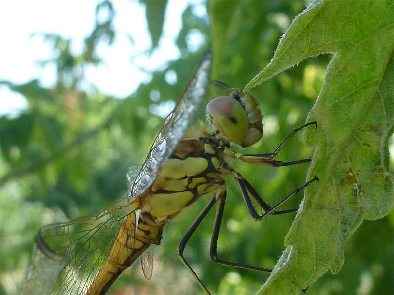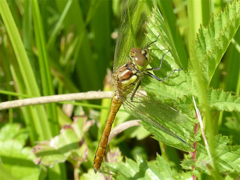 Gemeine Heidelibelle, Gemarkung Hohenprießnitz, Rieselgraben am Fichtbusch, altes Weibchen, Merkmale: gestreifte Beine, senkrecht abstehende Legescheide, August 2013