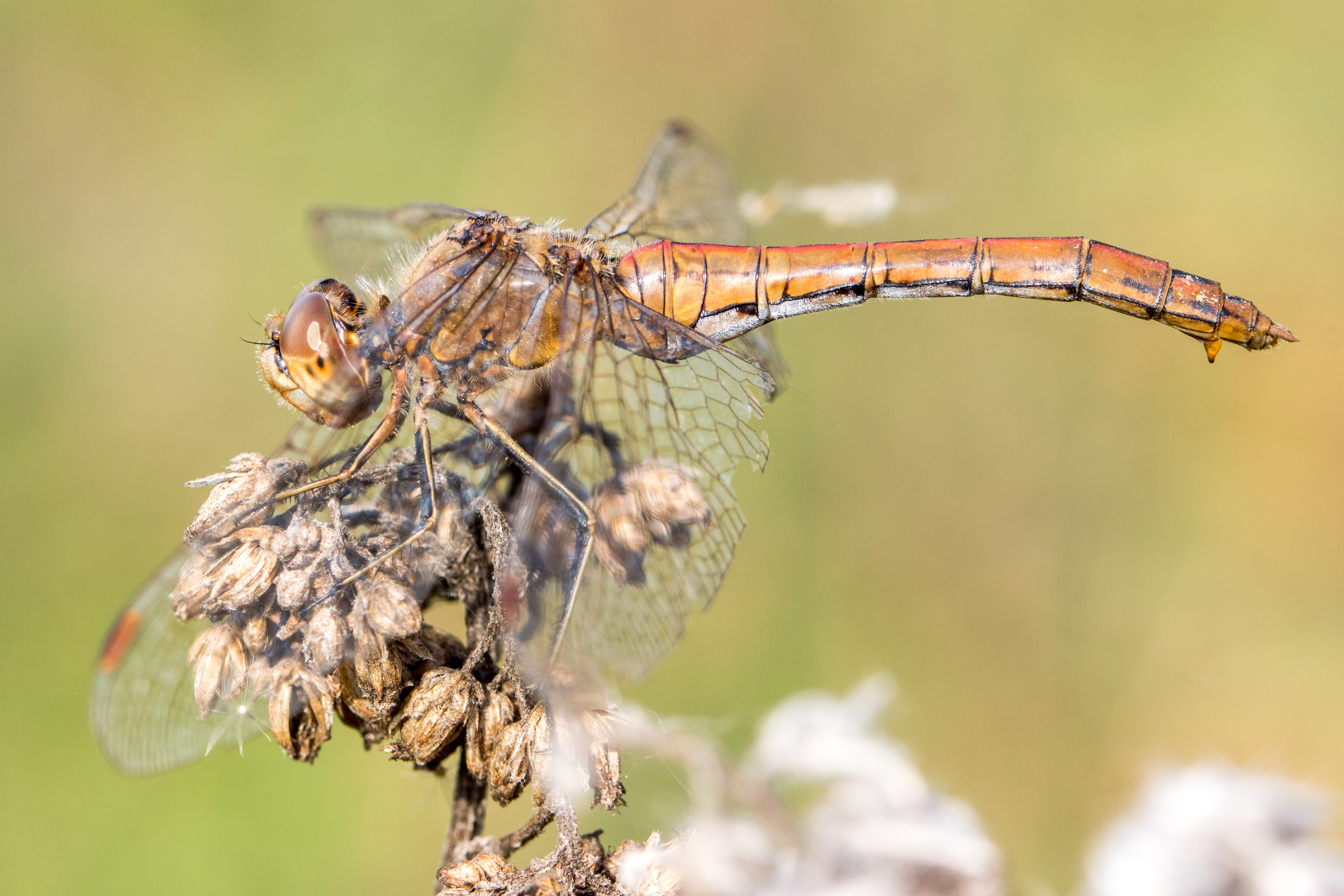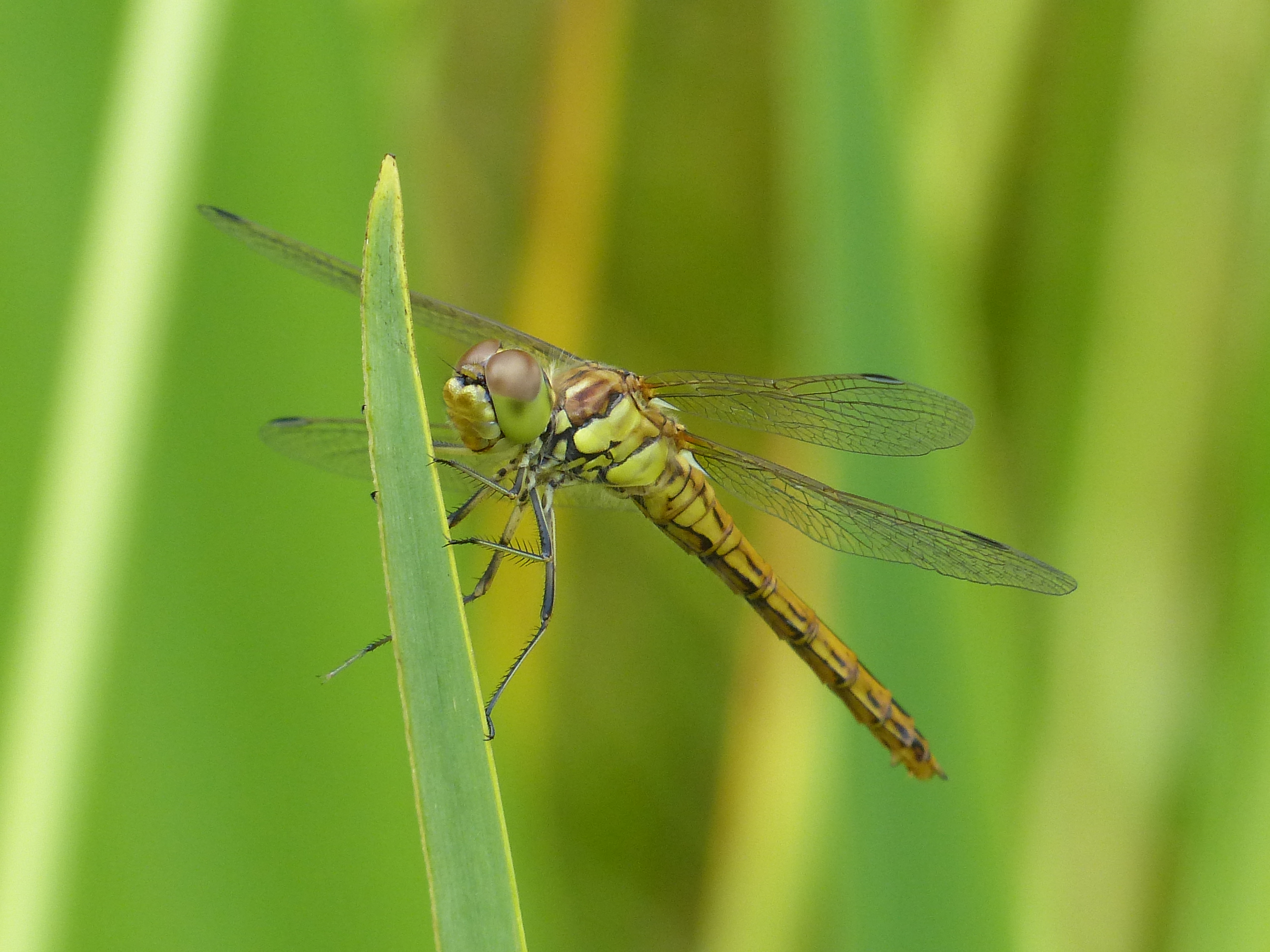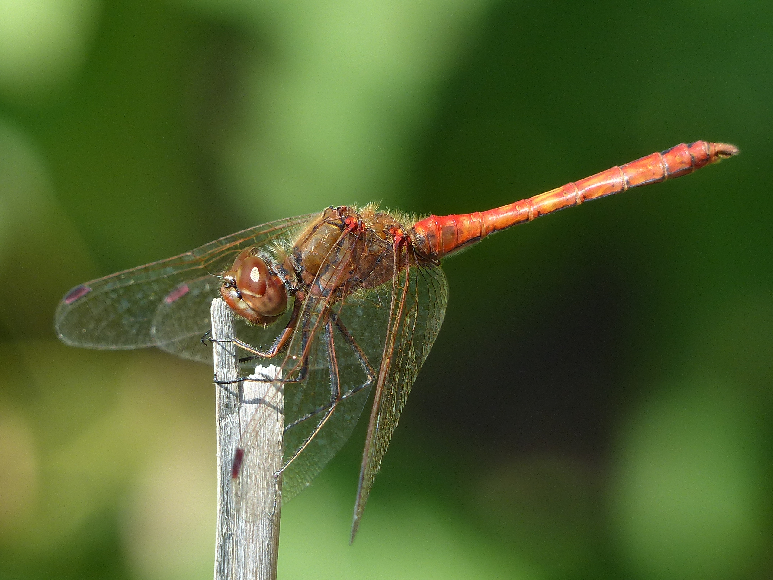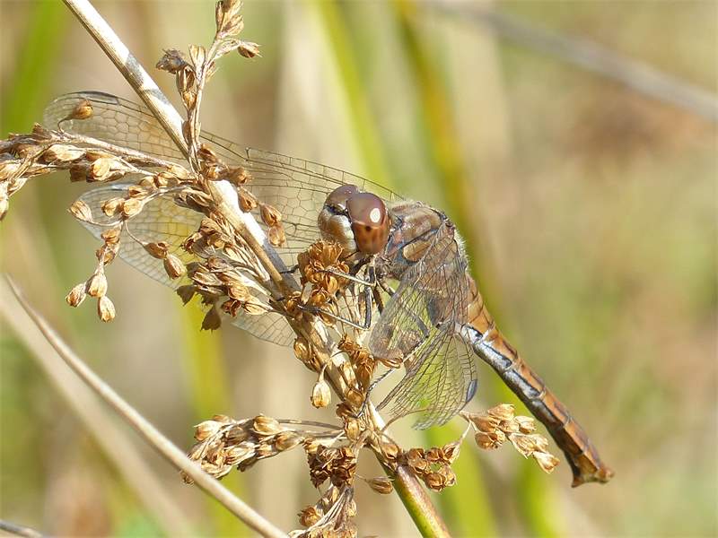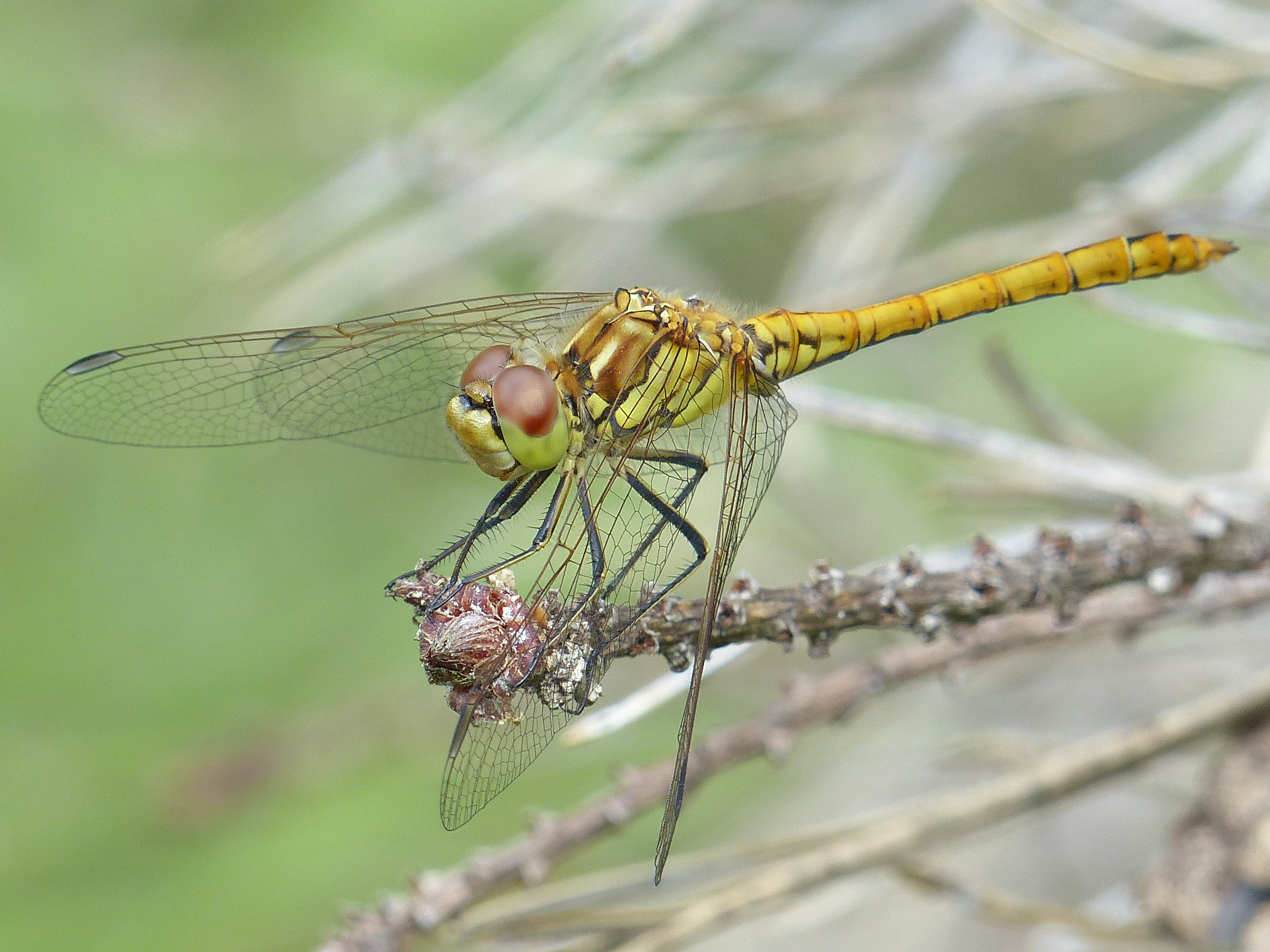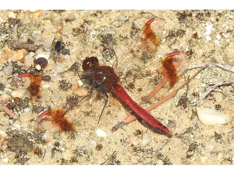 Gemeine Heidelibelle, Gemarkung Hohenprießnitz, Rieselgraben am Fichtbusch, altes Weibchen, Merkmale: gestreifte Beine, senkrecht abstehende Legescheide, August 2013