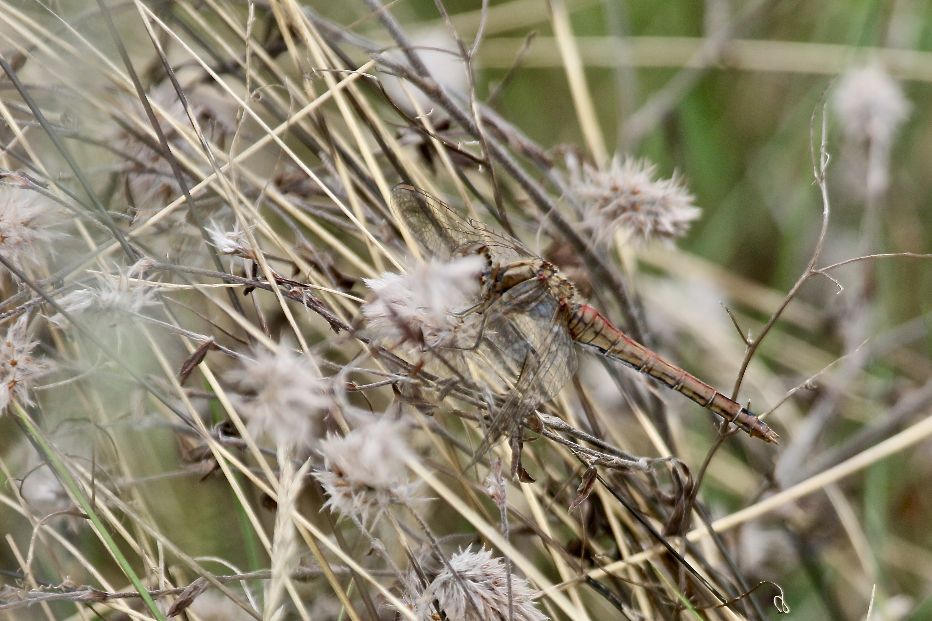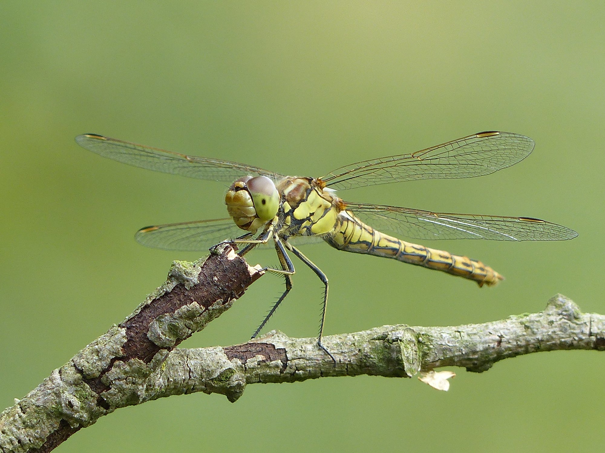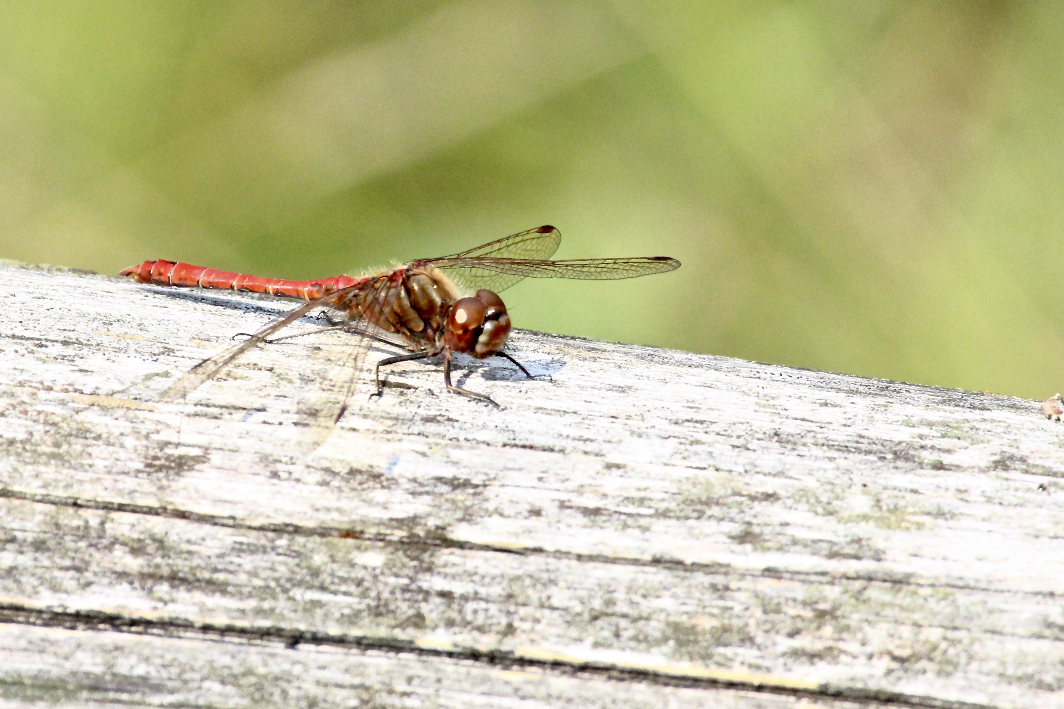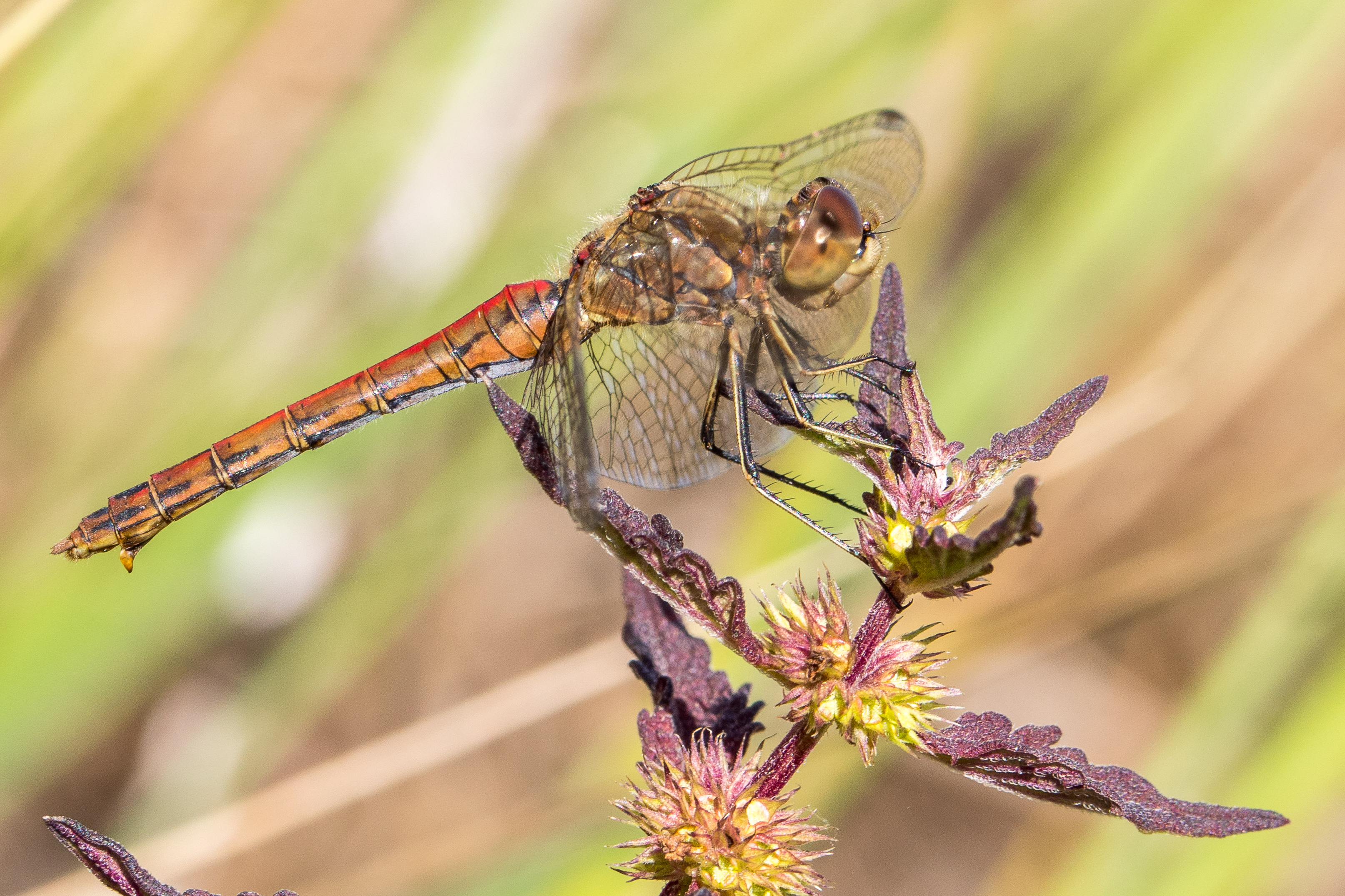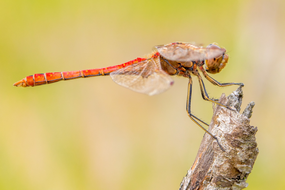 Gemeine Heidelibelle, Gemarkung Hohenprießnitz, Rieselgraben am Fichtbusch, altes Weibchen, Merkmale: gestreifte Beine, senkrecht abstehende Legescheide, August 2013