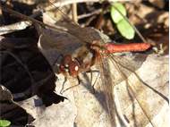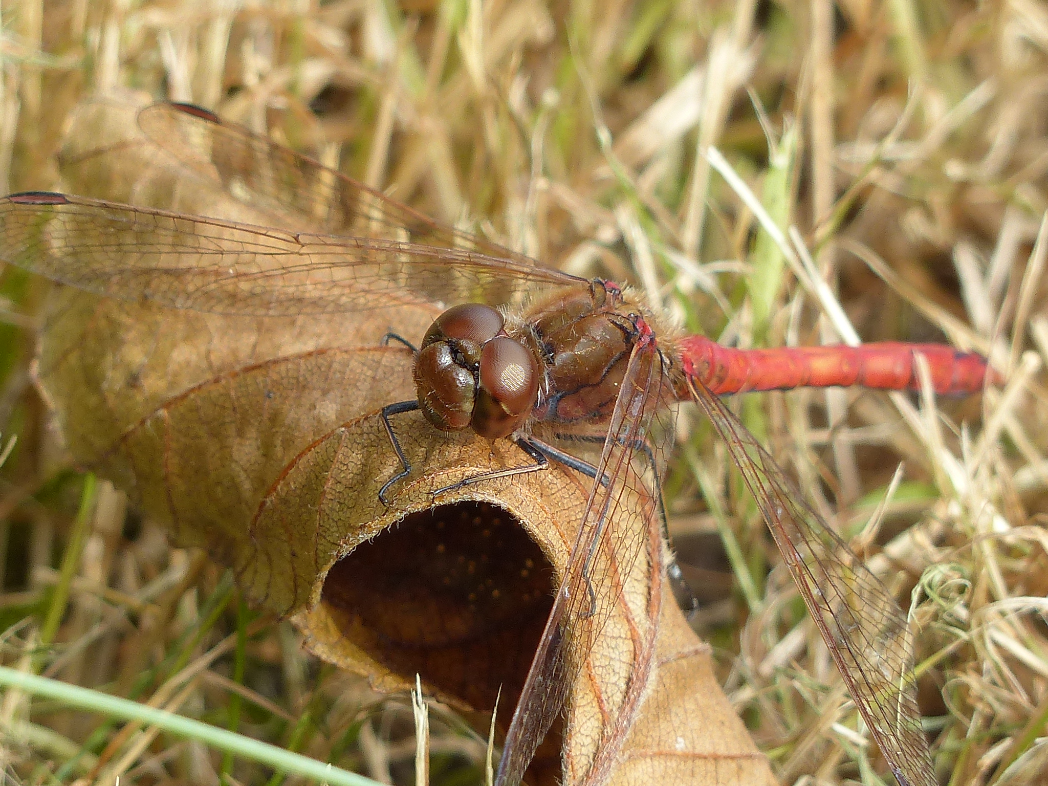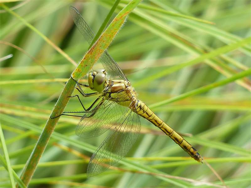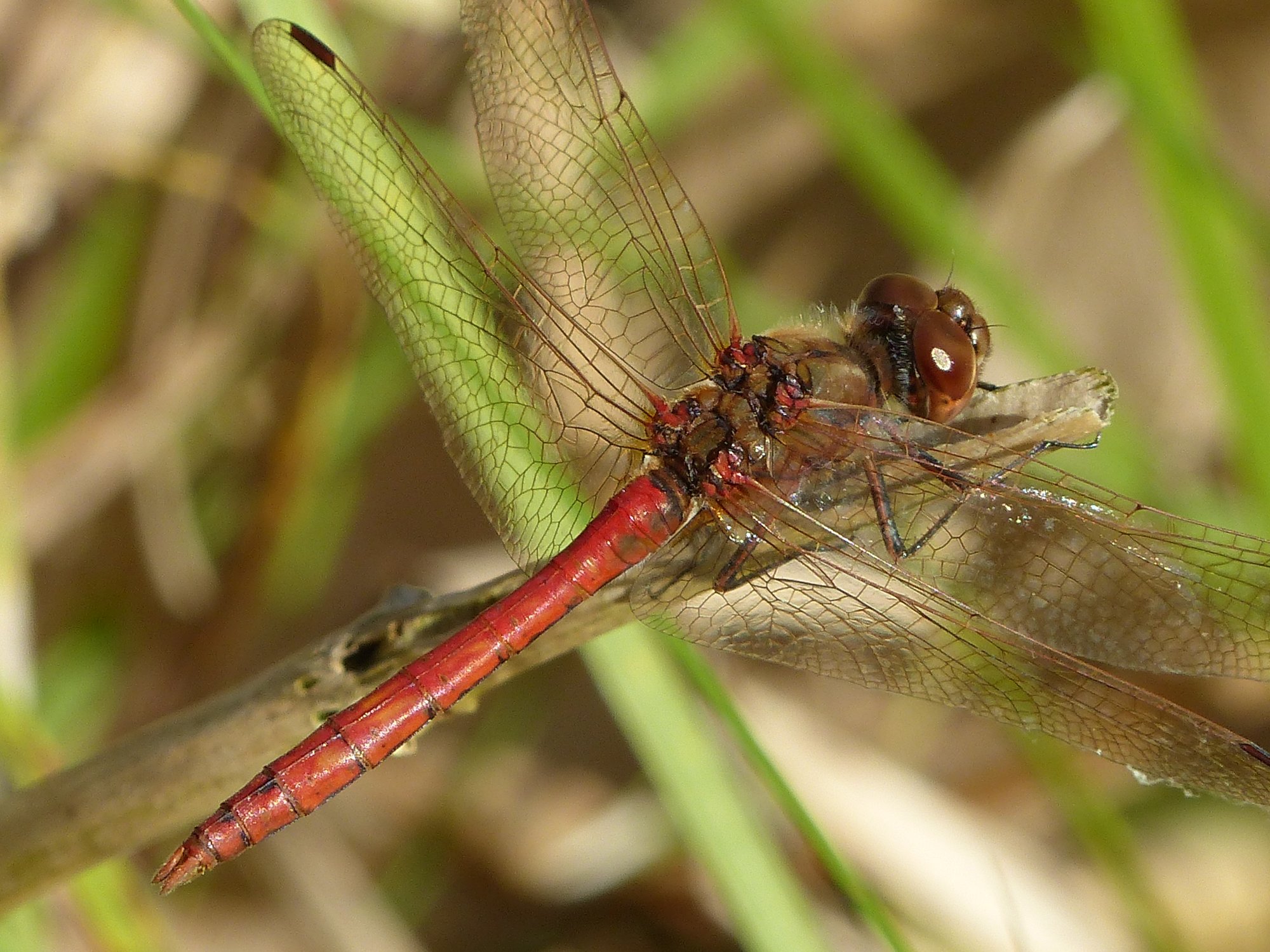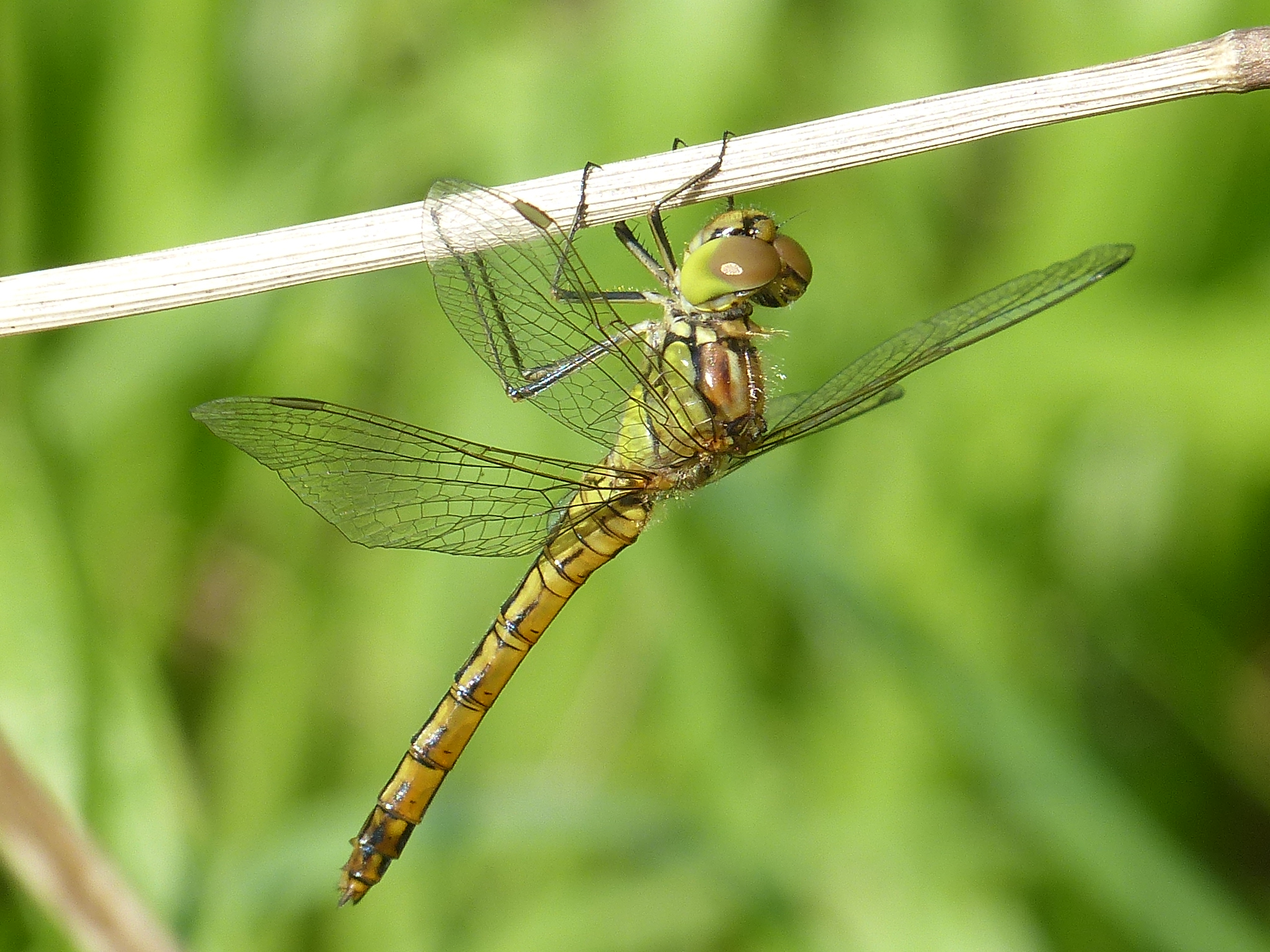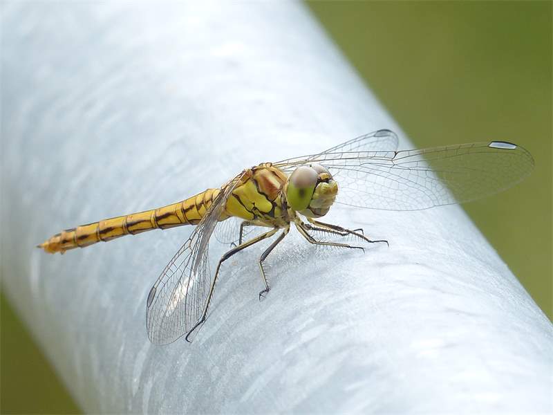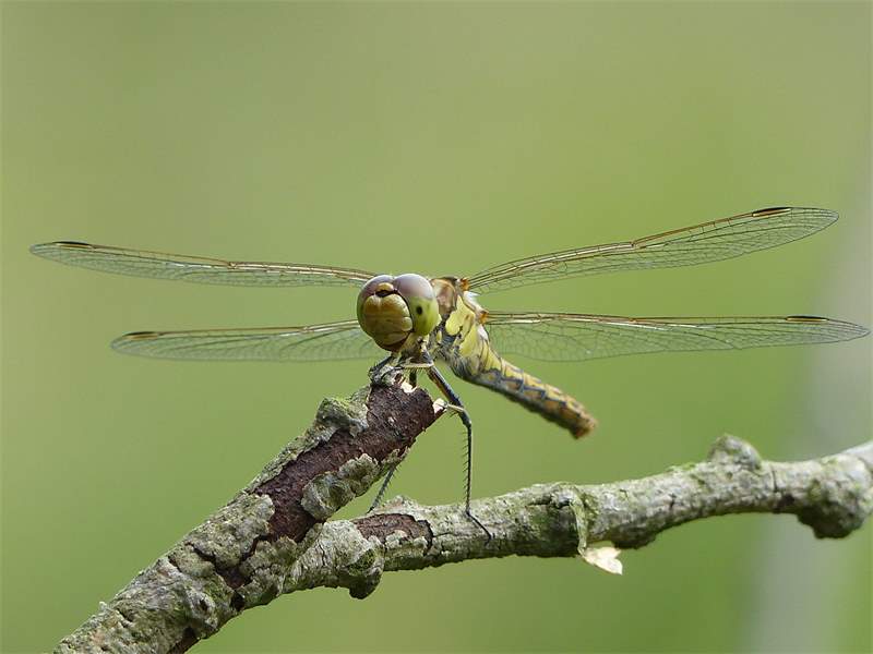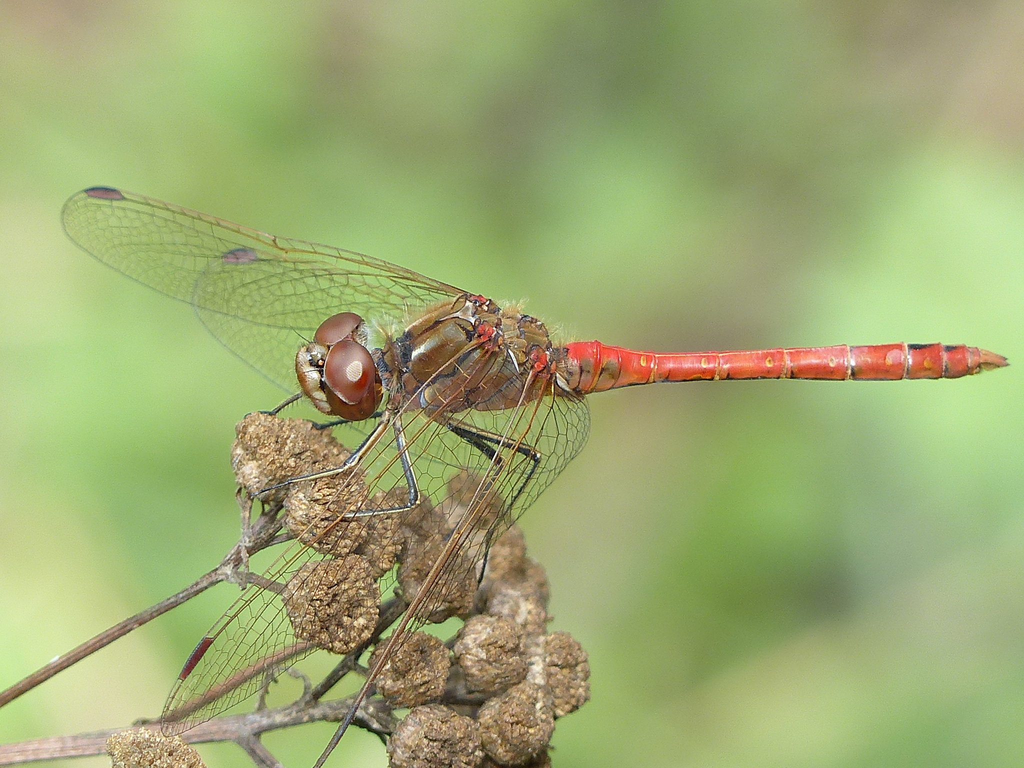 Gemeine Heidelibelle, Gemarkung Hohenprießnitz, Rieselgraben am Fichtbusch, altes Weibchen, Merkmale: gestreifte Beine, senkrecht abstehende Legescheide, August 2013