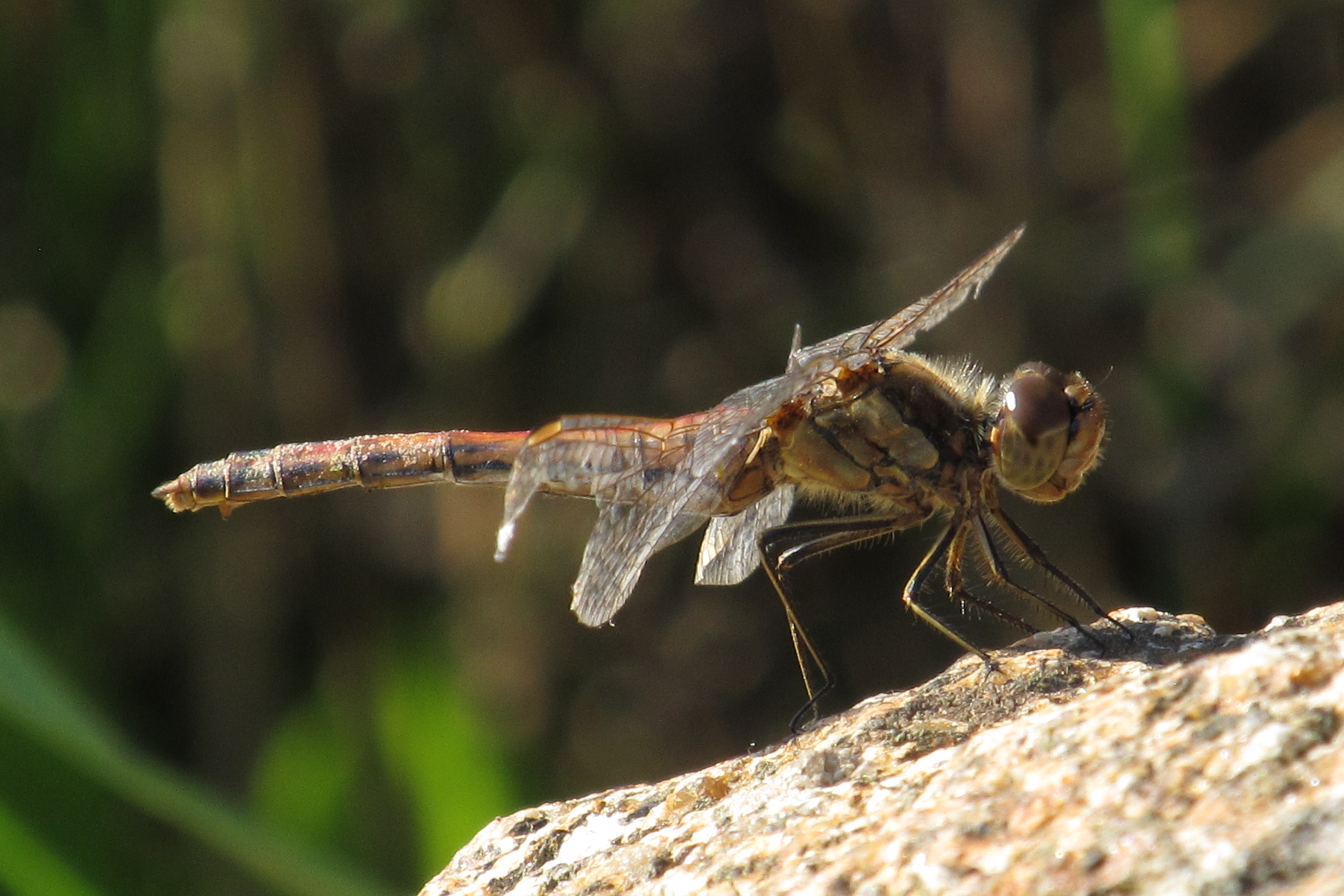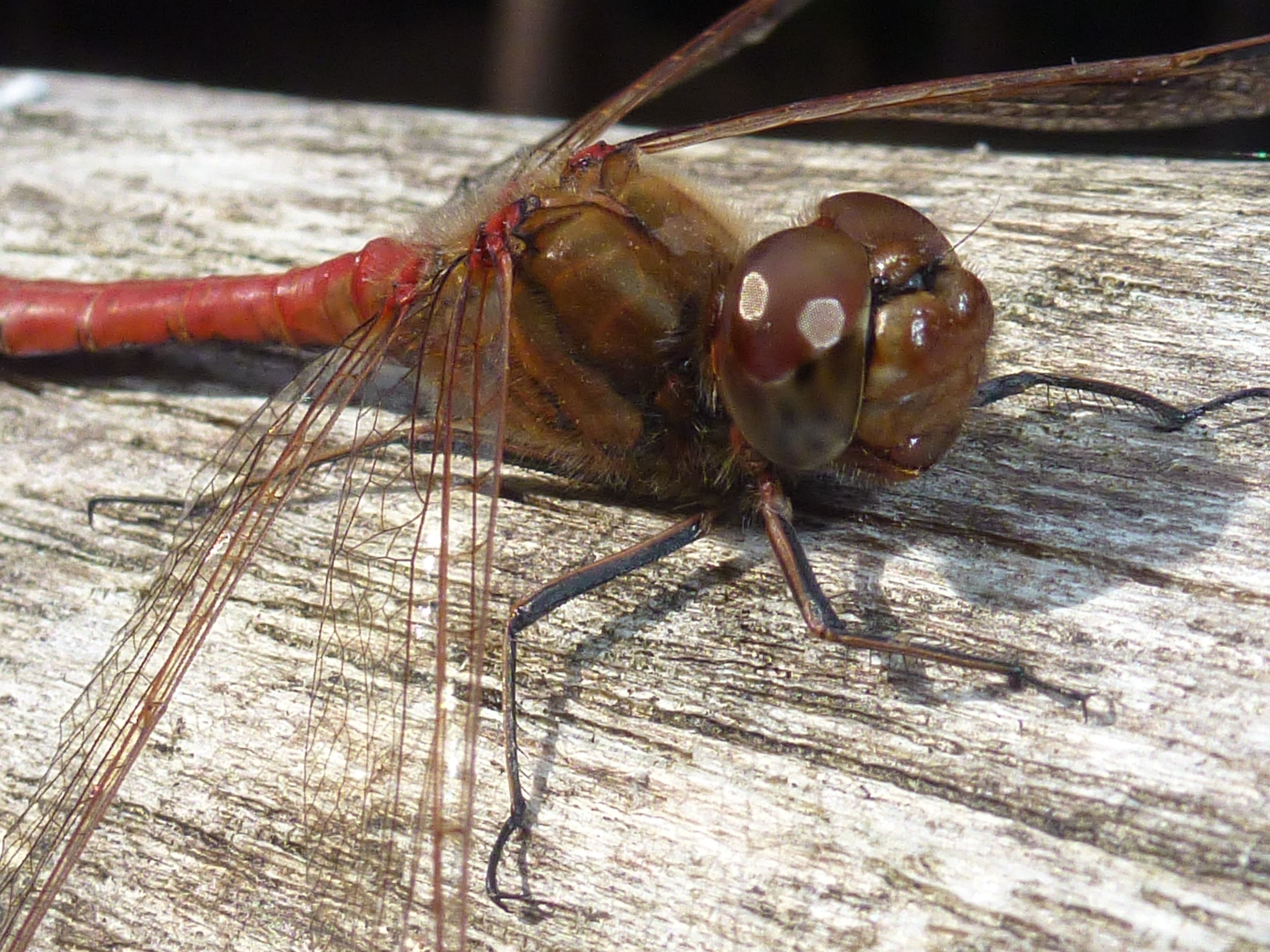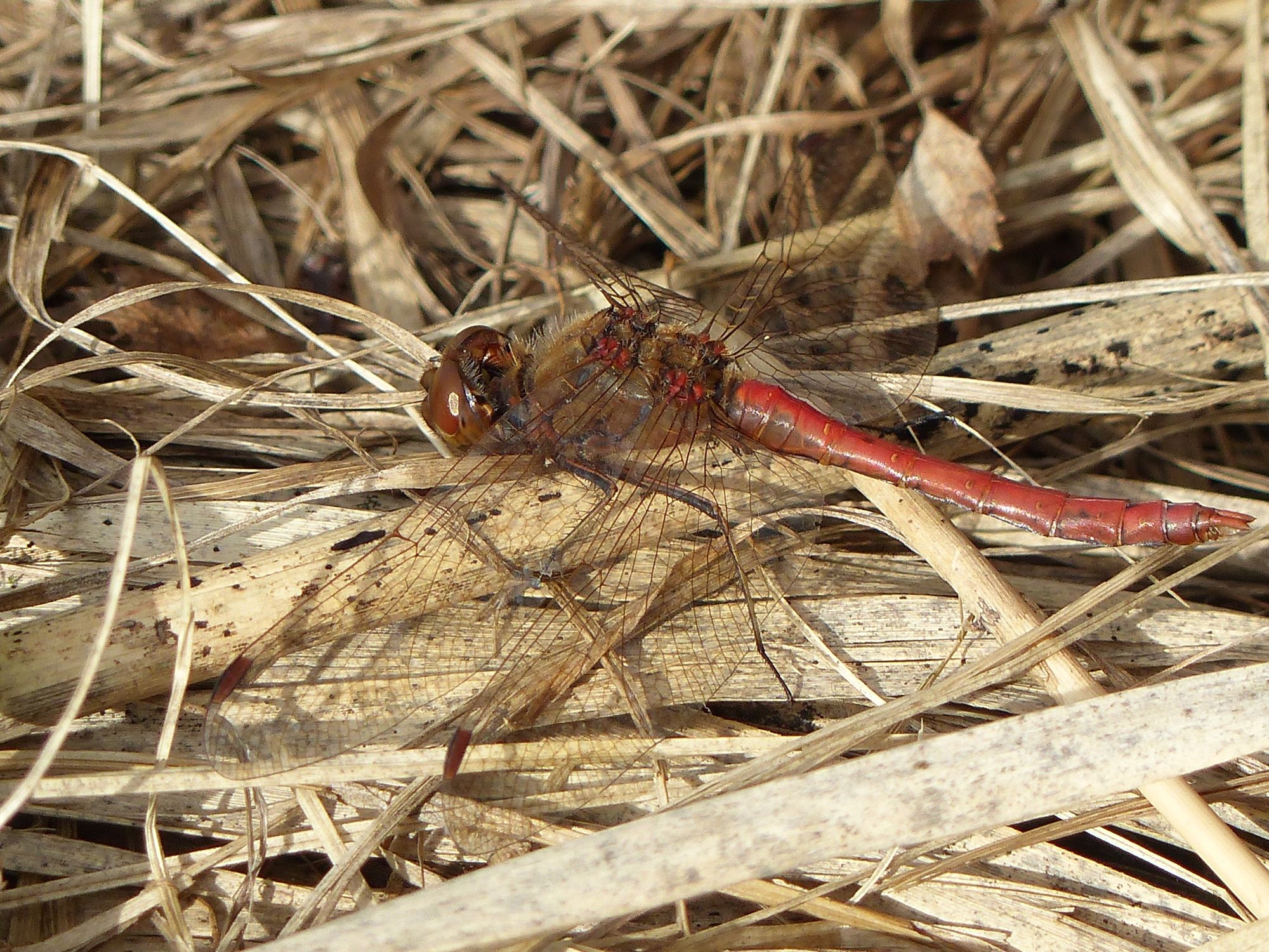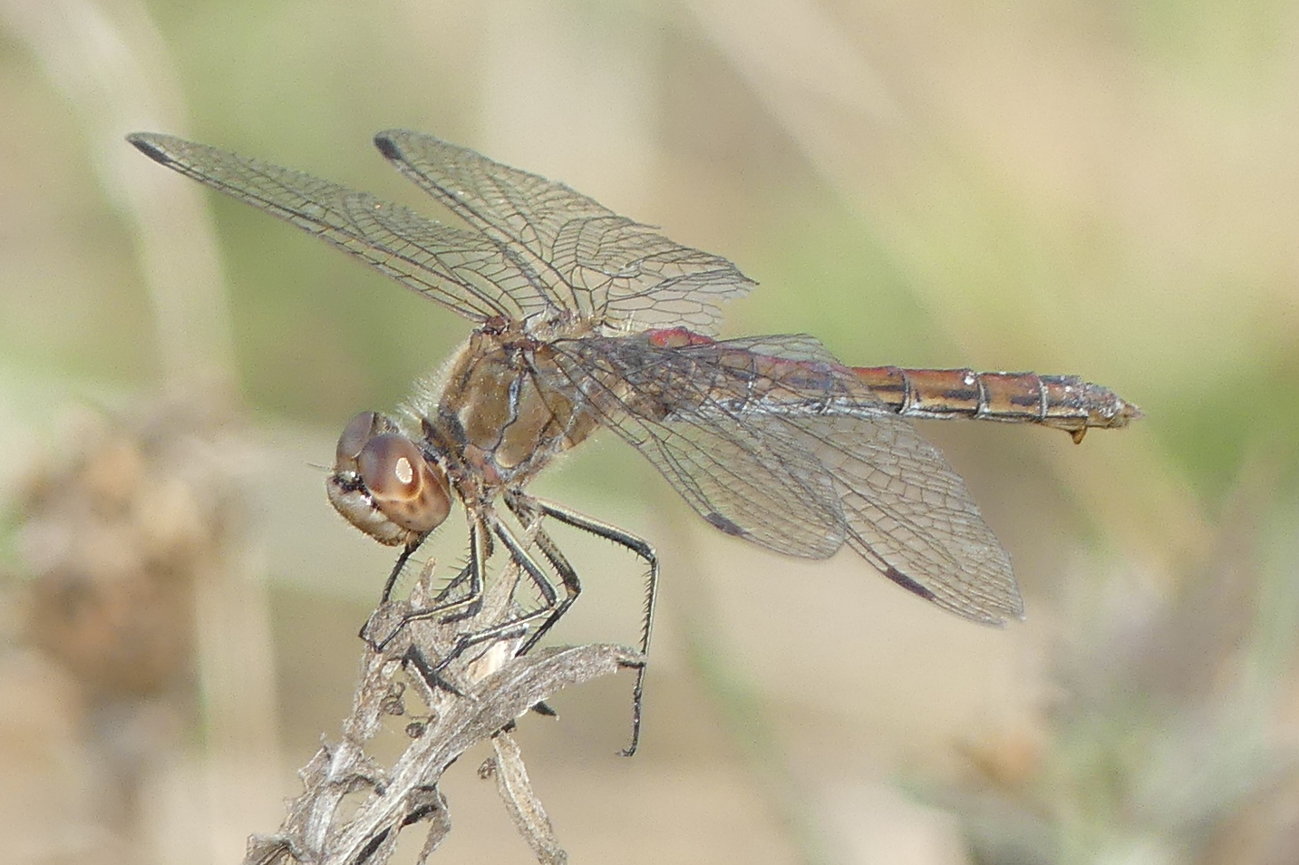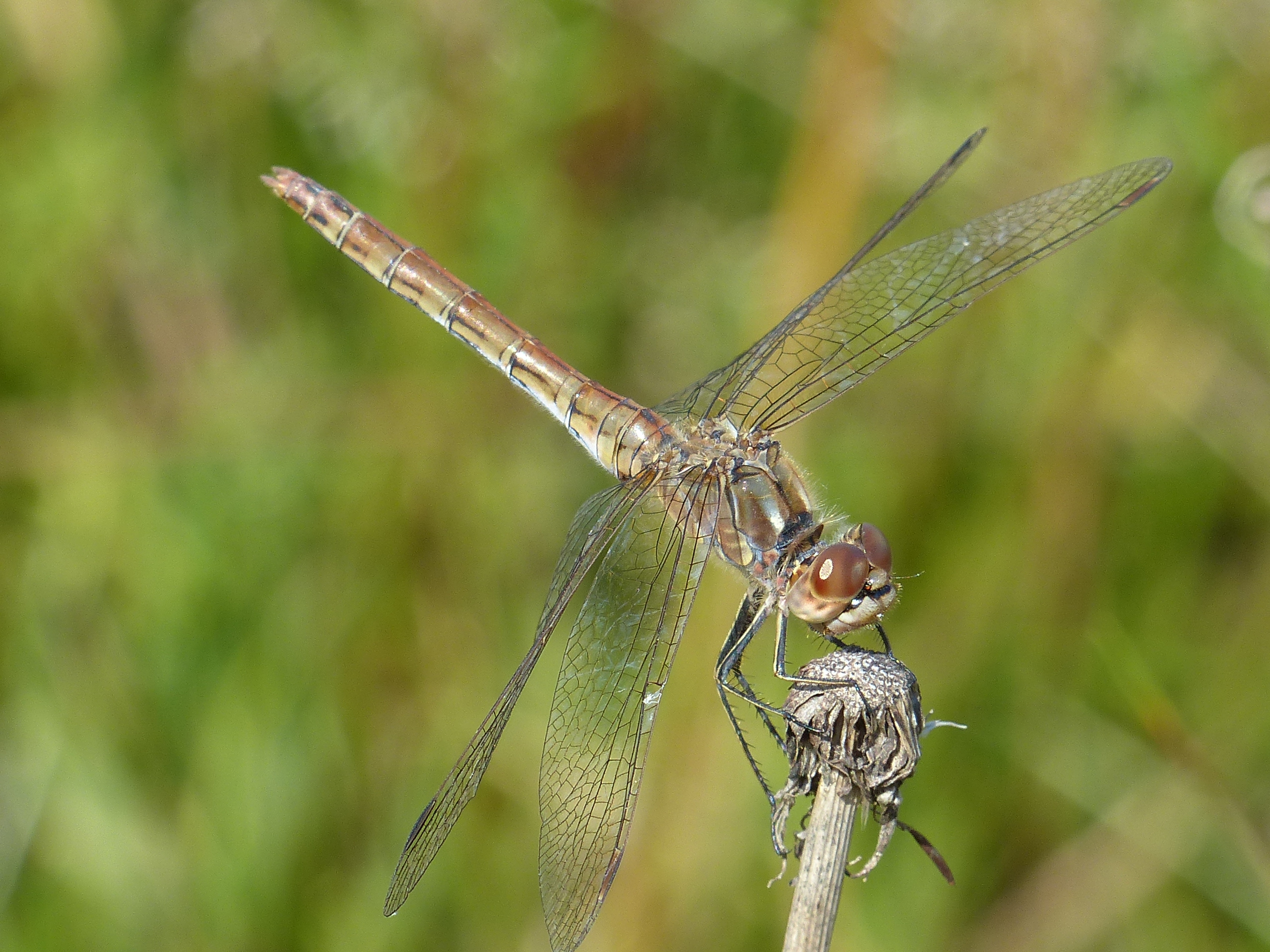 Gemeine Heidelibelle, Gemarkung Hohenprießnitz, Rieselgraben am Fichtbusch, altes Weibchen, Merkmale: gestreifte Beine, senkrecht abstehende Legescheide, August 2013