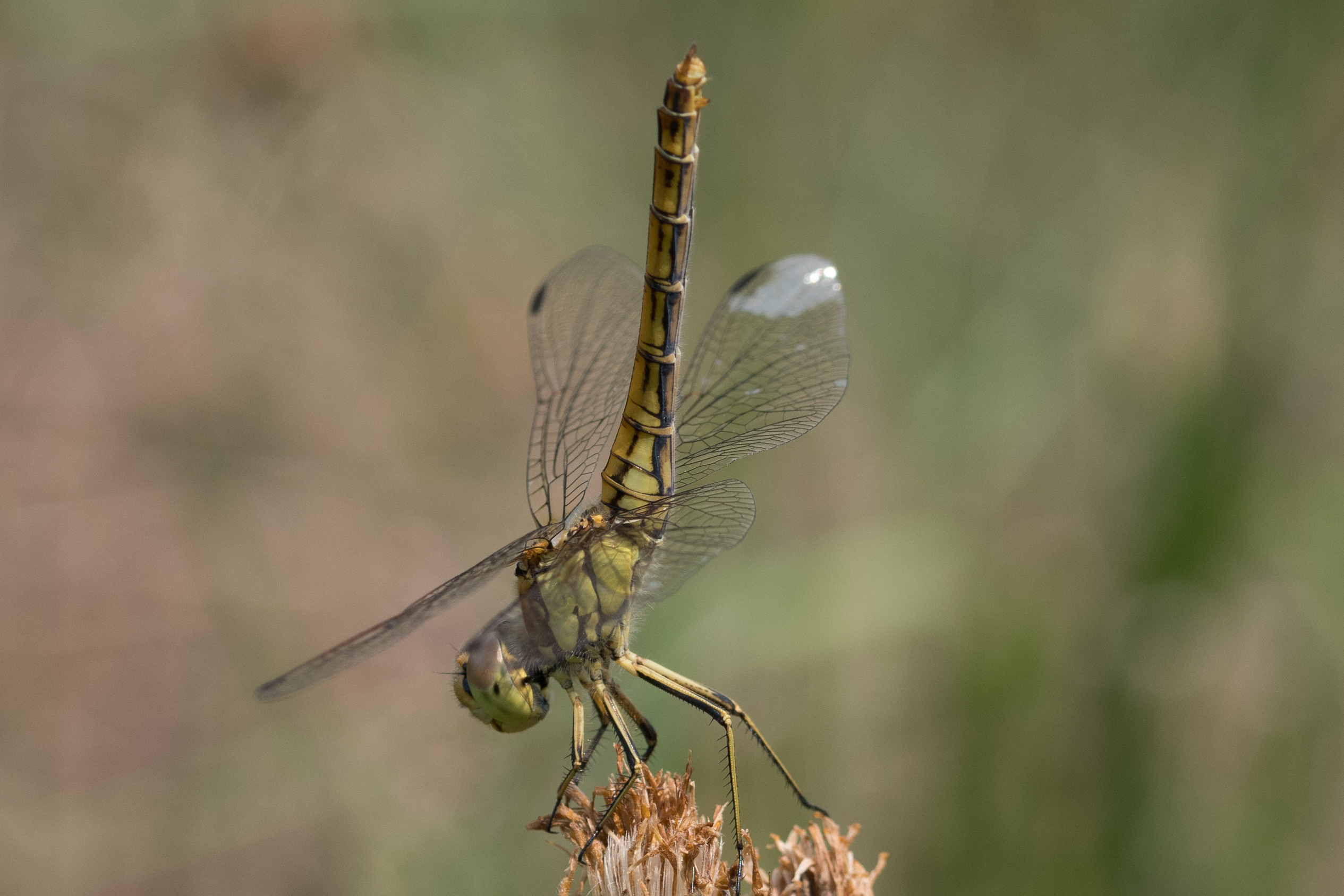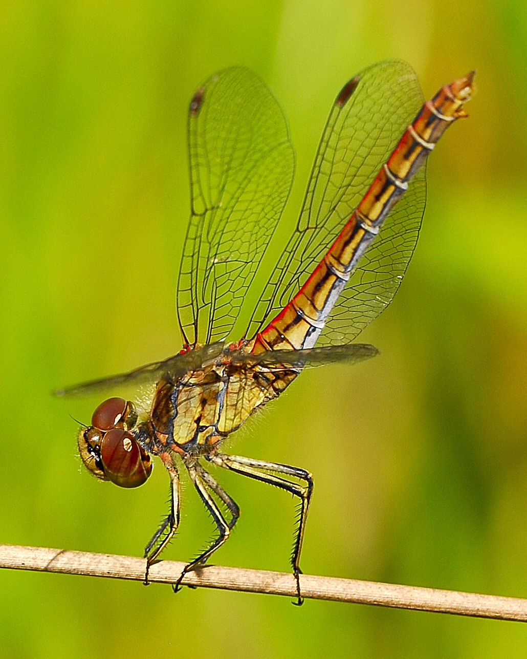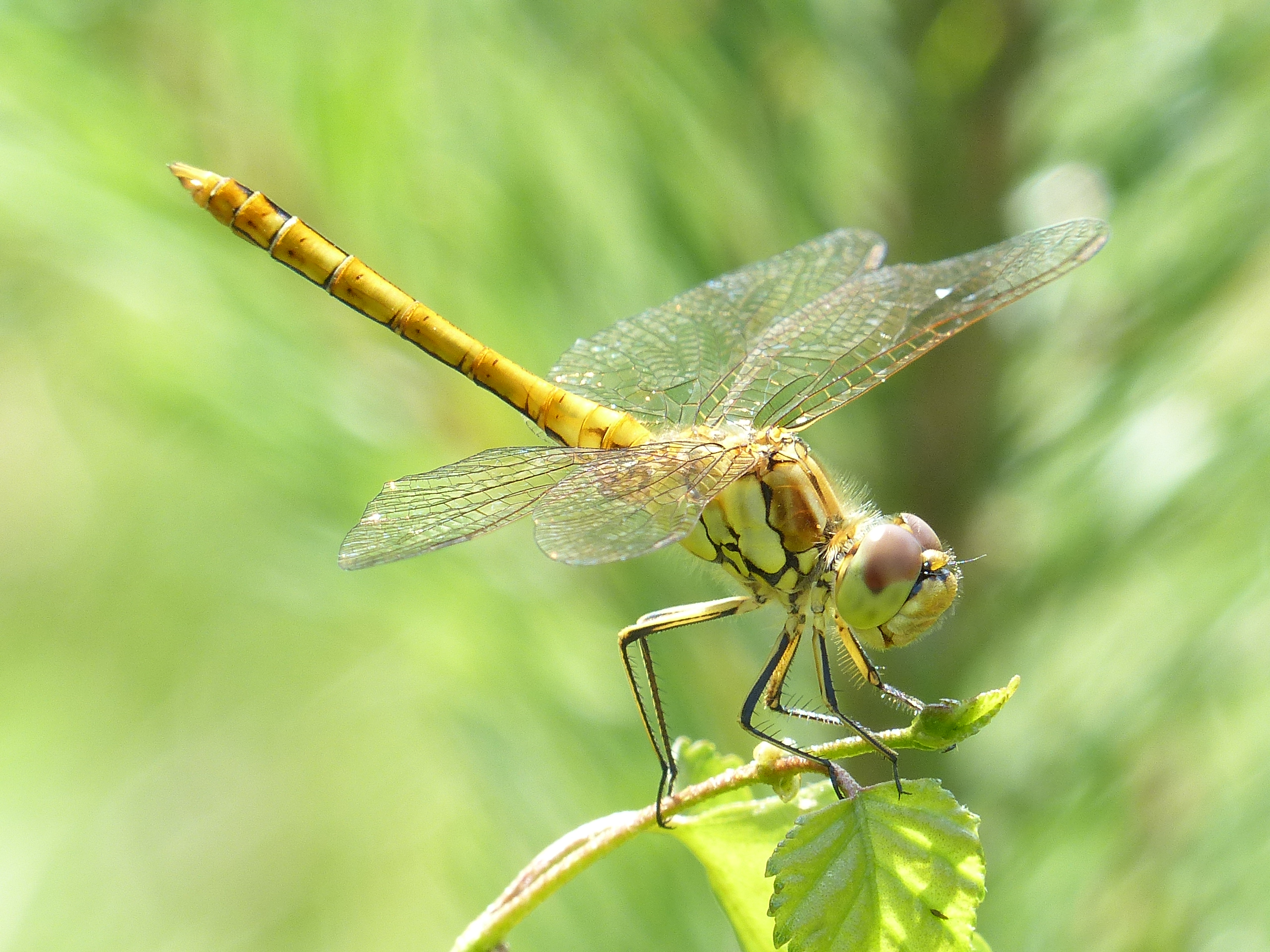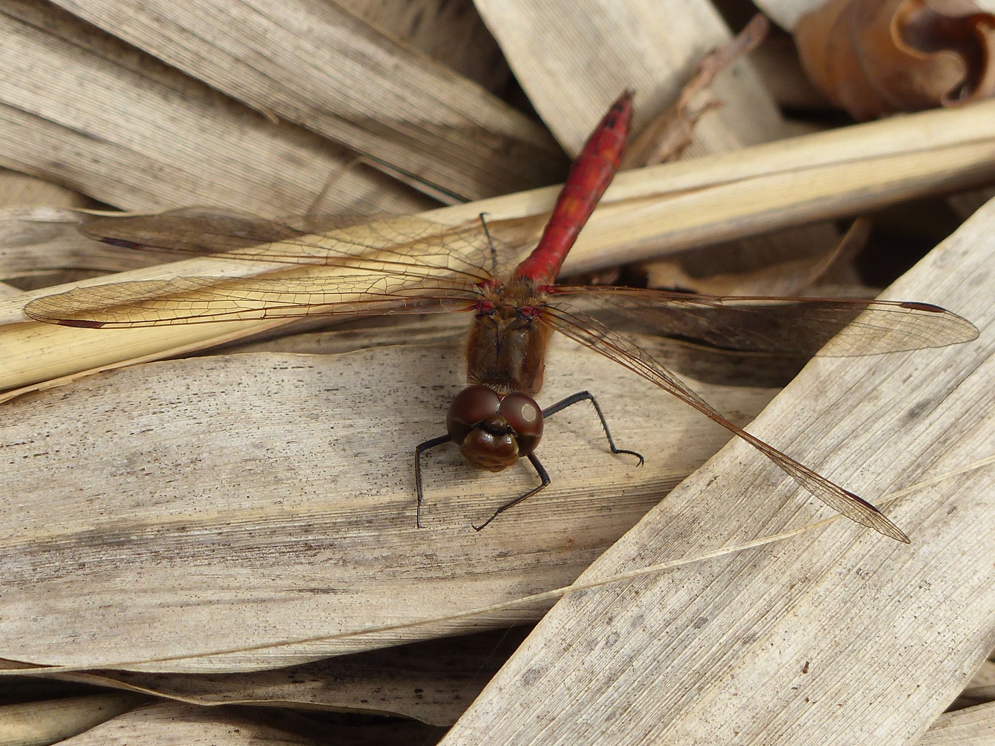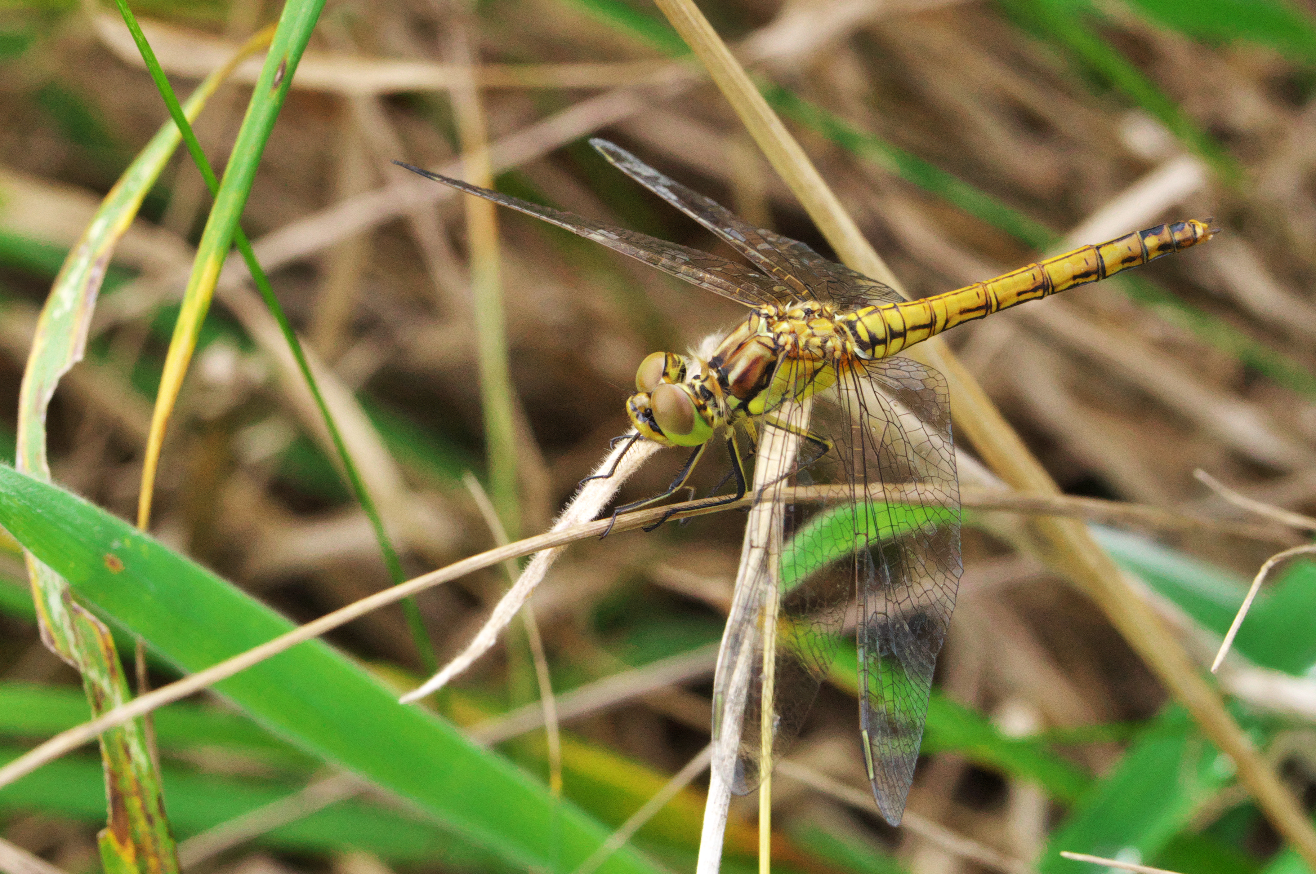 Gemeine Heidelibelle, Gemarkung Hohenprießnitz, Rieselgraben am Fichtbusch, altes Weibchen, Merkmale: gestreifte Beine, senkrecht abstehende Legescheide, August 2013