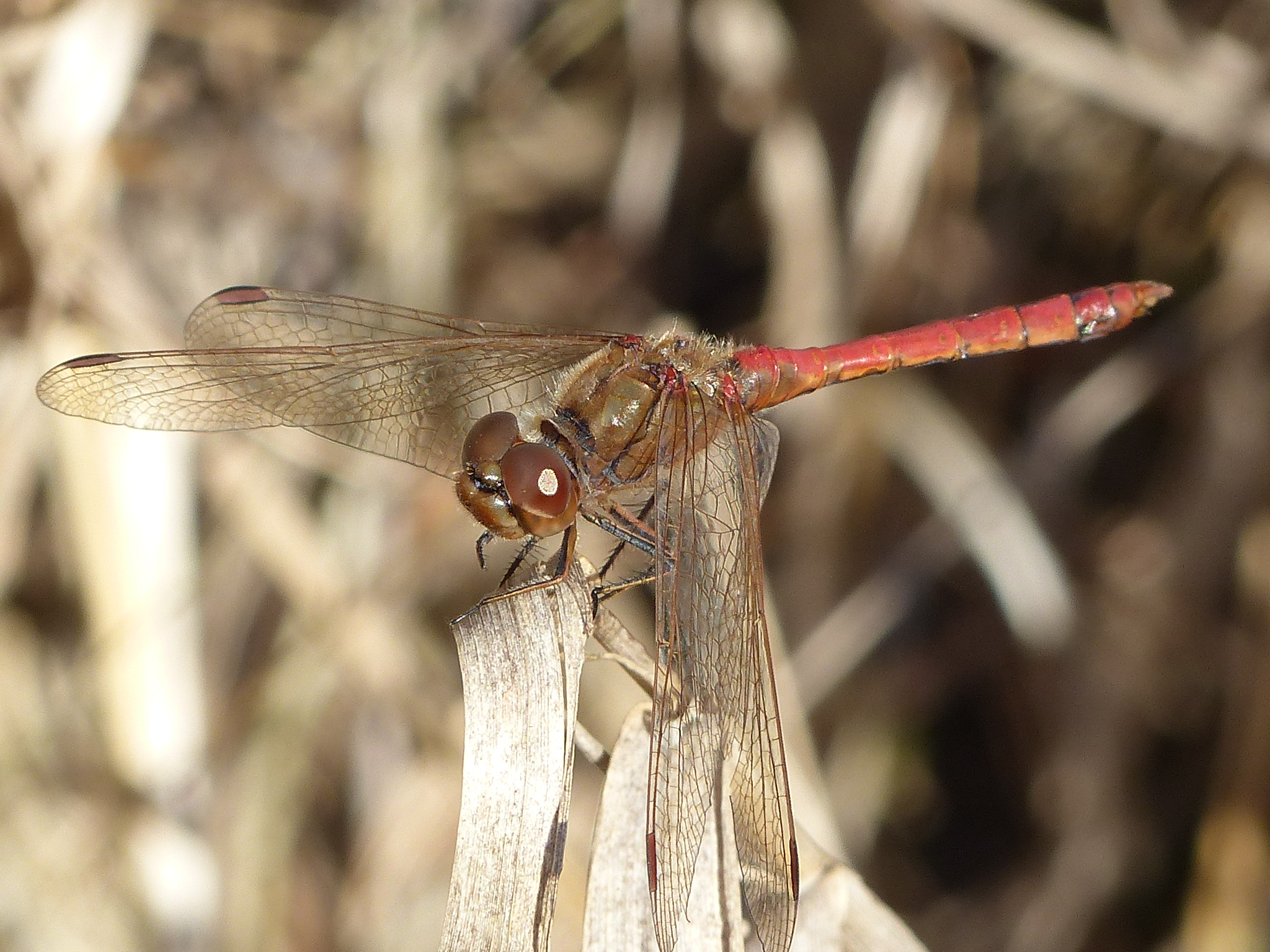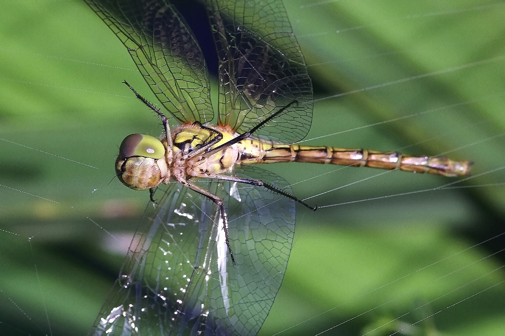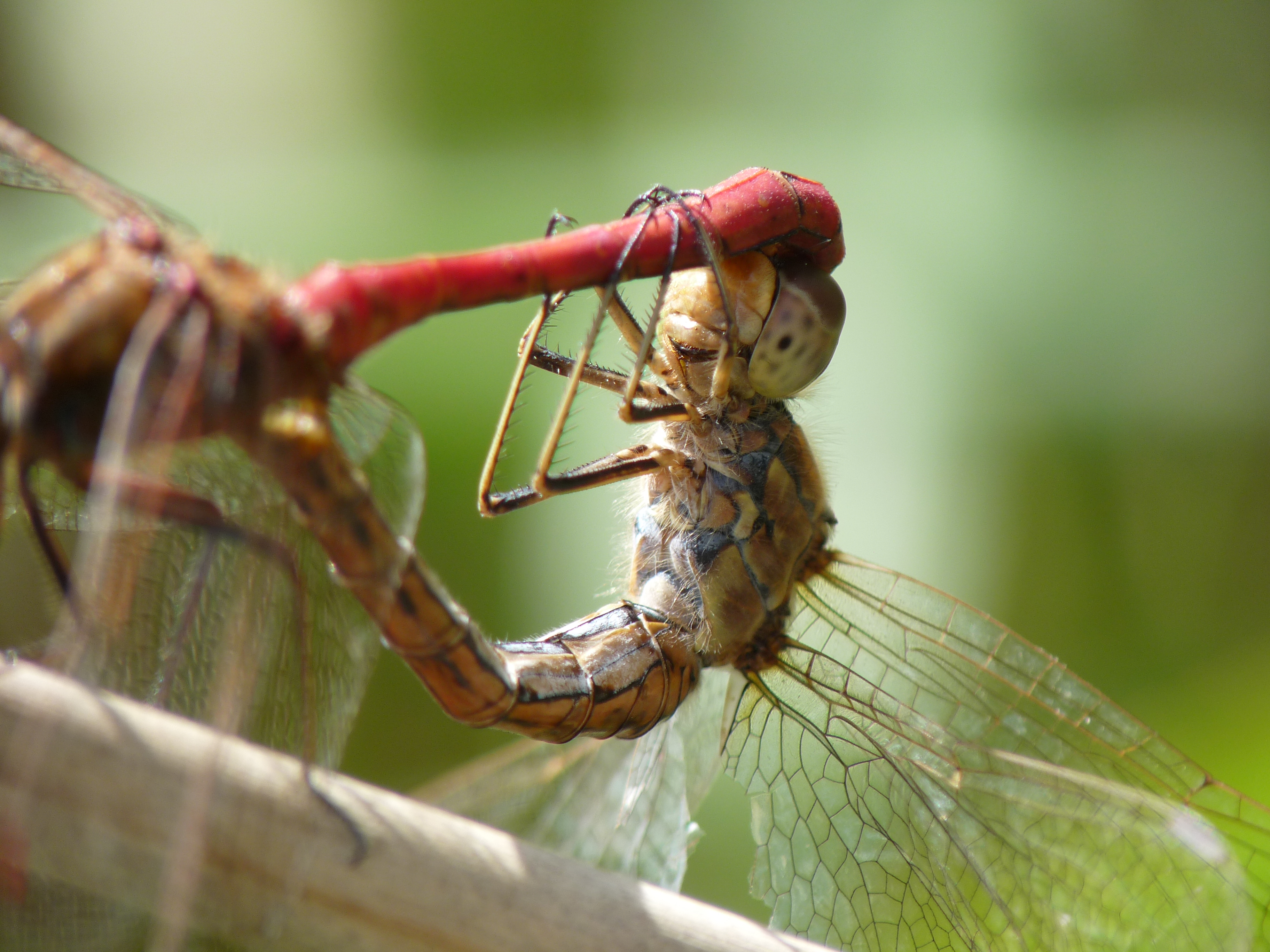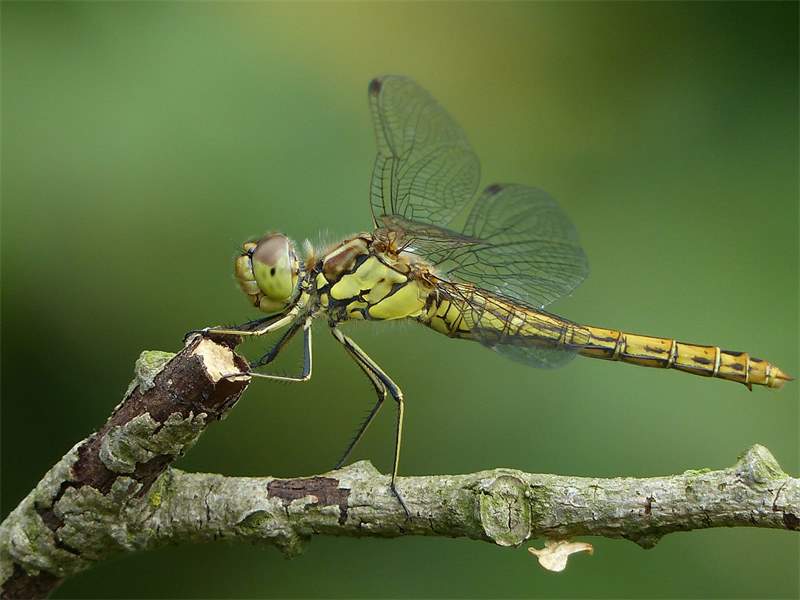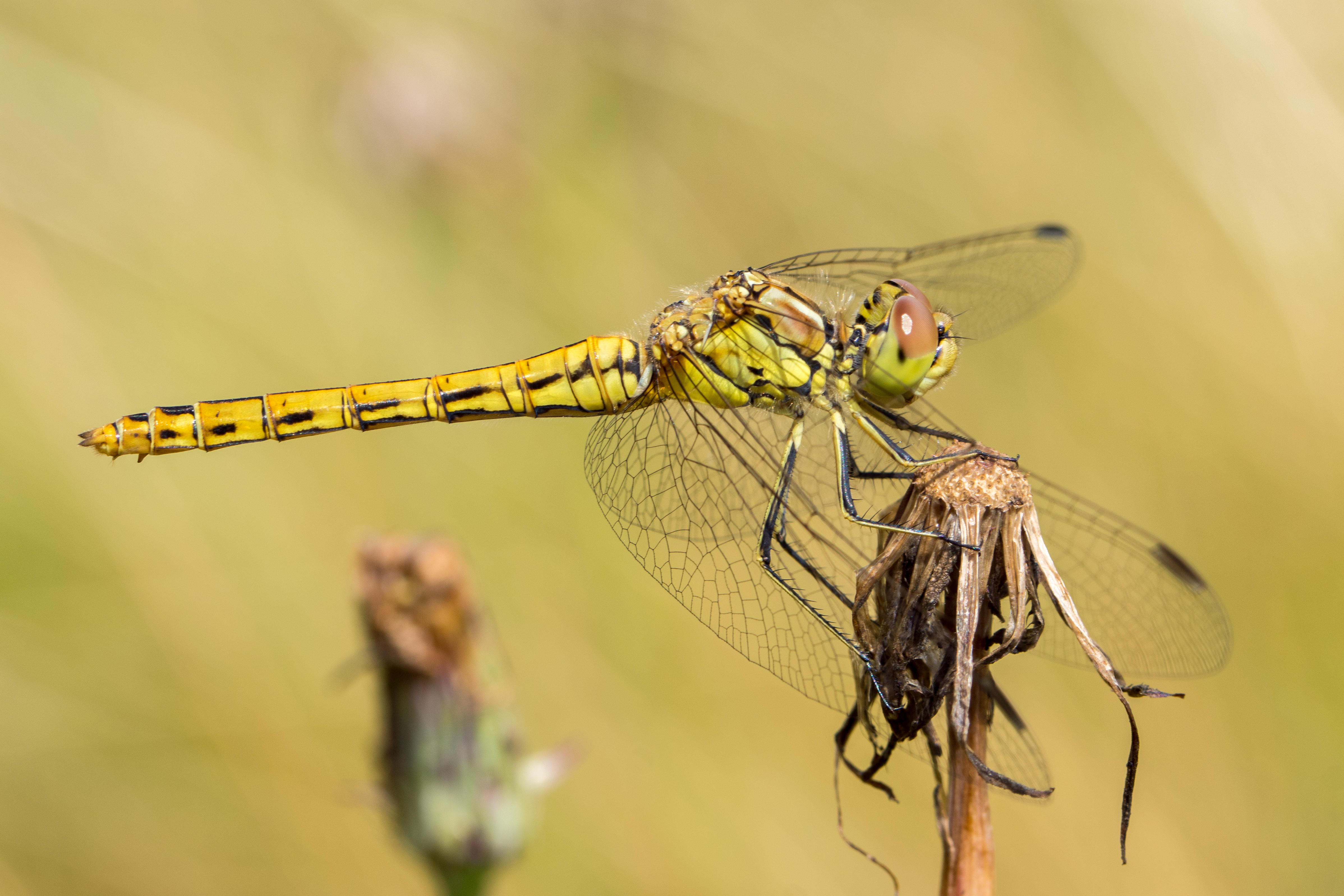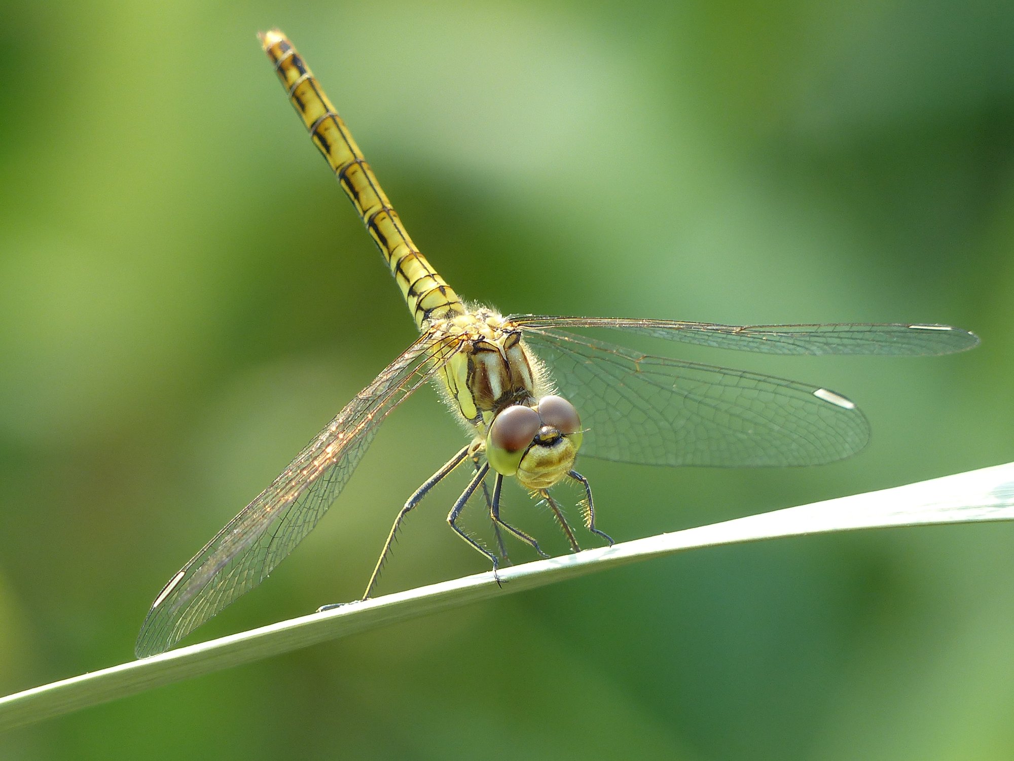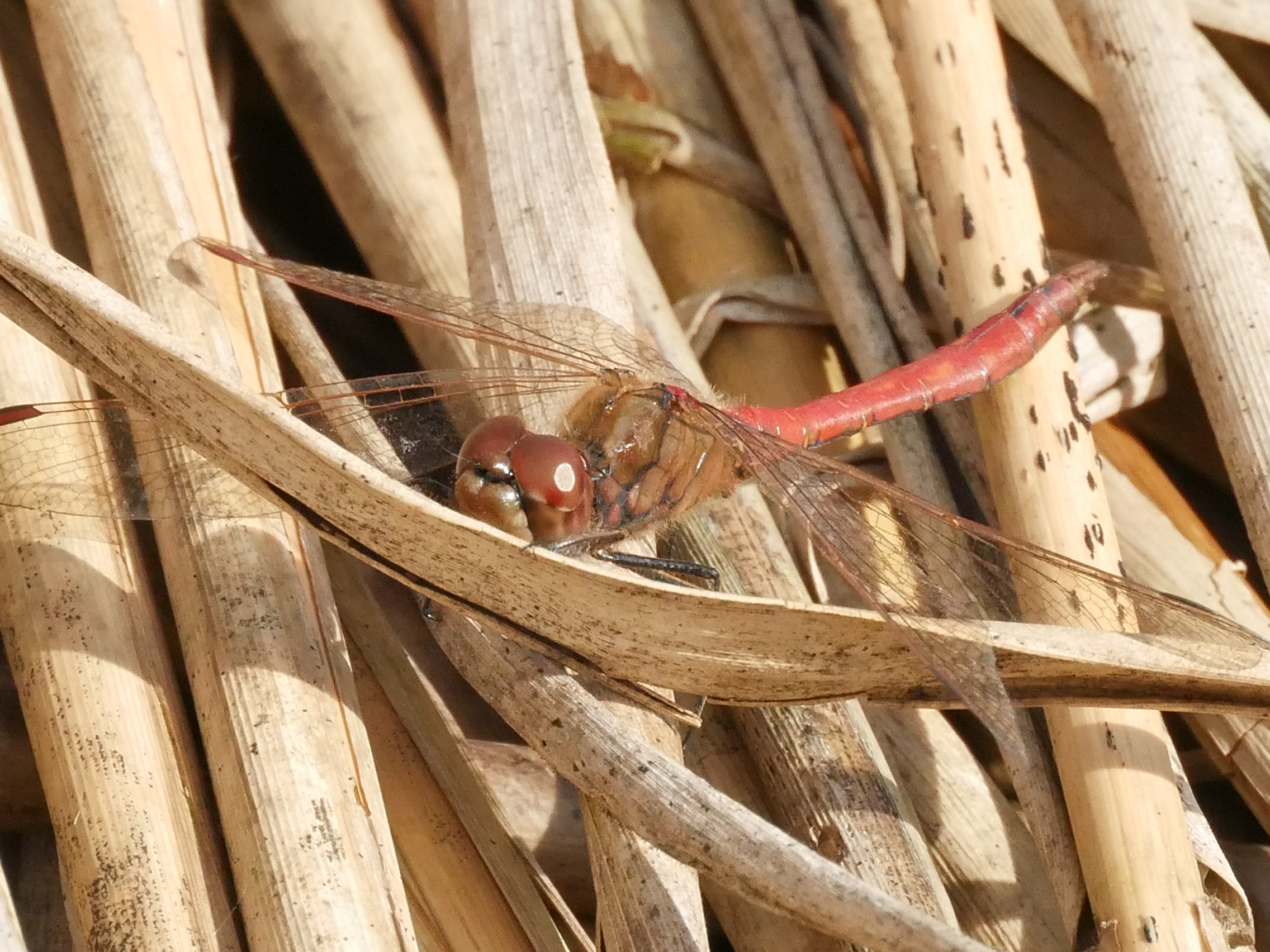 Gemeine Heidelibelle, Gemarkung Hohenprießnitz, Rieselgraben am Fichtbusch, altes Weibchen, Merkmale: gestreifte Beine, senkrecht abstehende Legescheide, August 2013