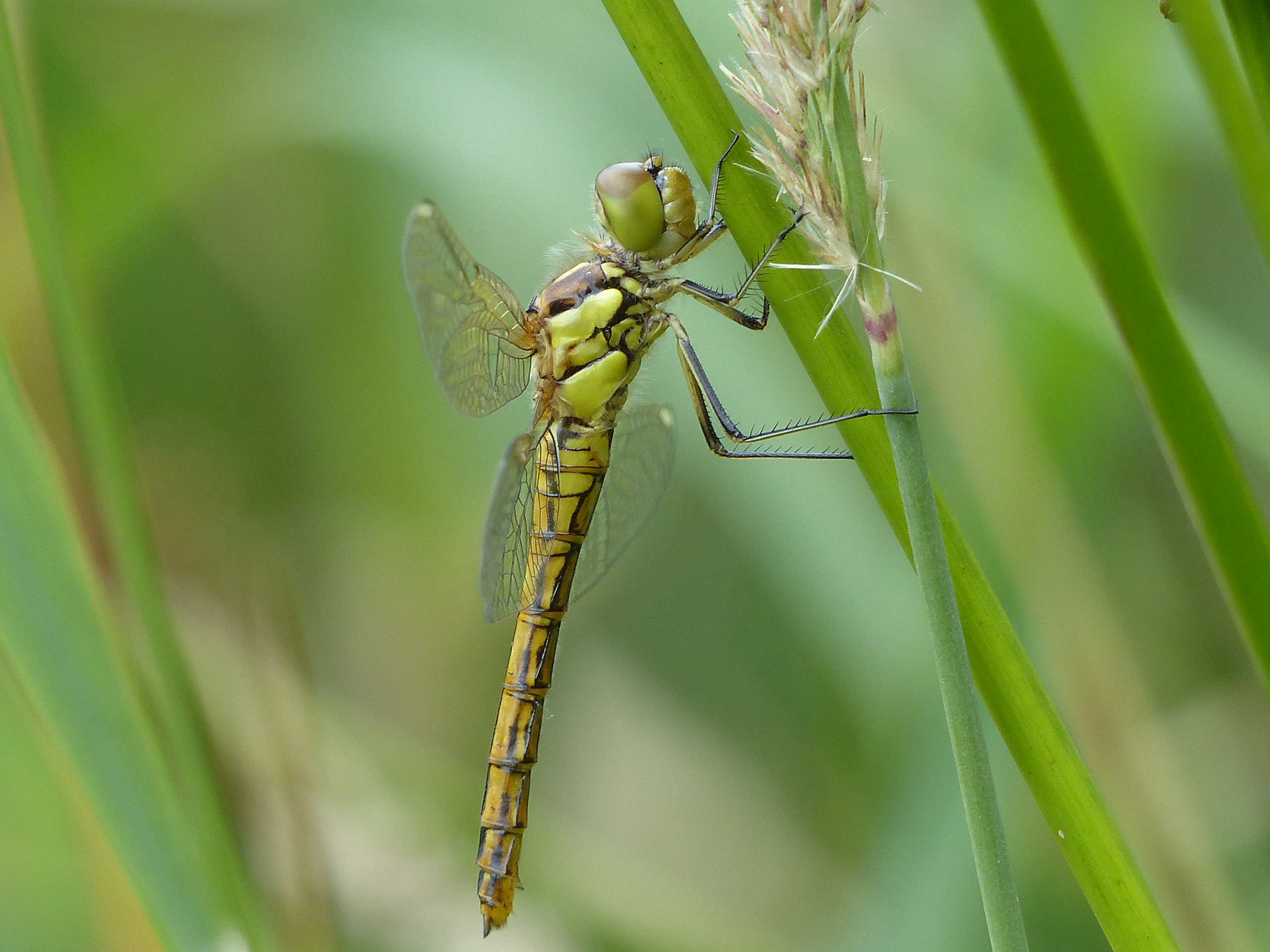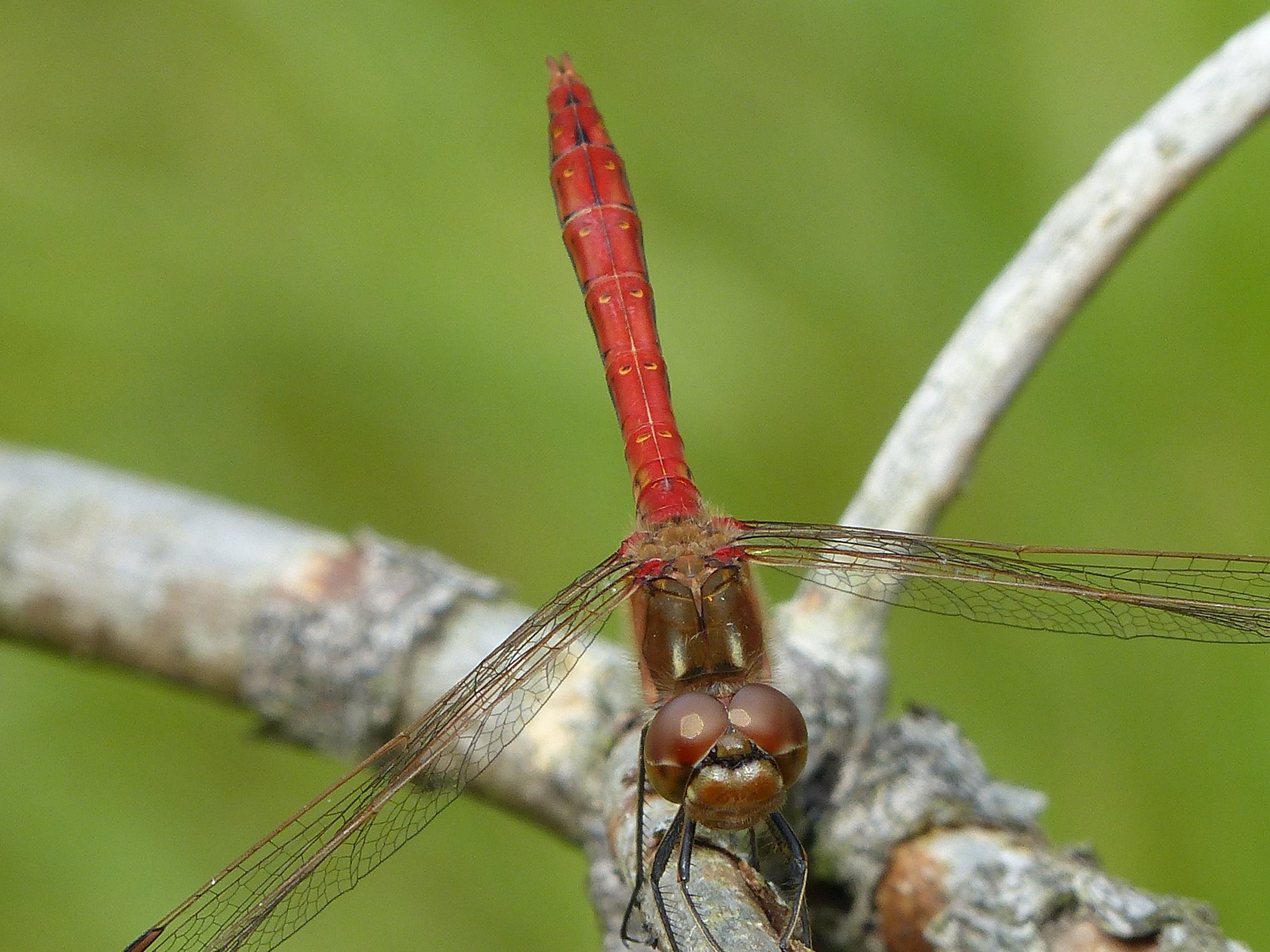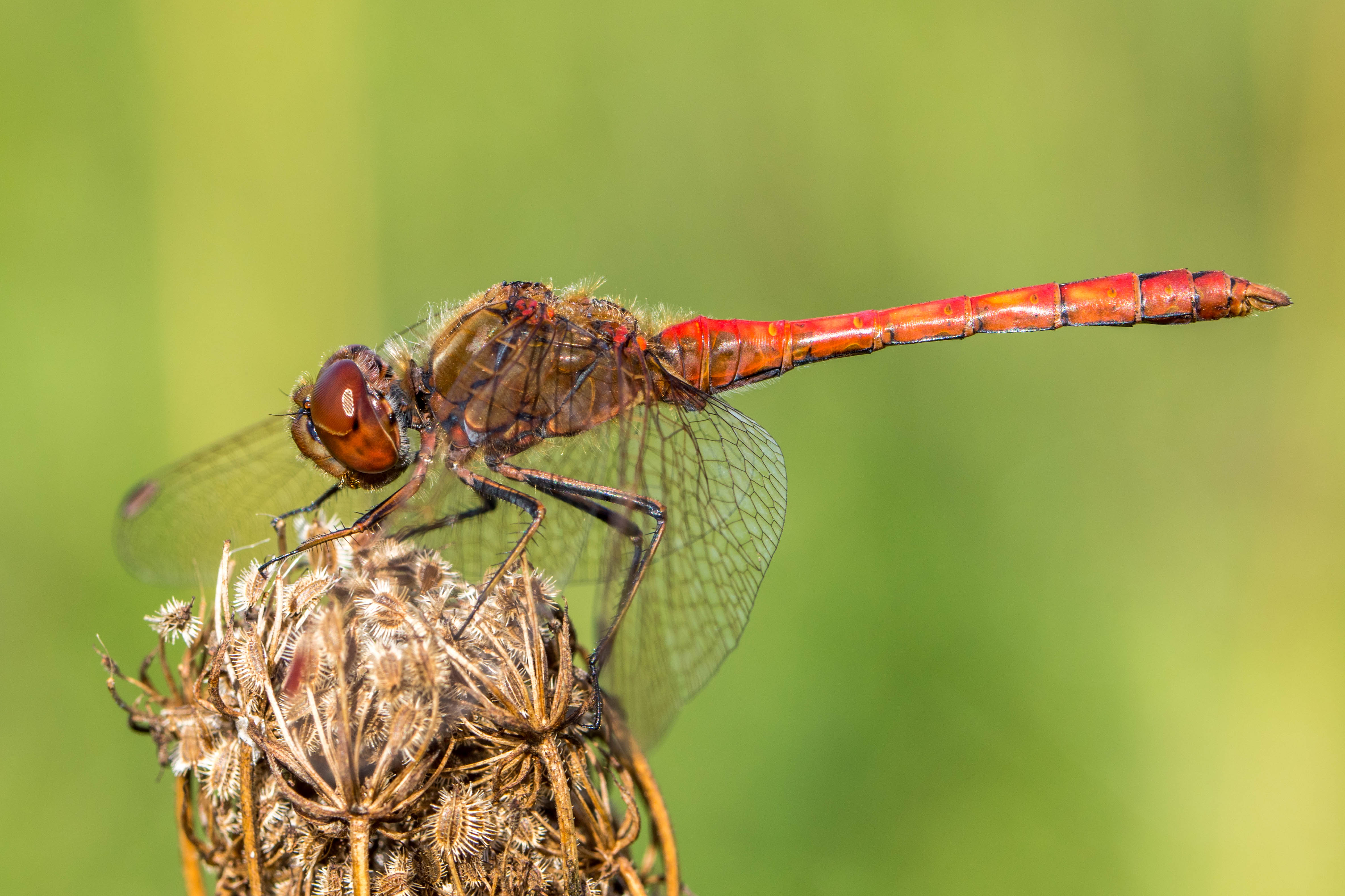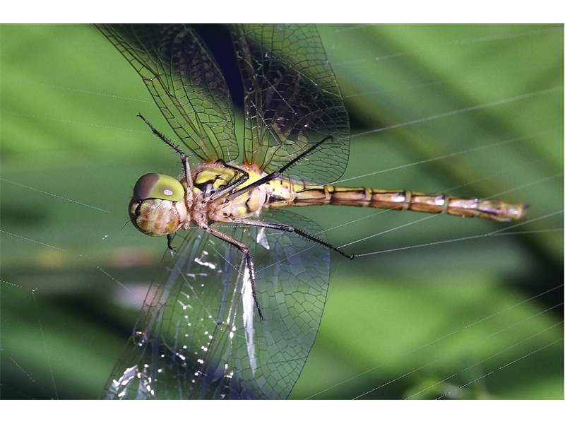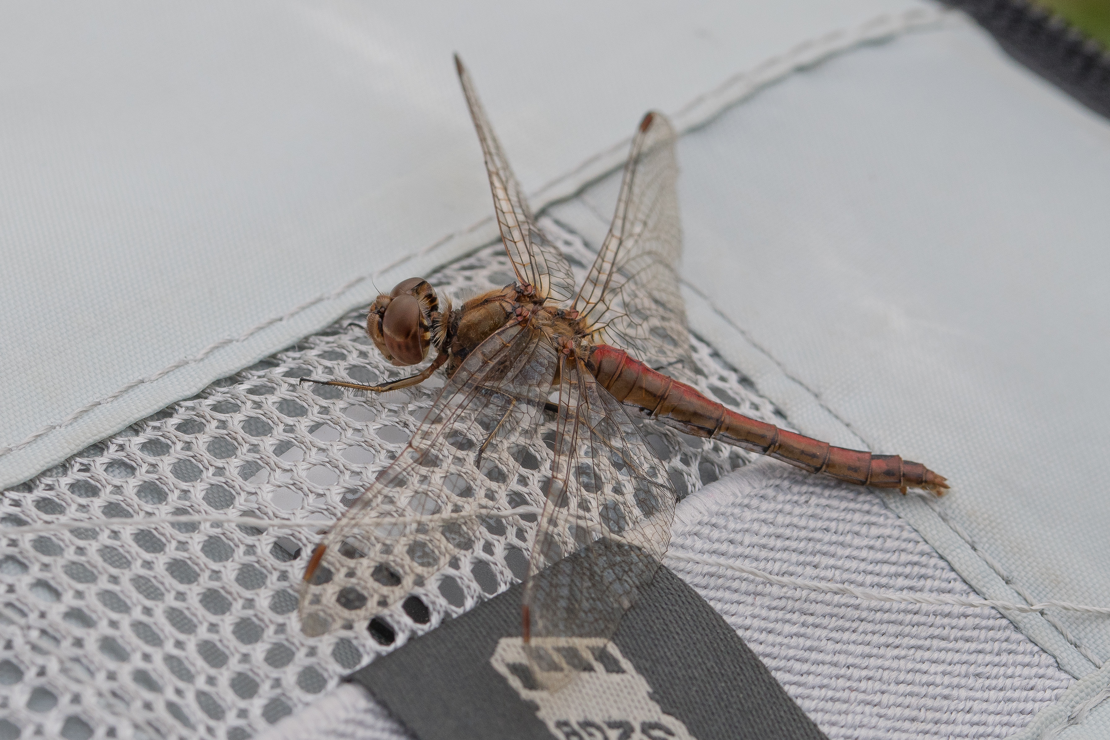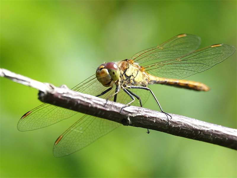 Gemeine Heidelibelle, Gemarkung Hohenprießnitz, Rieselgraben am Fichtbusch, altes Weibchen, Merkmale: gestreifte Beine, senkrecht abstehende Legescheide, August 2013