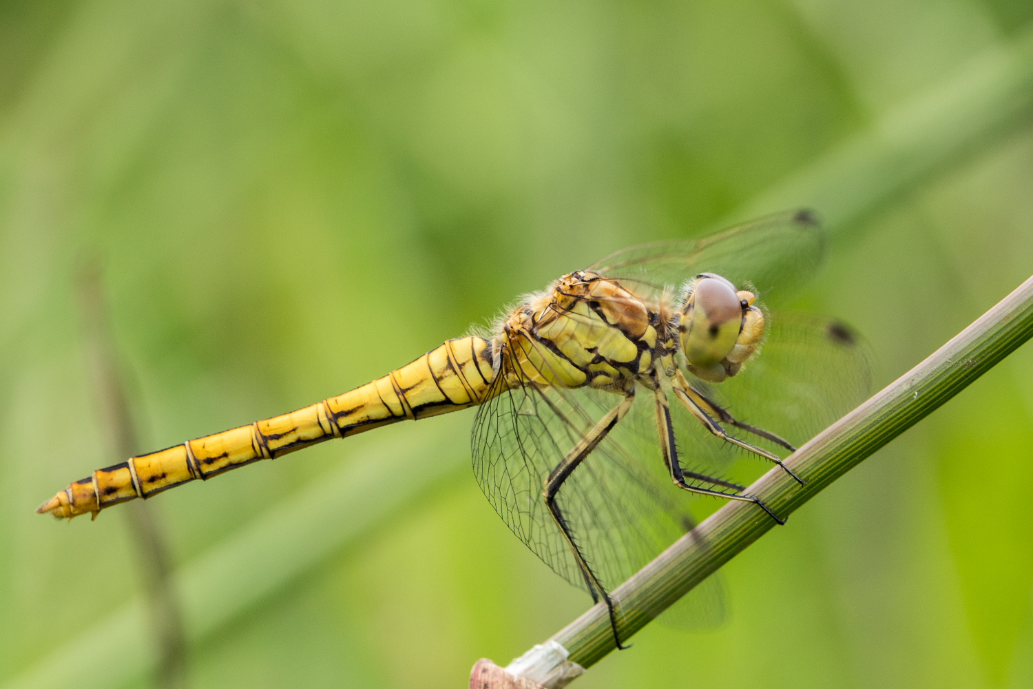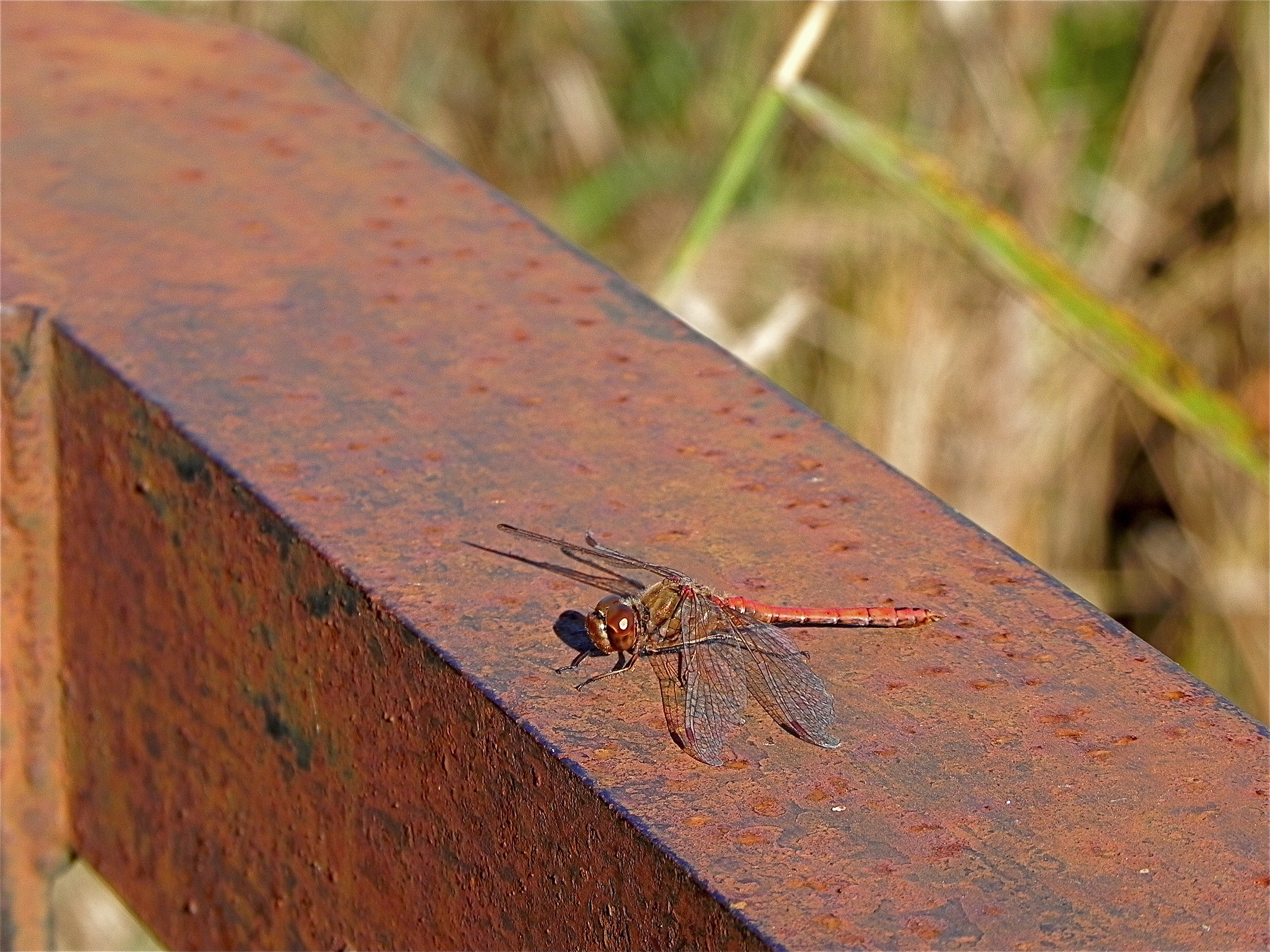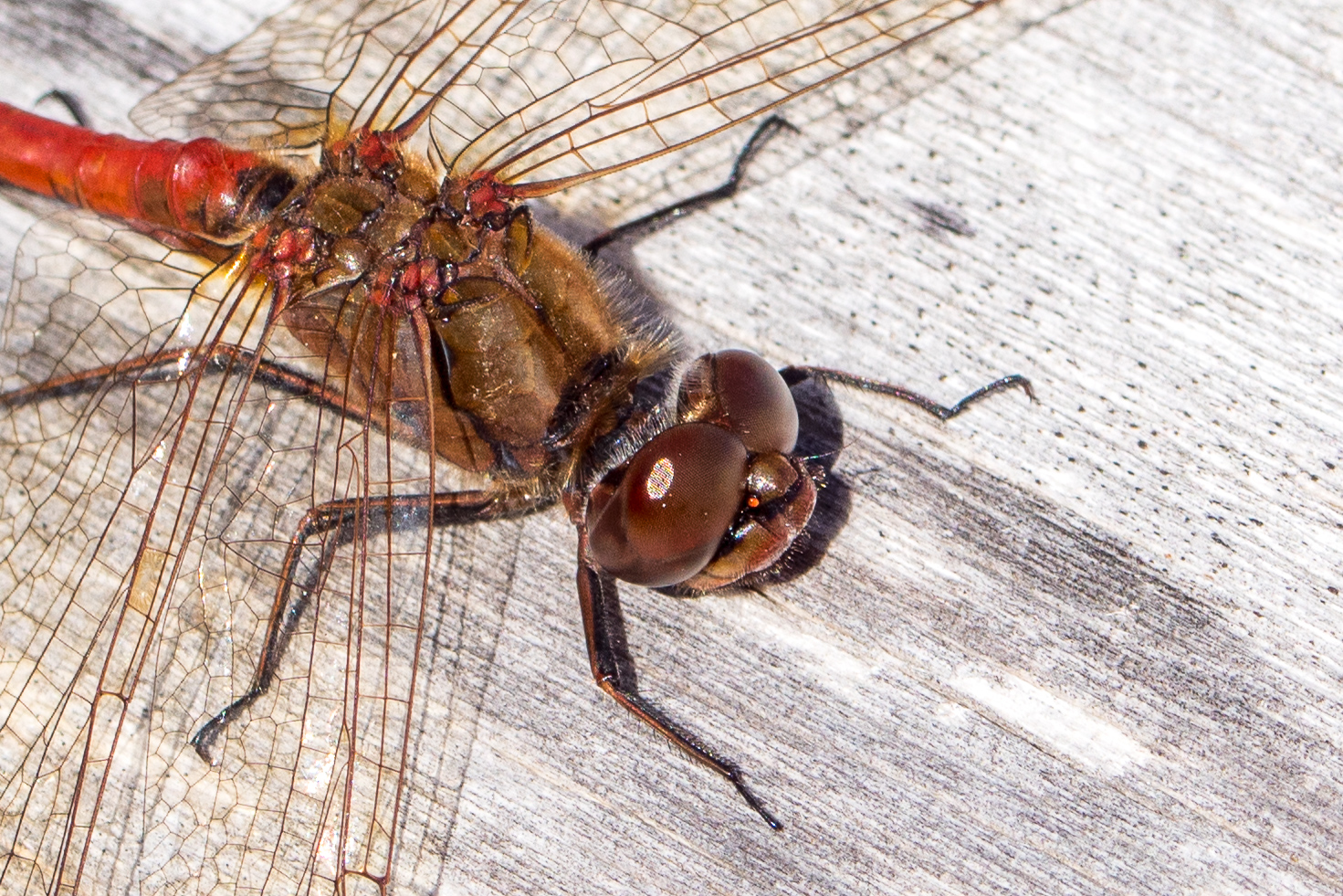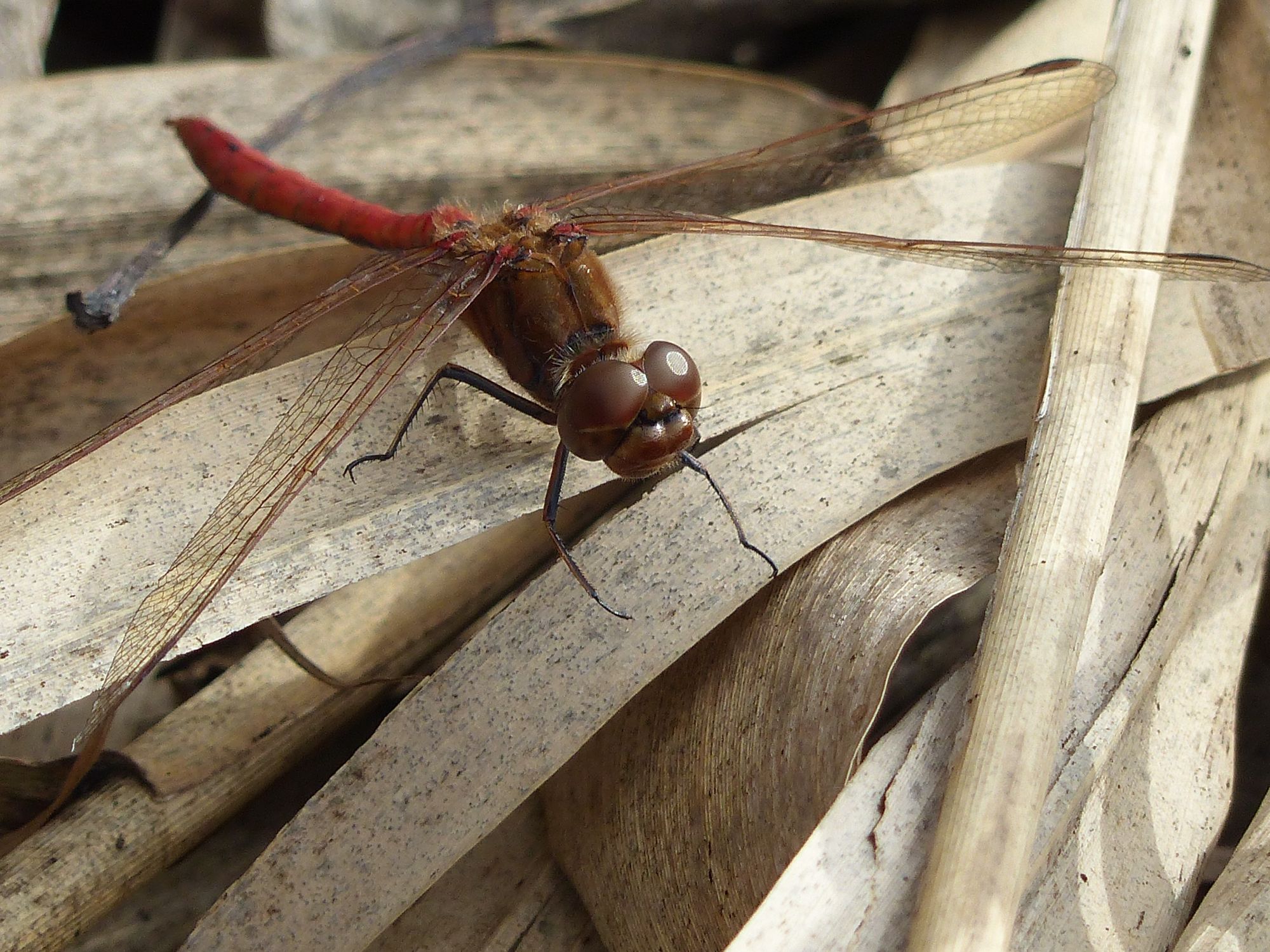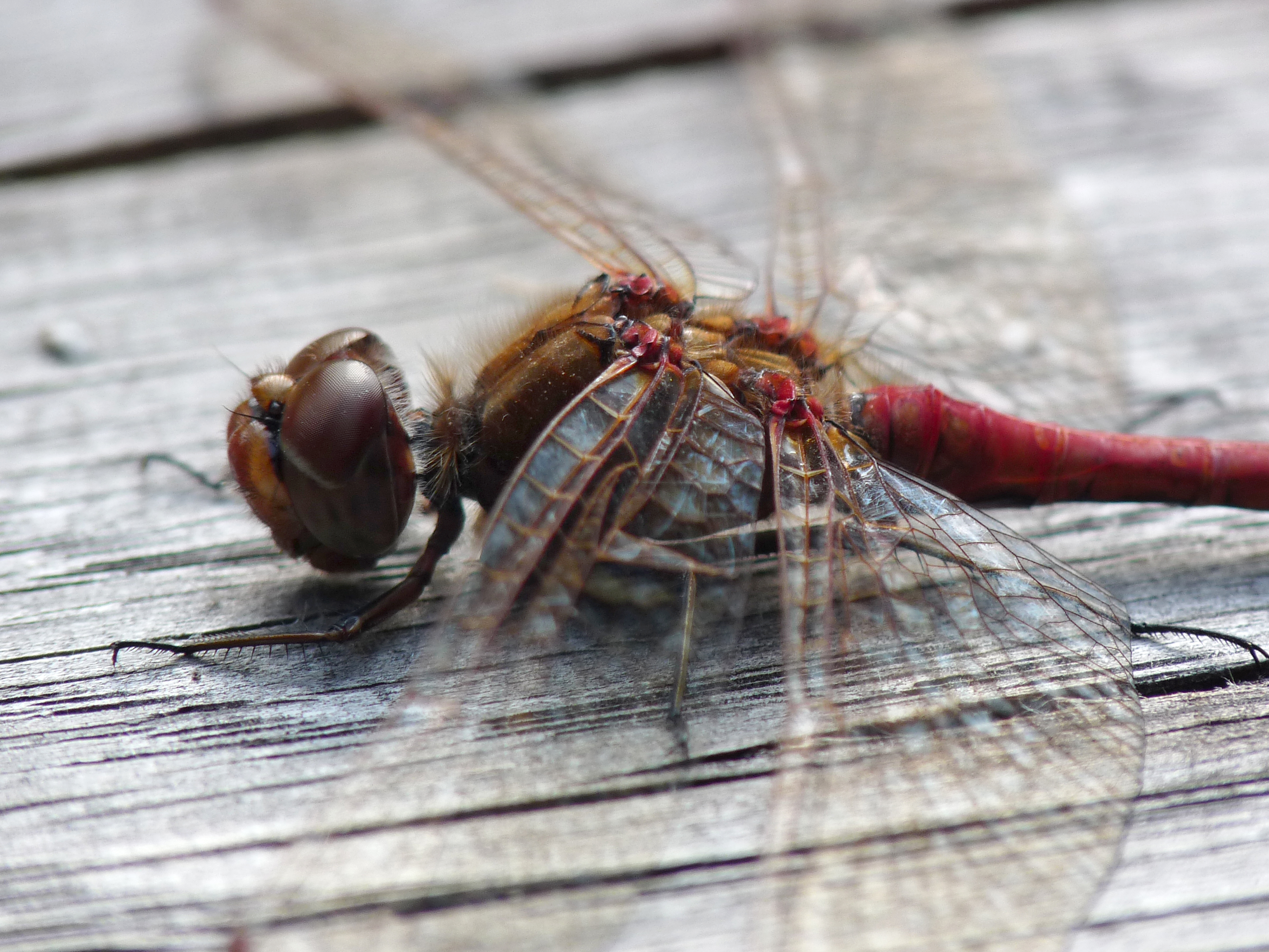 Gemeine Heidelibelle, Gemarkung Hohenprießnitz, Rieselgraben am Fichtbusch, altes Weibchen, Merkmale: gestreifte Beine, senkrecht abstehende Legescheide, August 2013